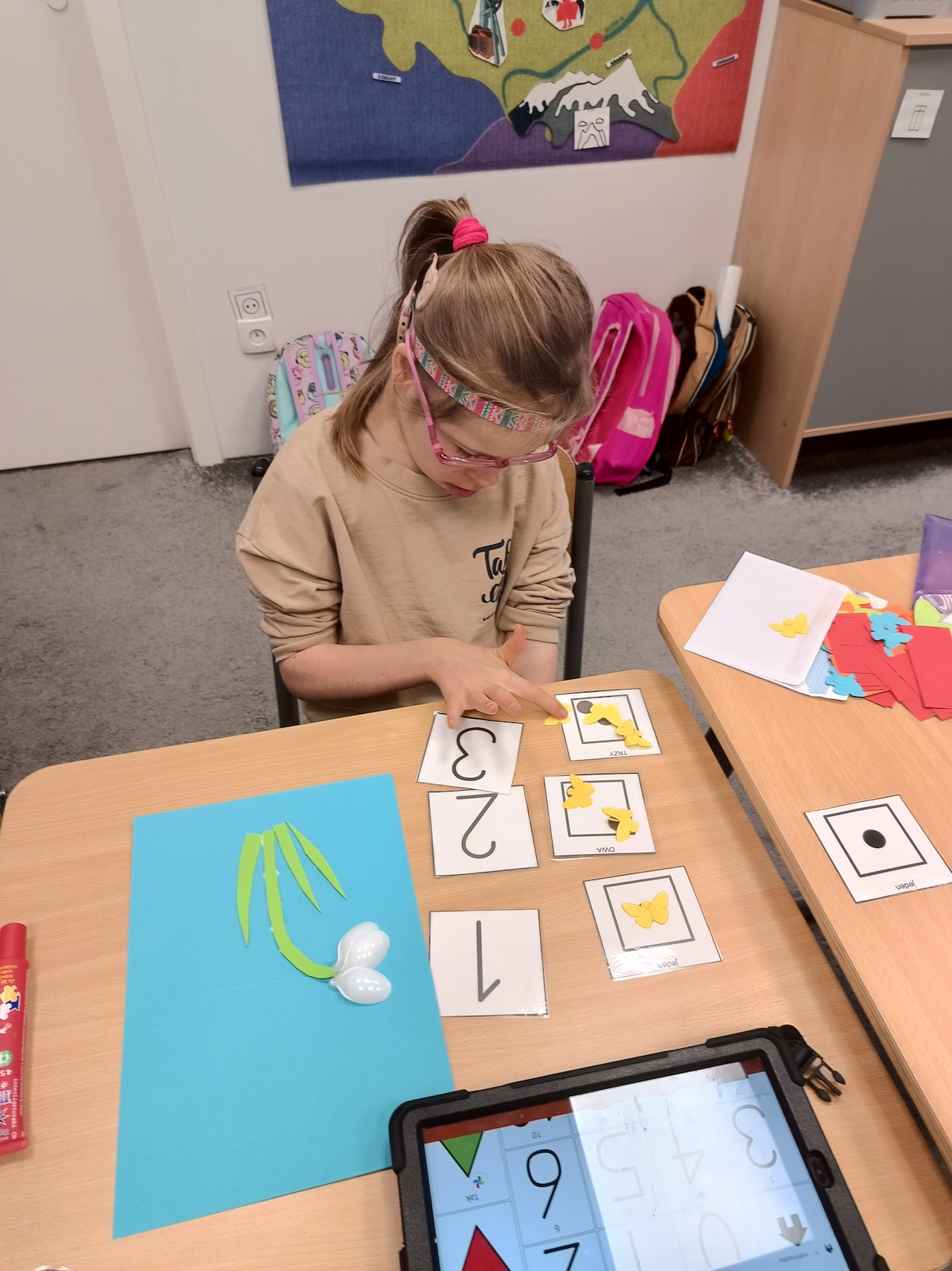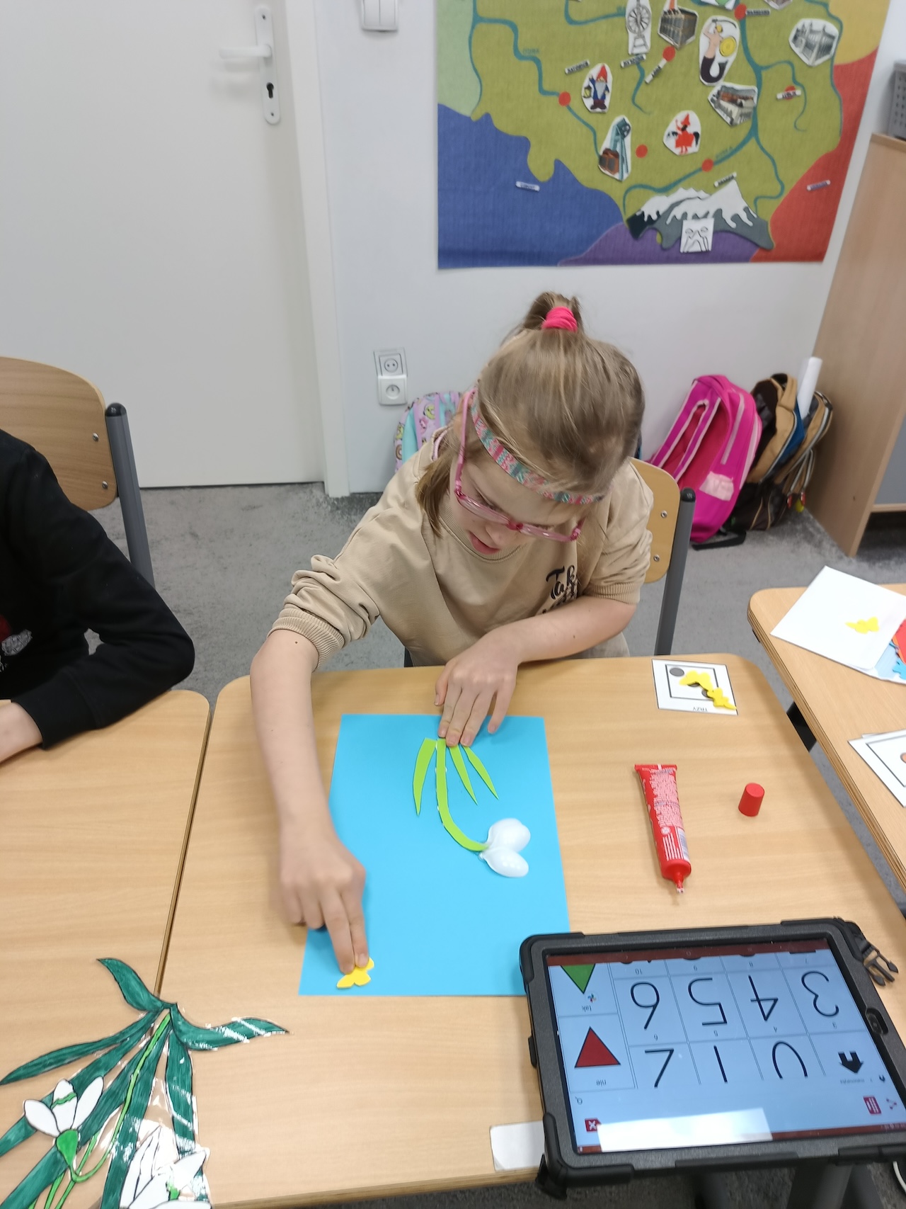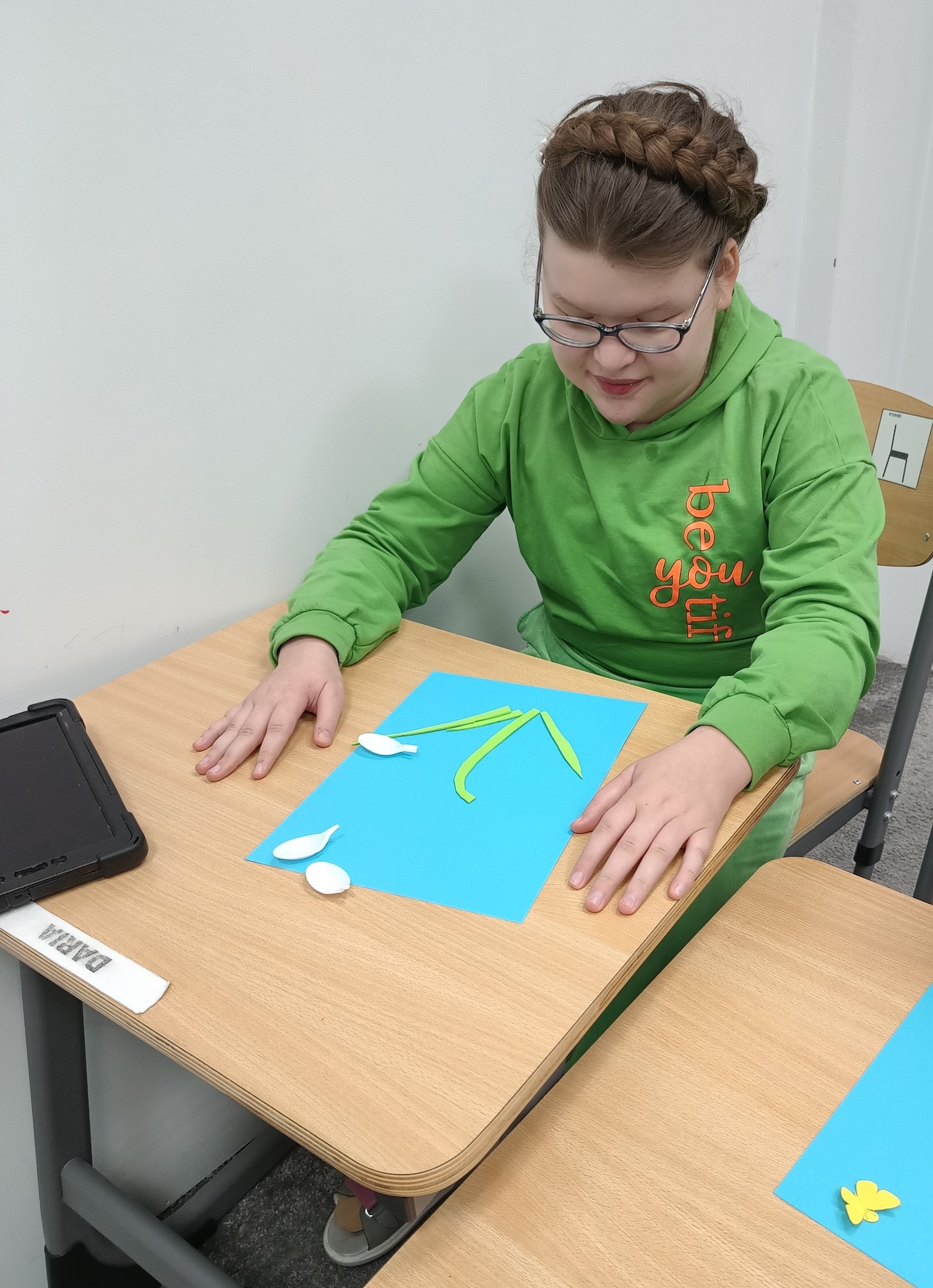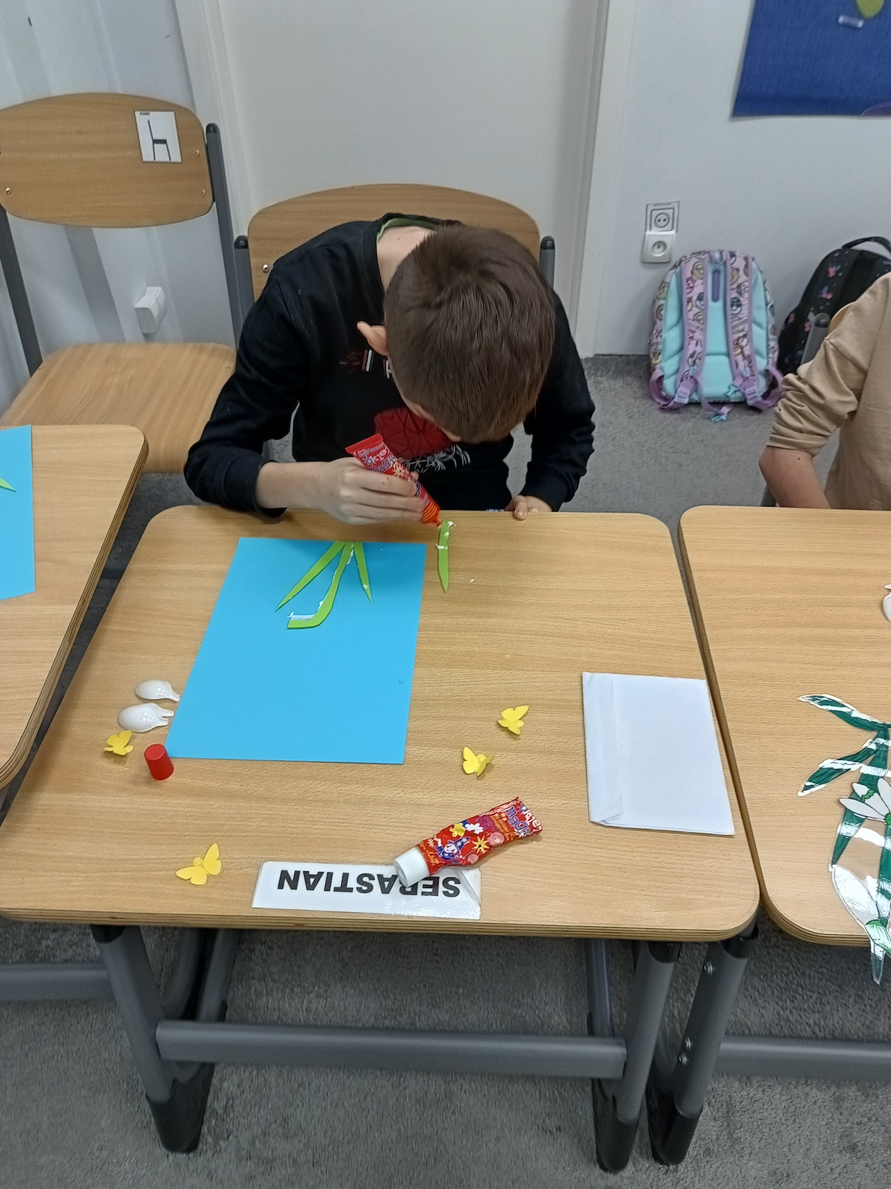 Uczniowie oddziału „I”, realizując temat tygodnia „Wiosna tuż, tuż”, poznawali i utrwalali nazwy pierwszych wiosennych kwiatów oraz wykonali pracę plastyczną „Przebiśnieg”. Rozwijali przy tym sprawność manualną. Utrwalali kolory: biały, zielony, żółty i niebieski, a także znak graficzny cyfry 3 oraz ćwiczyli przeliczanie do 3. Na ich prace przyleciały tez pierwsze wiosenne motylki-cytrynki.