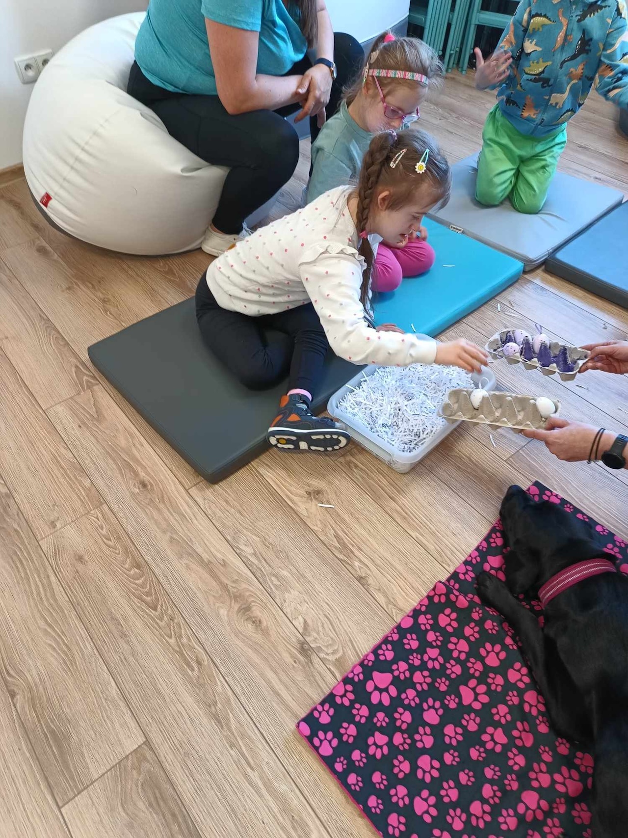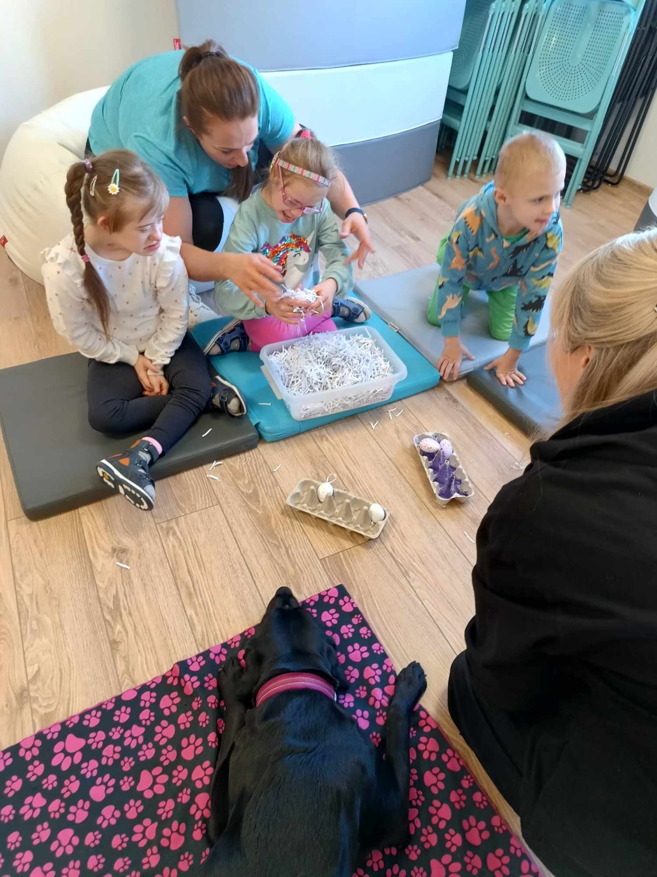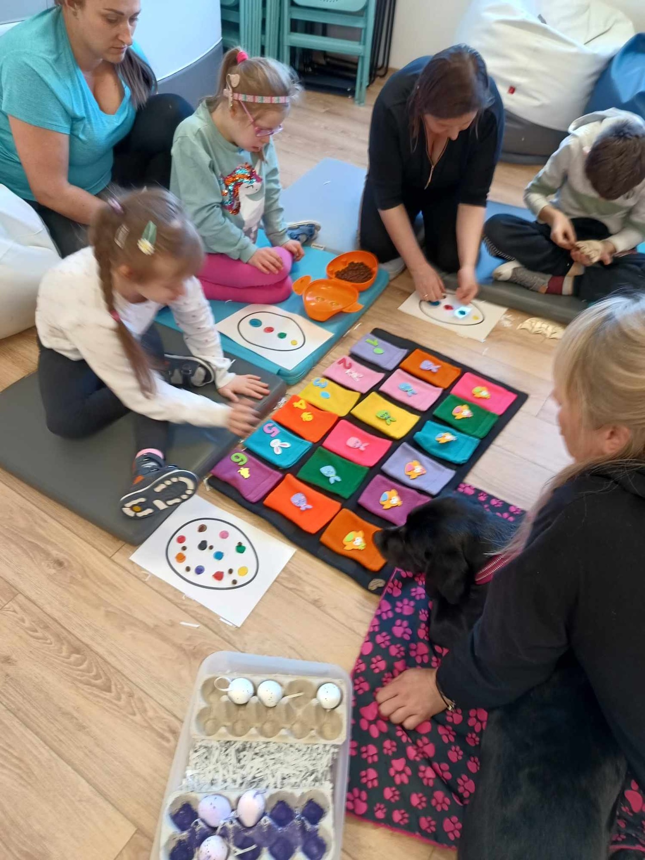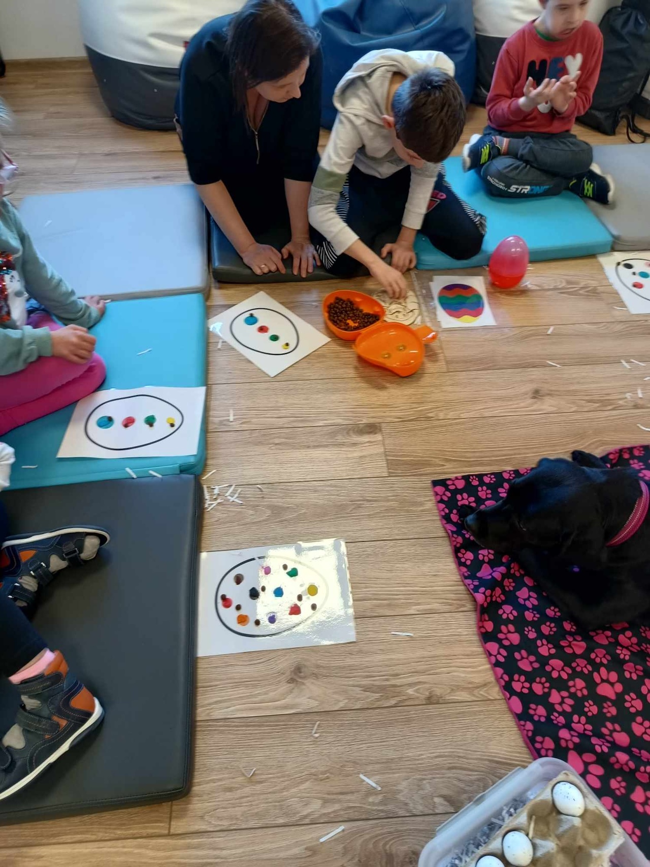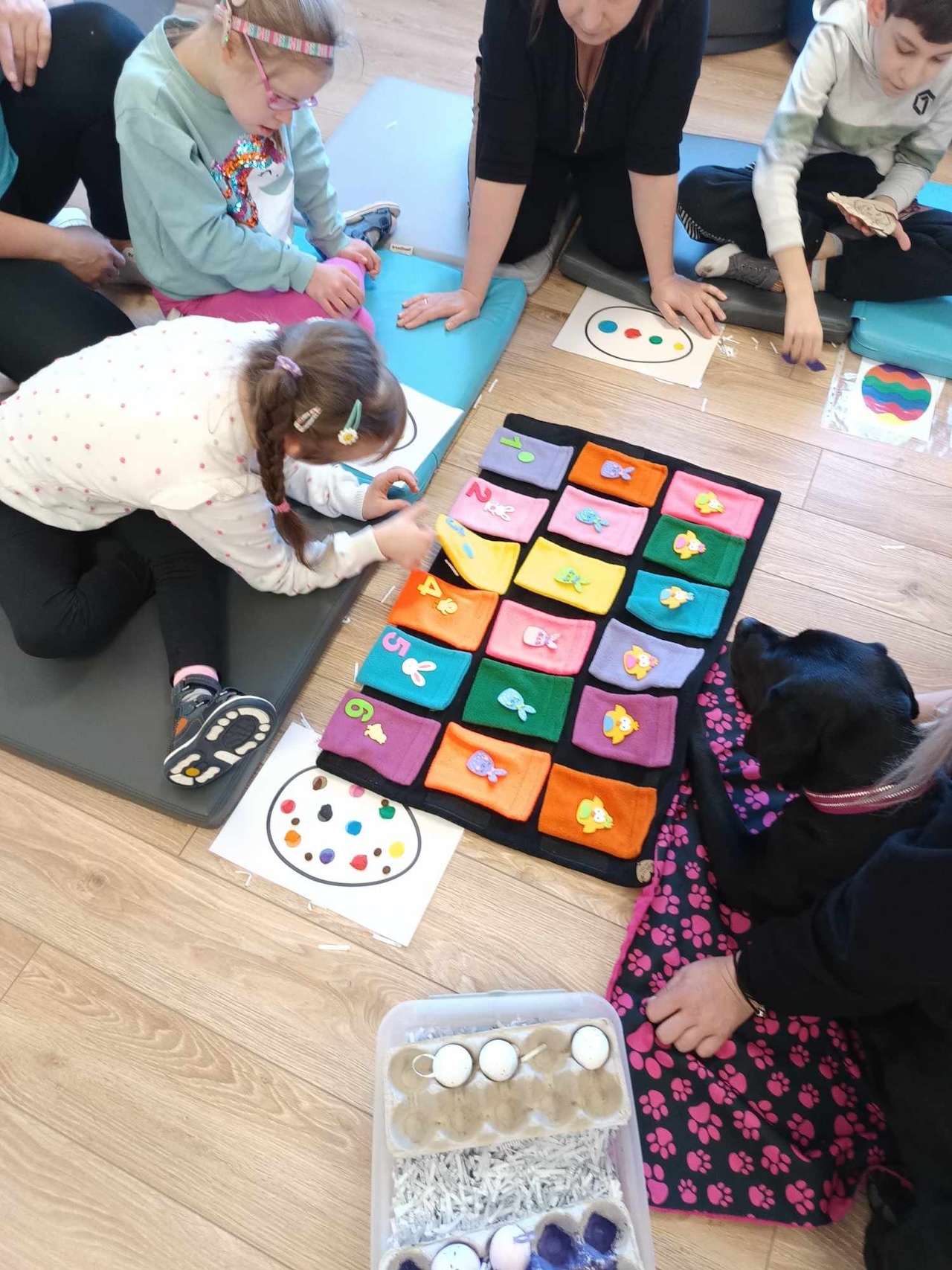 Podczas zajęć w świątecznym tygodniu, dzieci utrwalały kolory, układając kolorowe pisanki i chowając smaczki dla psa pod kolorowym kocykiem świątecznym. Ćwiczyły również przeliczanie, odliczając odpowiednią ilość smaczków dla Vegi oraz rozwijały sprawność manualną i koordynację wzrokowo-ruchową. Przełamywały przy tym lęk w kontakcie z psem.