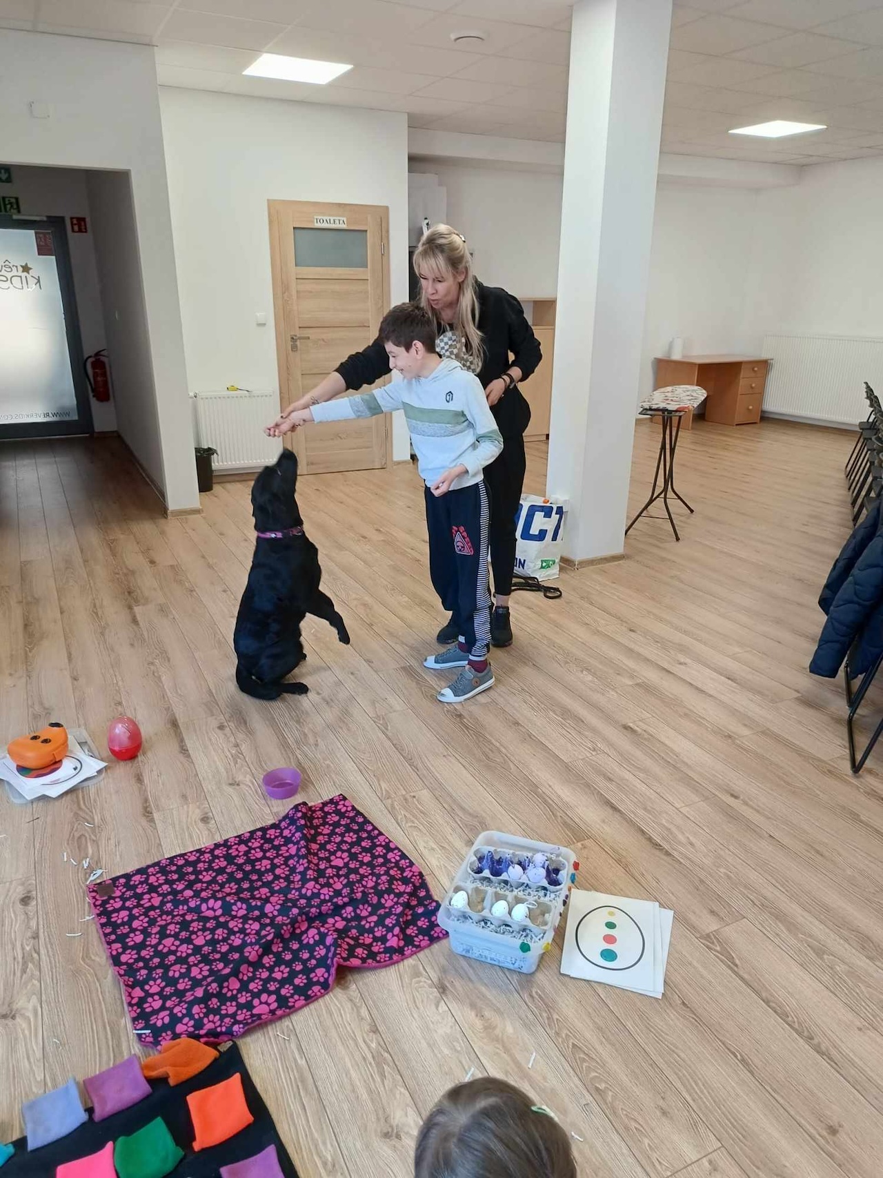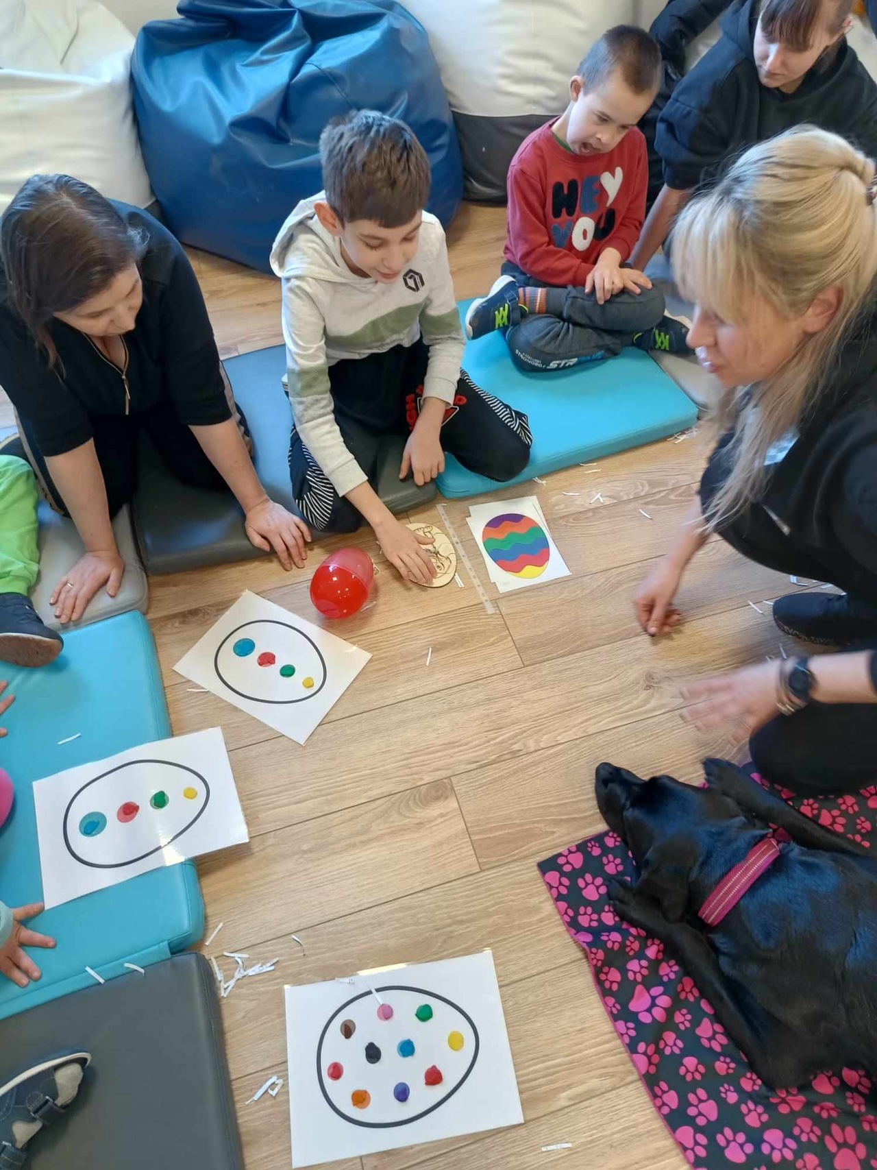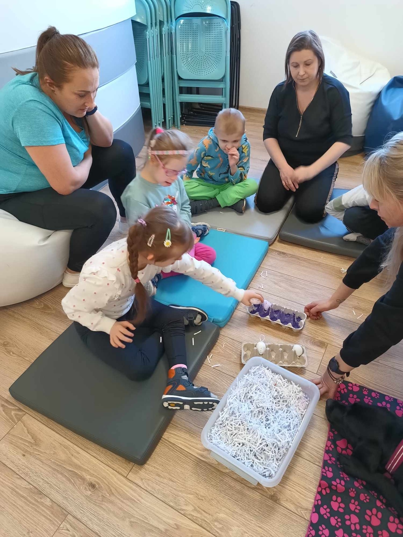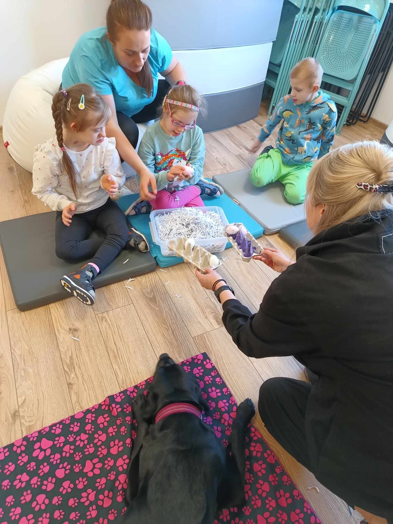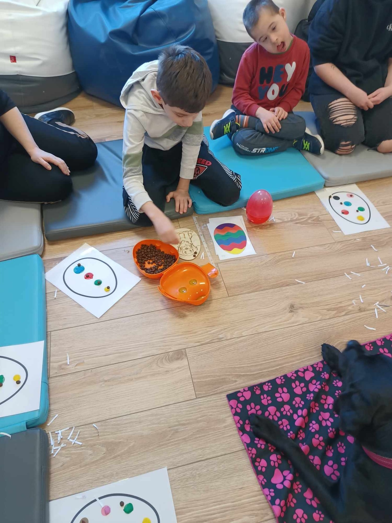 Podczas zajęć w świątecznym tygodniu, dzieci utrwalały kolory, układając kolorowe pisanki i chowając smaczki dla psa pod kolorowym kocykiem świątecznym. Ćwiczyły również przeliczanie, odliczając odpowiednią ilość smaczków dla Vegi oraz rozwijały sprawność manualną i koordynację wzrokowo-ruchową. Przełamywały przy tym lęk w kontakcie z psem.