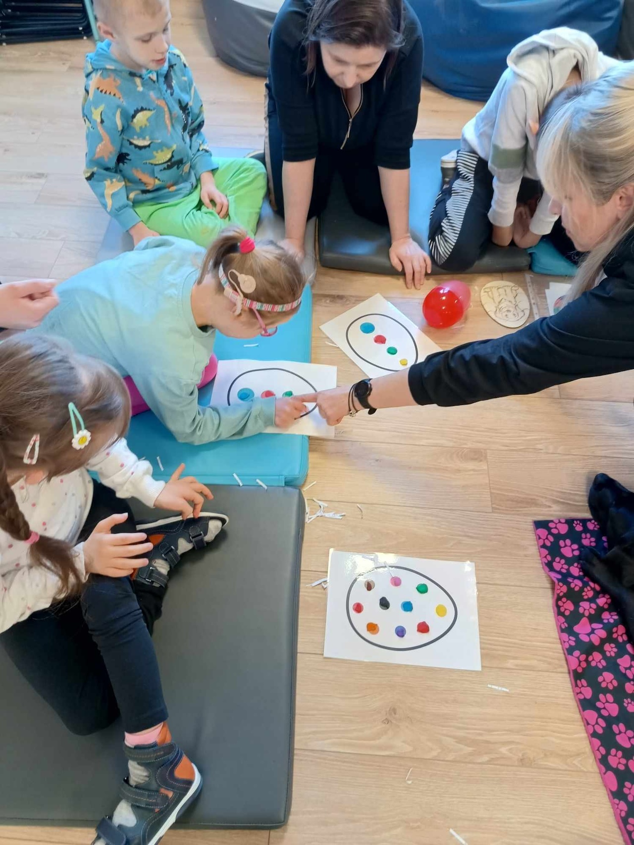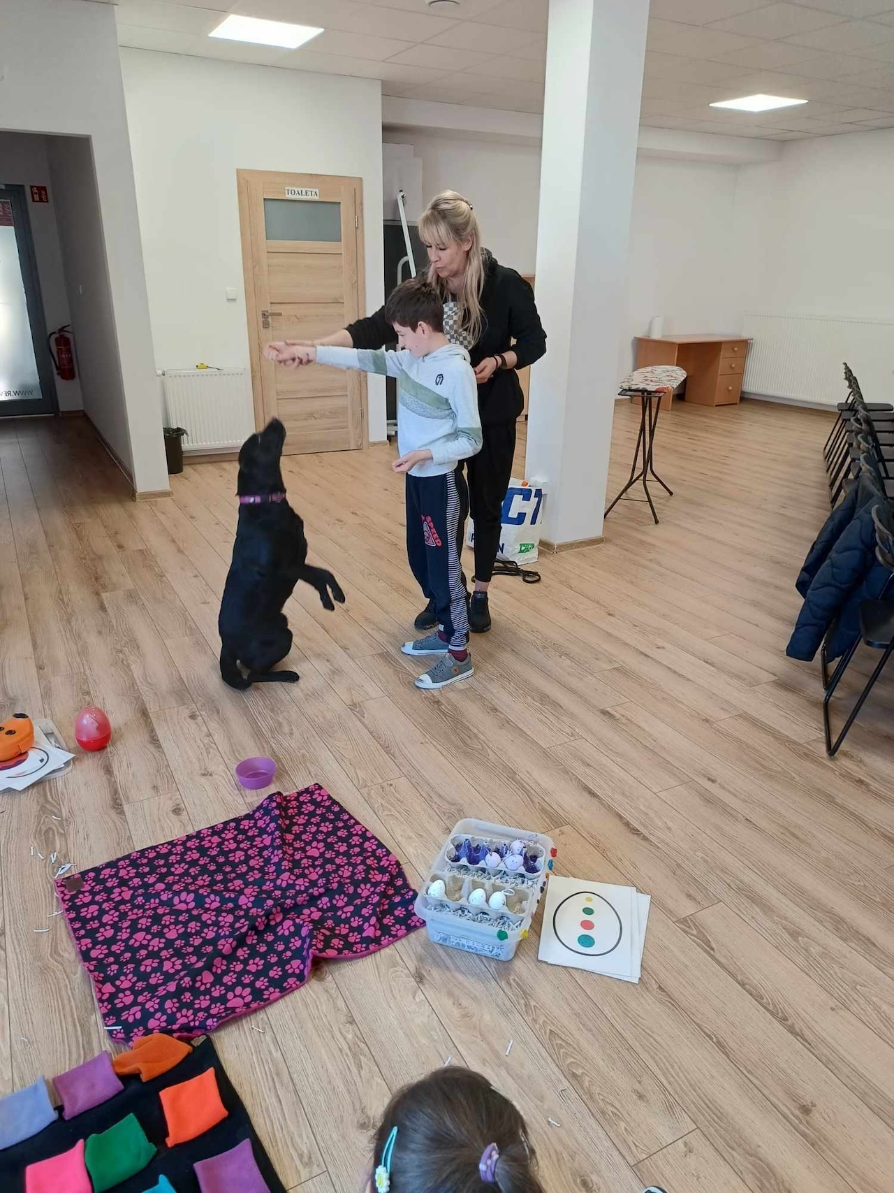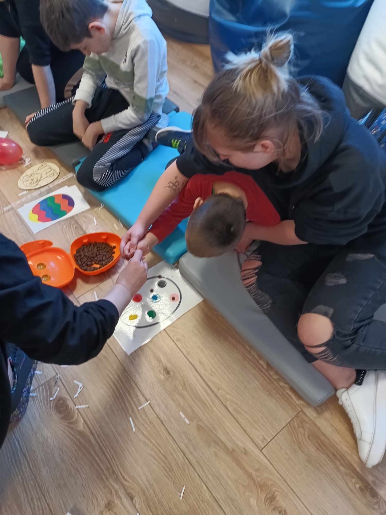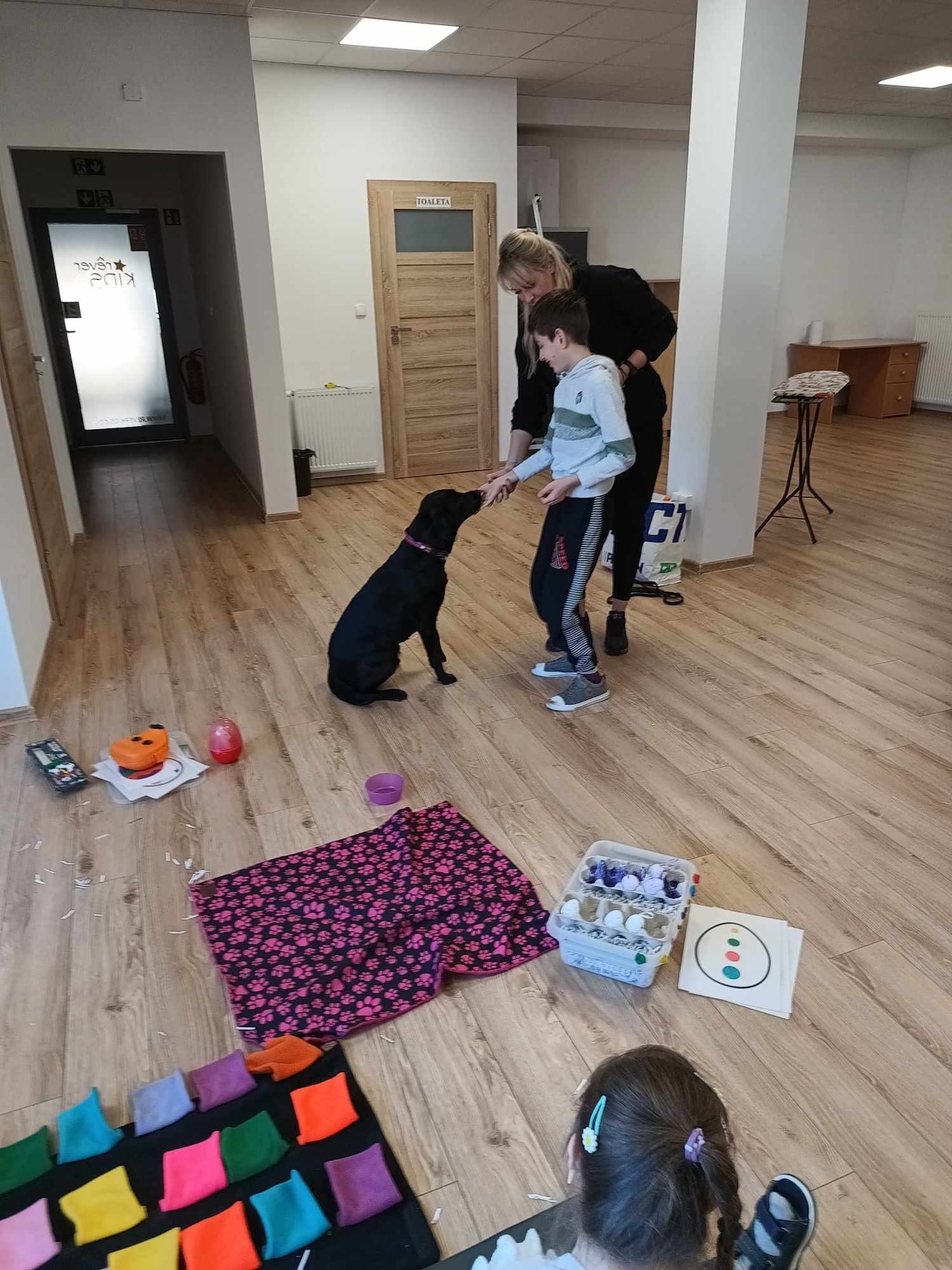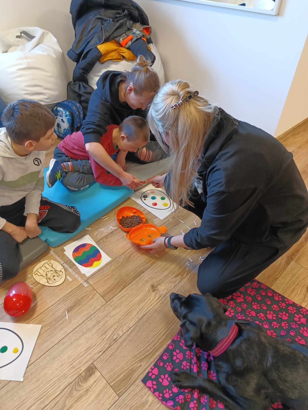 Podczas zajęć w świątecznym tygodniu, dzieci utrwalały kolory, układając kolorowe pisanki i chowając smaczki dla psa pod kolorowym kocykiem świątecznym. Ćwiczyły również przeliczanie, odliczając odpowiednią ilość smaczków dla Vegi oraz rozwijały sprawność manualną i koordynację wzrokowo-ruchową. Przełamywały przy tym lęk w kontakcie z psem.