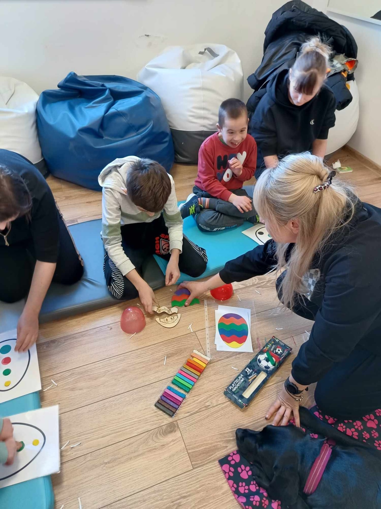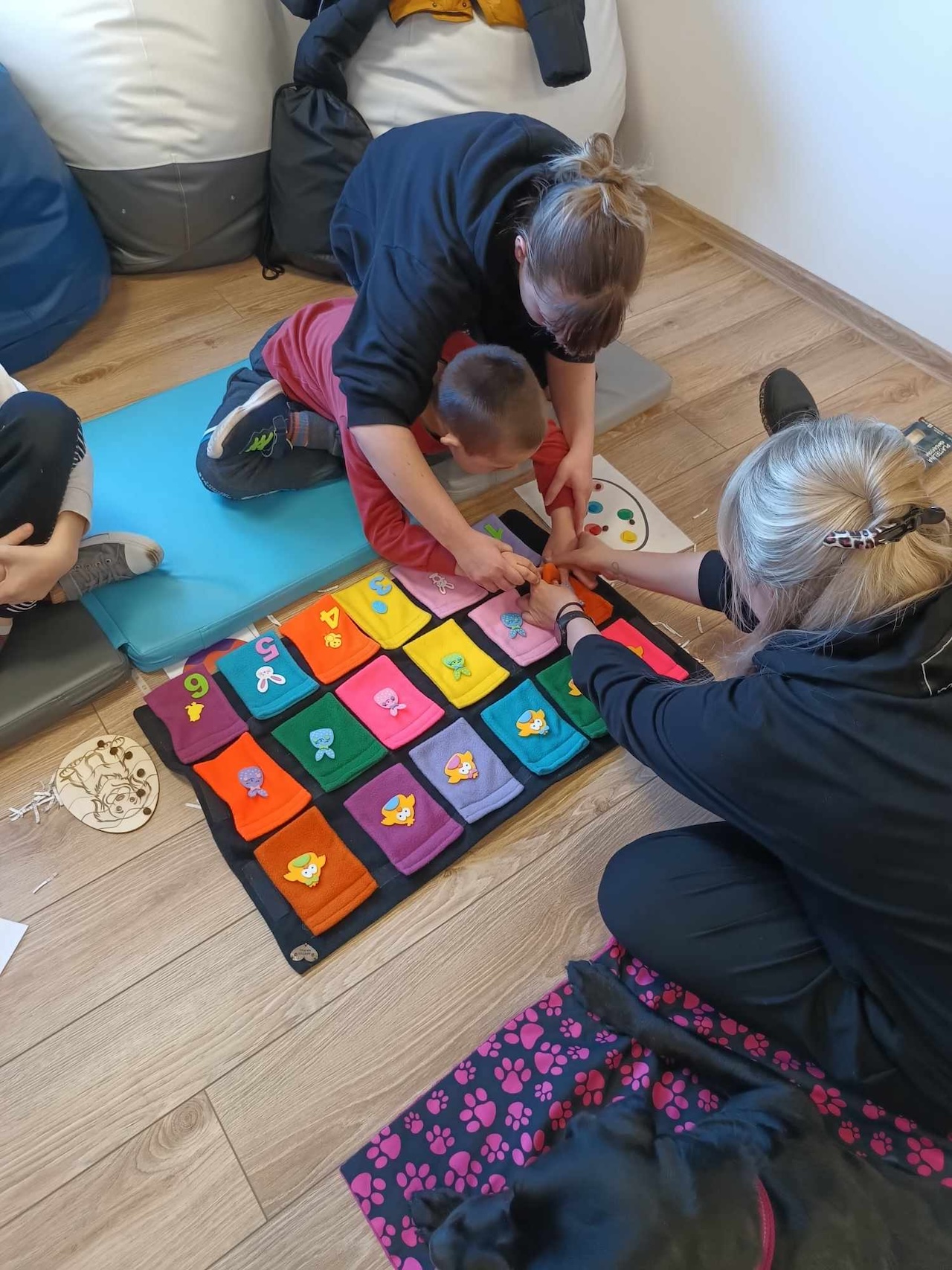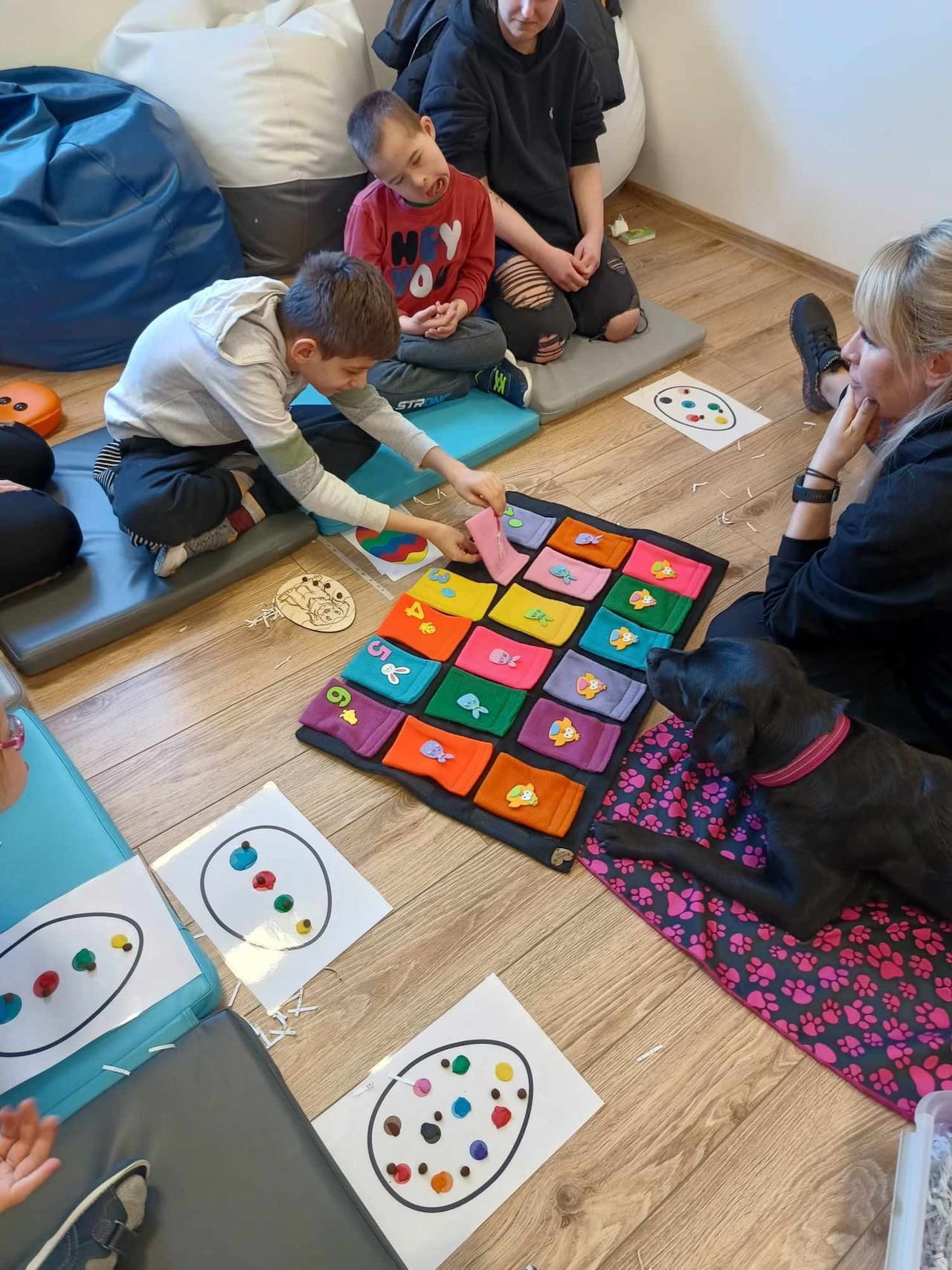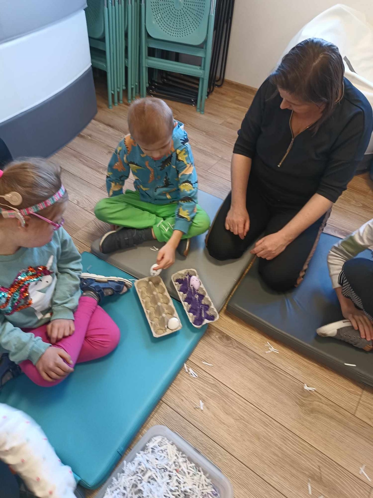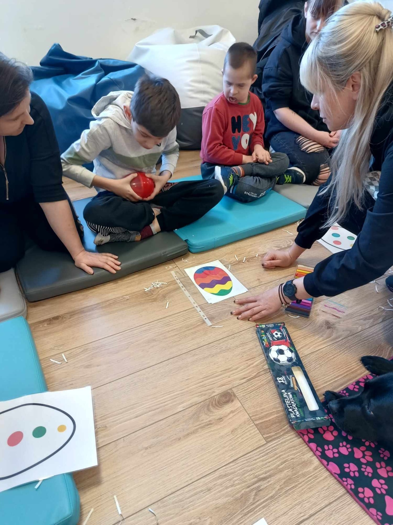 Podczas zajęć w świątecznym tygodniu, dzieci utrwalały kolory, układając kolorowe pisanki i chowając smaczki dla psa pod kolorowym kocykiem świątecznym. Ćwiczyły również przeliczanie, odliczając odpowiednią ilość smaczków dla Vegi oraz rozwijały sprawność manualną i koordynację wzrokowo-ruchową. Przełamywały przy tym lęk w kontakcie z psem.