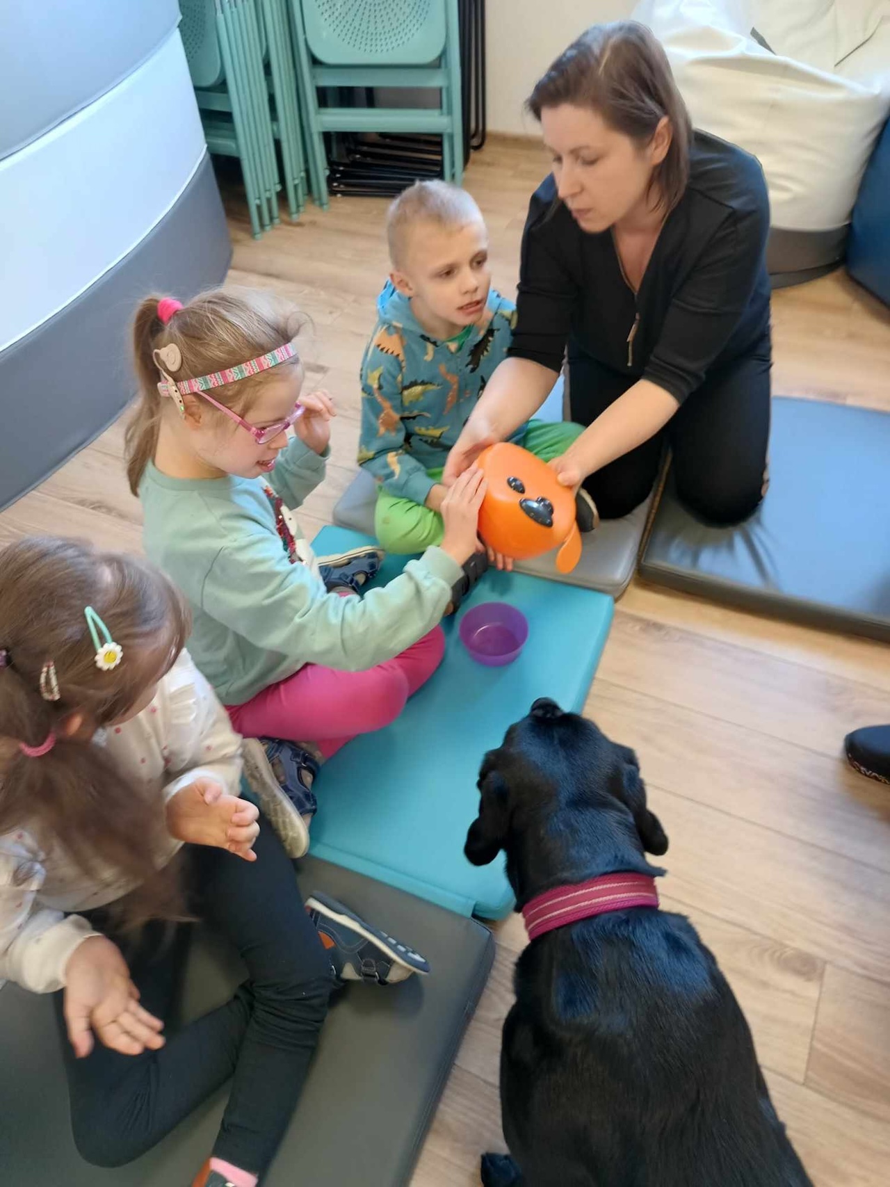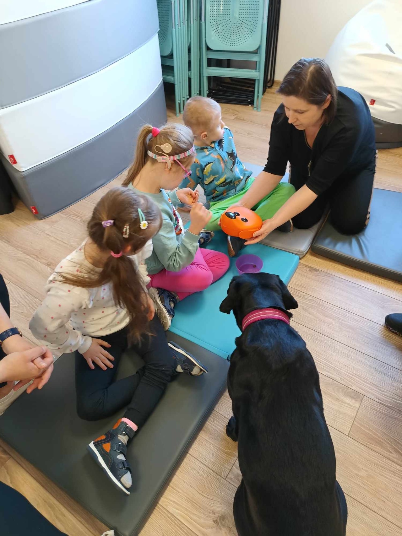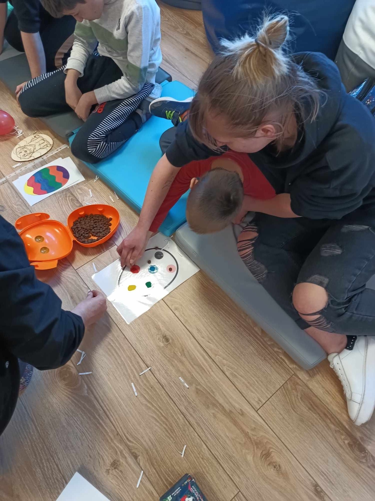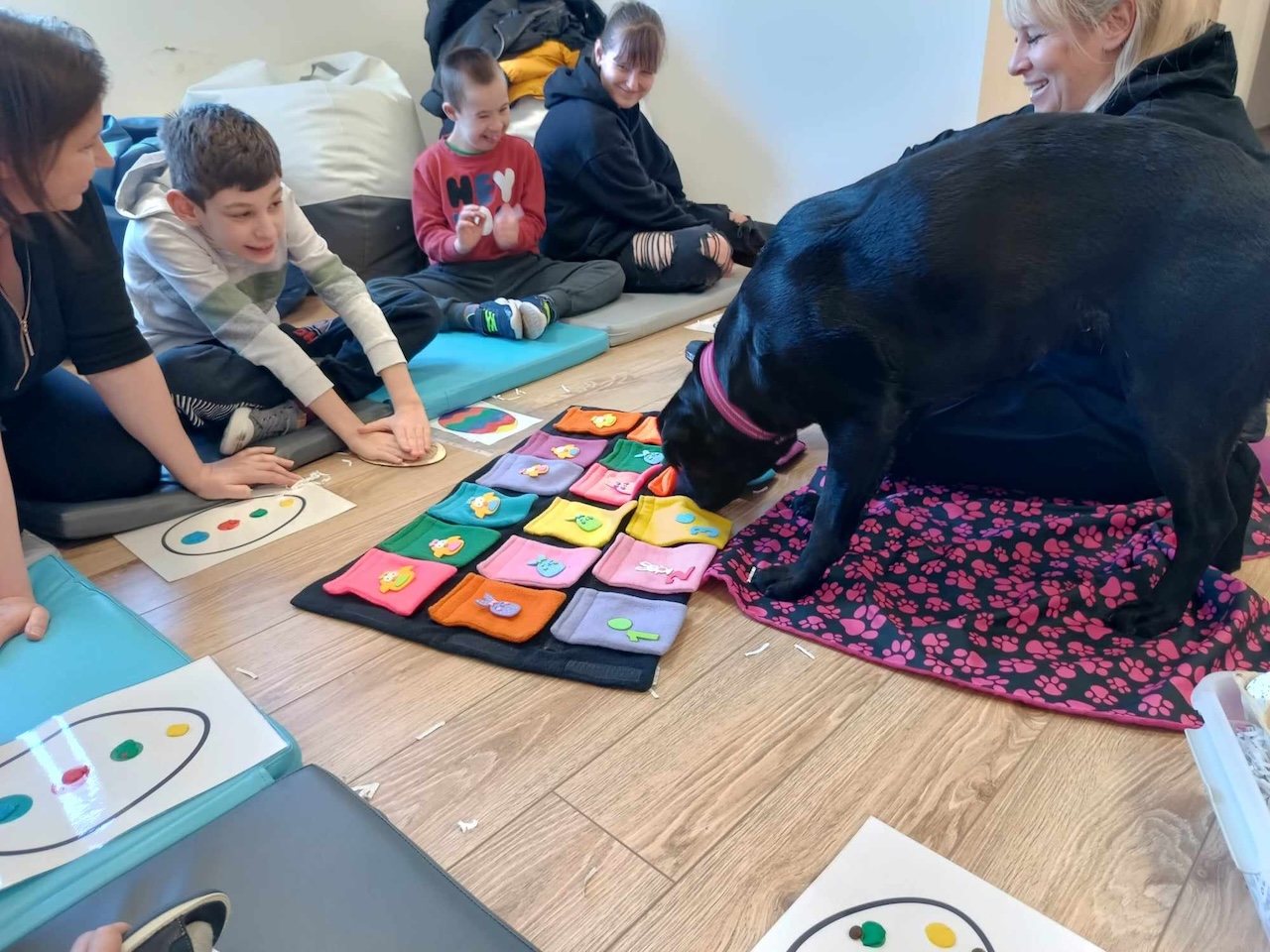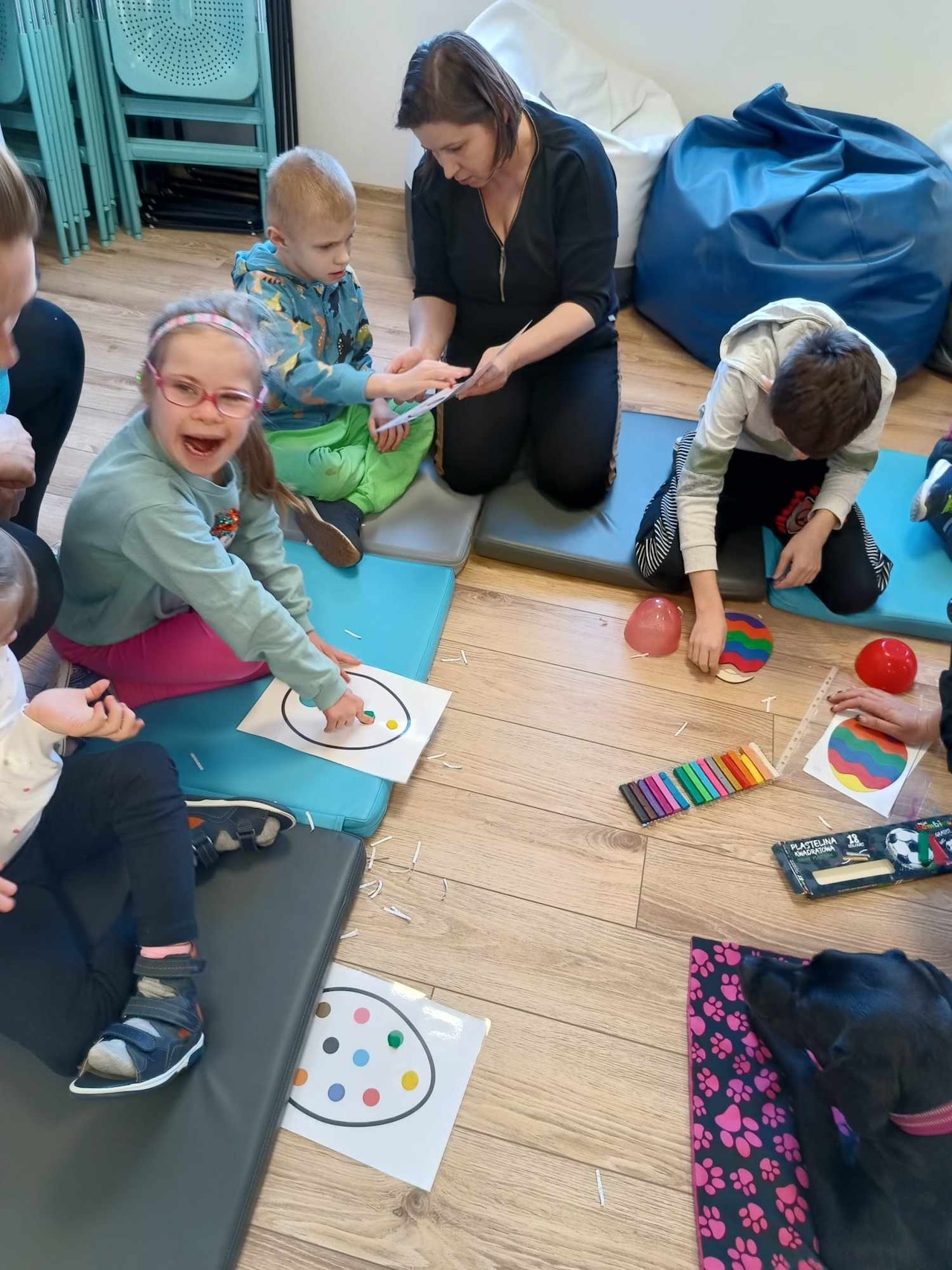 Podczas zajęć w świątecznym tygodniu, dzieci utrwalały kolory, układając kolorowe pisanki i chowając smaczki dla psa pod kolorowym kocykiem świątecznym. Ćwiczyły również przeliczanie, odliczając odpowiednią ilość smaczków dla Vegi oraz rozwijały sprawność manualną i koordynację wzrokowo-ruchową. Przełamywały przy tym lęk w kontakcie z psem.