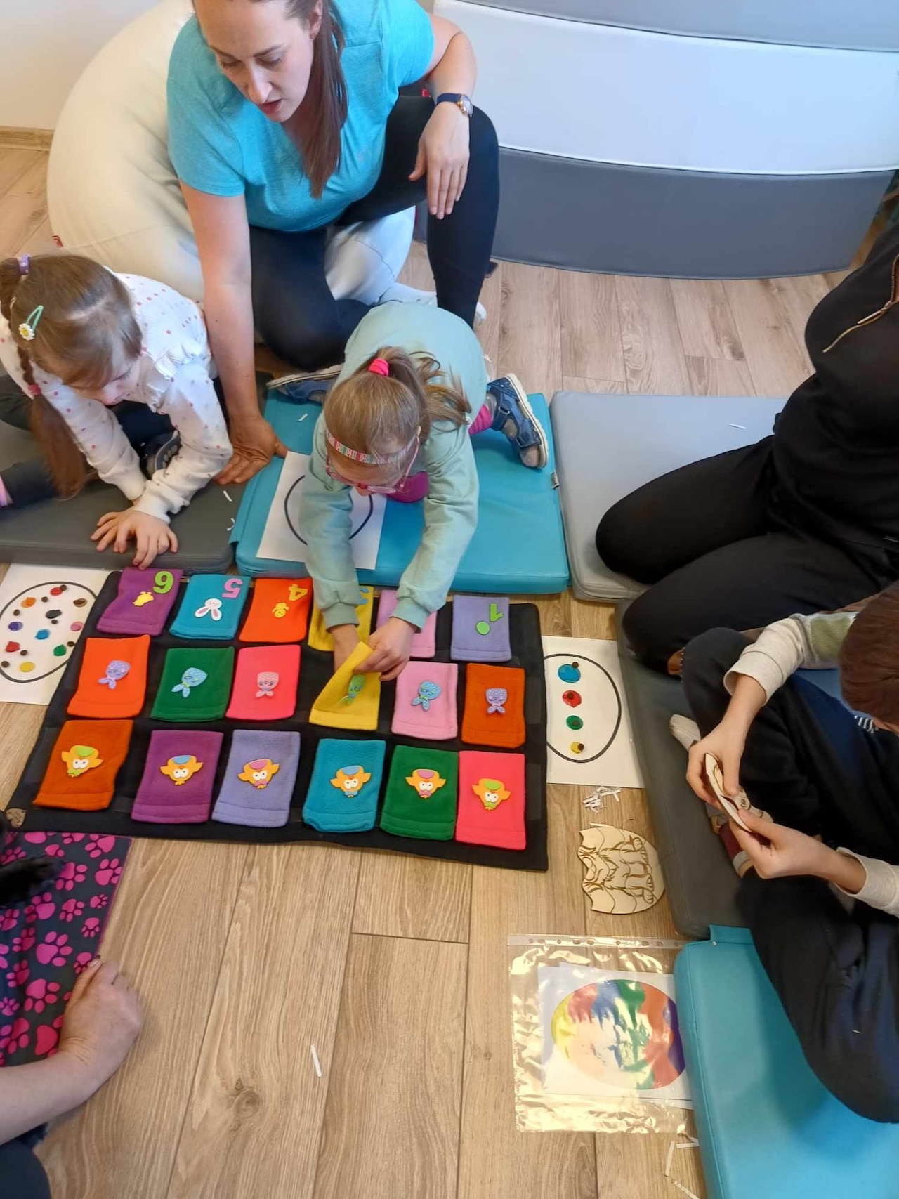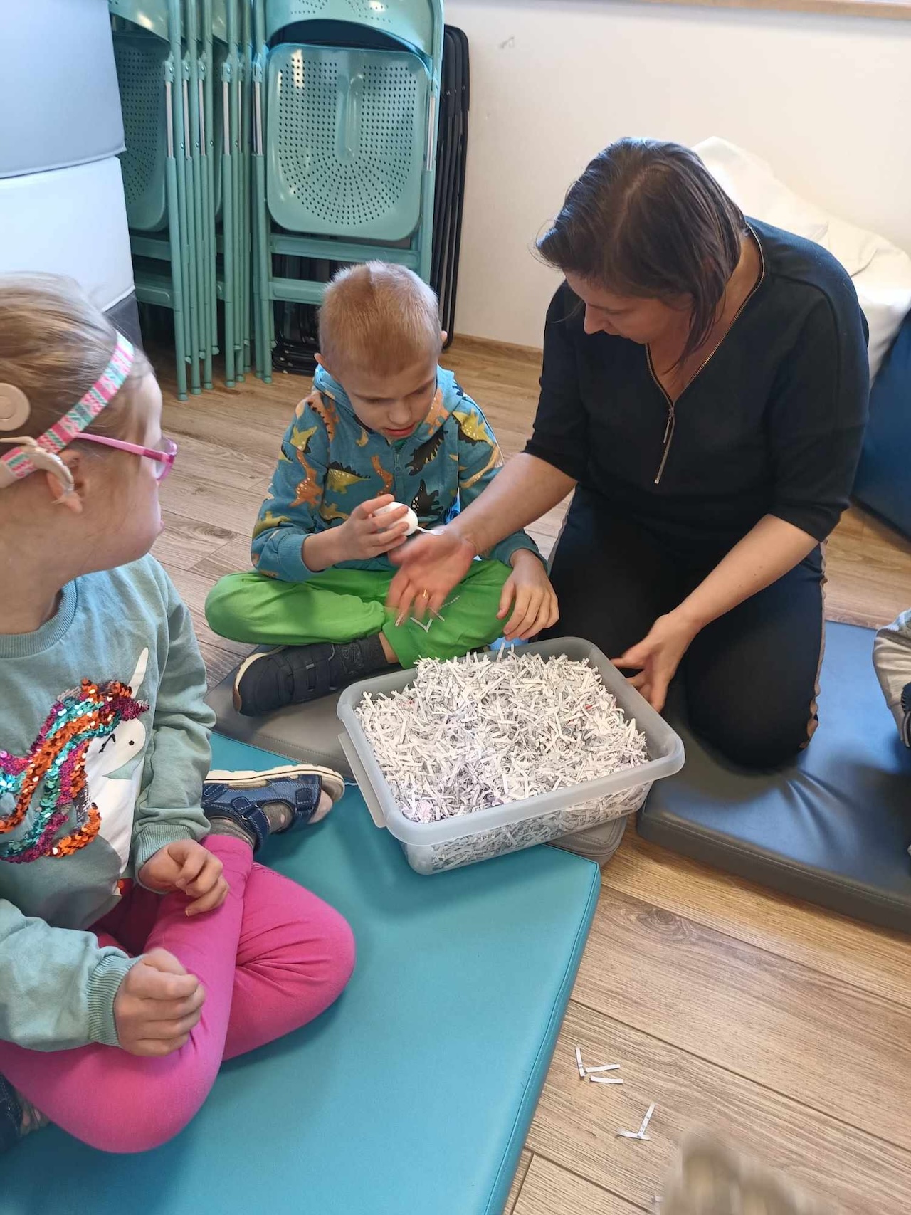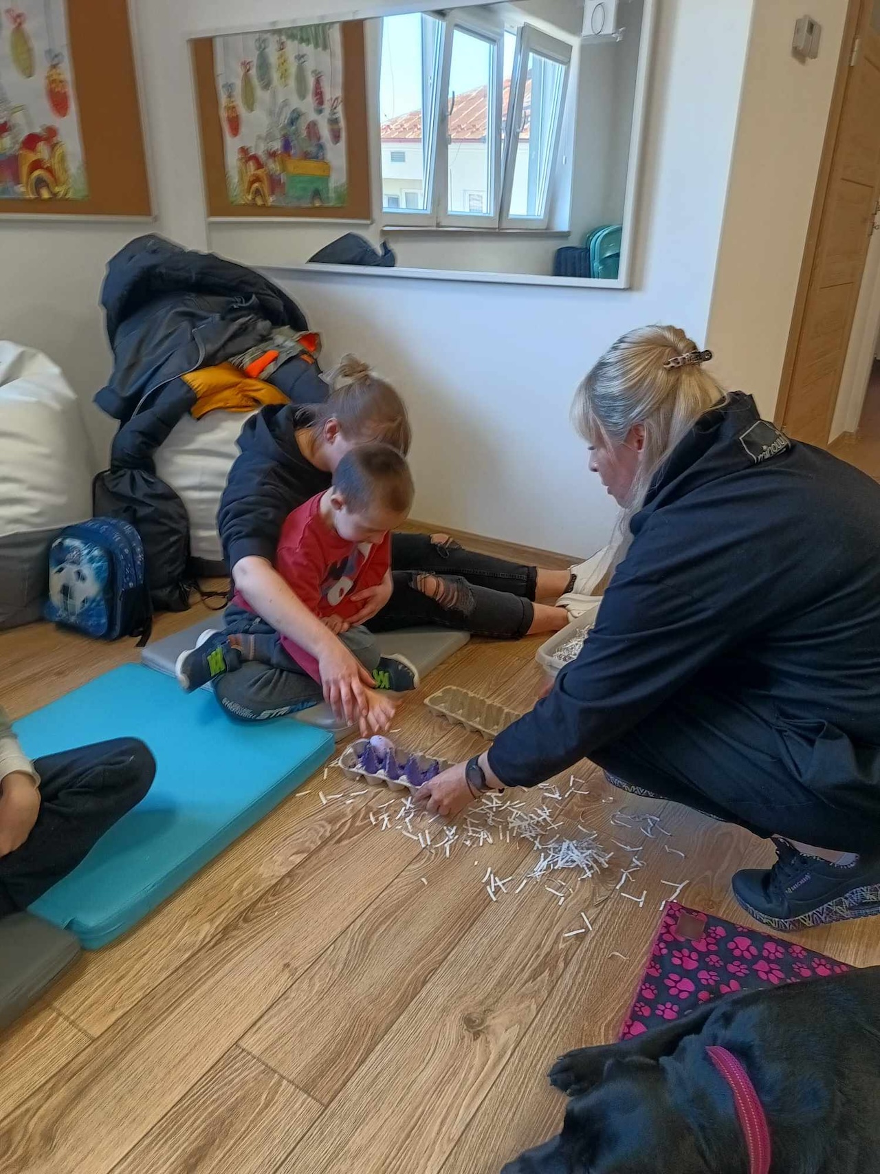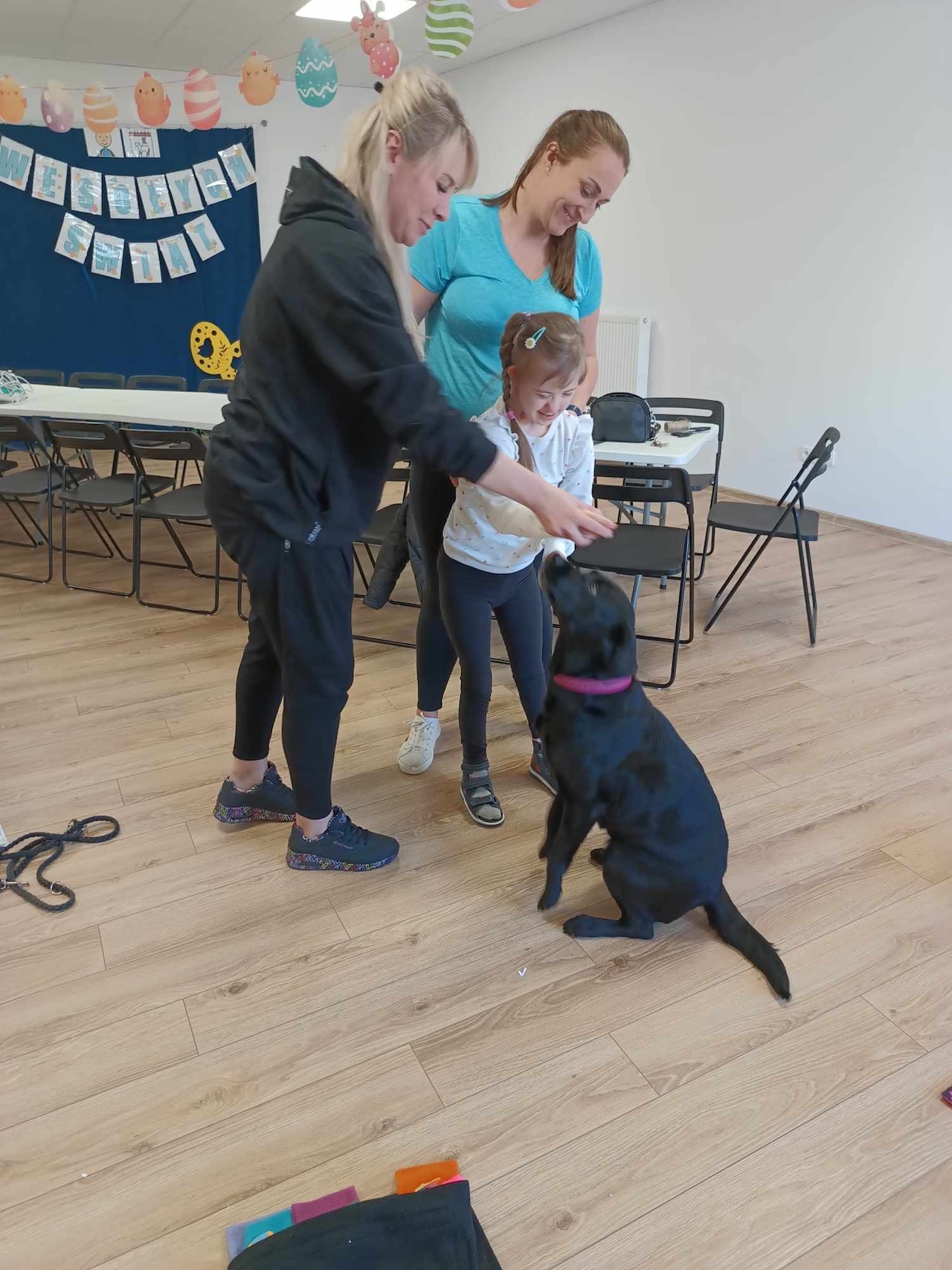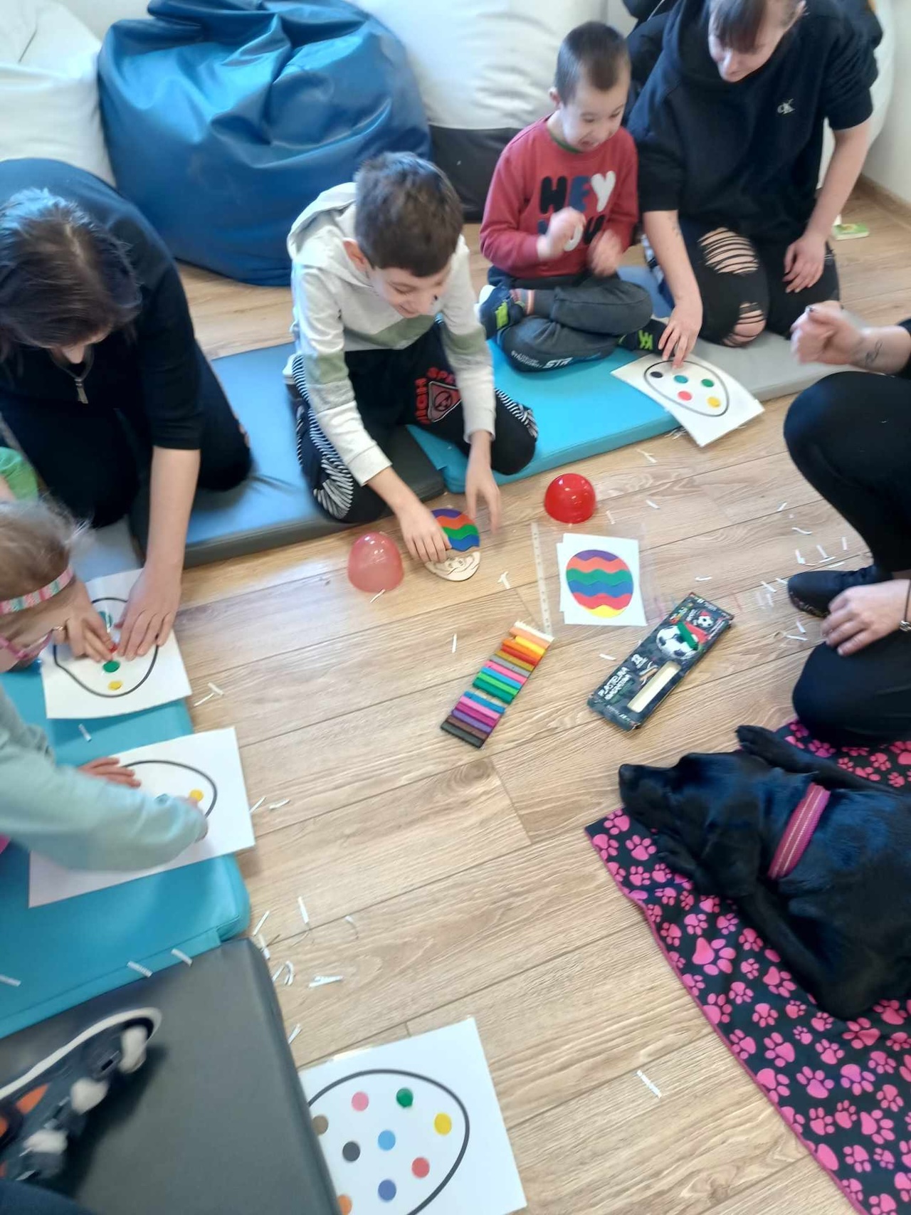 Podczas zajęć w świątecznym tygodniu, dzieci utrwalały kolory, układając kolorowe pisanki i chowając smaczki dla psa pod kolorowym kocykiem świątecznym. Ćwiczyły również przeliczanie, odliczając odpowiednią ilość smaczków dla Vegi oraz rozwijały sprawność manualną i koordynację wzrokowo-ruchową. Przełamywały przy tym lęk w kontakcie z psem.