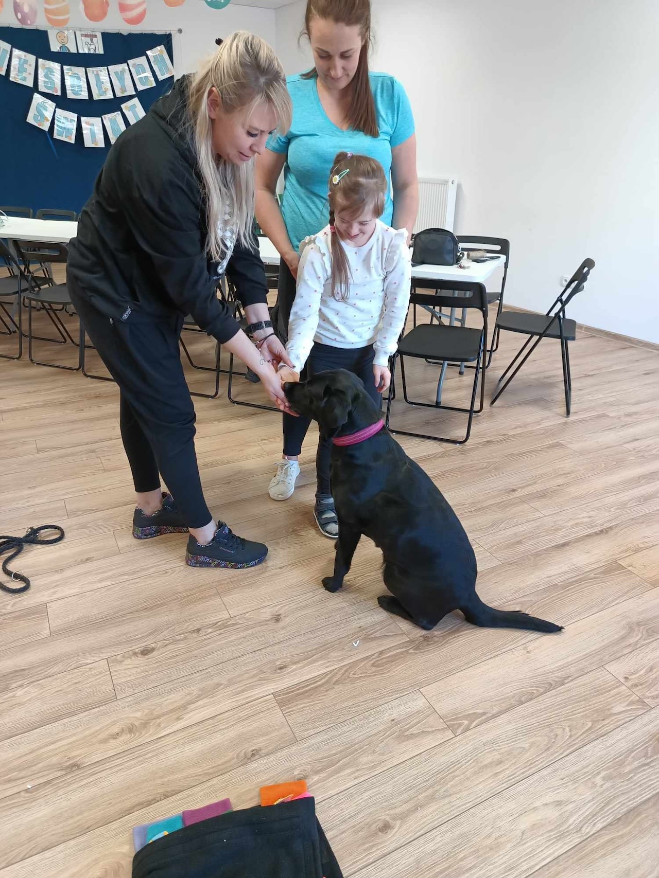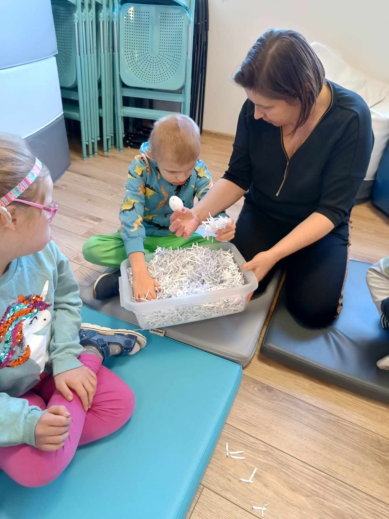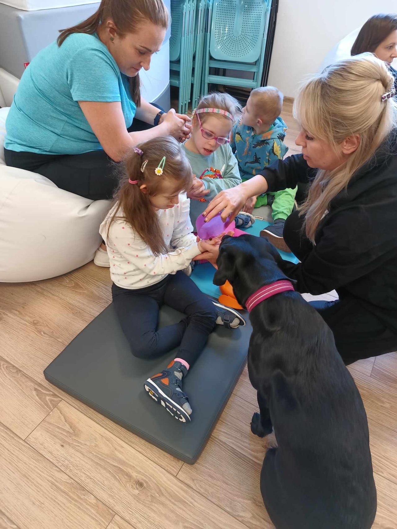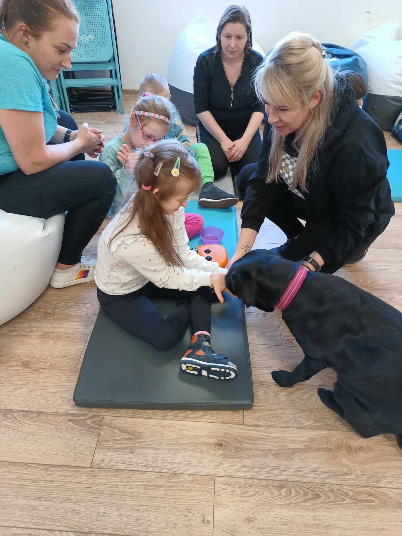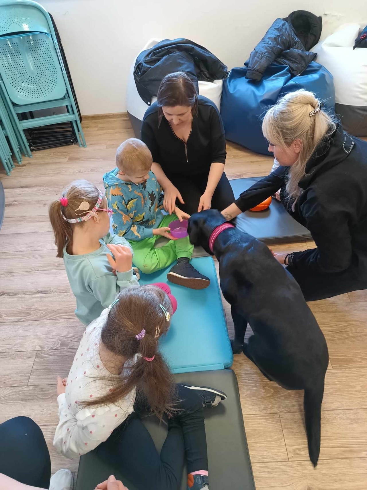 Podczas zajęć w świątecznym tygodniu, dzieci utrwalały kolory, układając kolorowe pisanki i chowając smaczki dla psa pod kolorowym kocykiem świątecznym. Ćwiczyły również przeliczanie, odliczając odpowiednią ilość smaczków dla Vegi oraz rozwijały sprawność manualną i koordynację wzrokowo-ruchową. Przełamywały przy tym lęk w kontakcie z psem.