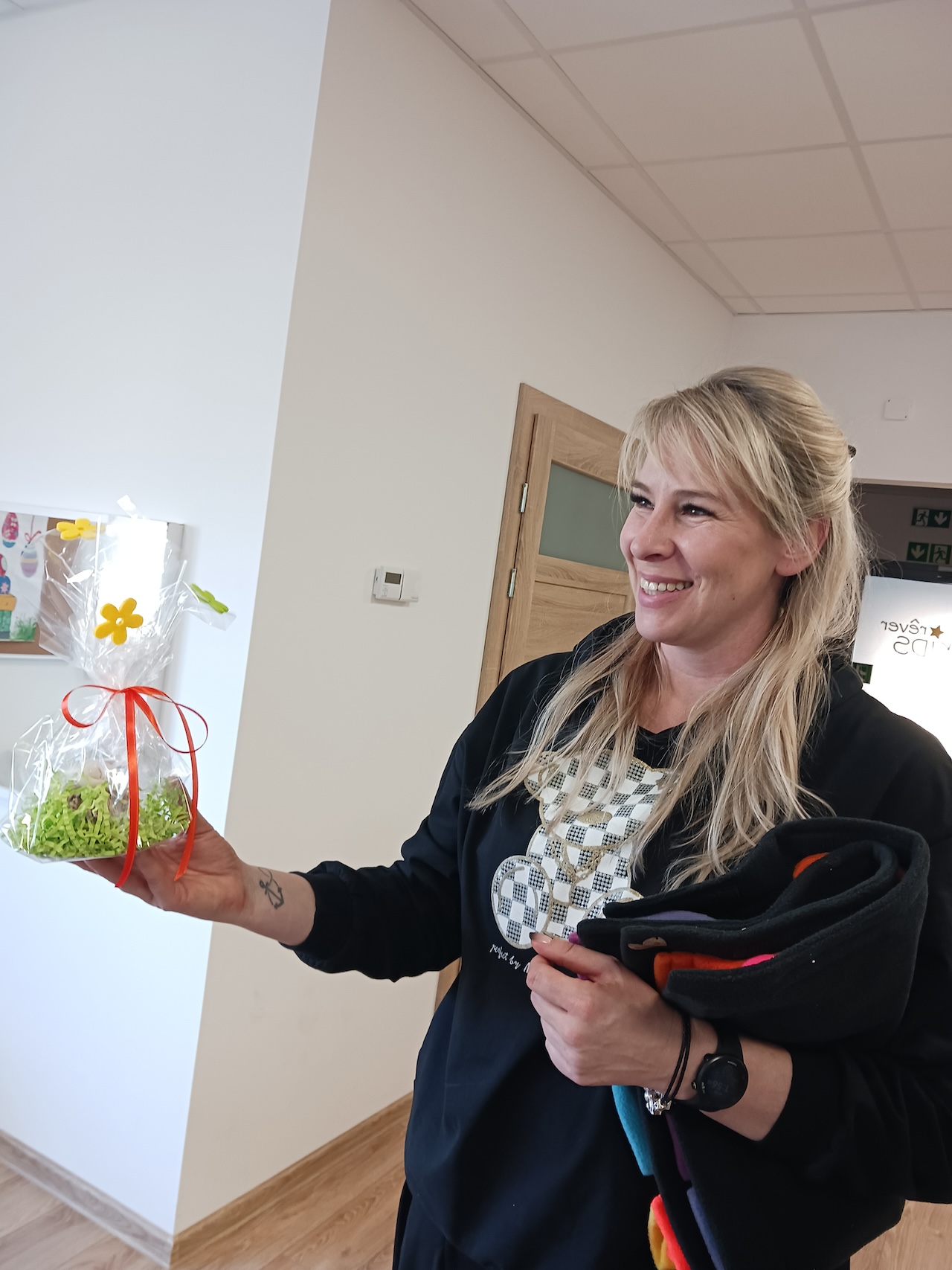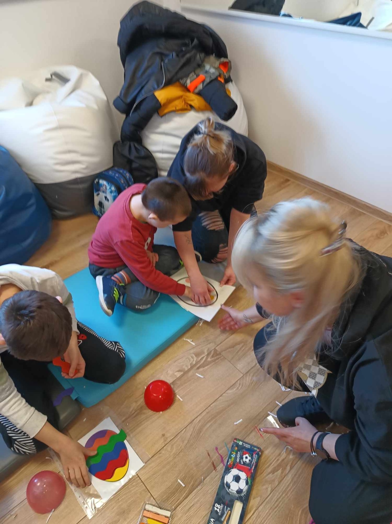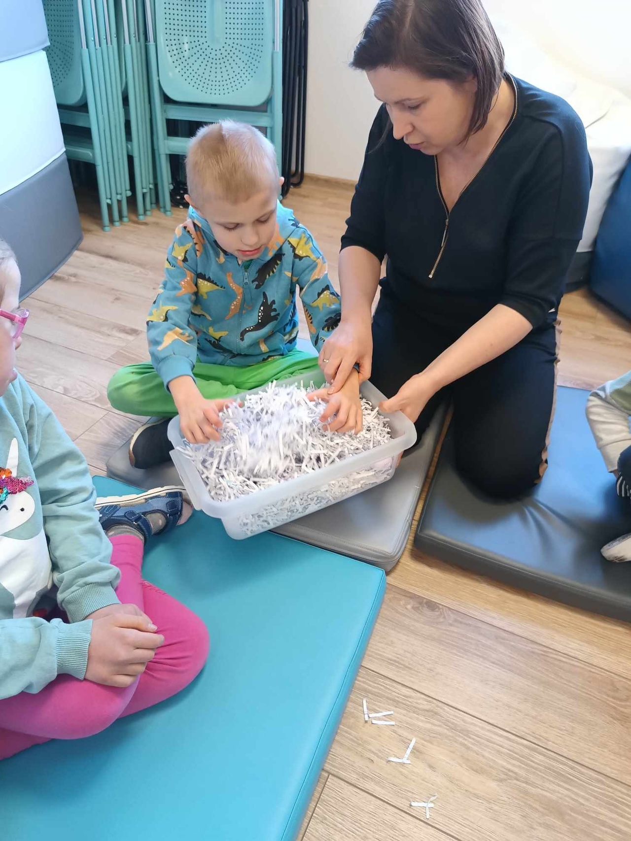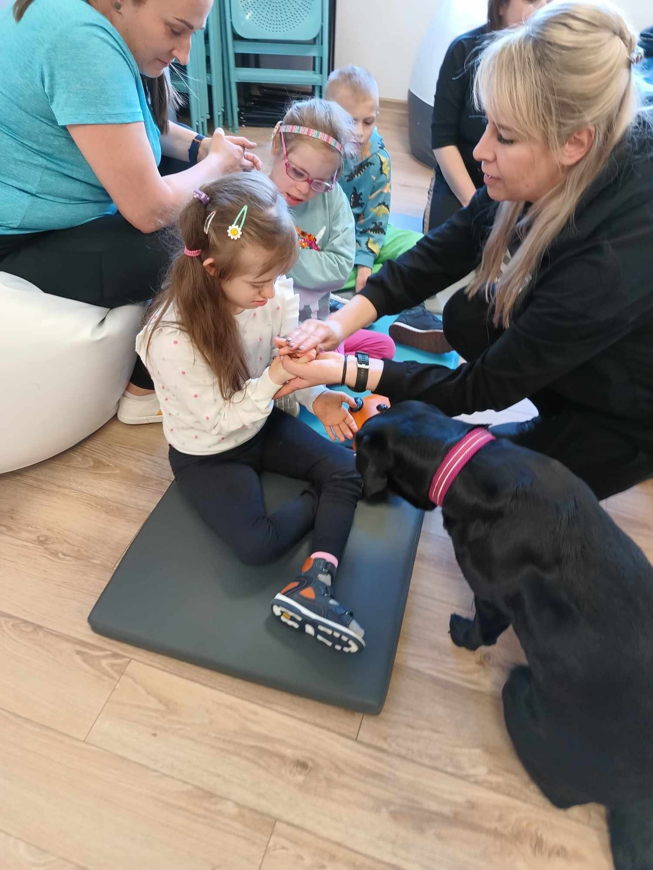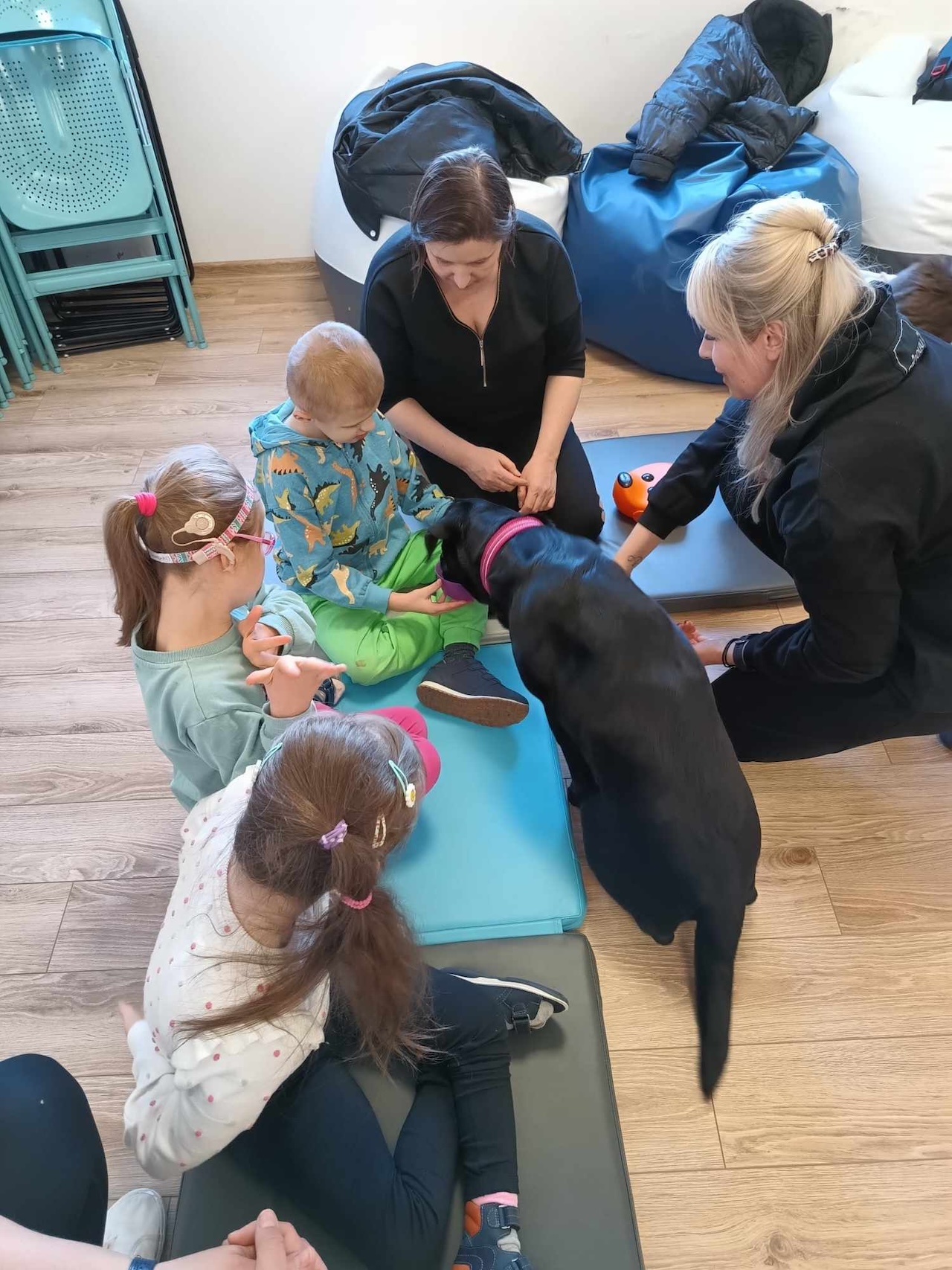 Podczas zajęć w świątecznym tygodniu, dzieci utrwalały kolory, układając kolorowe pisanki i chowając smaczki dla psa pod kolorowym kocykiem świątecznym. Ćwiczyły również przeliczanie, odliczając odpowiednią ilość smaczków dla Vegi oraz rozwijały sprawność manualną i koordynację wzrokowo-ruchową. Przełamywały przy tym lęk w kontakcie z psem.