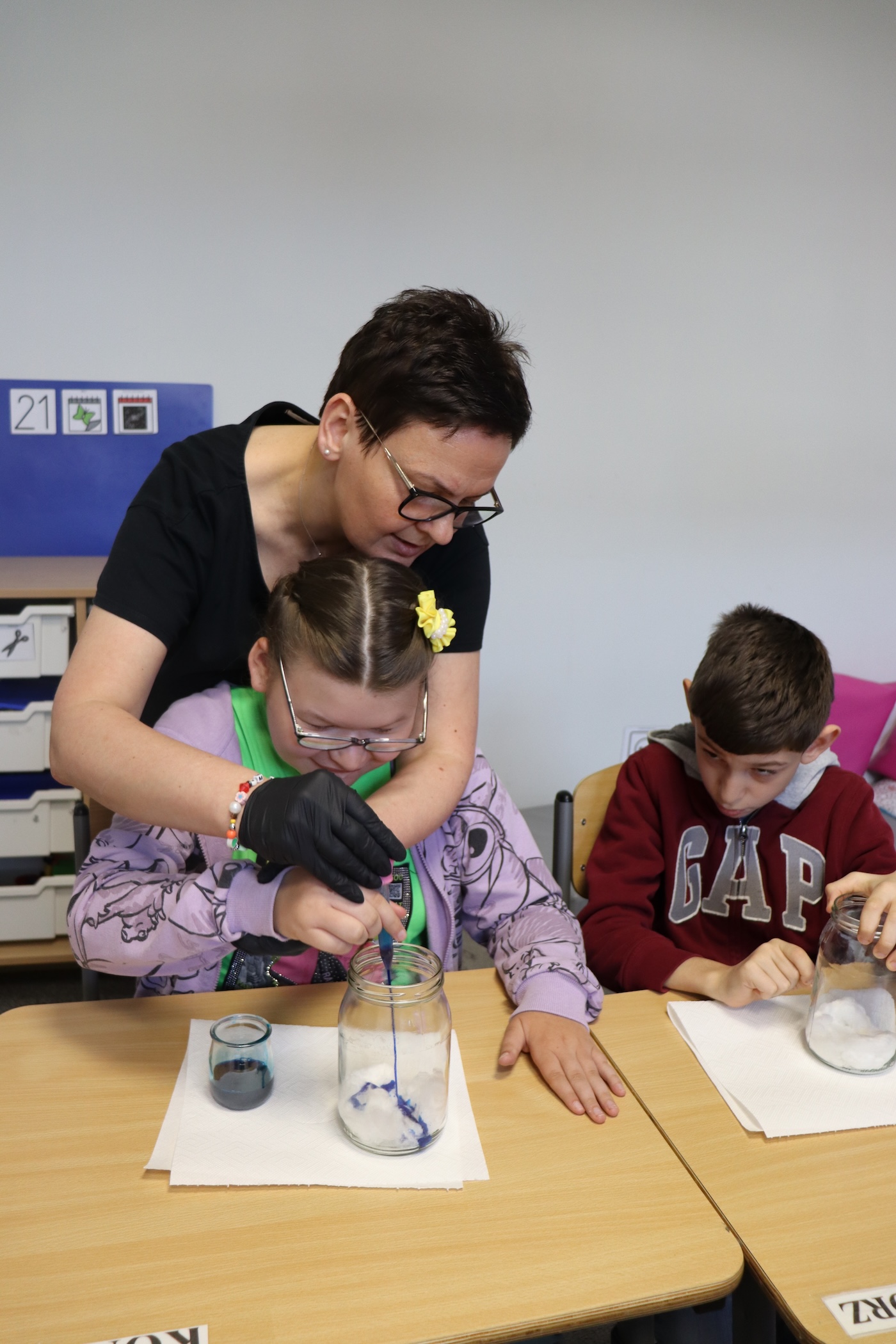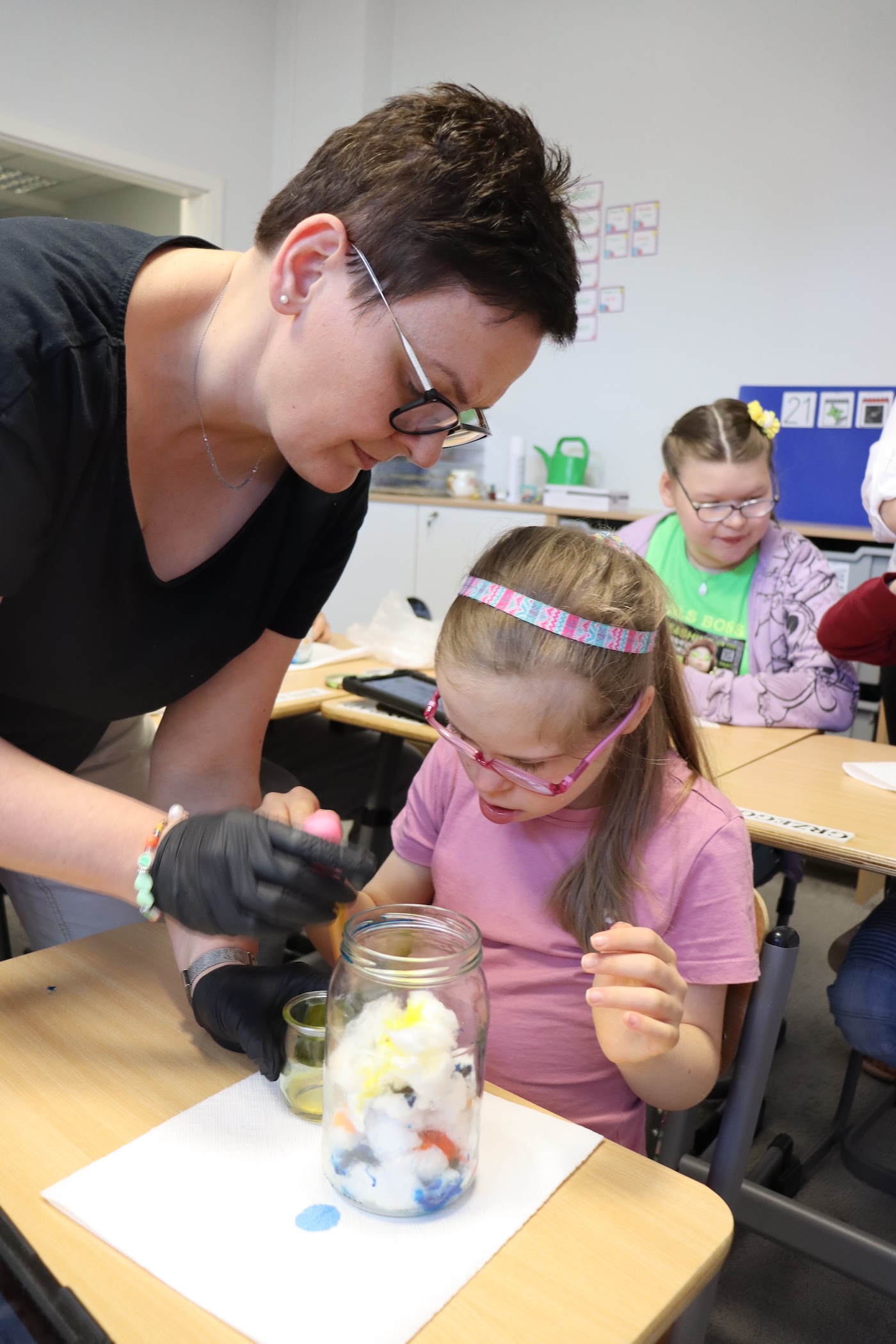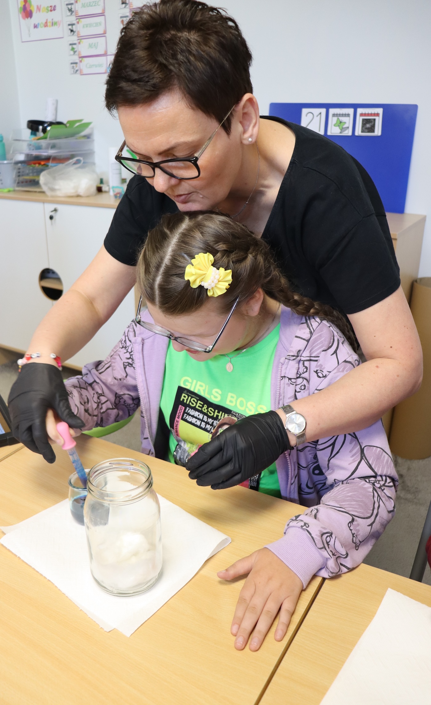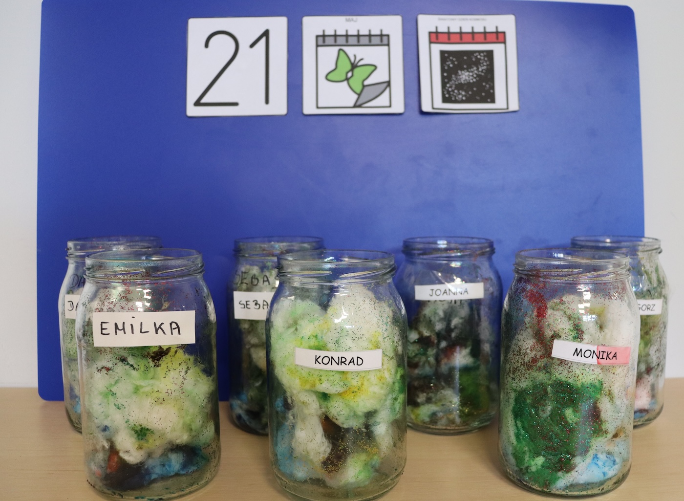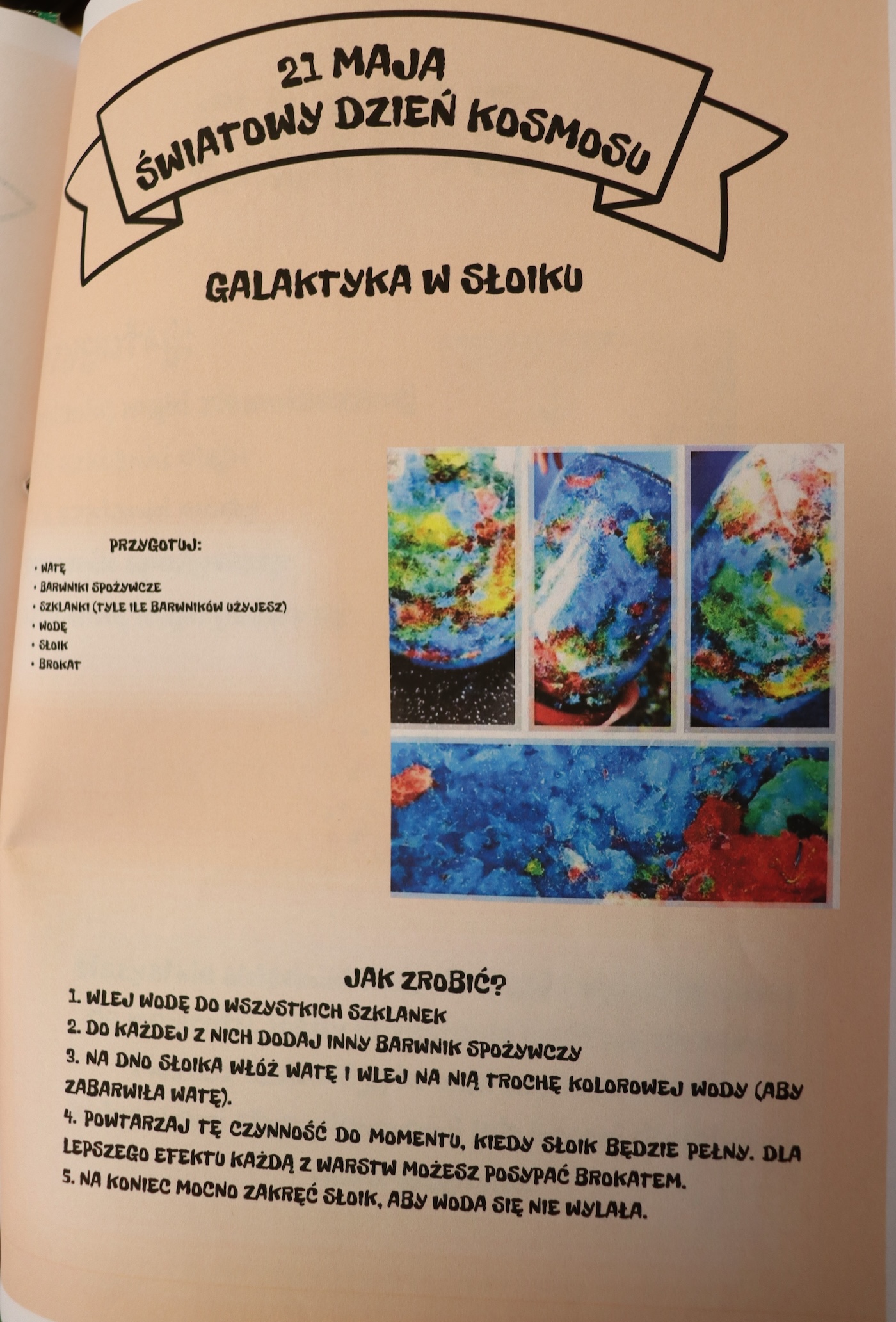 Dnia 21 maja obchodzony jest Światowy Dzień Kosmosu. Uczniowie naszej szkoły tego dnia również poznawali kosmos po przez wysłuchanie piosenki tematycznej, utrwalenie nazw planet i wykonanie pracy tematycznej „Kosmos zamknięty w słoiku” . Najciekawszym punktem dnia był eksperyment do którego wykorzystaliśmy : watę , barwniki, wodę , brokat i słoiki. Celem pracy było rozwijanie sprawności manualnych i koordynacji wzrokowo – ruchowej oraz rozwijanie kreatywności.