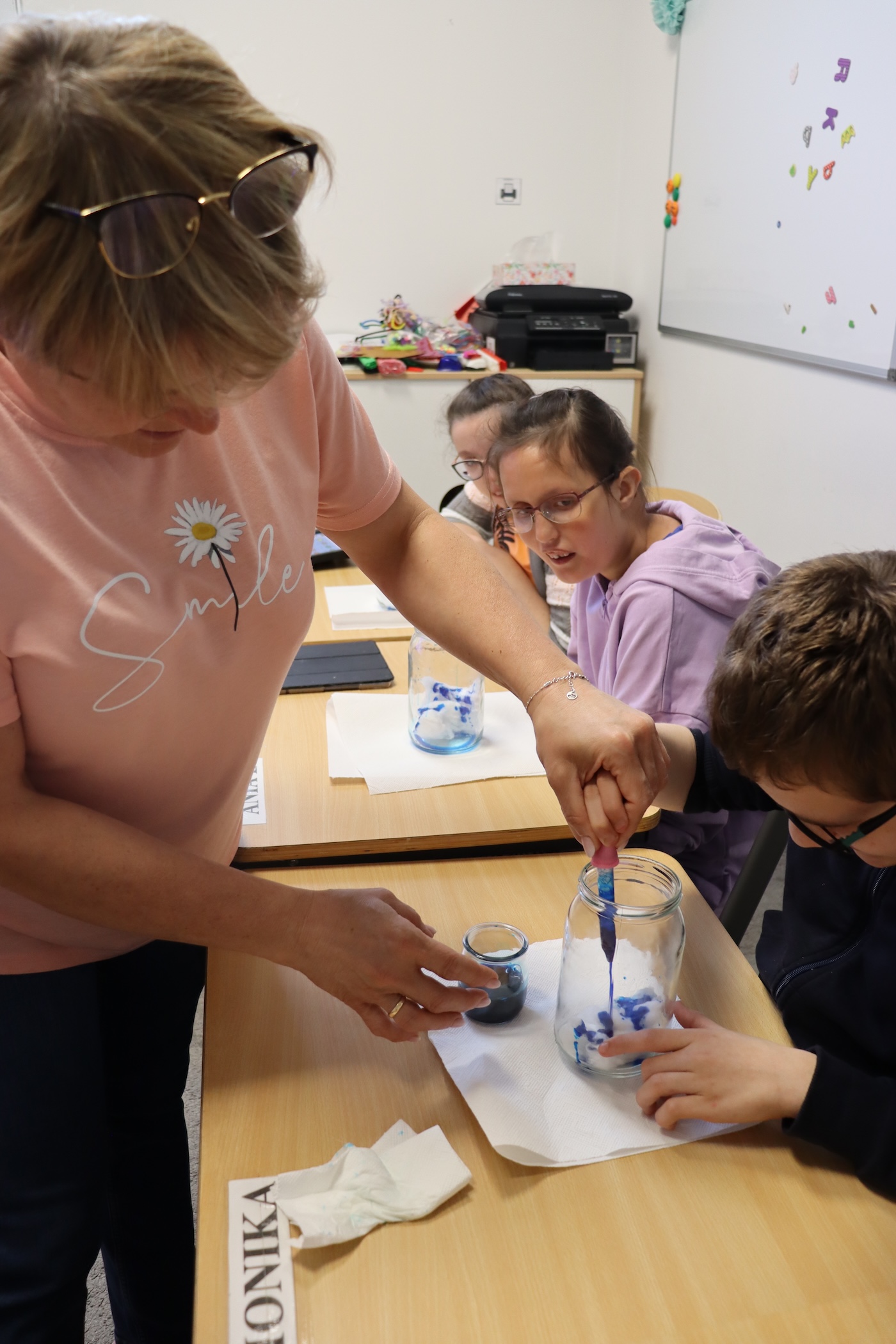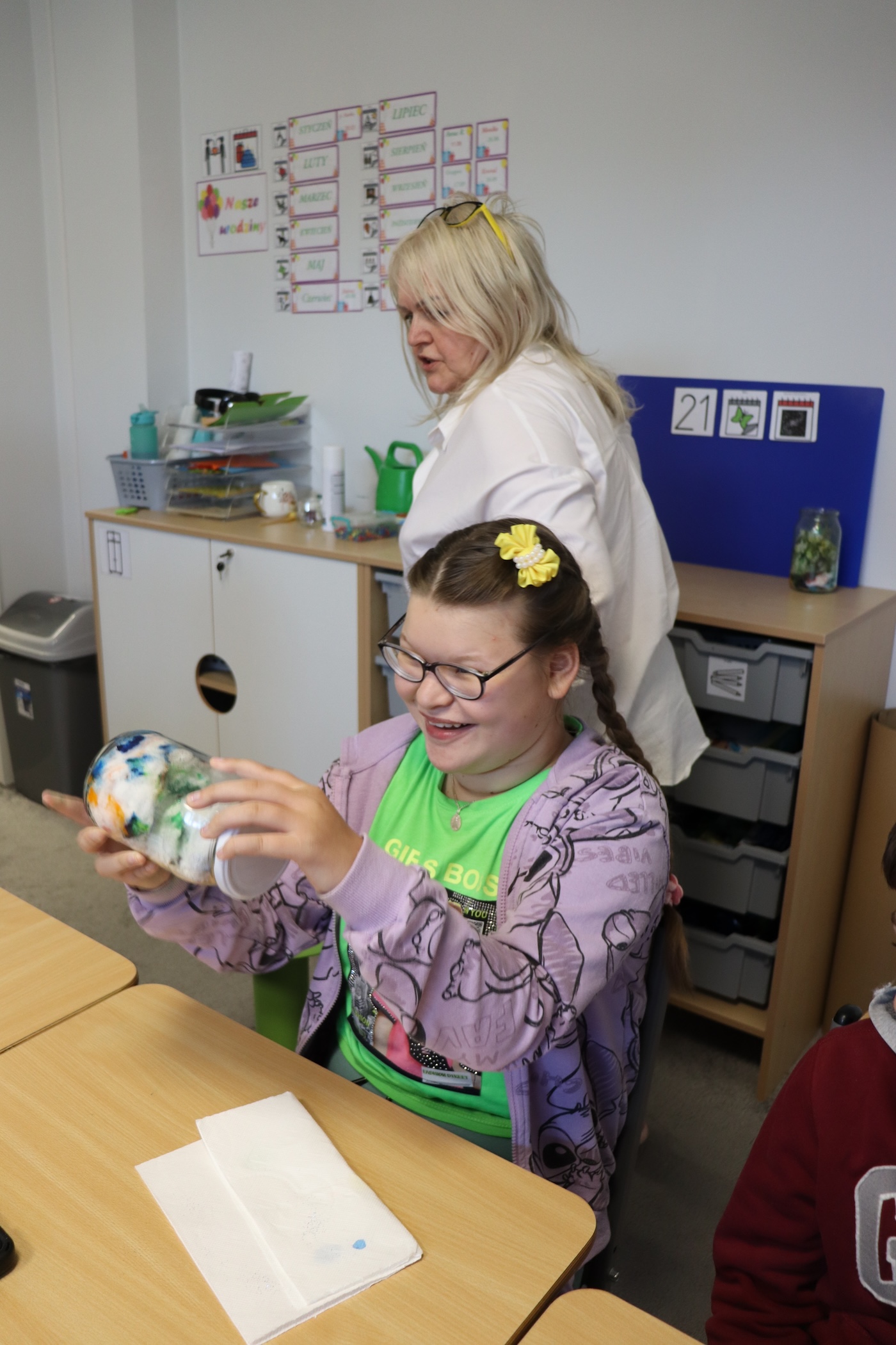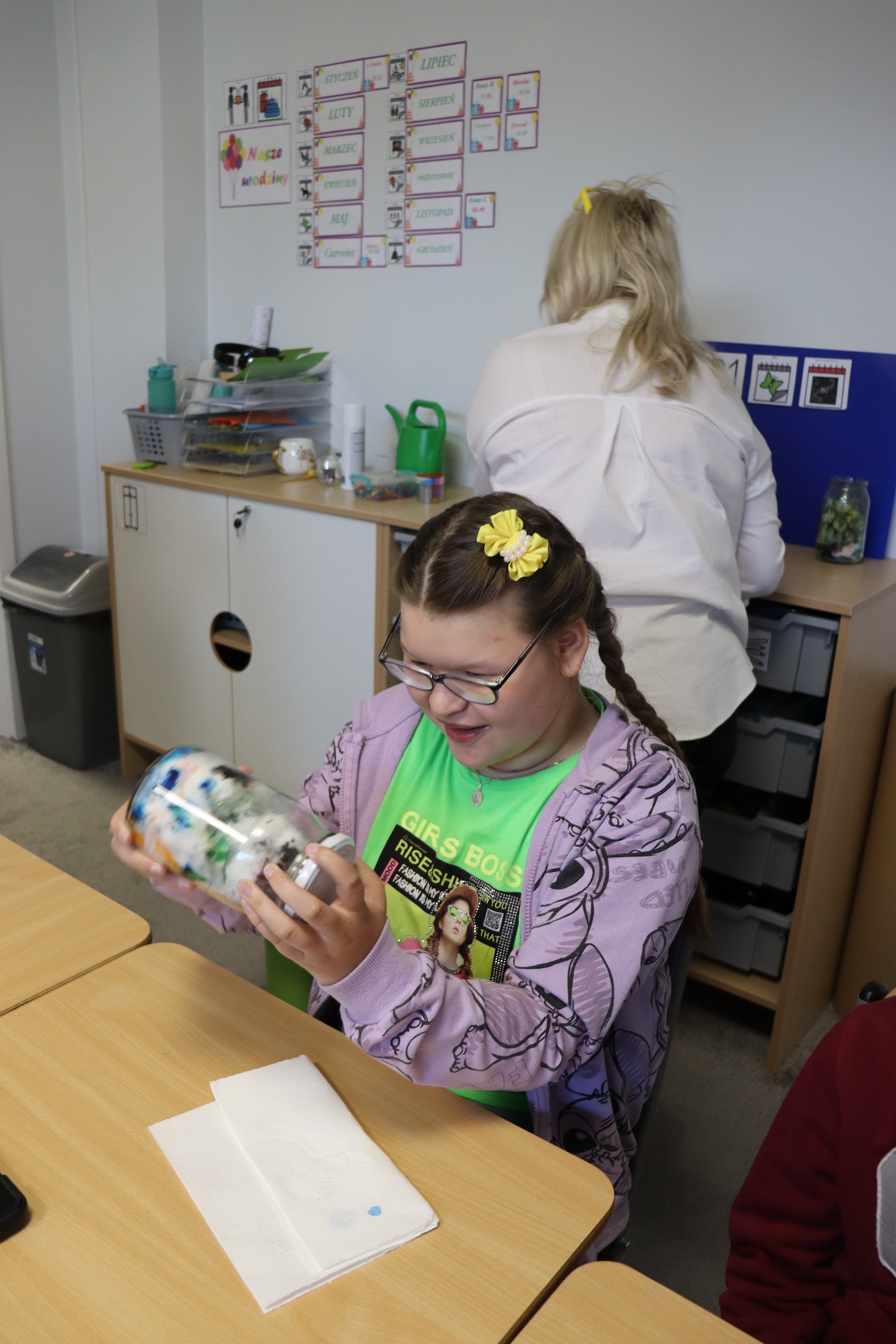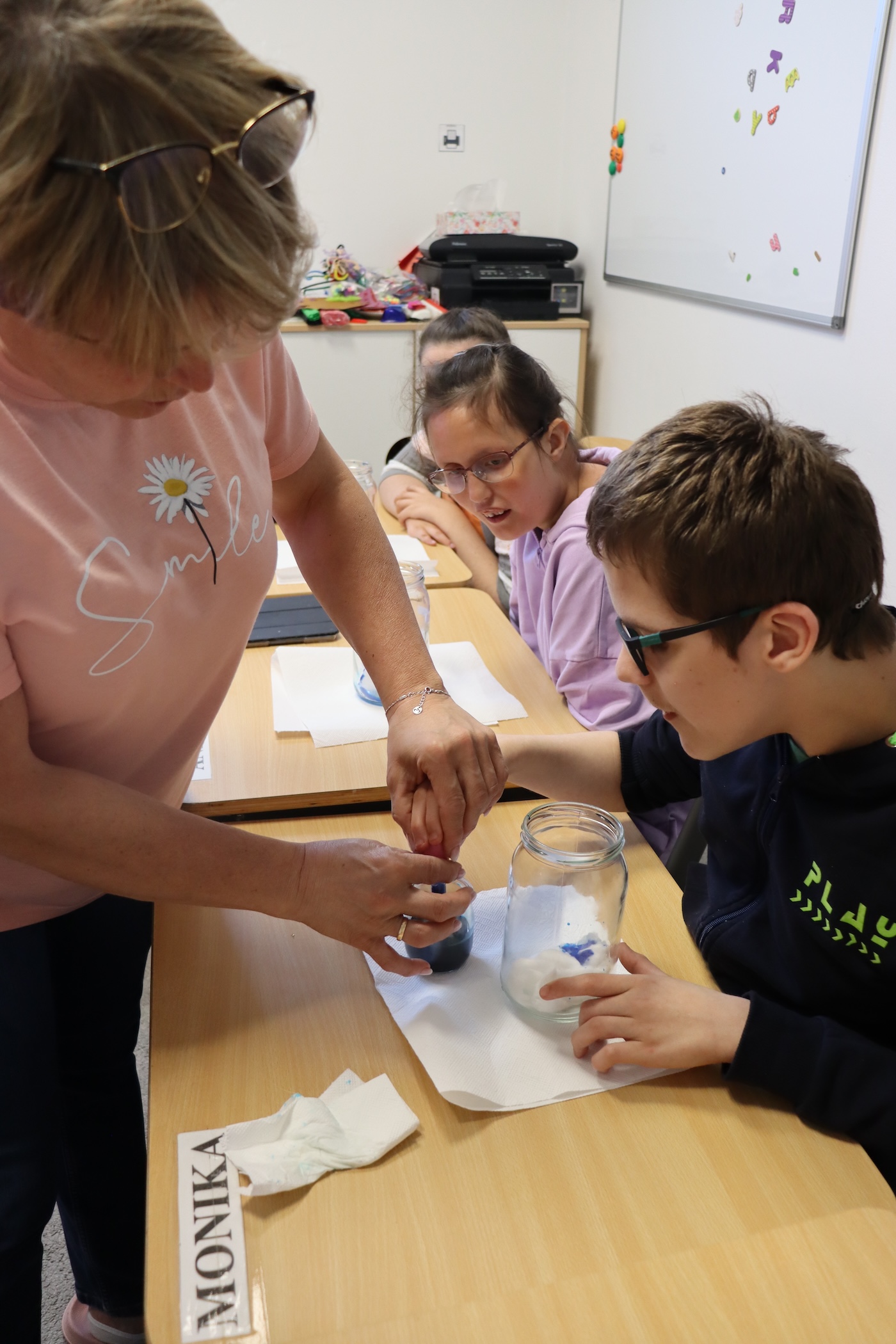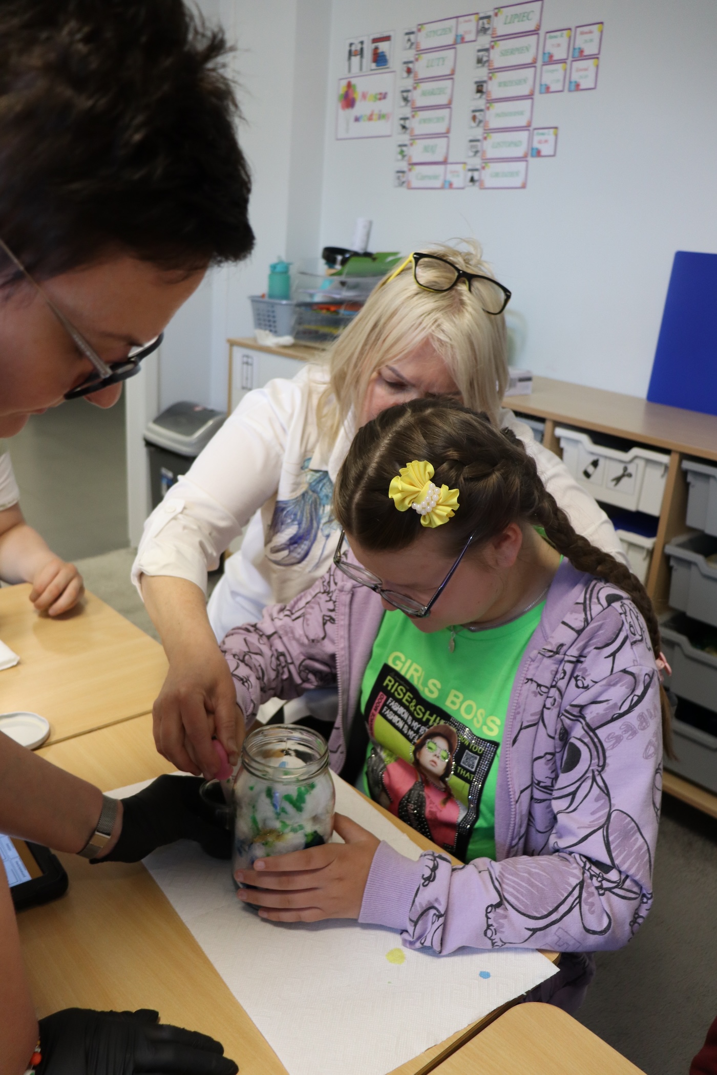 Dnia 21 maja obchodzony jest Światowy Dzień Kosmosu. Uczniowie naszej szkoły tego dnia również poznawali kosmos po przez wysłuchanie piosenki tematycznej, utrwalenie nazw planet i wykonanie pracy tematycznej „Kosmos zamknięty w słoiku” . Najciekawszym punktem dnia był eksperyment do którego wykorzystaliśmy : watę , barwniki, wodę , brokat i słoiki. Celem pracy było rozwijanie sprawności manualnych i koordynacji wzrokowo – ruchowej oraz rozwijanie kreatywności.