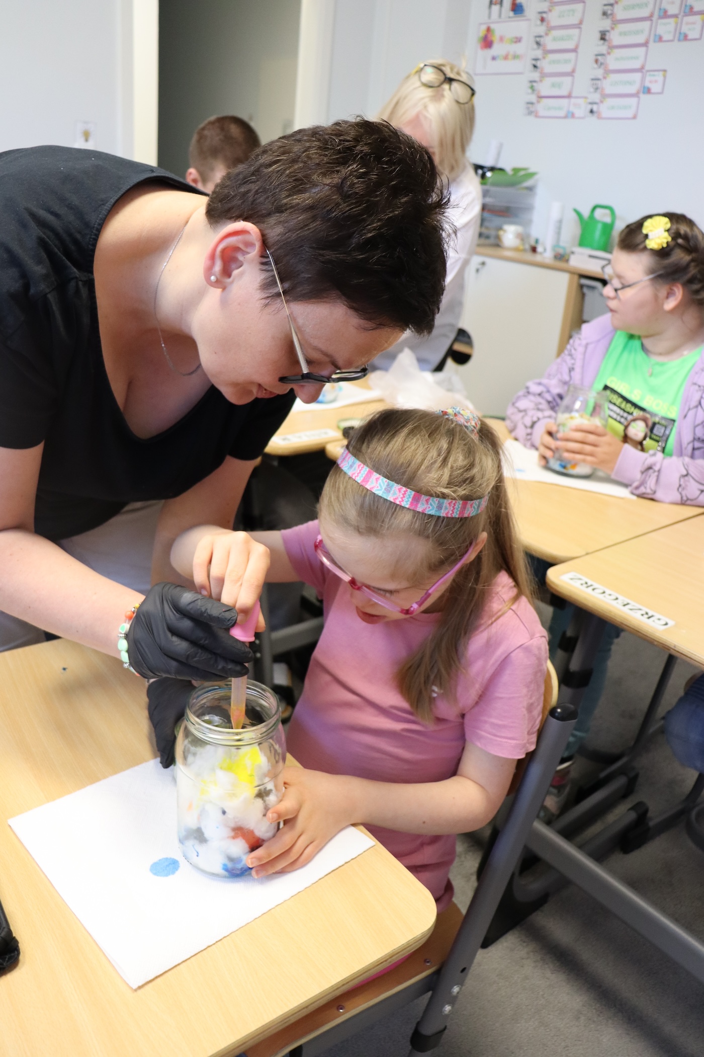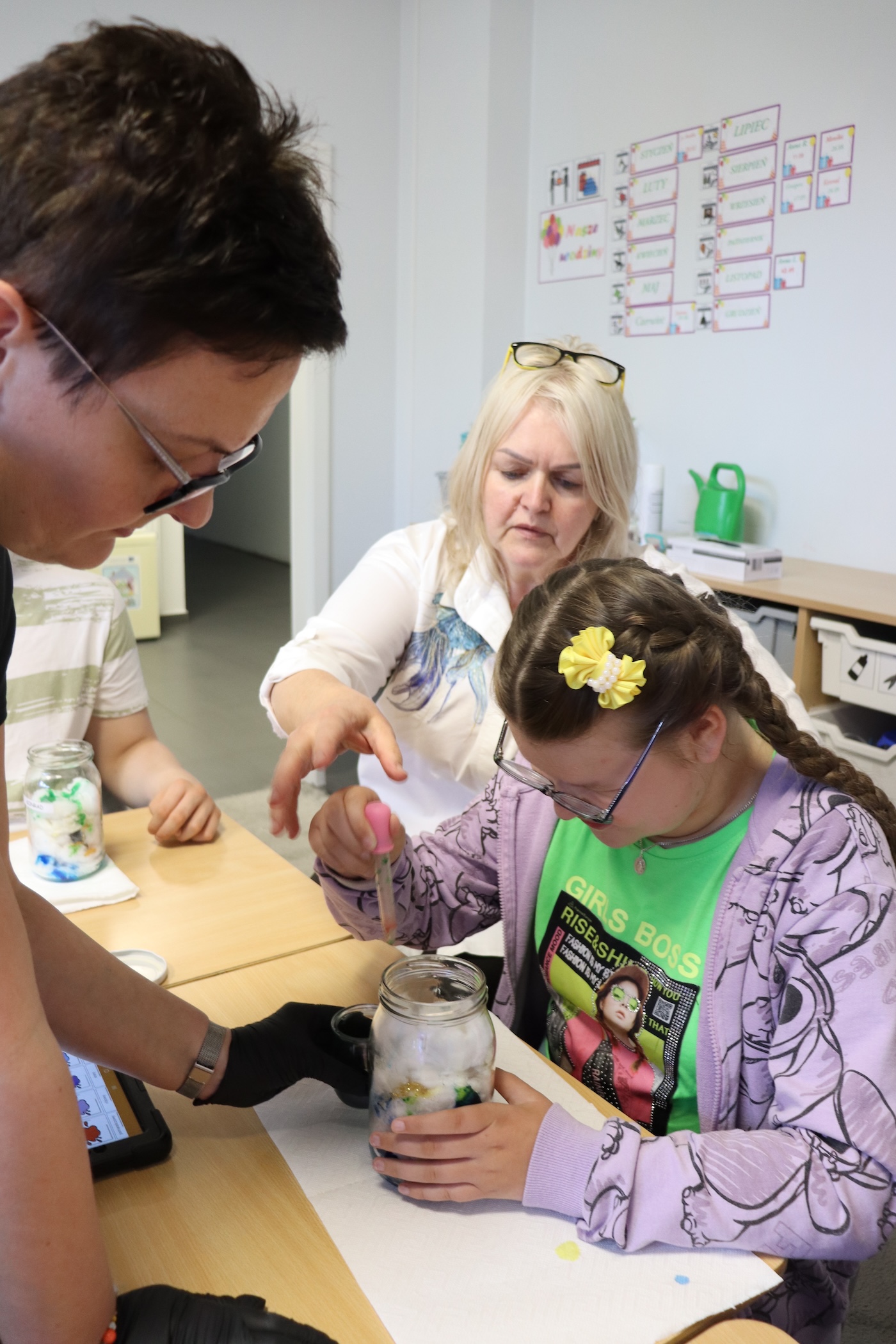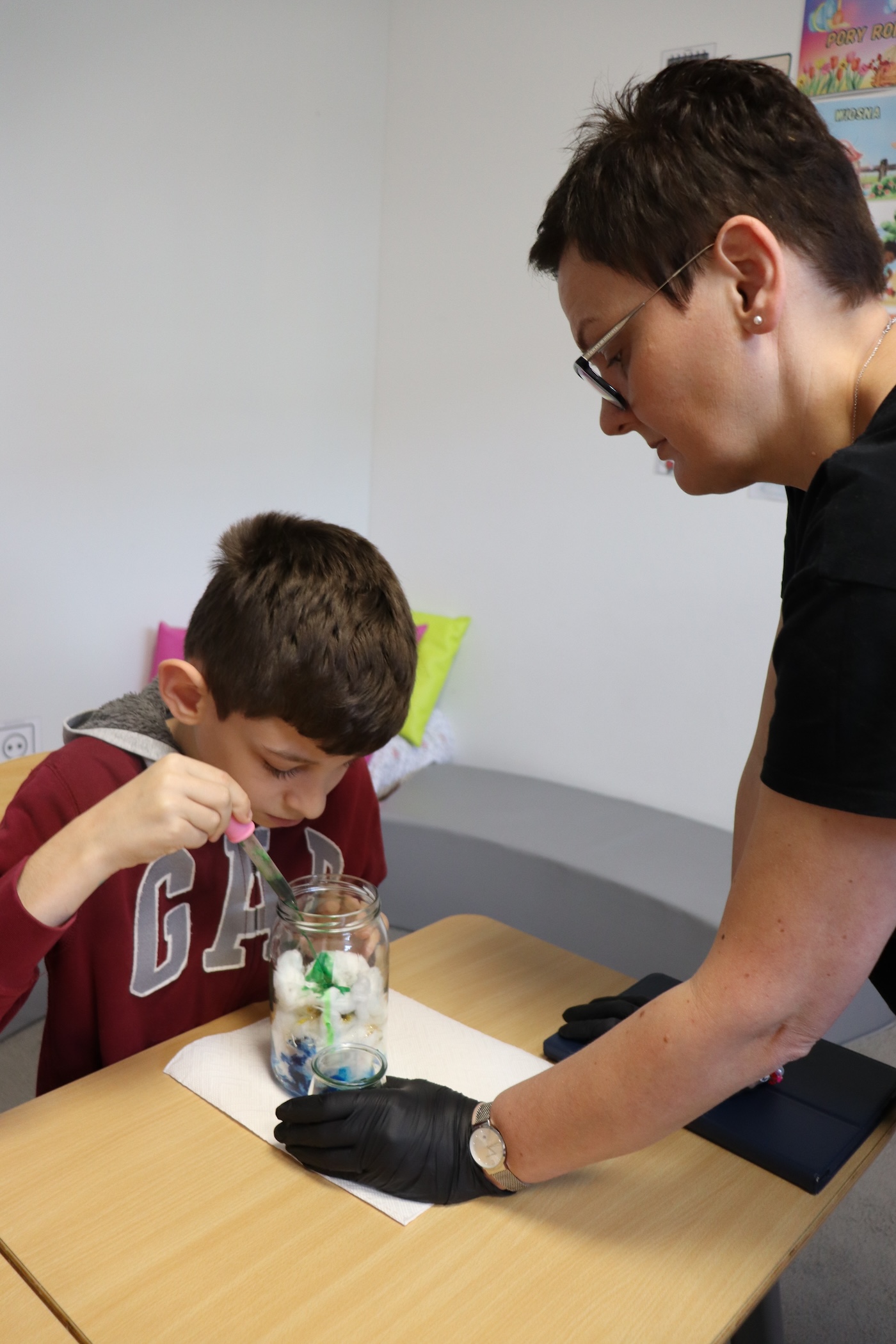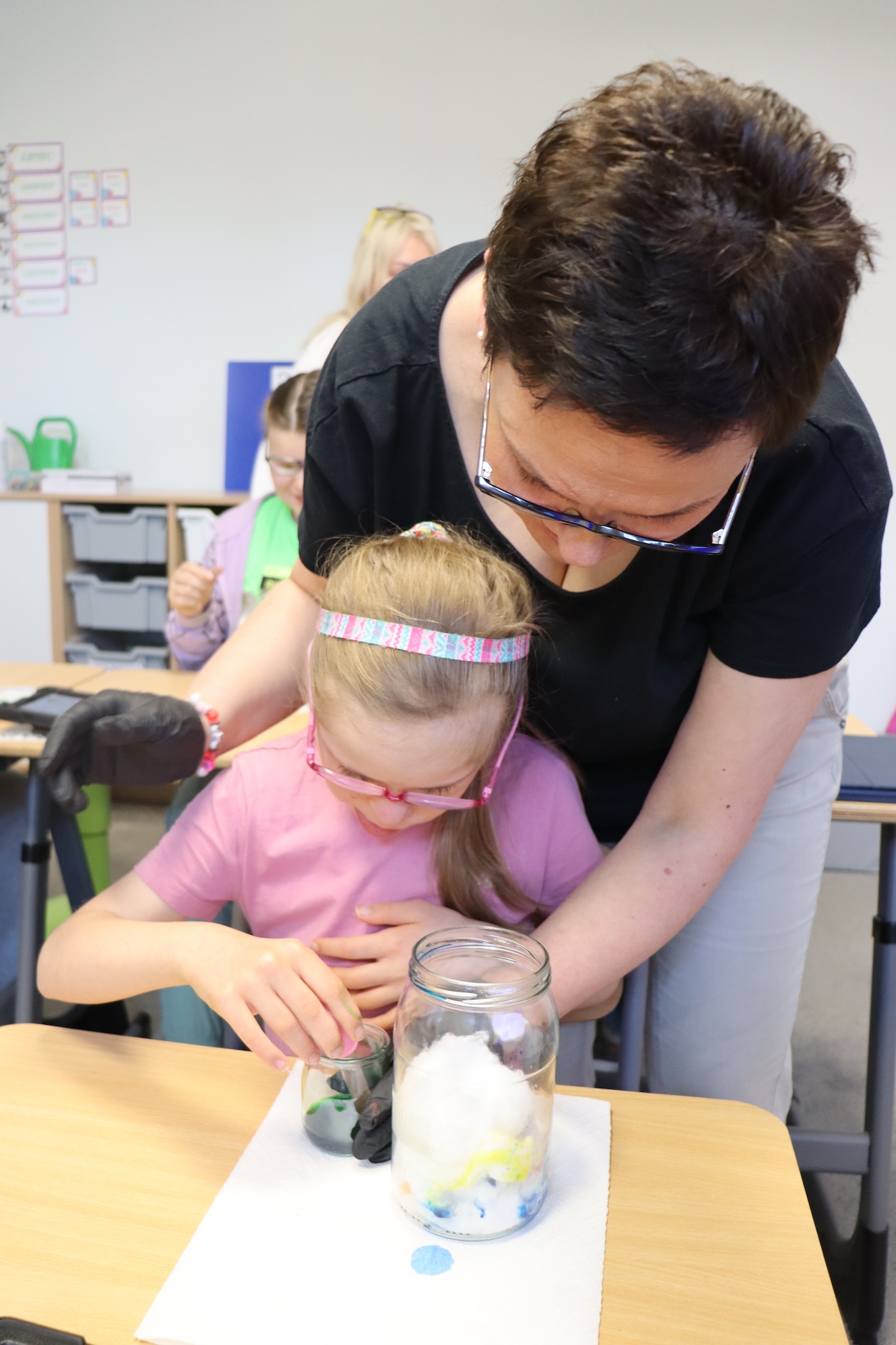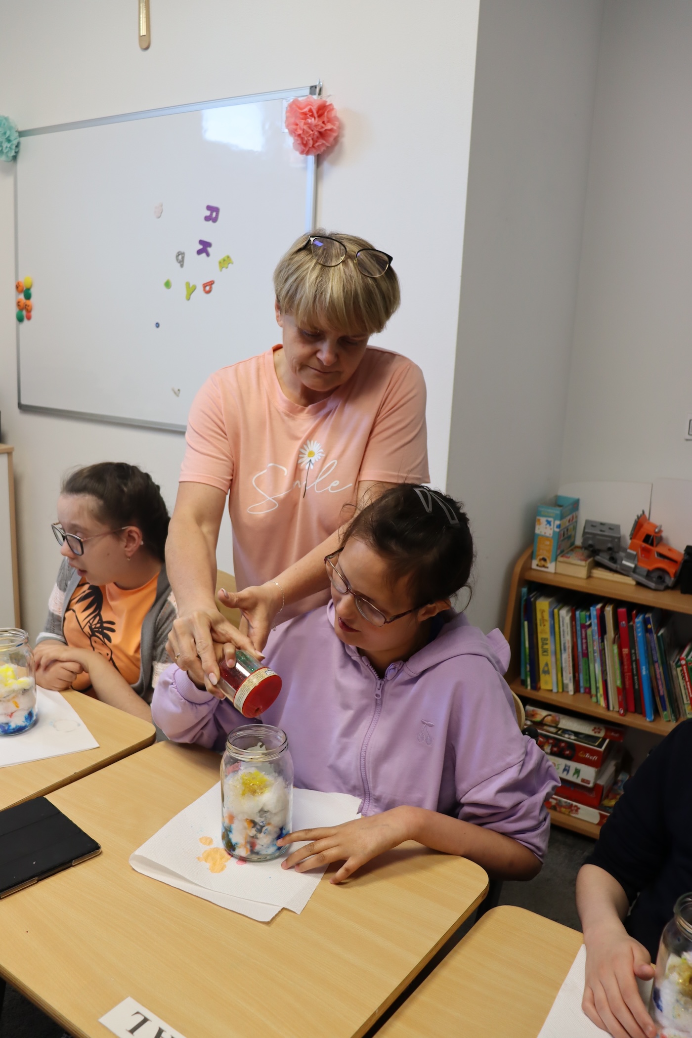 Dnia 21 maja obchodzony jest Światowy Dzień Kosmosu. Uczniowie naszej szkoły tego dnia również poznawali kosmos po przez wysłuchanie piosenki tematycznej, utrwalenie nazw planet i wykonanie pracy tematycznej „Kosmos zamknięty w słoiku” . Najciekawszym punktem dnia był eksperyment do którego wykorzystaliśmy : watę , barwniki, wodę , brokat i słoiki. Celem pracy było rozwijanie sprawności manualnych i koordynacji wzrokowo – ruchowej oraz rozwijanie kreatywności.
