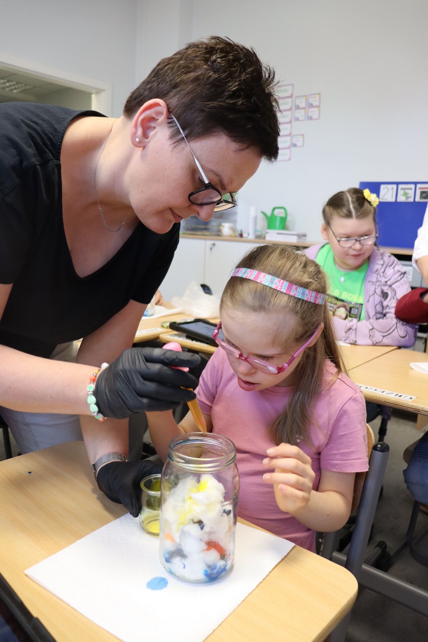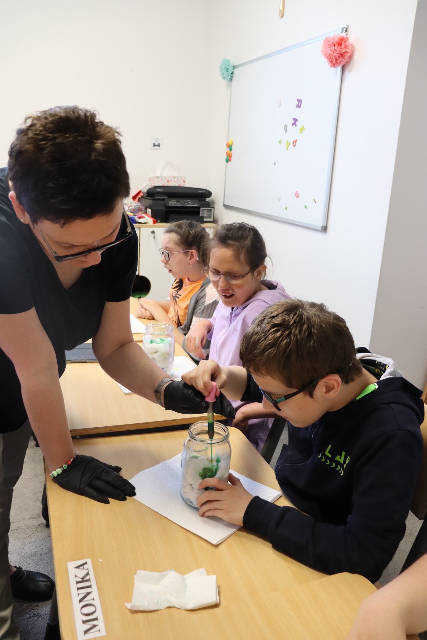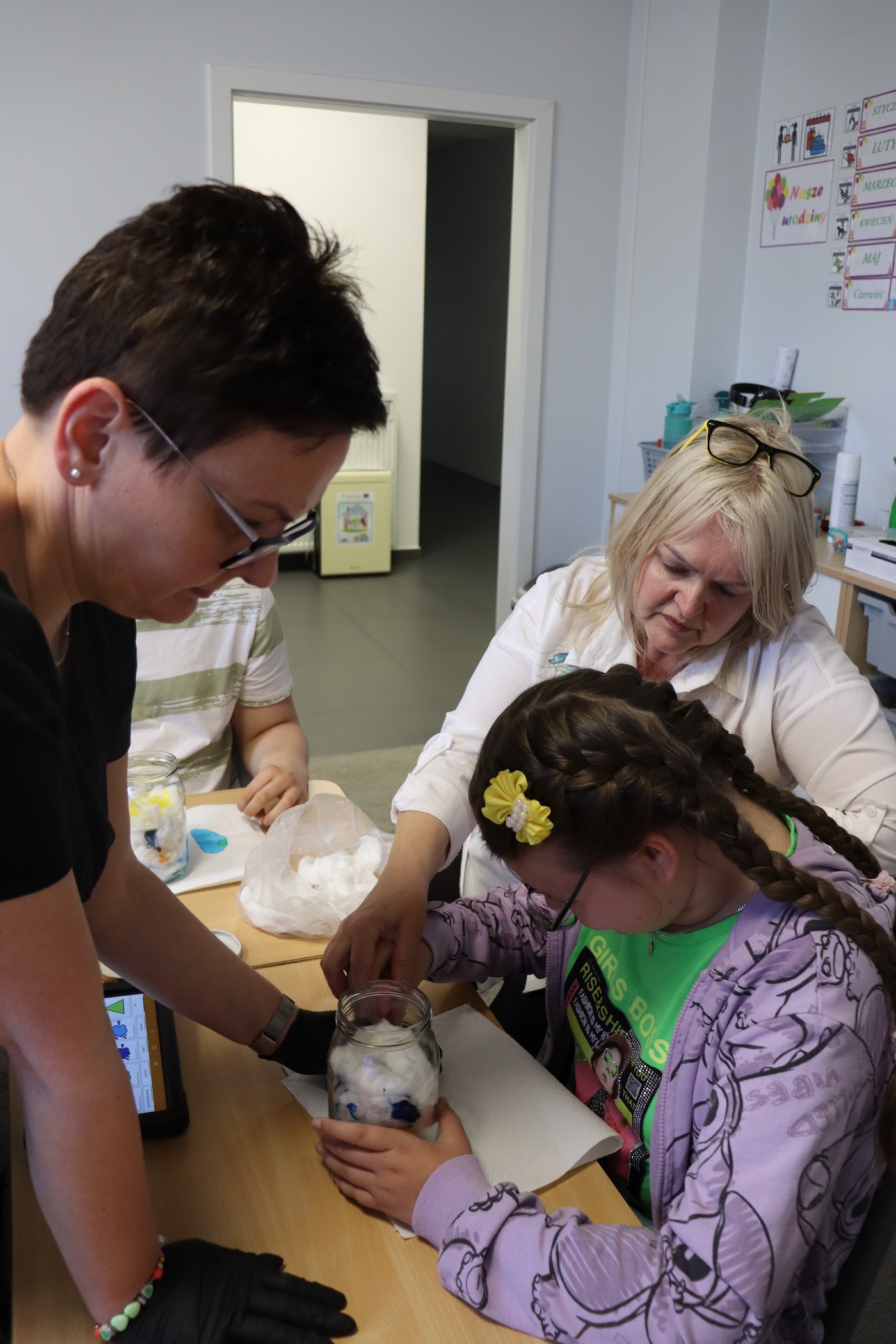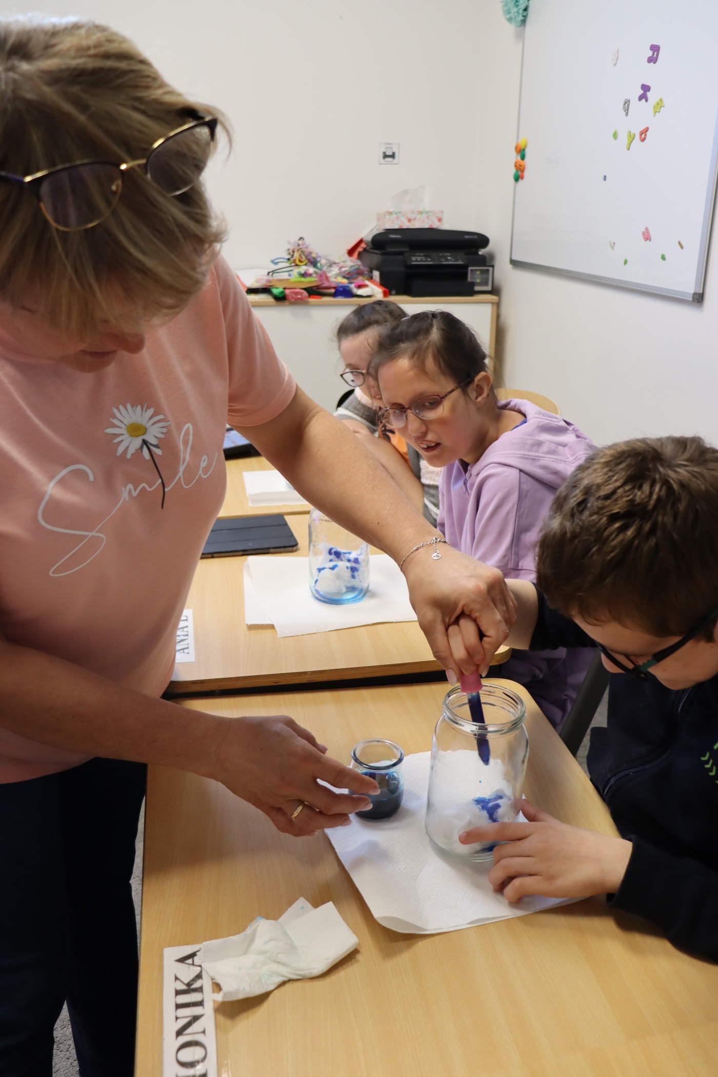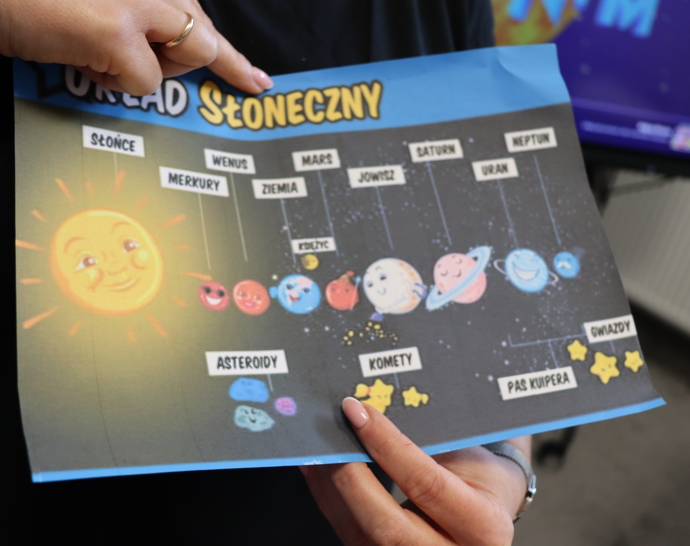 Dnia 21 maja obchodzony jest Światowy Dzień Kosmosu. Uczniowie naszej szkoły tego dnia również poznawali kosmos po przez wysłuchanie piosenki tematycznej, utrwalenie nazw planet i wykonanie pracy tematycznej „Kosmos zamknięty w słoiku” . Najciekawszym punktem dnia był eksperyment do którego wykorzystaliśmy : watę , barwniki, wodę , brokat i słoiki. Celem pracy było rozwijanie sprawności manualnych i koordynacji wzrokowo – ruchowej oraz rozwijanie kreatywności.