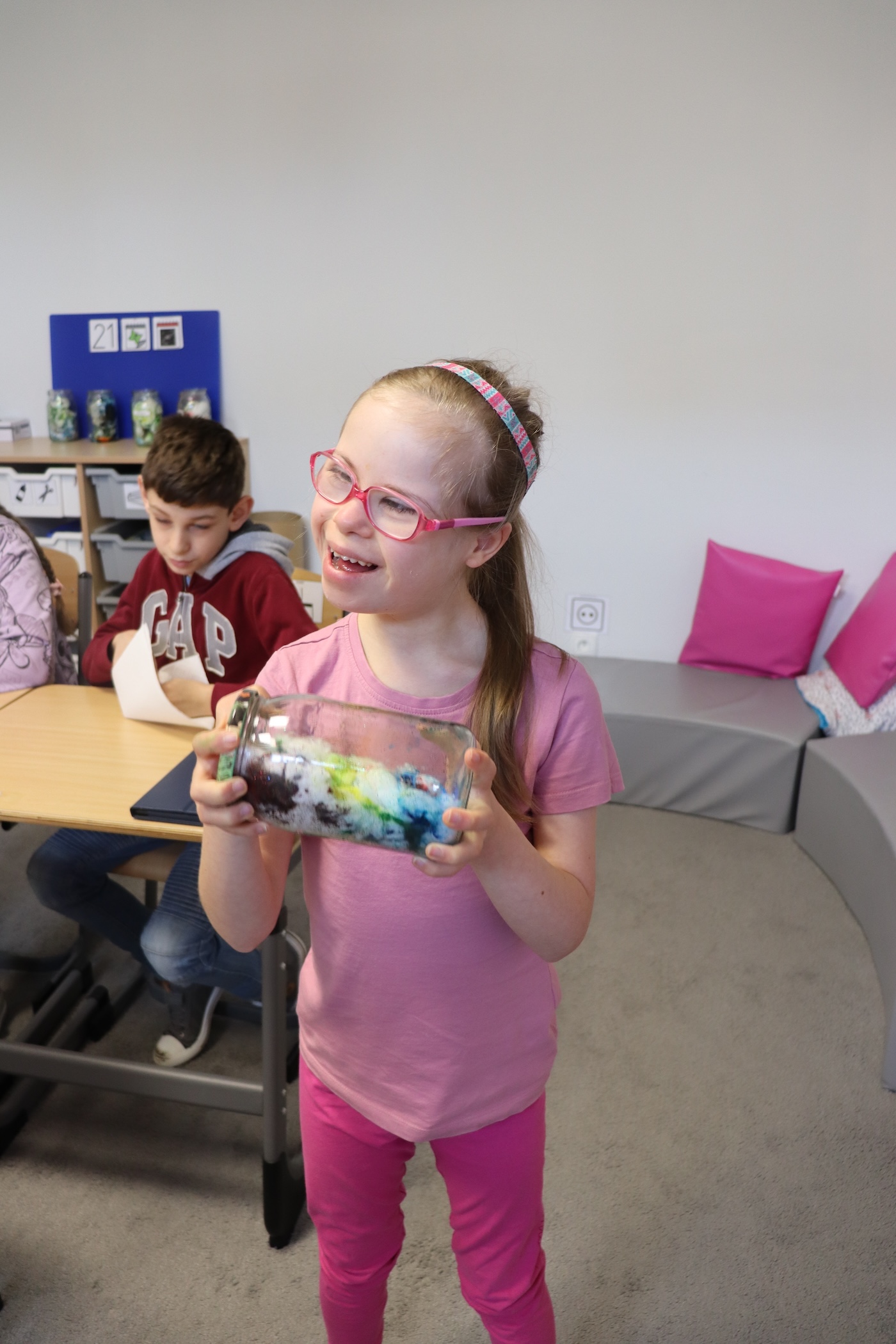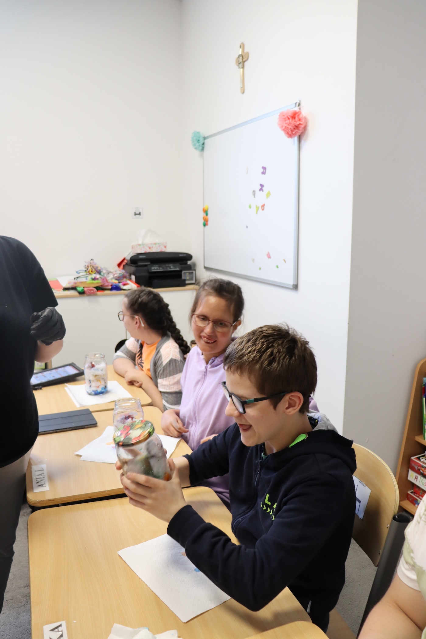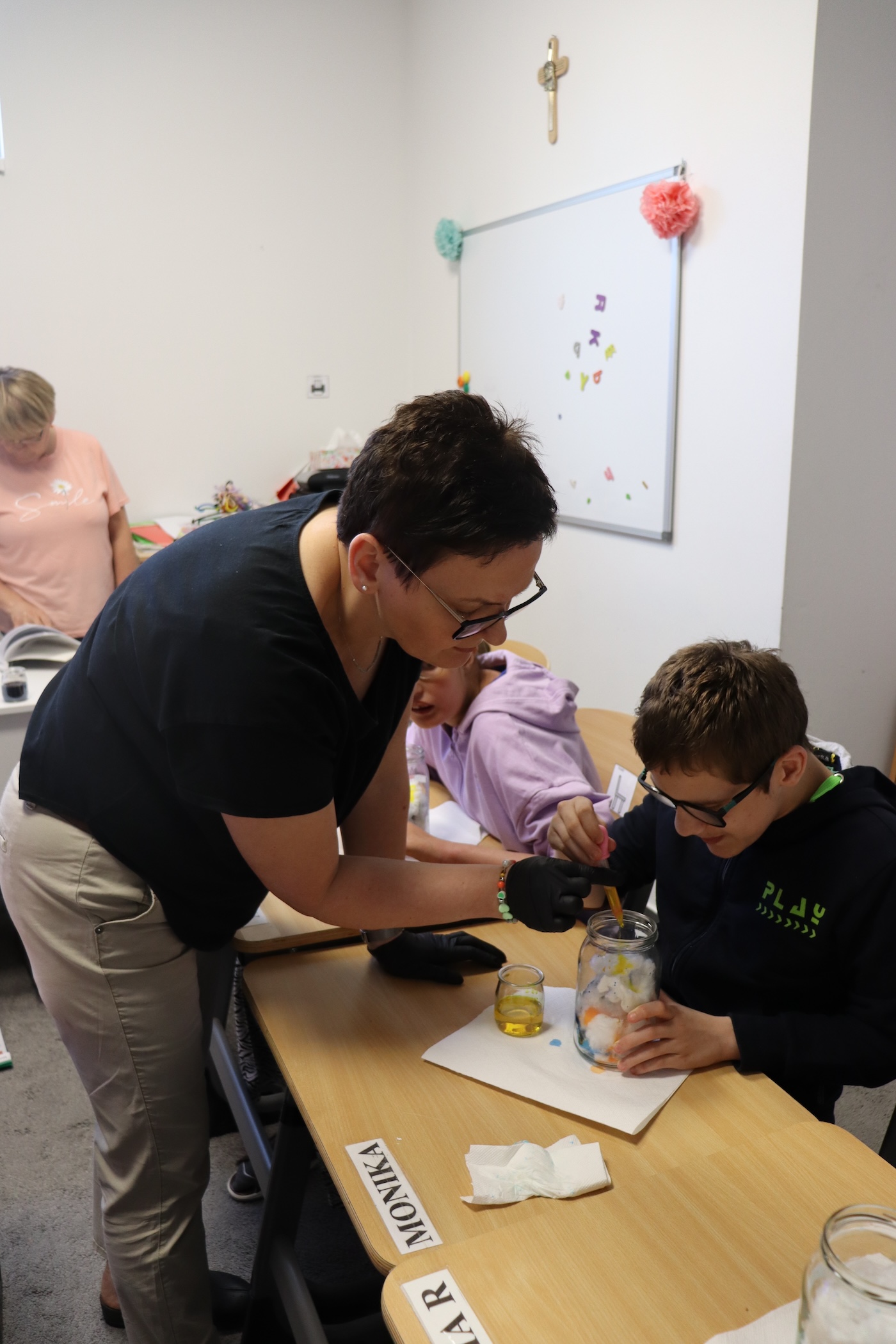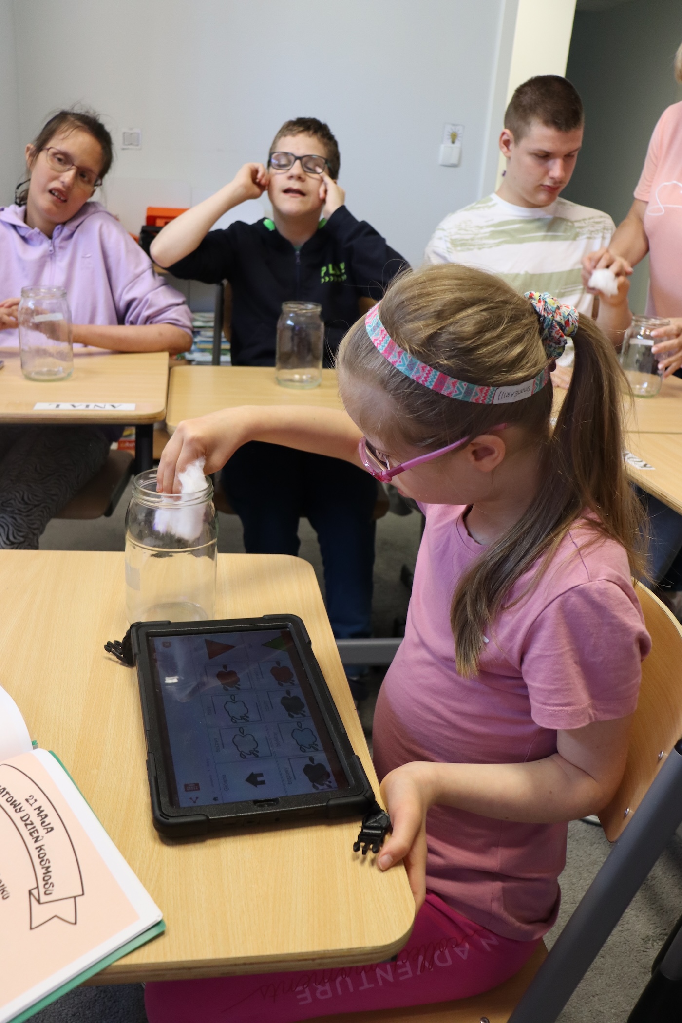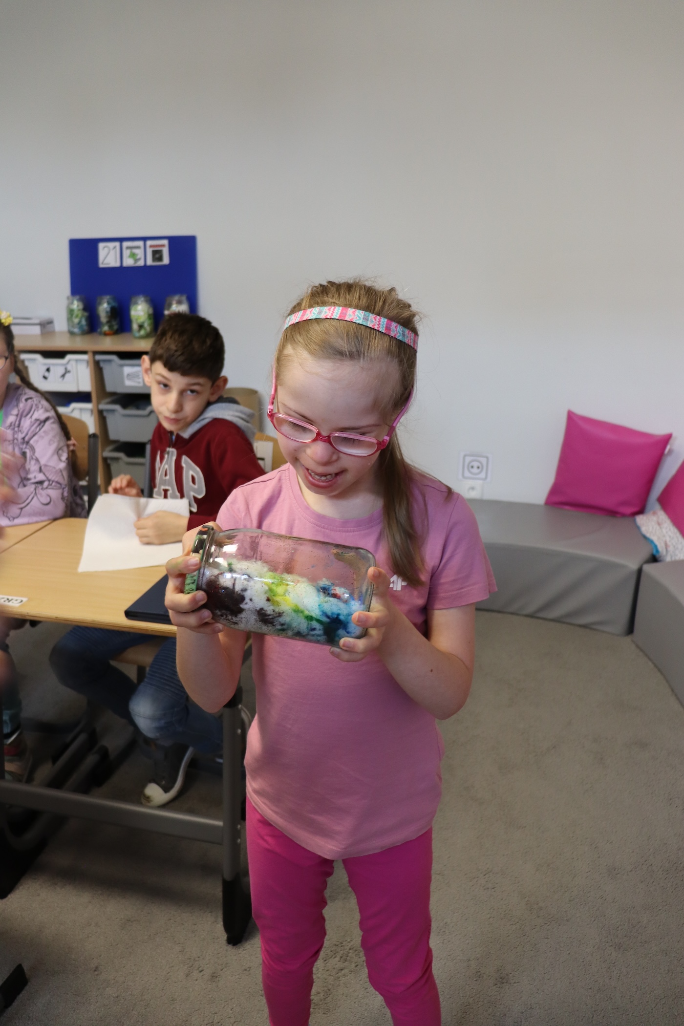 Dnia 21 maja obchodzony jest Światowy Dzień Kosmosu. Uczniowie naszej szkoły tego dnia również poznawali kosmos po przez wysłuchanie piosenki tematycznej, utrwalenie nazw planet i wykonanie pracy tematycznej „Kosmos zamknięty w słoiku” . Najciekawszym punktem dnia był eksperyment do którego wykorzystaliśmy : watę , barwniki, wodę , brokat i słoiki. Celem pracy było rozwijanie sprawności manualnych i koordynacji wzrokowo – ruchowej oraz rozwijanie kreatywności.