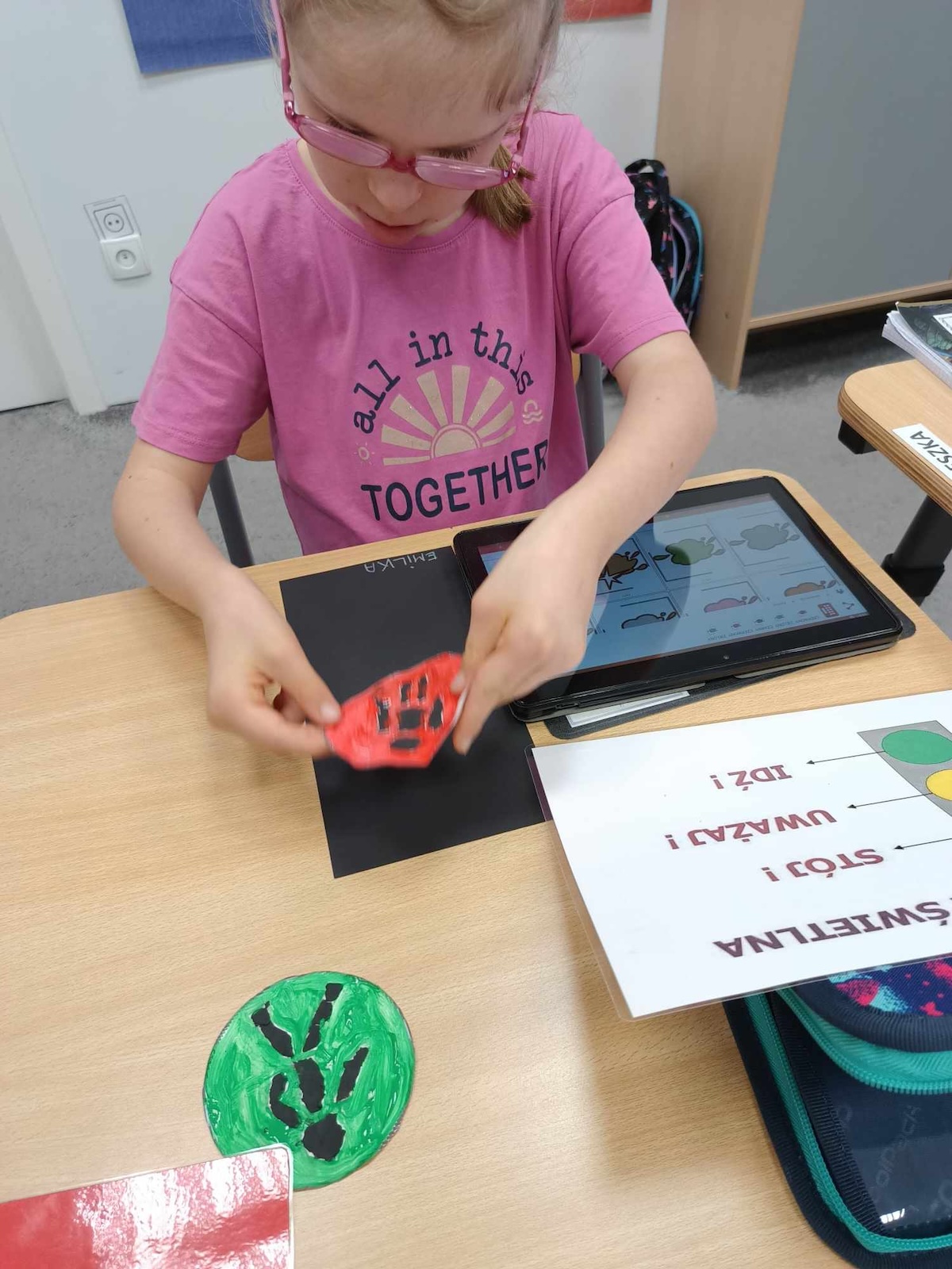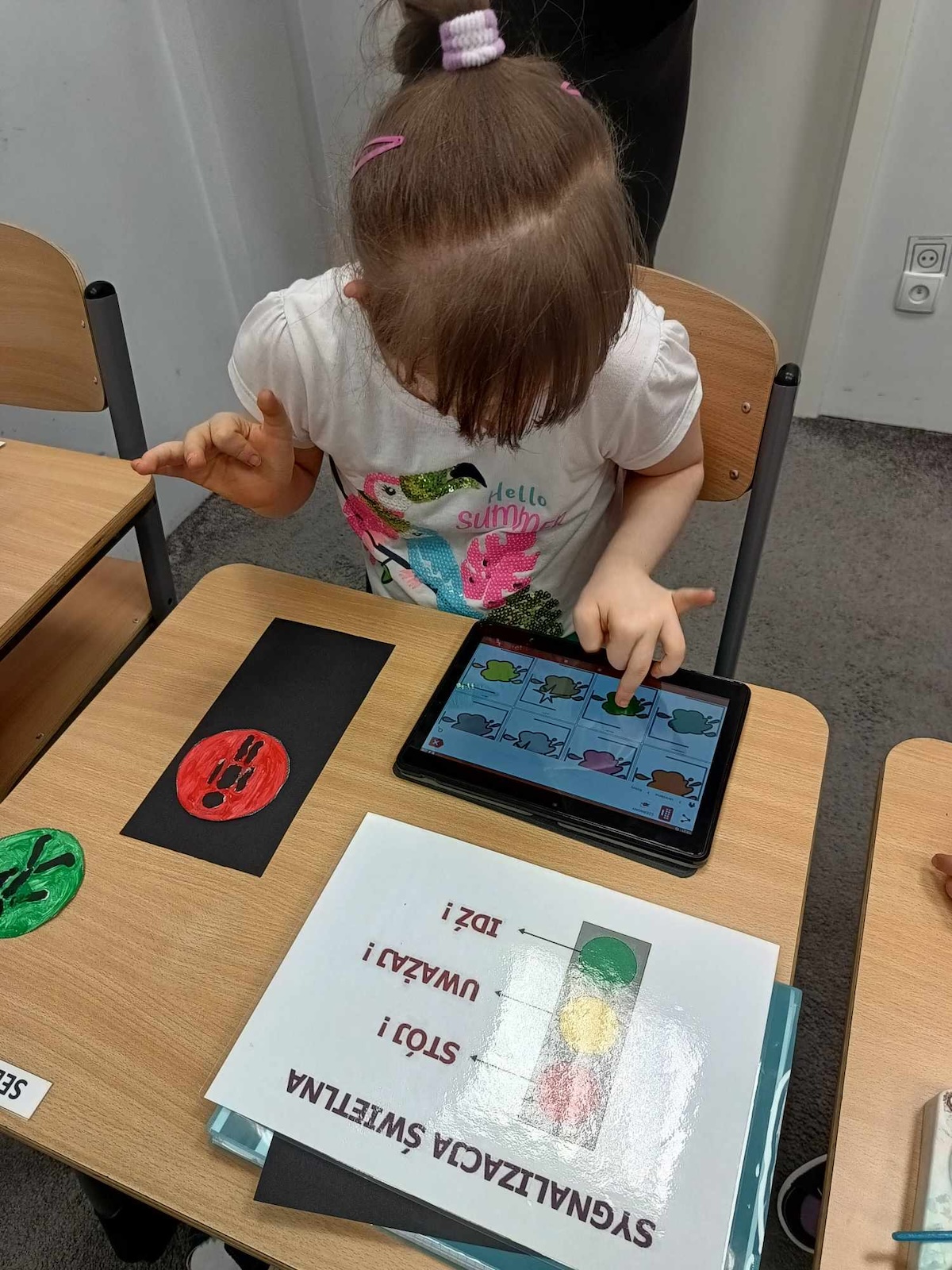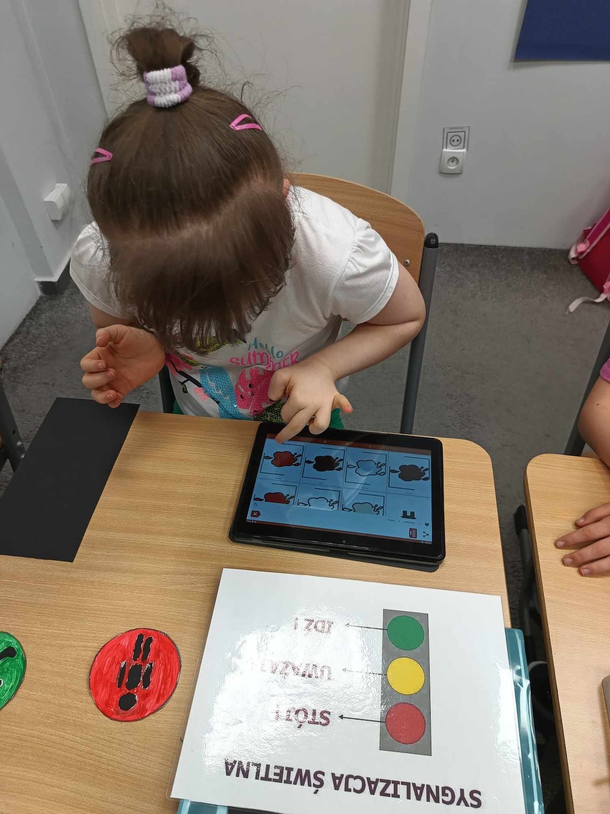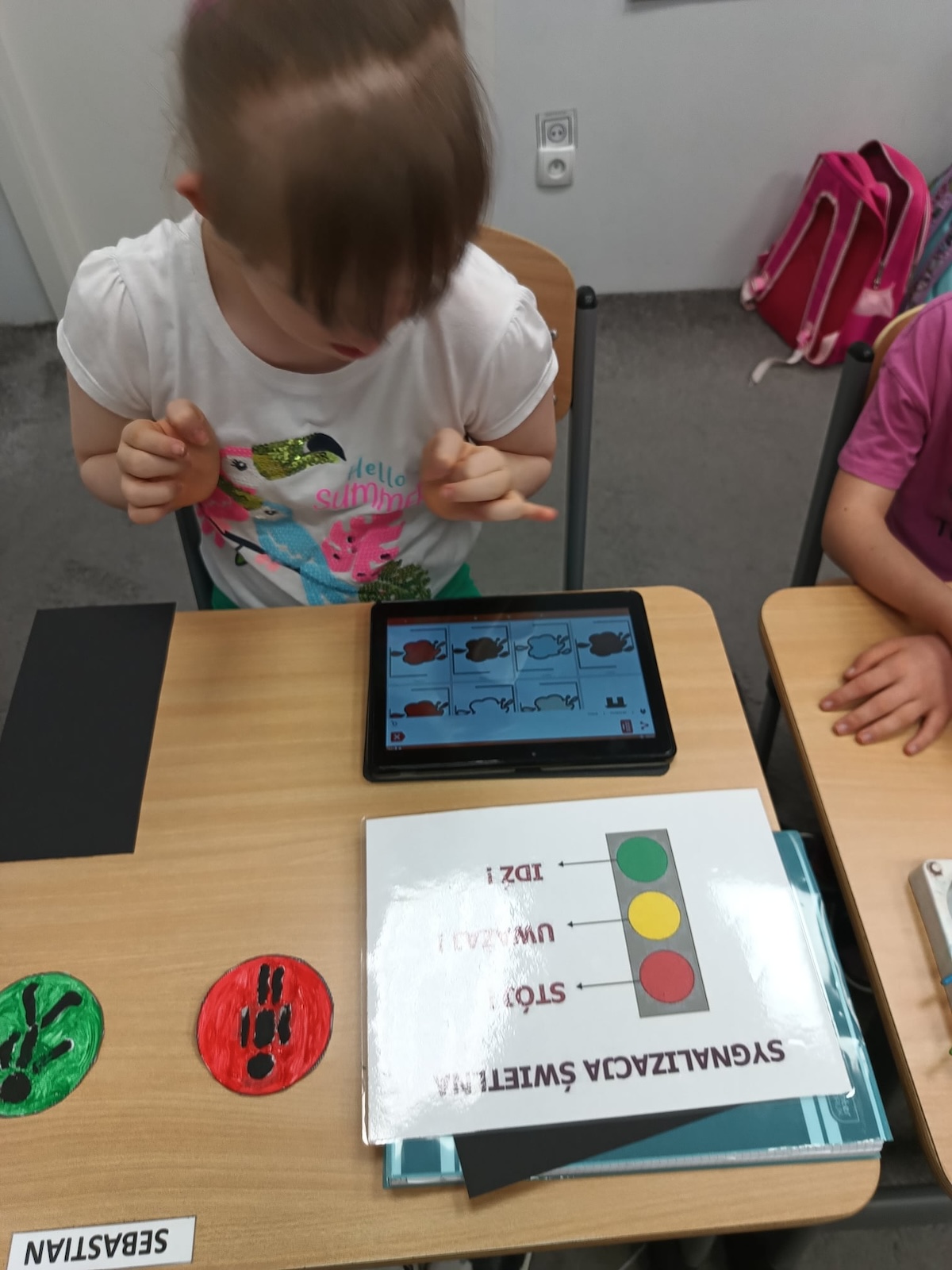 Uczniowie oddziału „I” omawiając temat tygodnia „Bezpieczna droga do szkoły” wykonali prace plastyczną „Sygnalizator świetlny”. Ćwicząc przy tym swoją sprawność manualną, utrwalali kolory: czerwony, zielony i czarny oraz kształt koła.