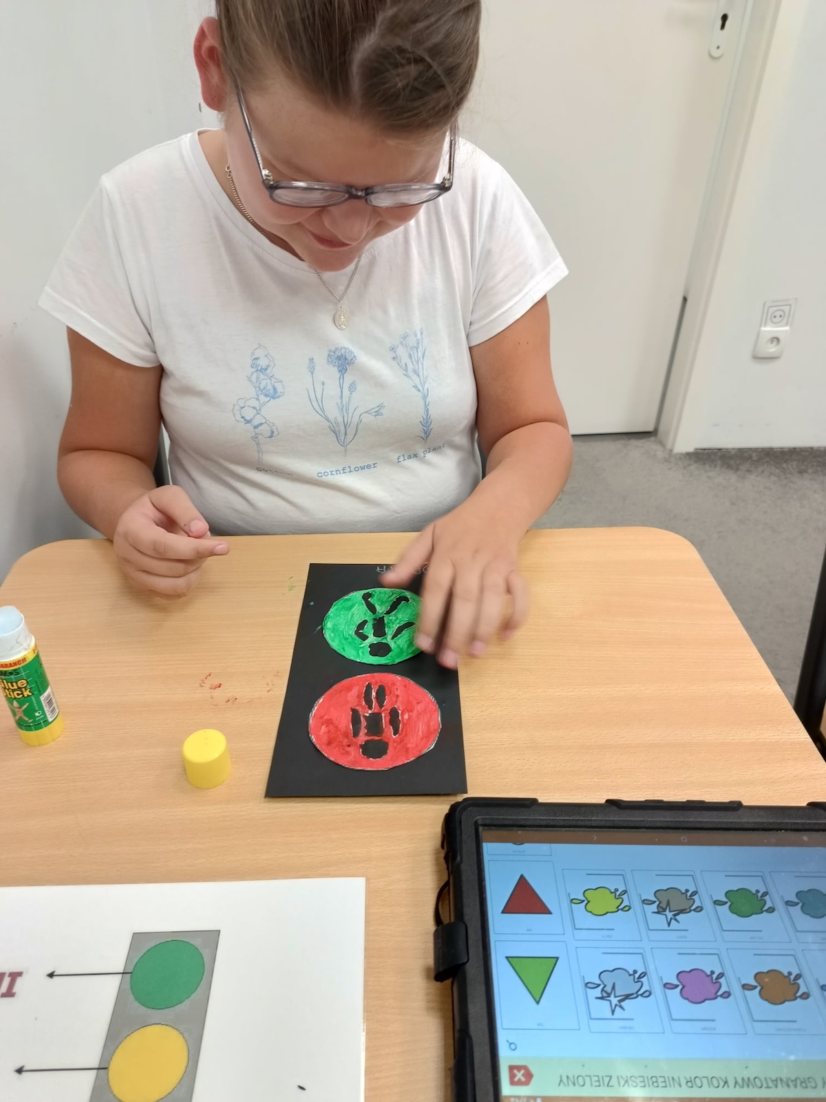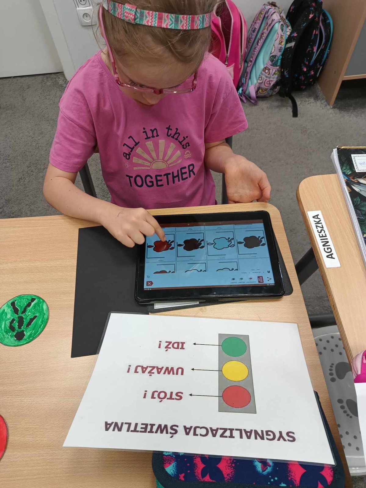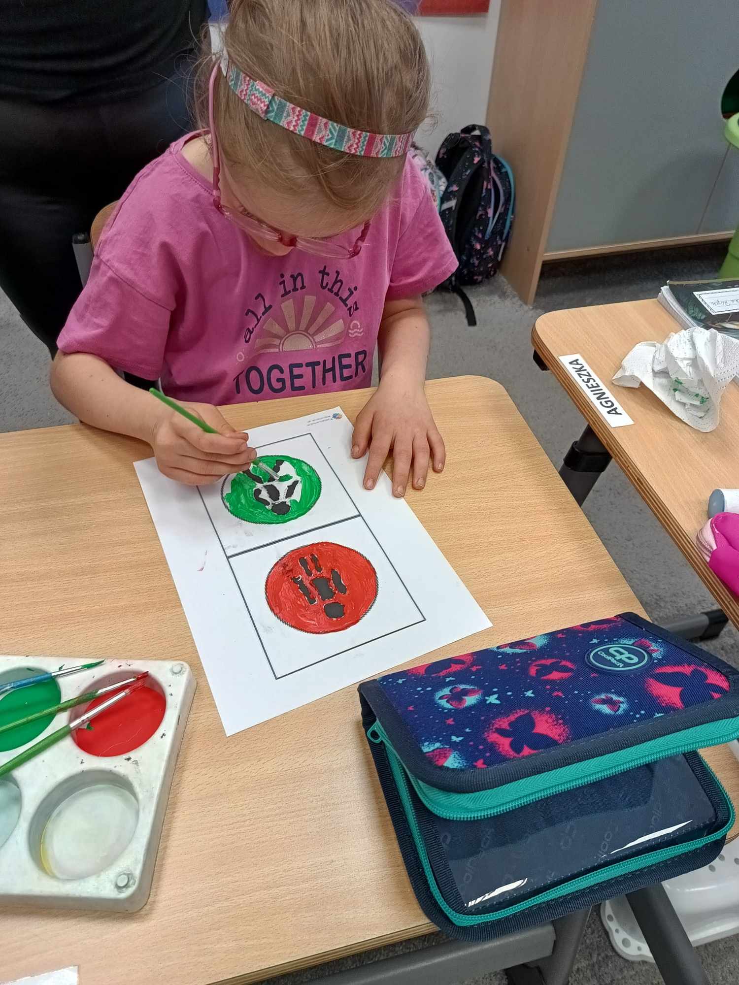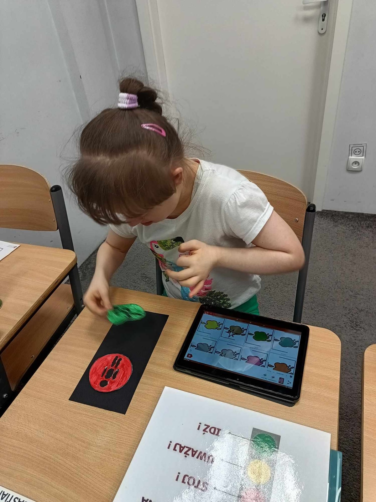 Uczniowie oddziału „I” omawiając temat tygodnia „Bezpieczna droga do szkoły” wykonali prace plastyczną „Sygnalizator świetlny”. Ćwicząc przy tym swoją sprawność manualną, utrwalali kolory: czerwony, zielony i czarny oraz kształt koła.