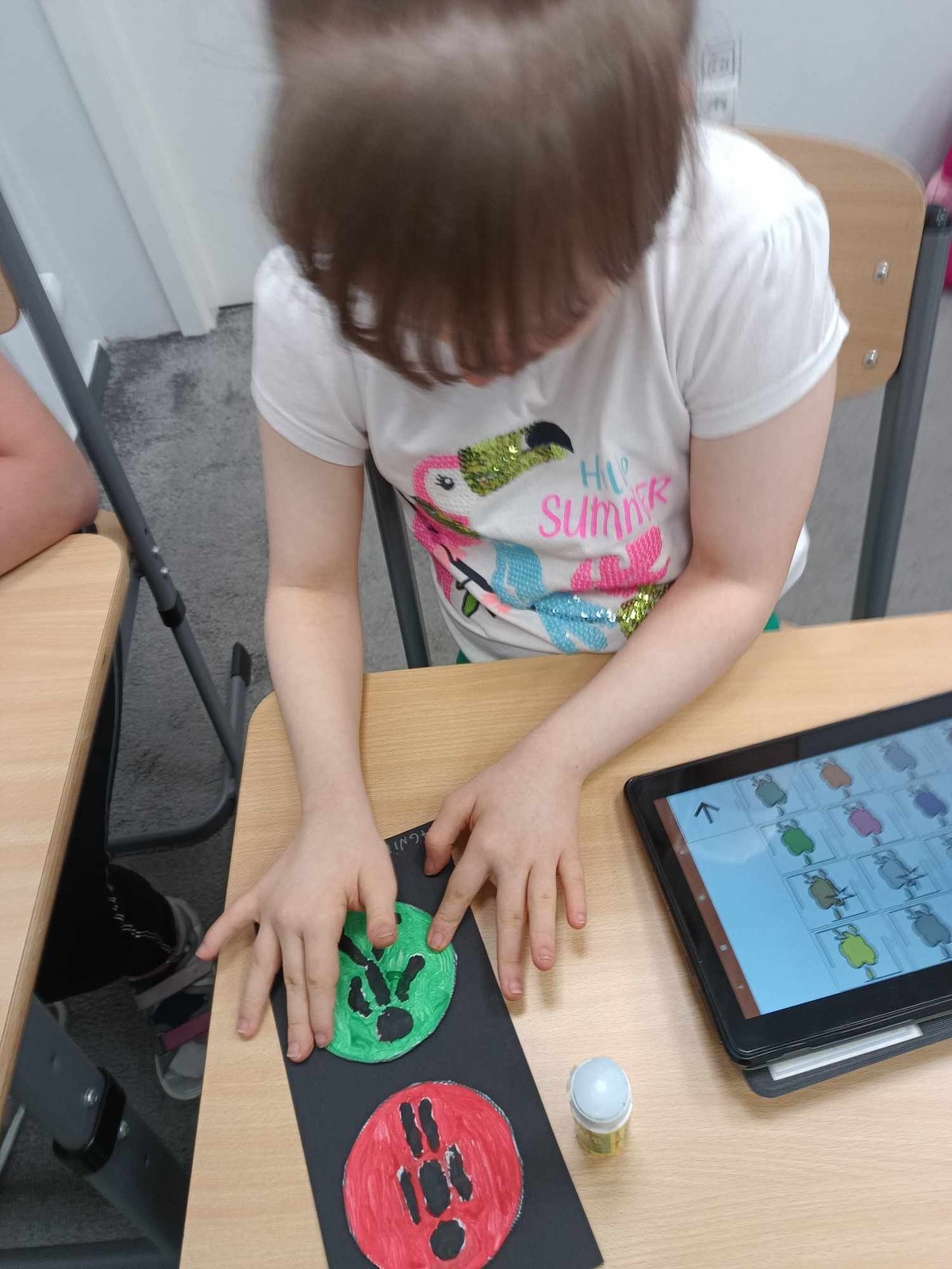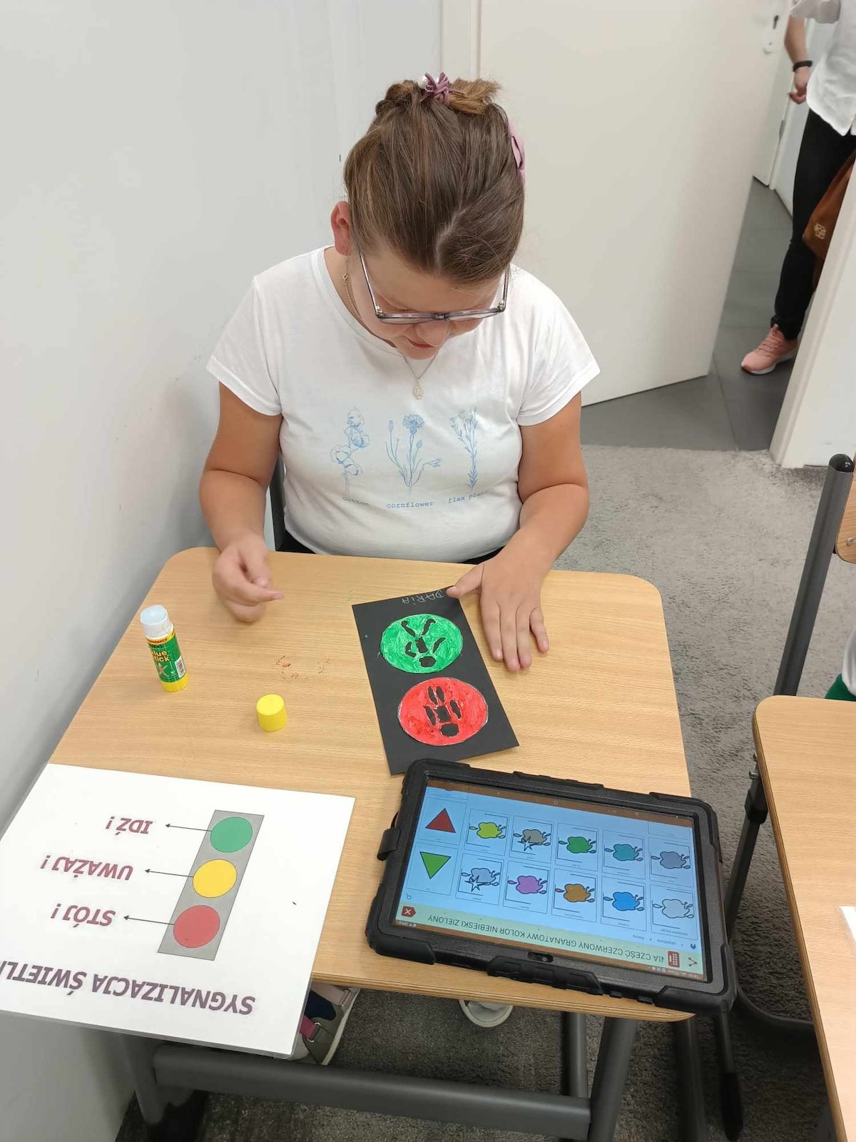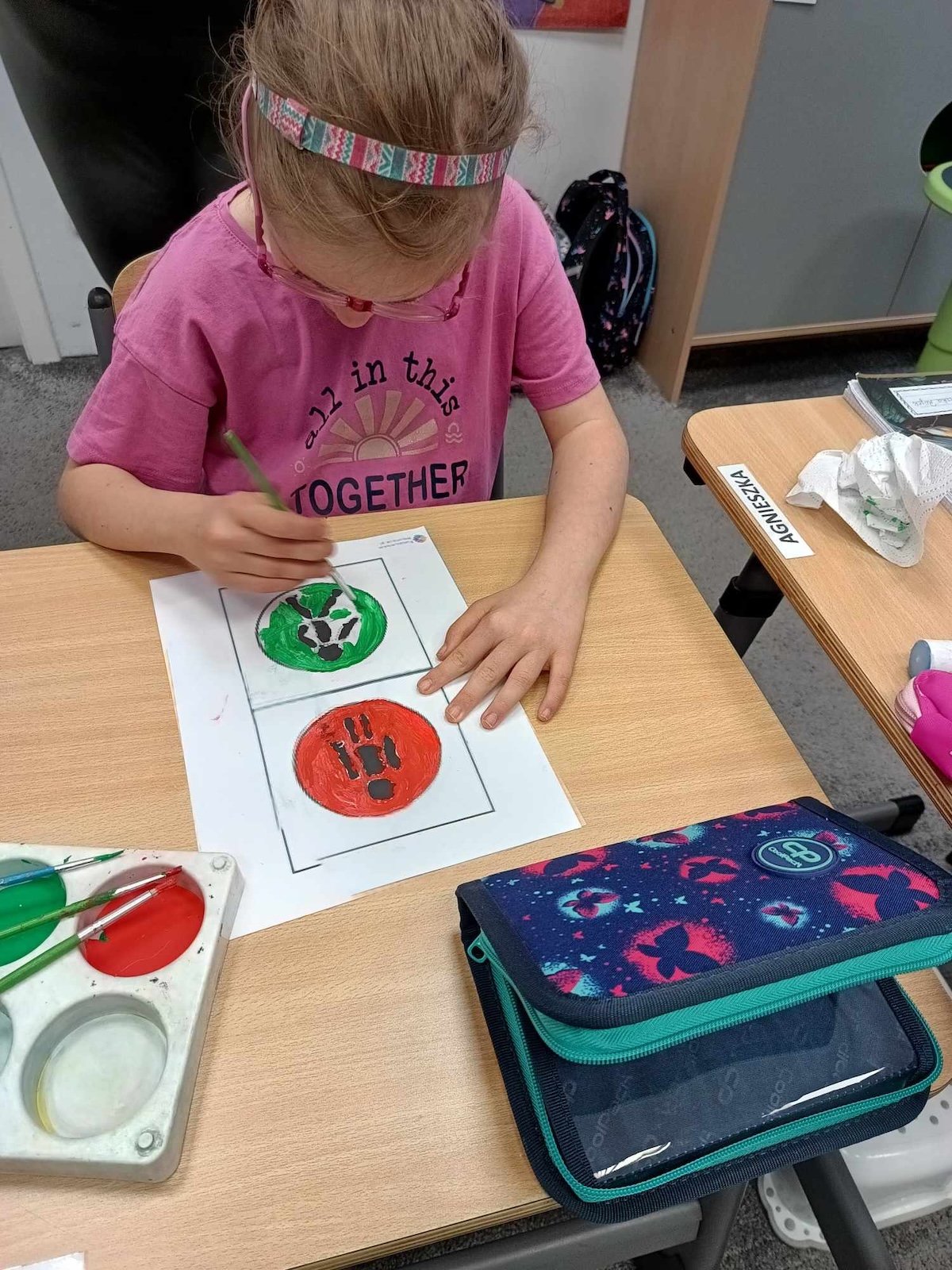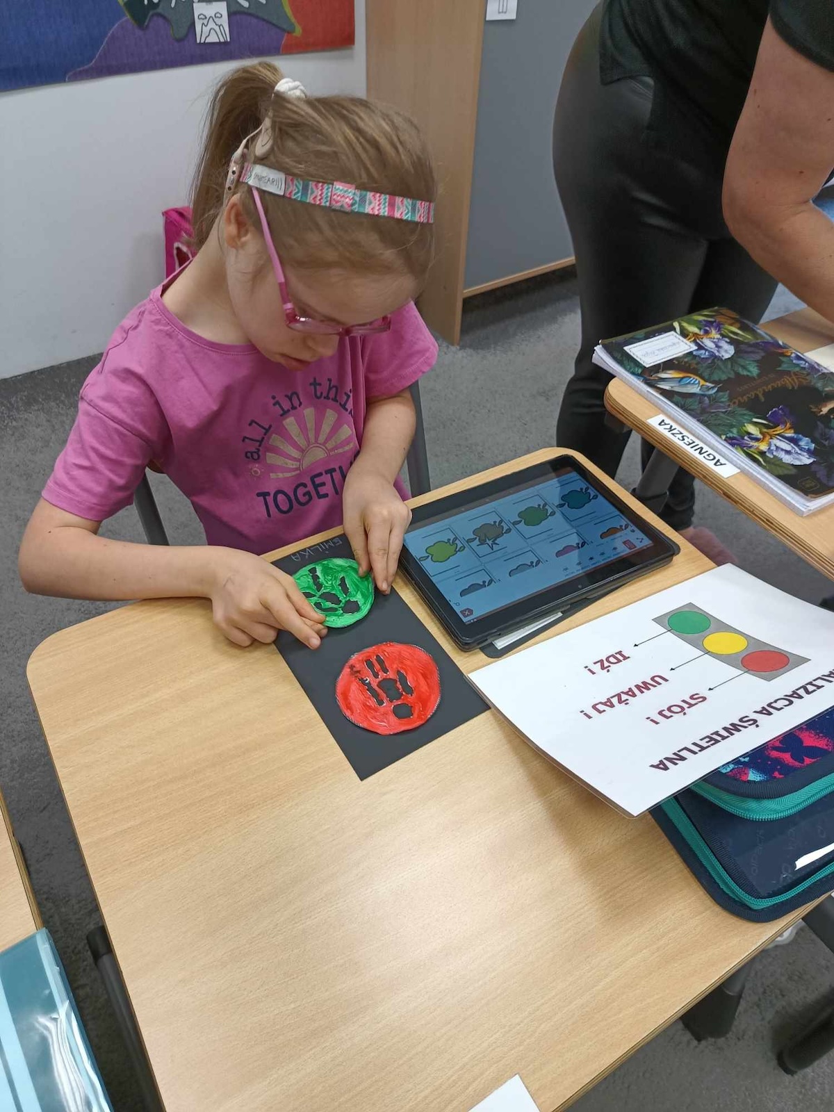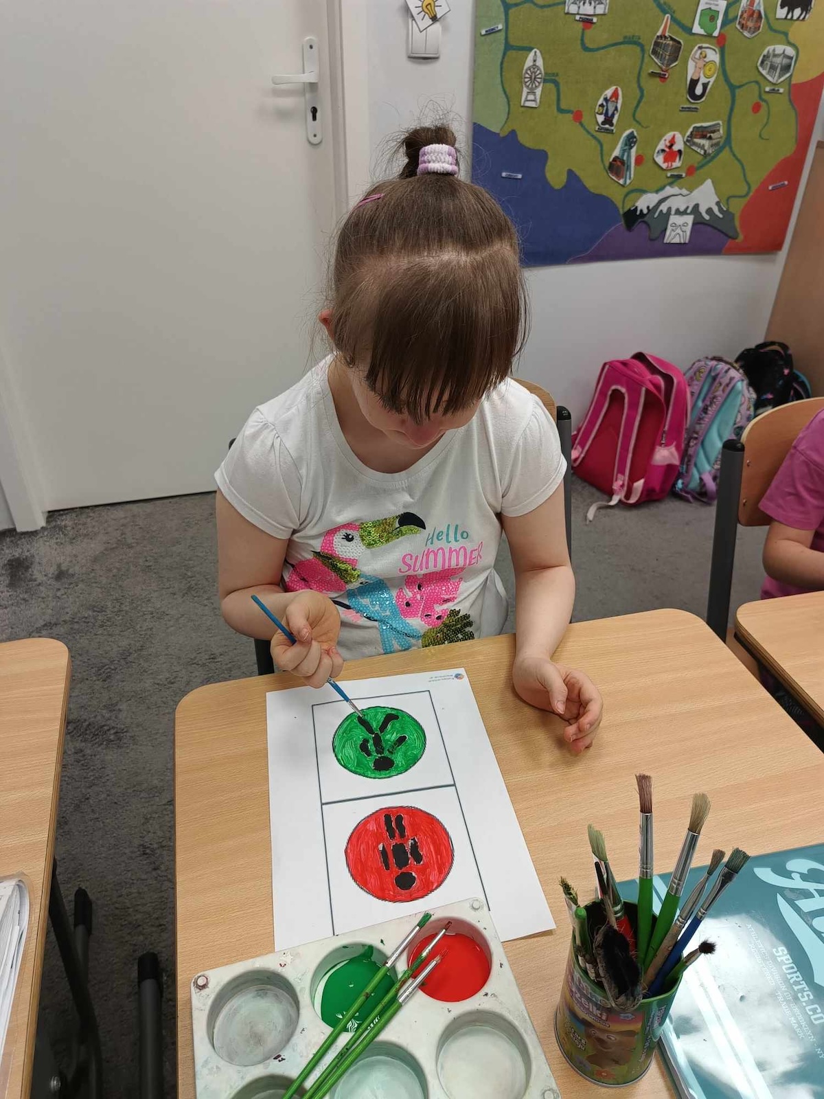 Uczniowie oddziału „I” omawiając temat tygodnia „Bezpieczna droga do szkoły” wykonali prace plastyczną „Sygnalizator świetlny”. Ćwicząc przy tym swoją sprawność manualną, utrwalali kolory: czerwony, zielony i czarny oraz kształt koła.