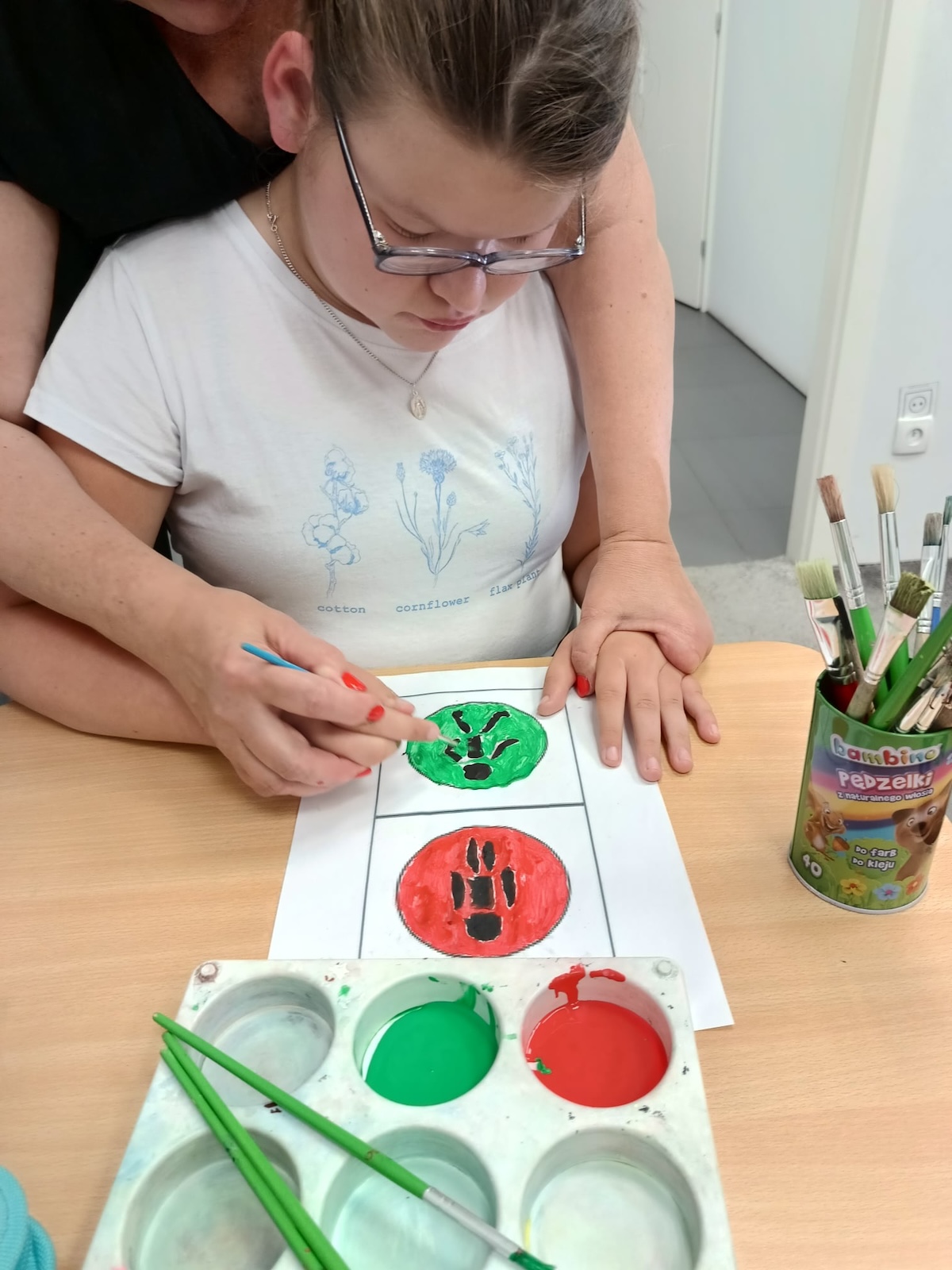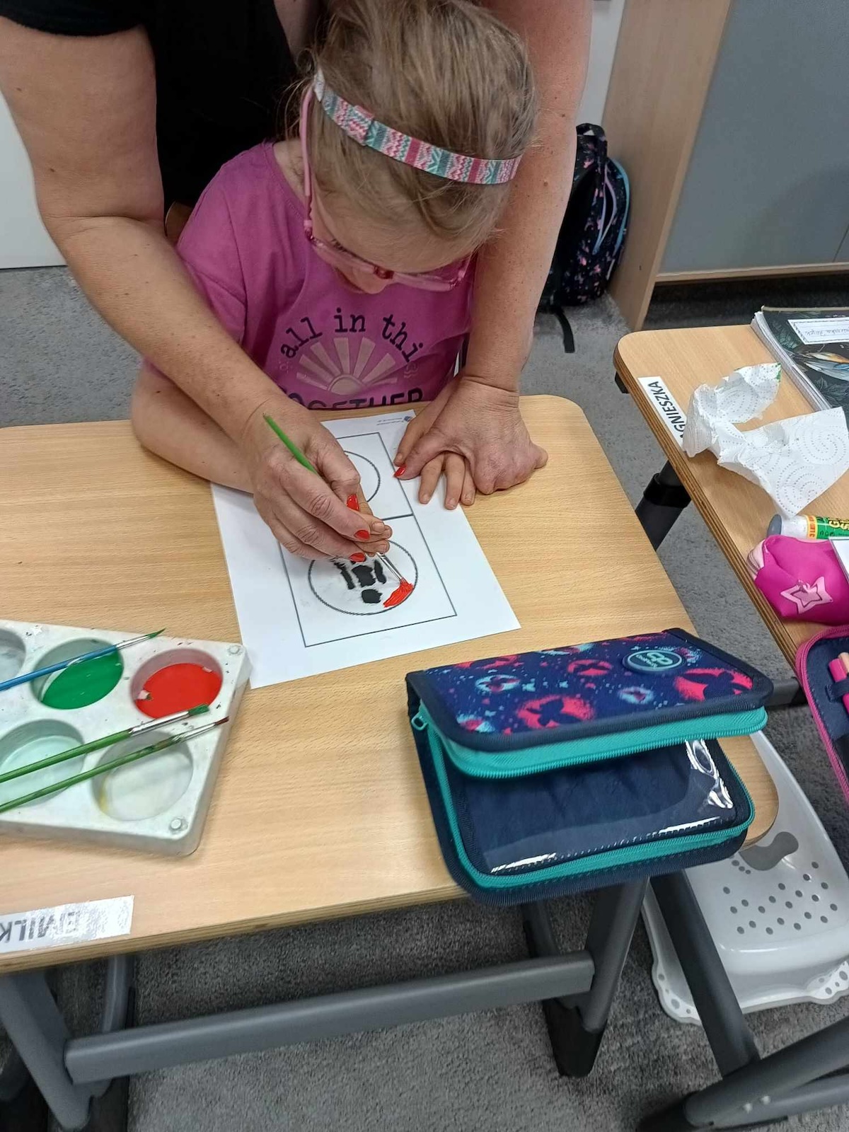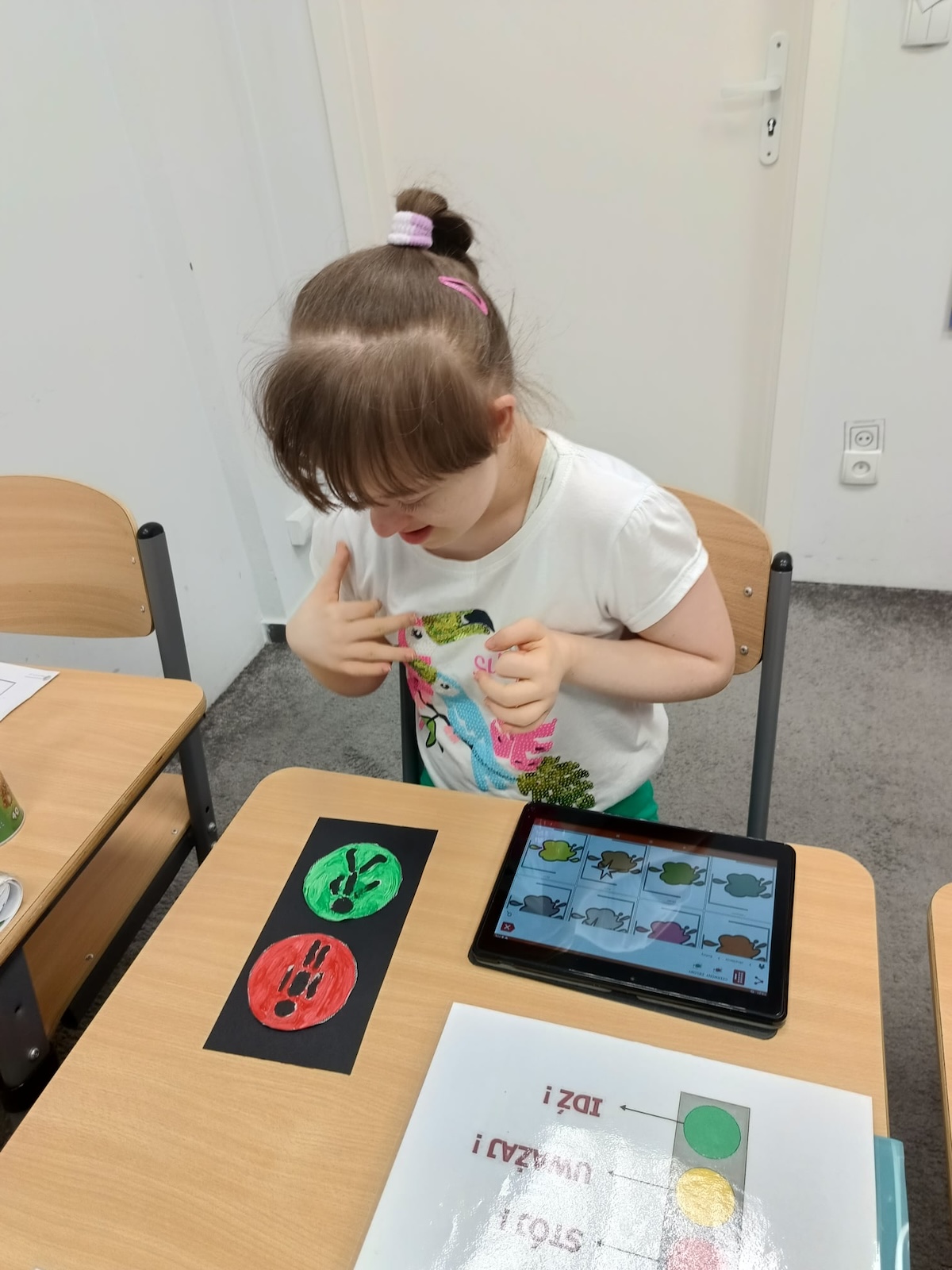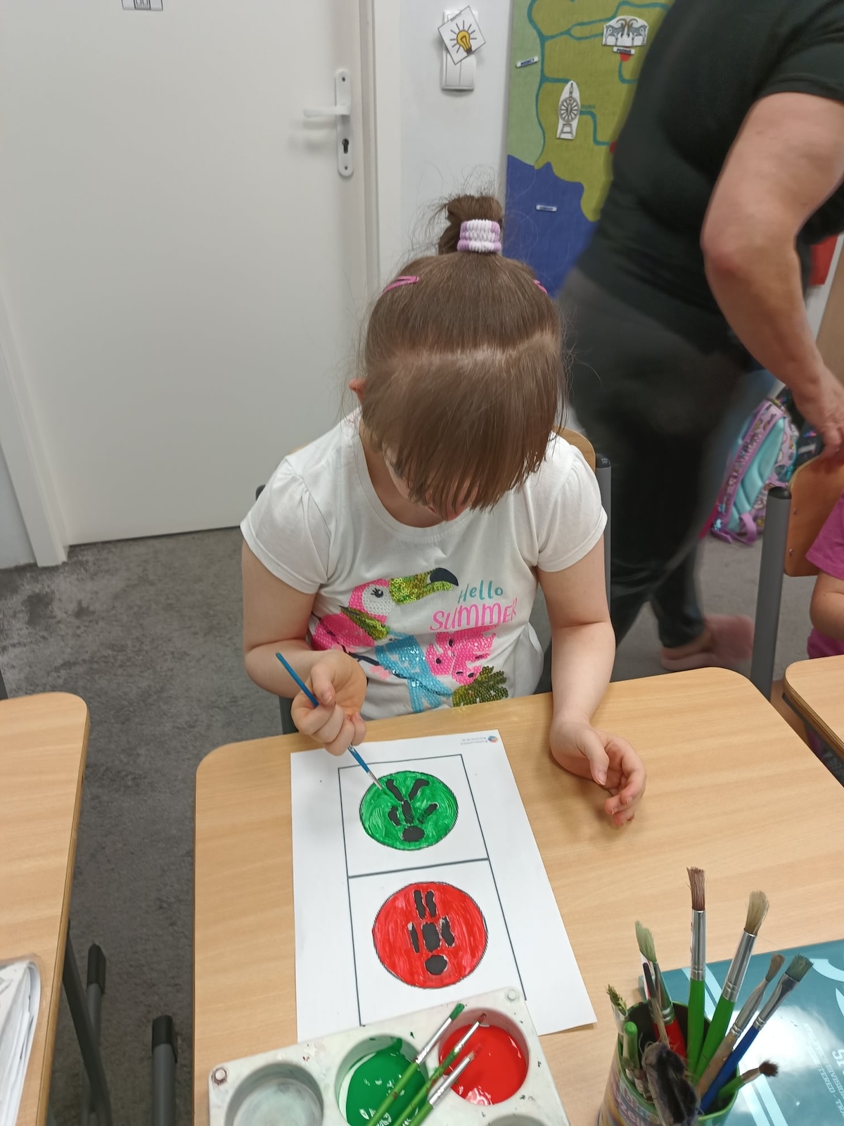 Uczniowie oddziału „I” omawiając temat tygodnia „Bezpieczna droga do szkoły” wykonali prace plastyczną „Sygnalizator świetlny”. Ćwicząc przy tym swoją sprawność manualną, utrwalali kolory: czerwony, zielony i czarny oraz kształt koła.