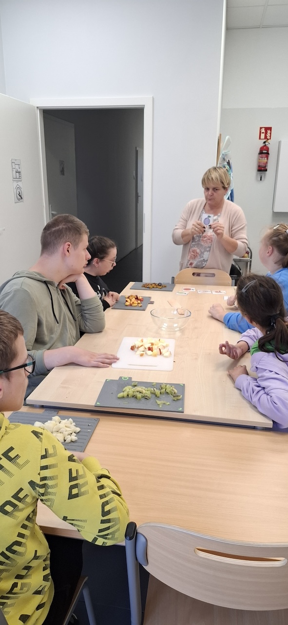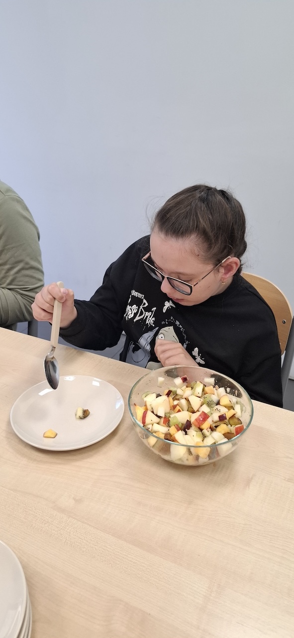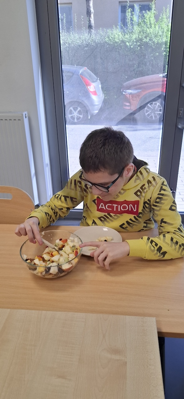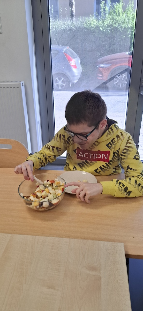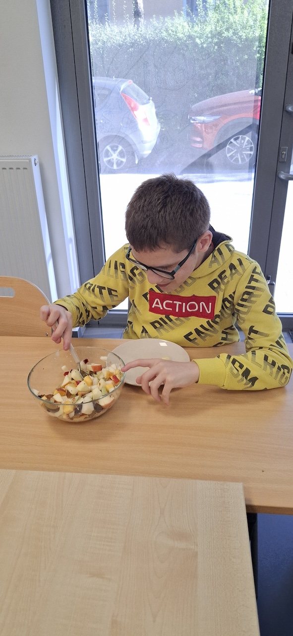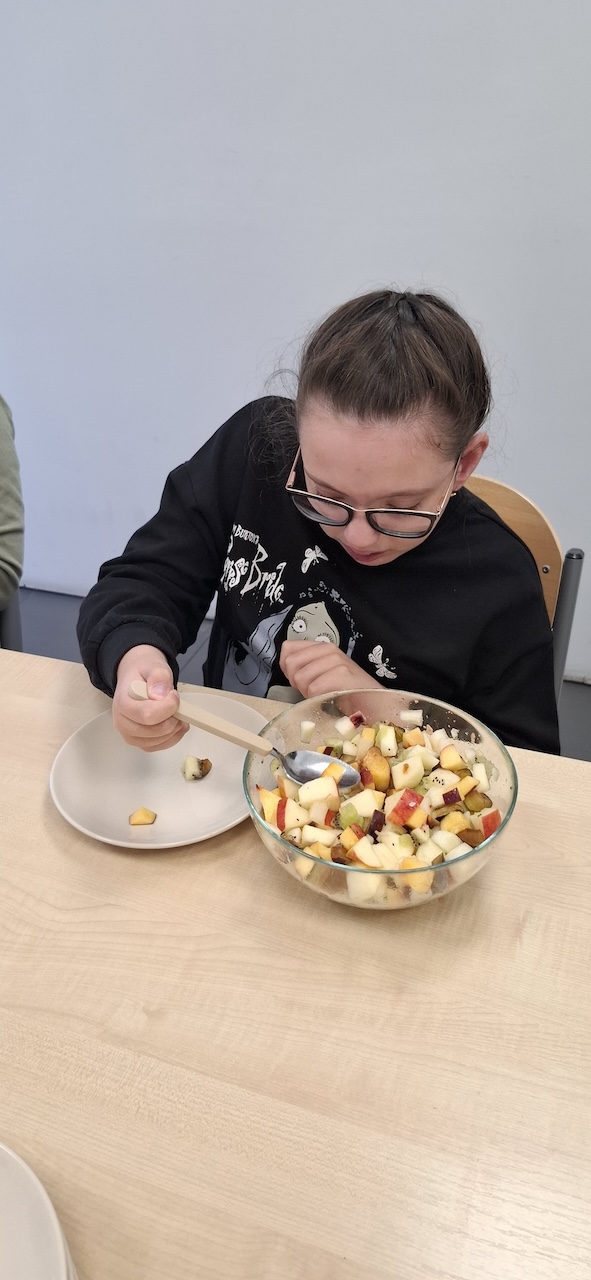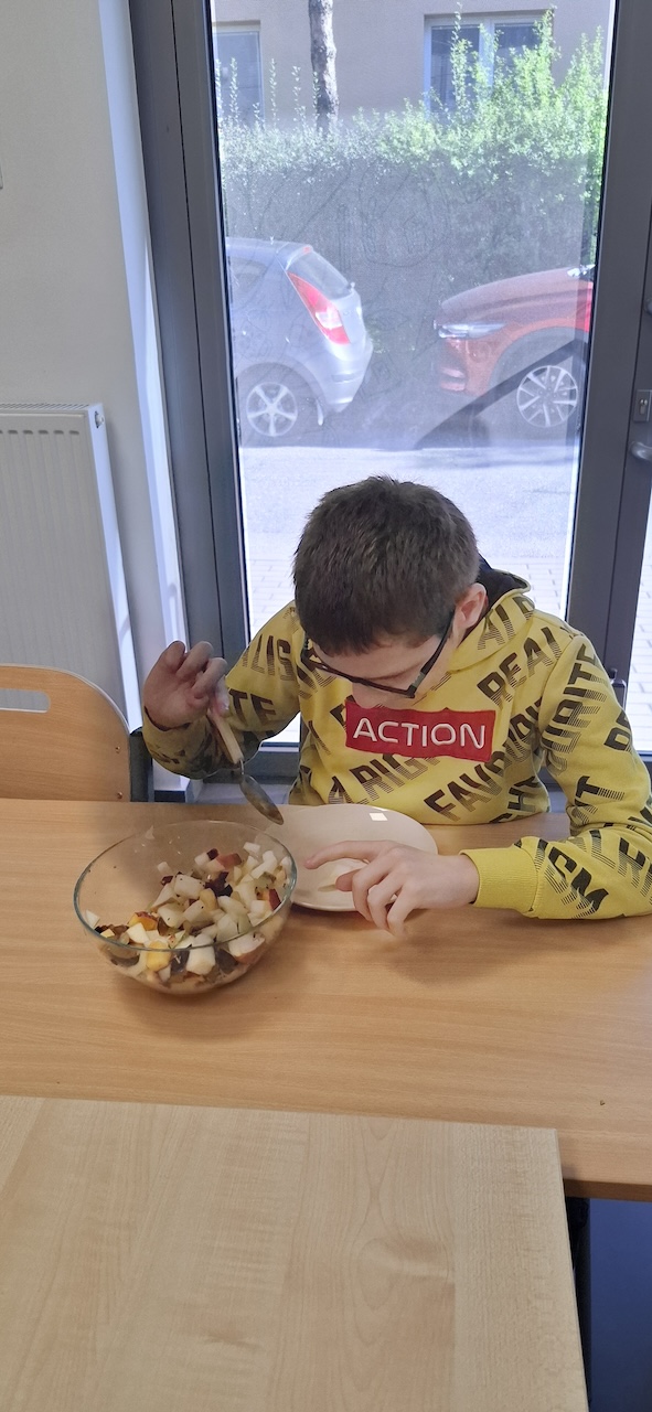 W tygodniu omawiając owoce i warzywa jesienne w naszej szkole uczniowie oddziału „II” przygotowali sałatkę owocową. Na początku Pani omówiła sposób wykonania sałatki , zwróciła uwagę na higienę pracy i przystąpiliśmy do działania. Owoce zostały umyte i obrane, następnie uczniowie kroili je w kostkę i przesypywali do dużej miski. Własnoręcznie zrobiona sałatka bardzo wszystkim smakowała , zajęcia dostarczyły wrażeń smakowych i dotykowych.