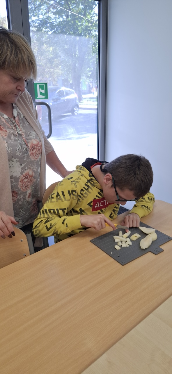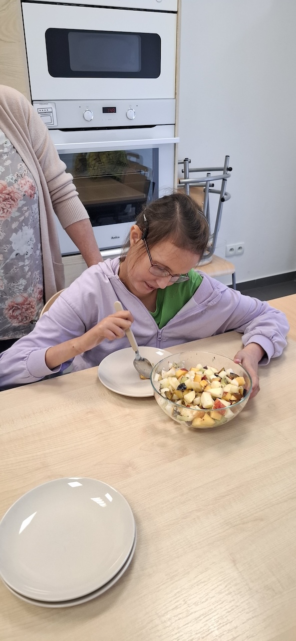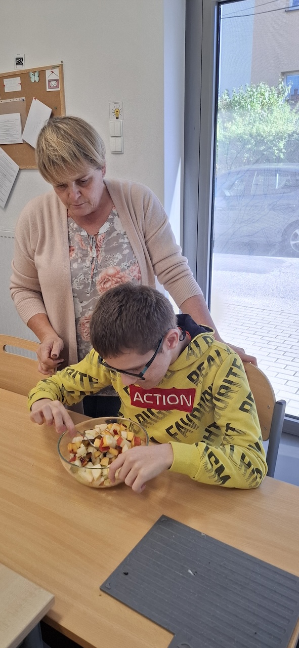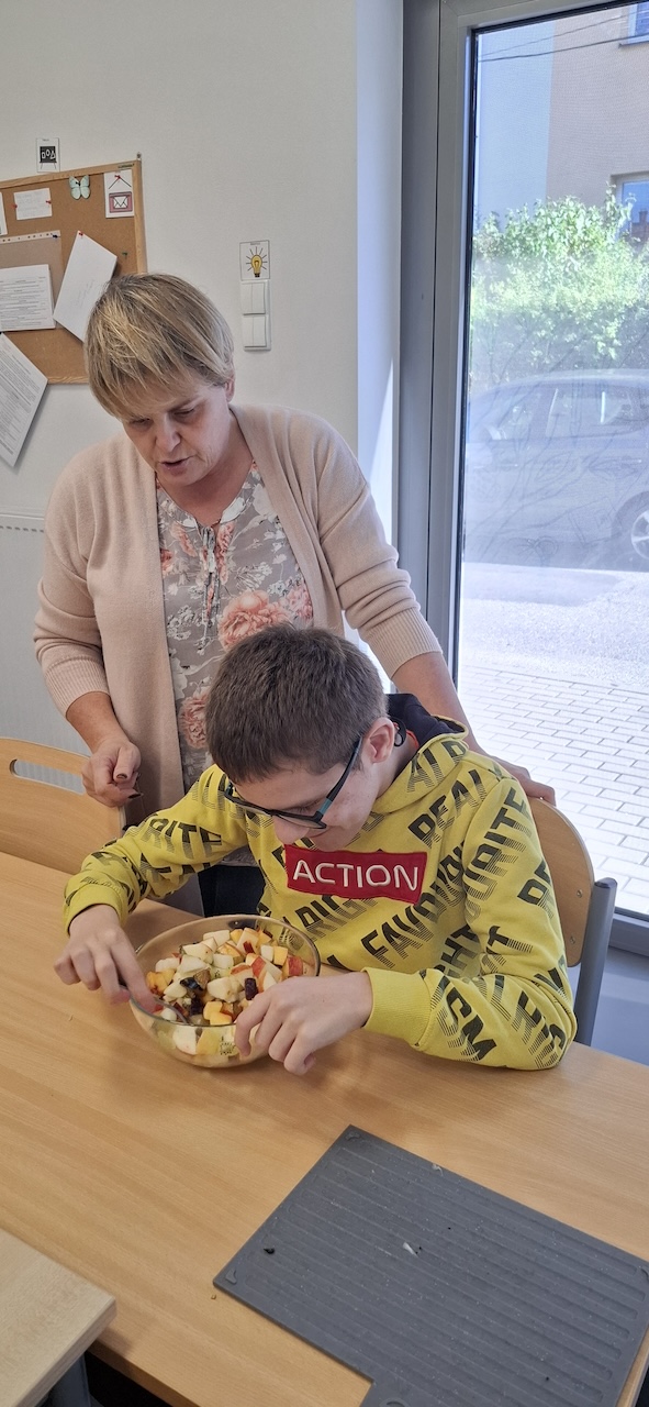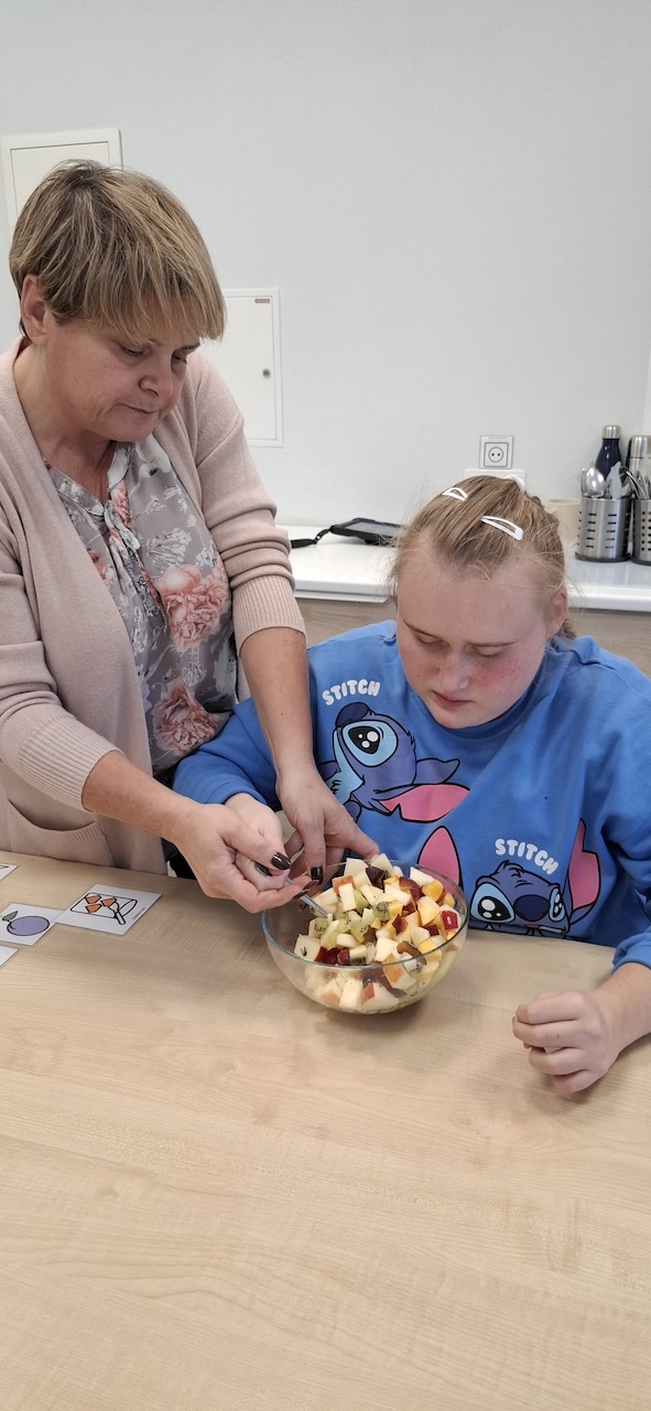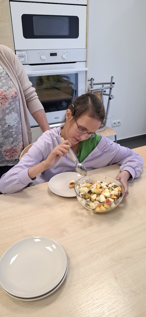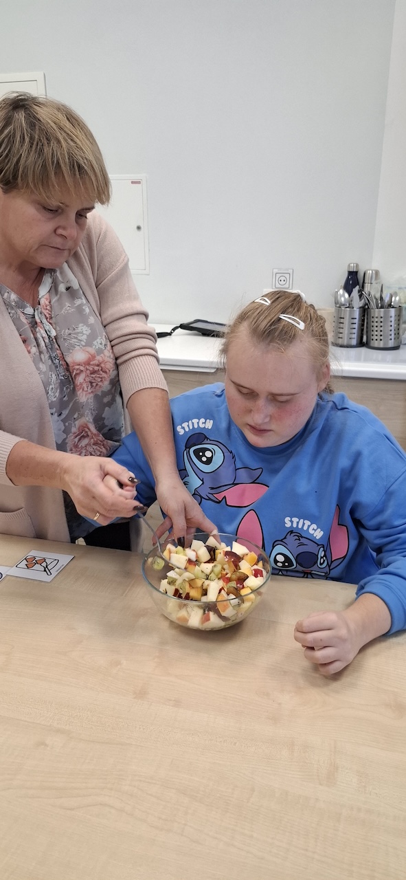 W tygodniu omawiając owoce i warzywa jesienne w naszej szkole uczniowie oddziału „II” przygotowali sałatkę owocową. Na początku Pani omówiła sposób wykonania sałatki , zwróciła uwagę na higienę pracy i przystąpiliśmy do działania. Owoce zostały umyte i obrane, następnie uczniowie kroili je w kostkę i przesypywali do dużej miski. Własnoręcznie zrobiona sałatka bardzo wszystkim smakowała , zajęcia dostarczyły wrażeń smakowych i dotykowych.