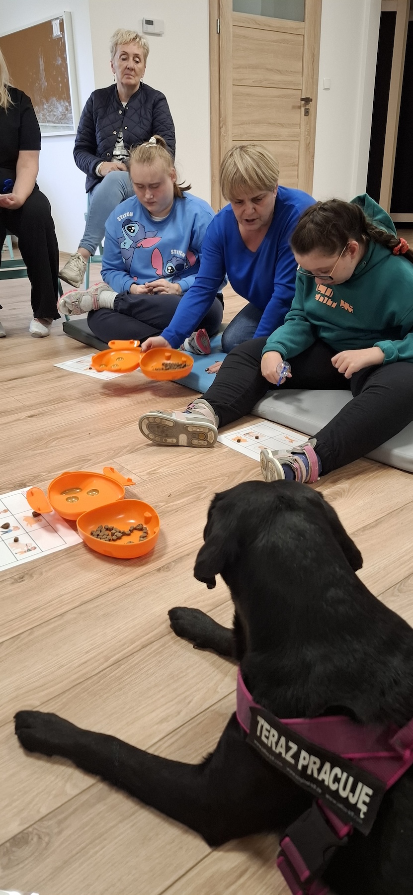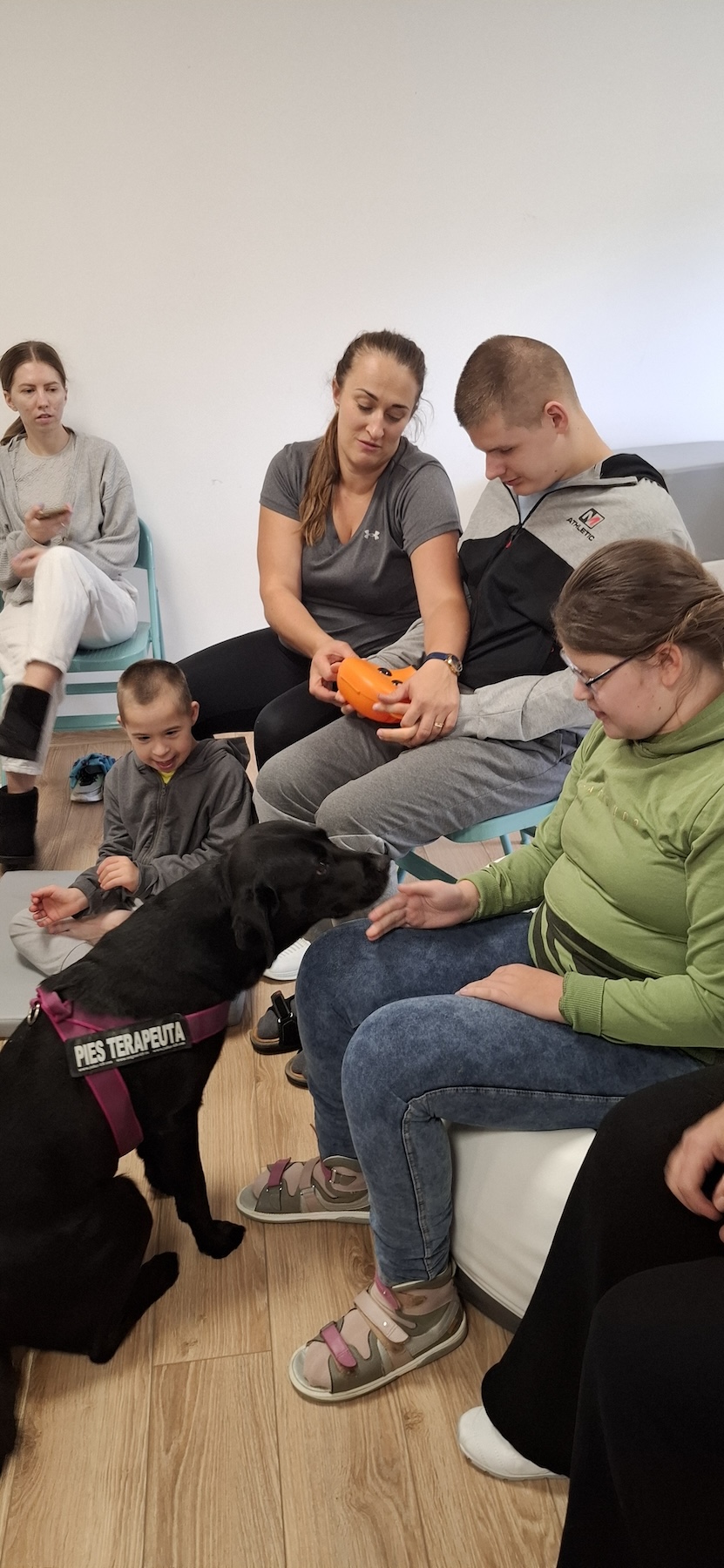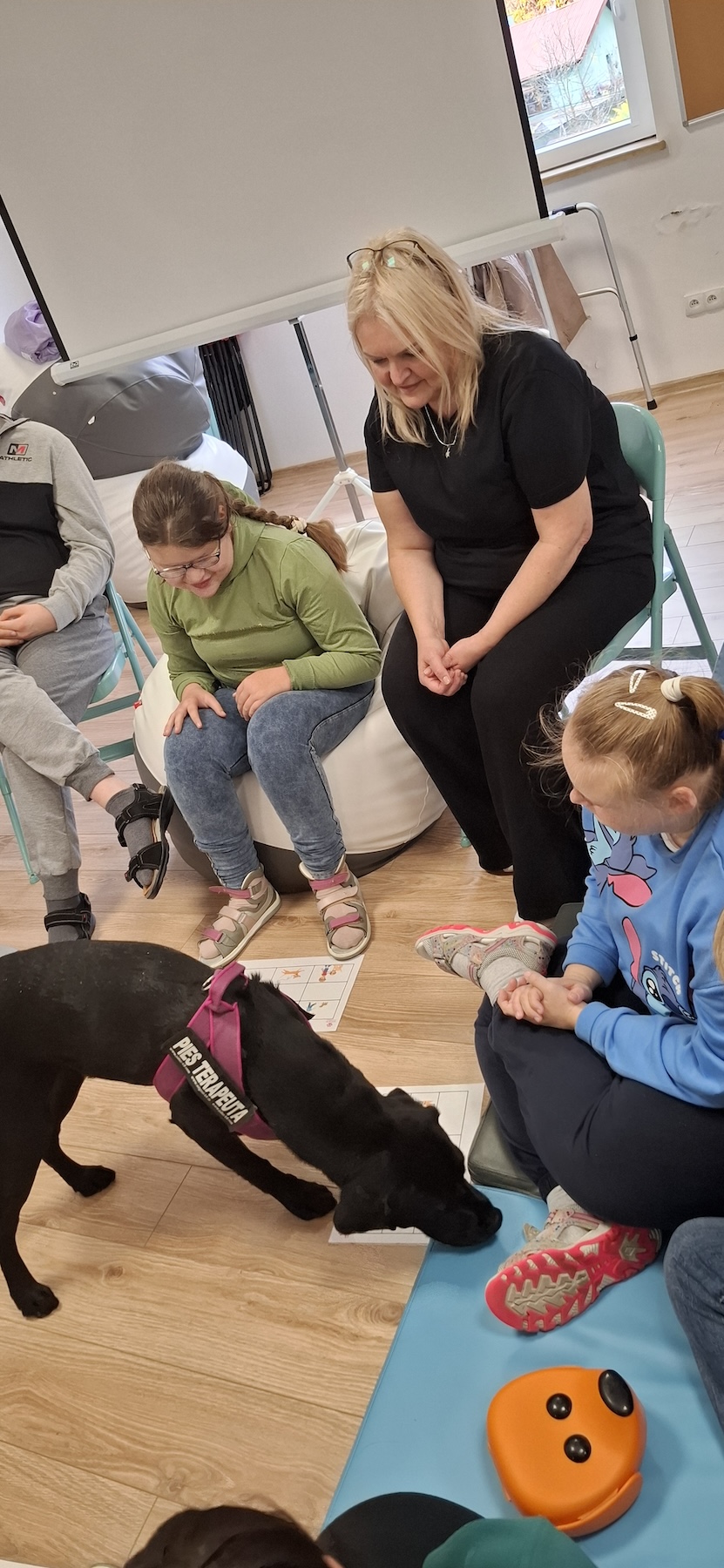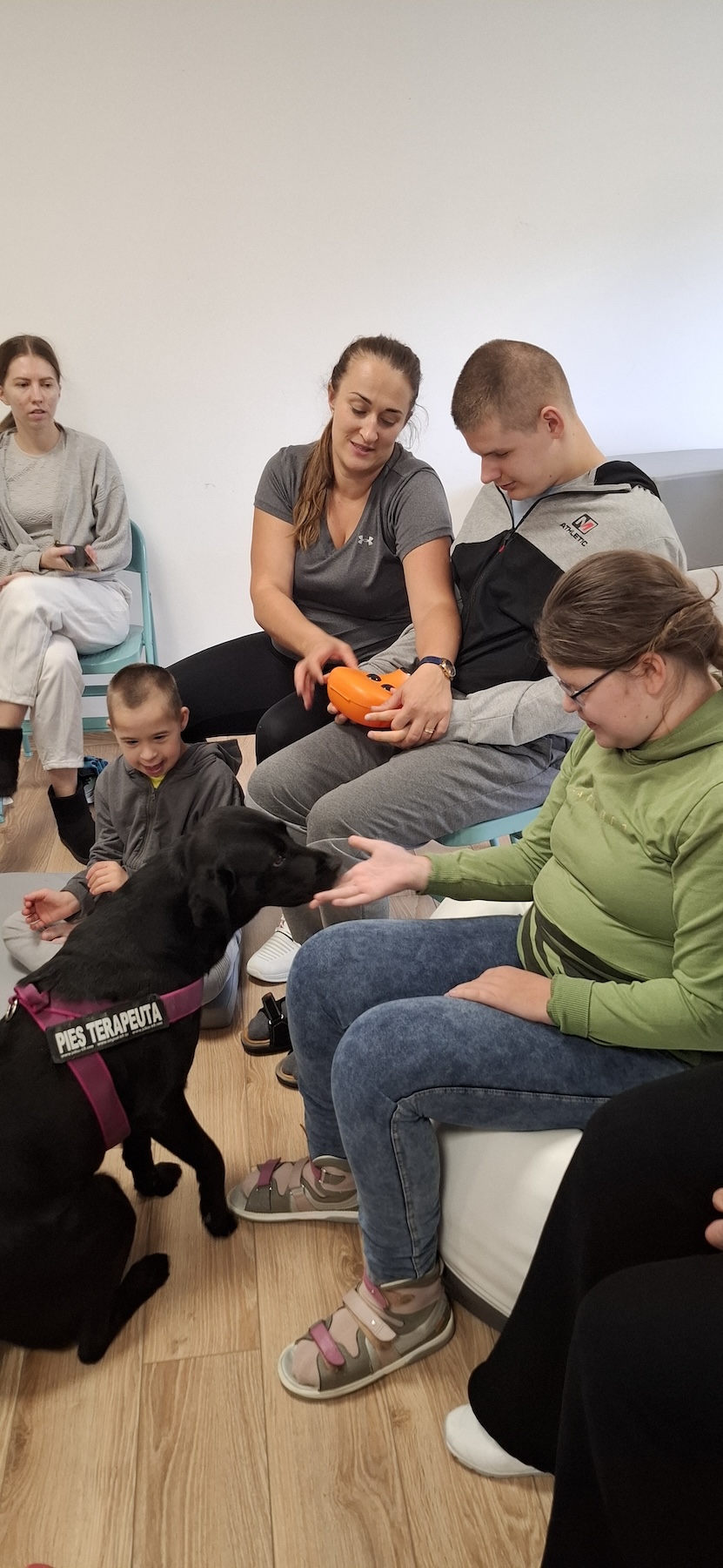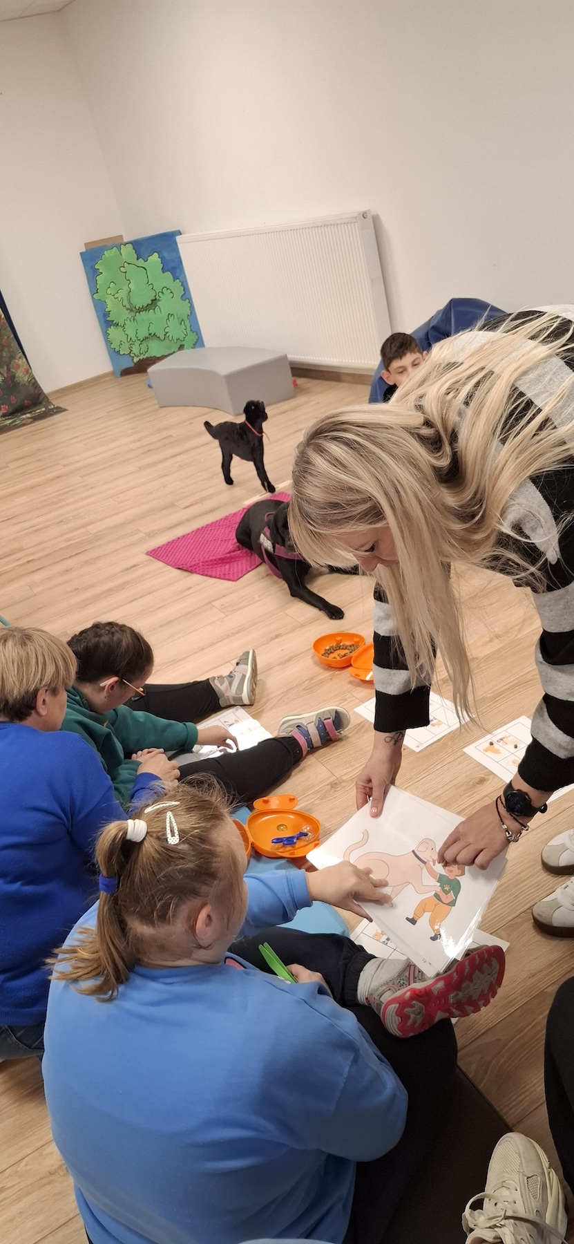 Podczas kolejnych zajęć dogoterapii Pani Kamila przygotowała wiersz Jana Brzechwy „ Jak rozmawiać trzeba z psem „. Po omówieniu treści wiersza przeszliśmy do praktycznych ćwiczeń z psem, podczas których ćwiczyliśmy komendy: „Chodź”, „Szukaj”, „Siad”, „Łapa” oraz „Leżeć” . Na zakończenie zajęć uczniowie nagradzali psa smakołykami.