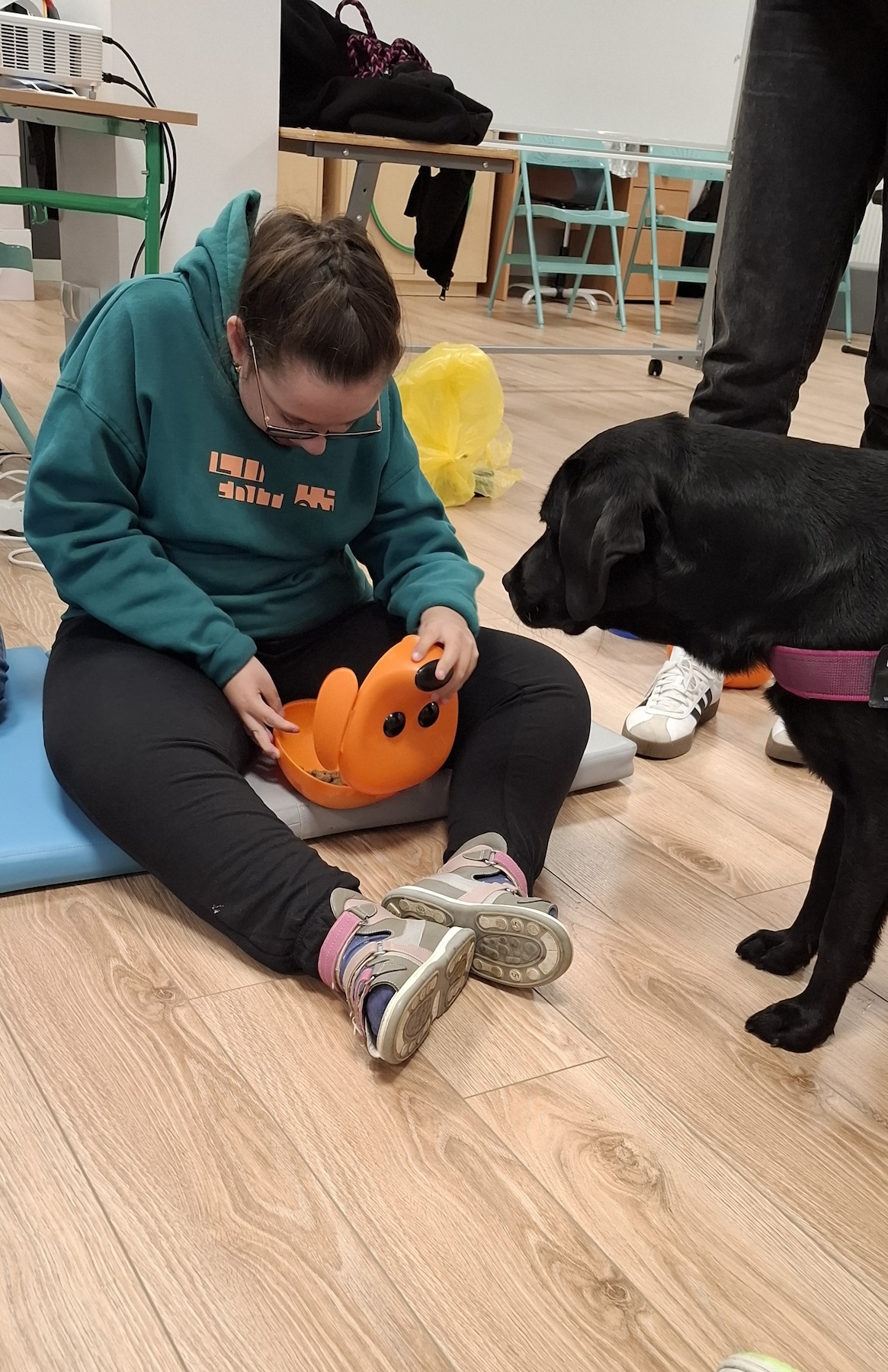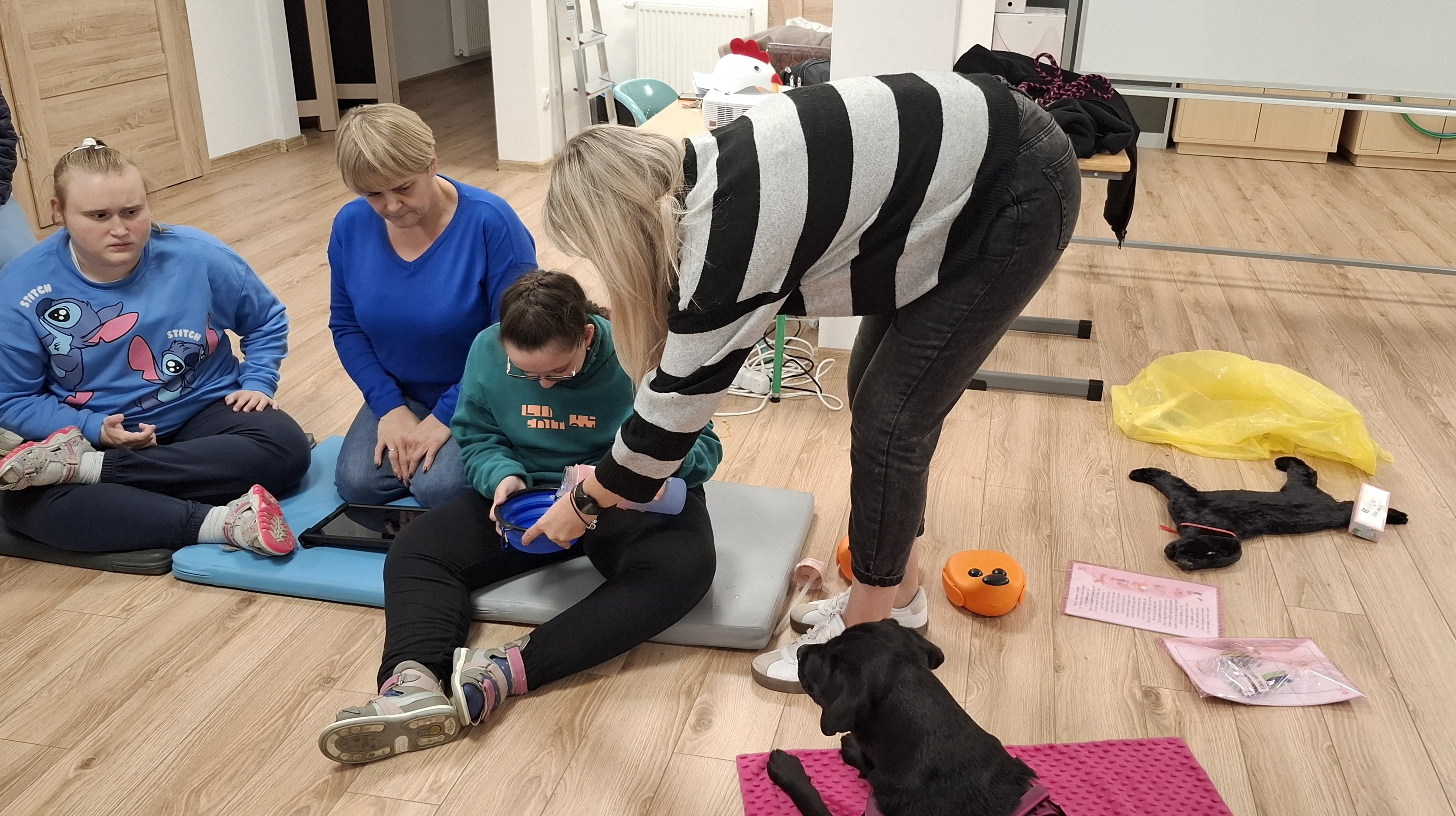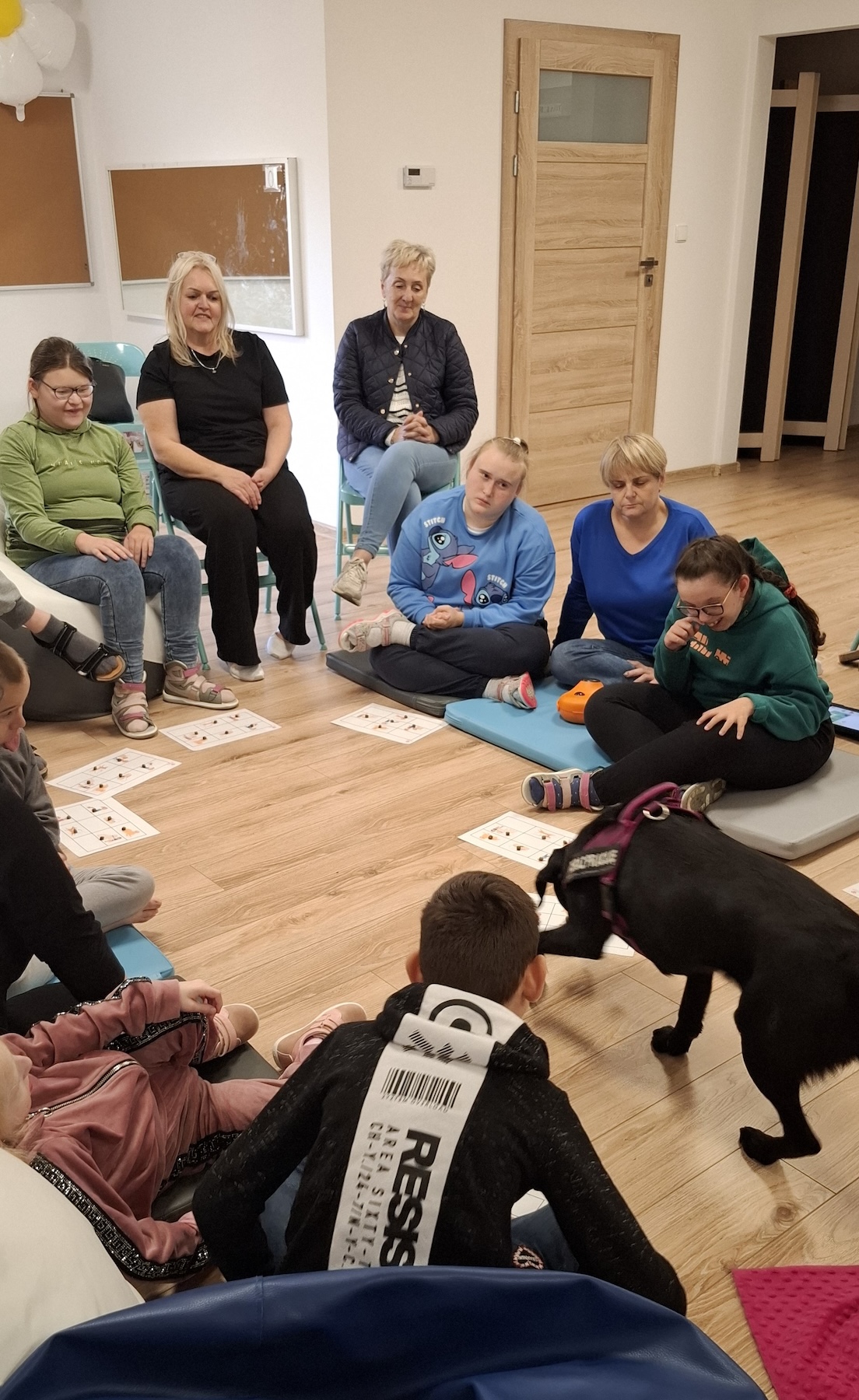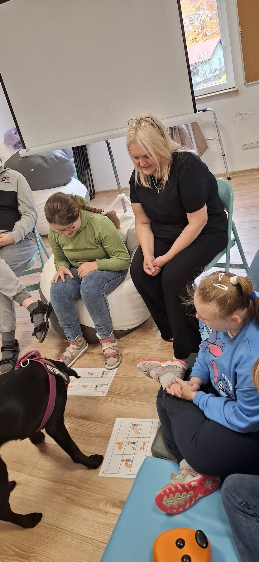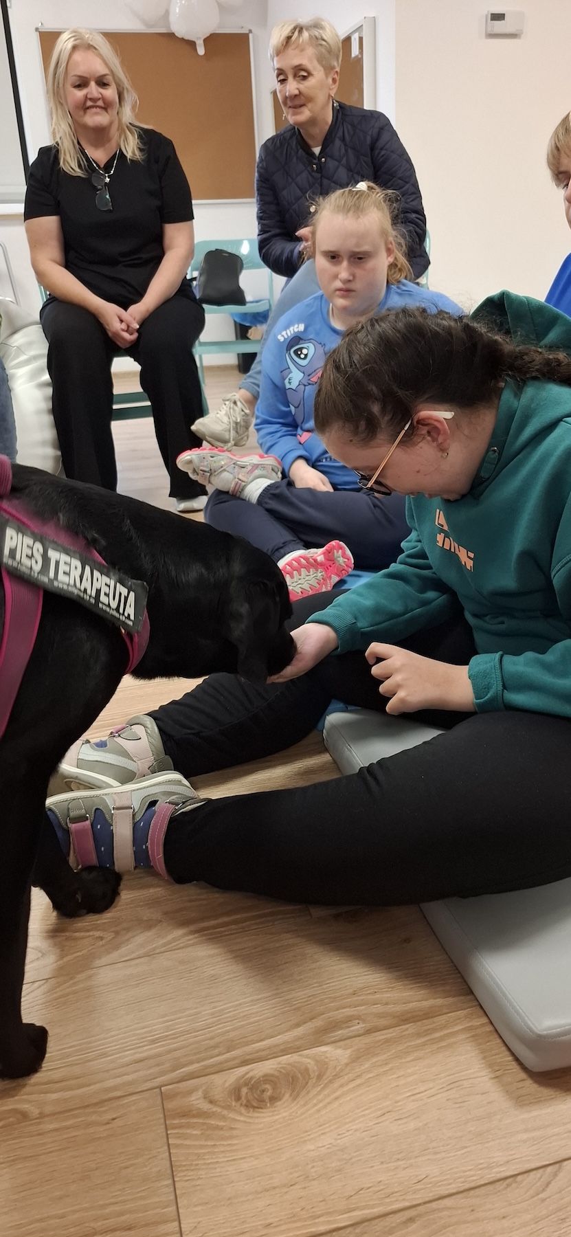 Podczas kolejnych zajęć dogoterapii Pani Kamila przygotowała wiersz Jana Brzechwy „ Jak rozmawiać trzeba z psem „. Po omówieniu treści wiersza przeszliśmy do praktycznych ćwiczeń z psem, podczas których ćwiczyliśmy komendy: „Chodź”, „Szukaj”, „Siad”, „Łapa” oraz „Leżeć” . Na zakończenie zajęć uczniowie nagradzali psa smakołykami.