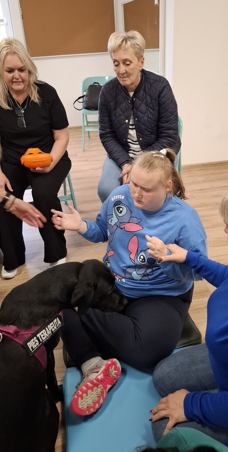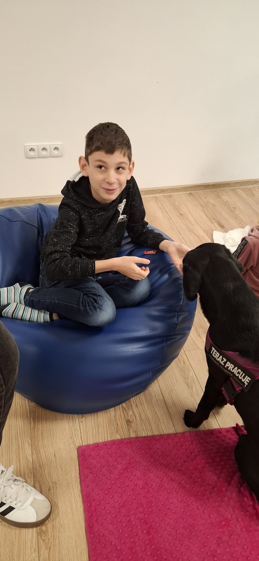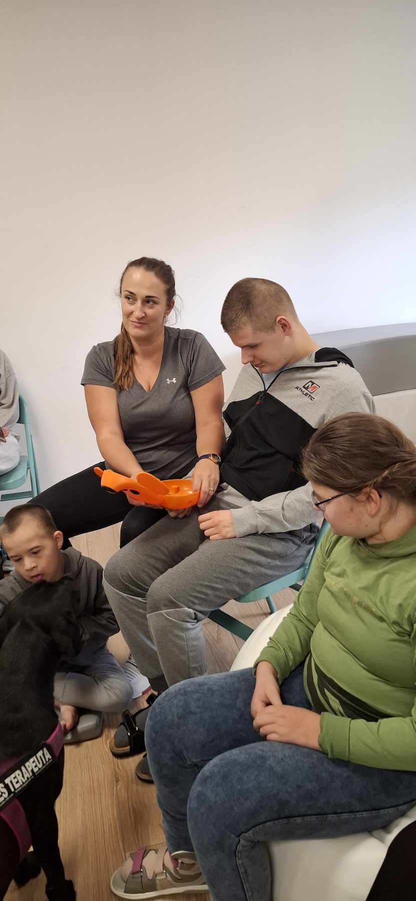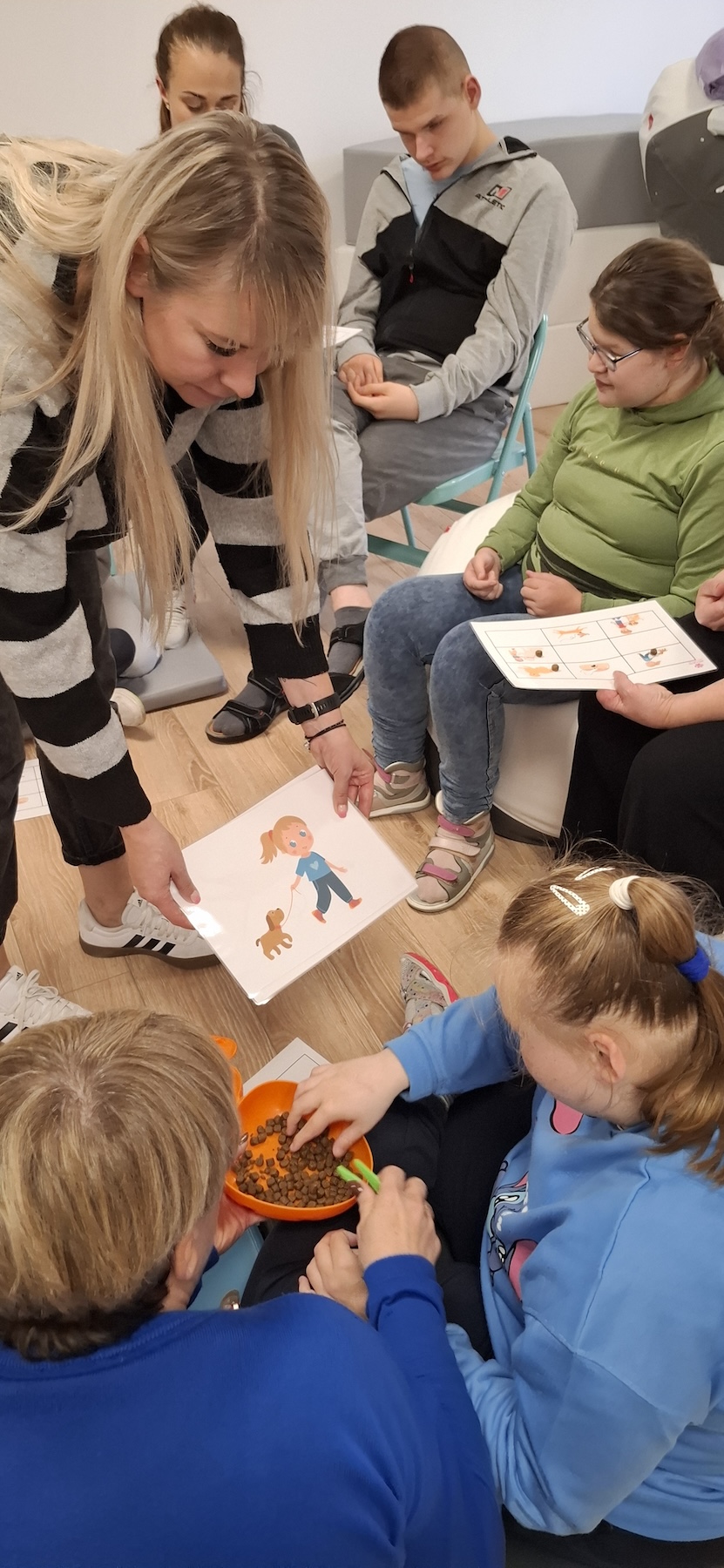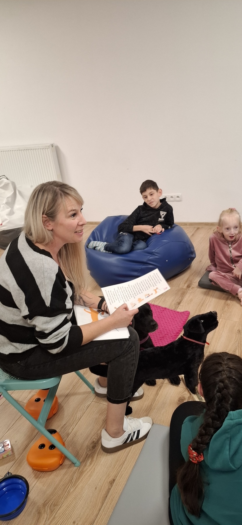 Podczas kolejnych zajęć dogoterapii Pani Kamila przygotowała wiersz Jana Brzechwy „ Jak rozmawiać trzeba z psem „. Po omówieniu treści wiersza przeszliśmy do praktycznych ćwiczeń z psem, podczas których ćwiczyliśmy komendy: „Chodź”, „Szukaj”, „Siad”, „Łapa” oraz „Leżeć” . Na zakończenie zajęć uczniowie nagradzali psa smakołykami.