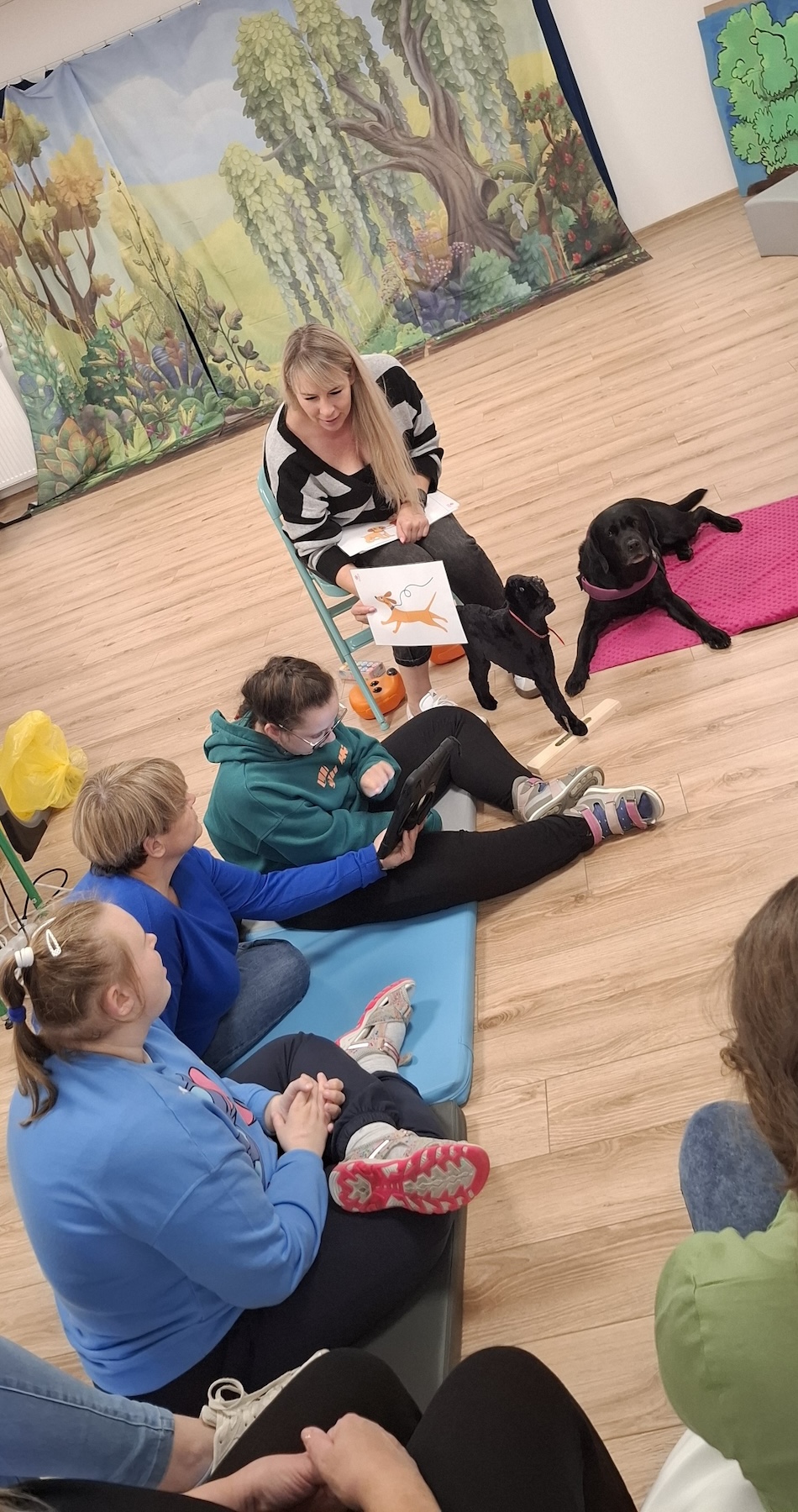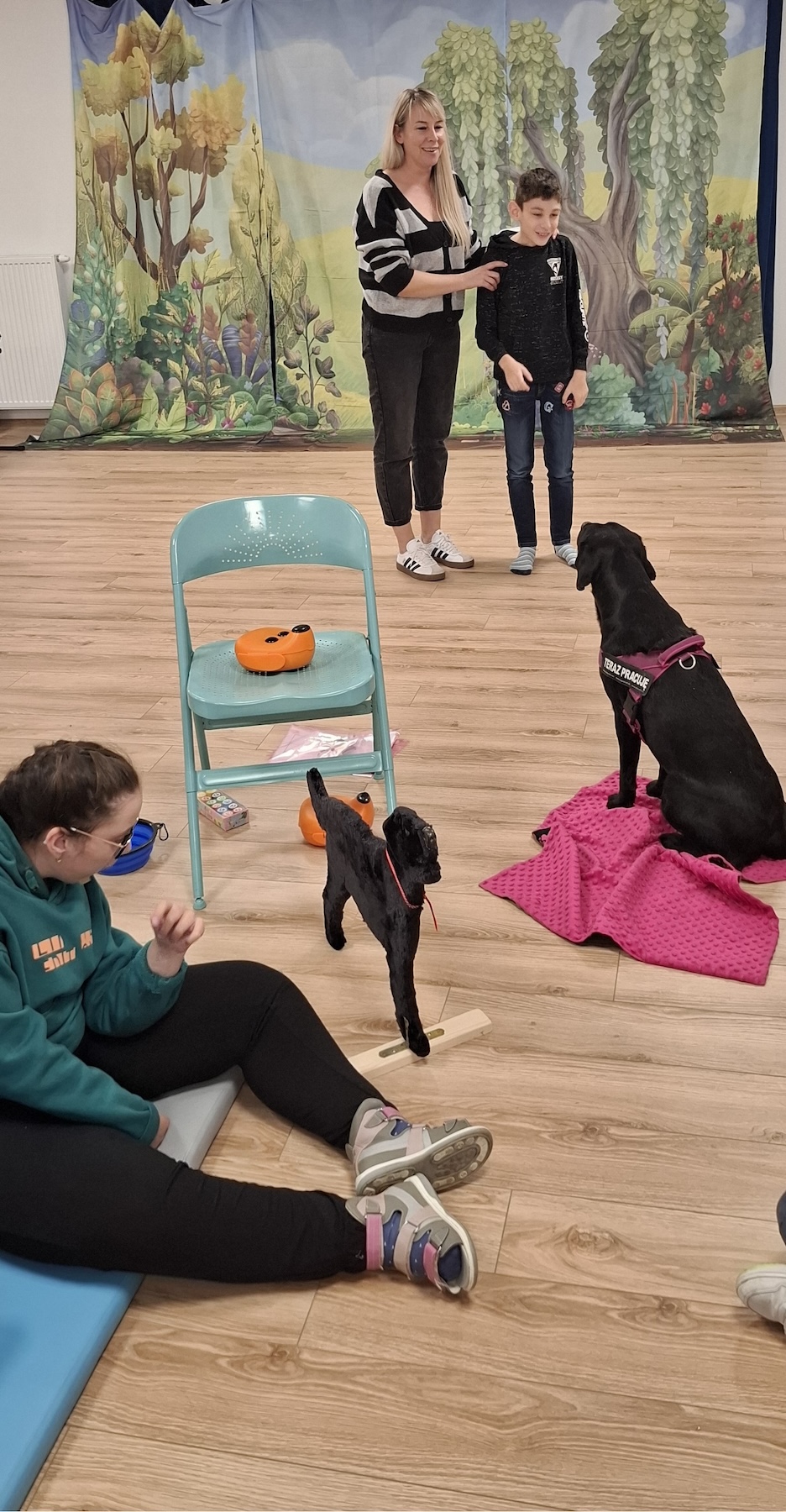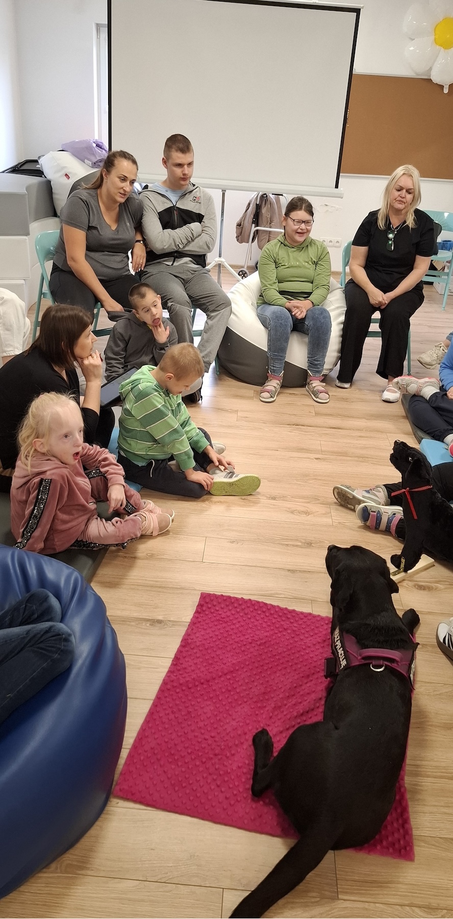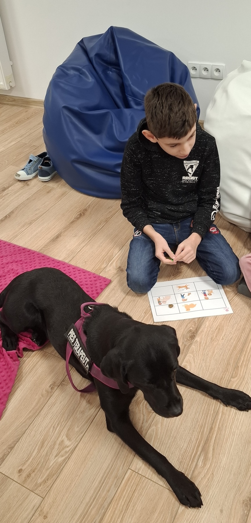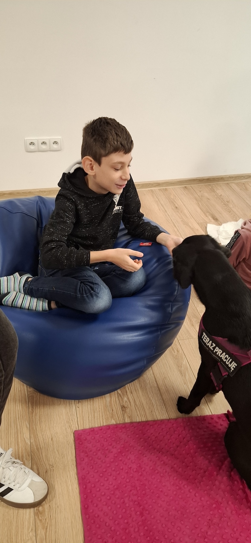 Podczas kolejnych zajęć dogoterapii Pani Kamila przygotowała wiersz Jana Brzechwy „ Jak rozmawiać trzeba z psem „. Po omówieniu treści wiersza przeszliśmy do praktycznych ćwiczeń z psem, podczas których ćwiczyliśmy komendy: „Chodź”, „Szukaj”, „Siad”, „Łapa” oraz „Leżeć” . Na zakończenie zajęć uczniowie nagradzali psa smakołykami.