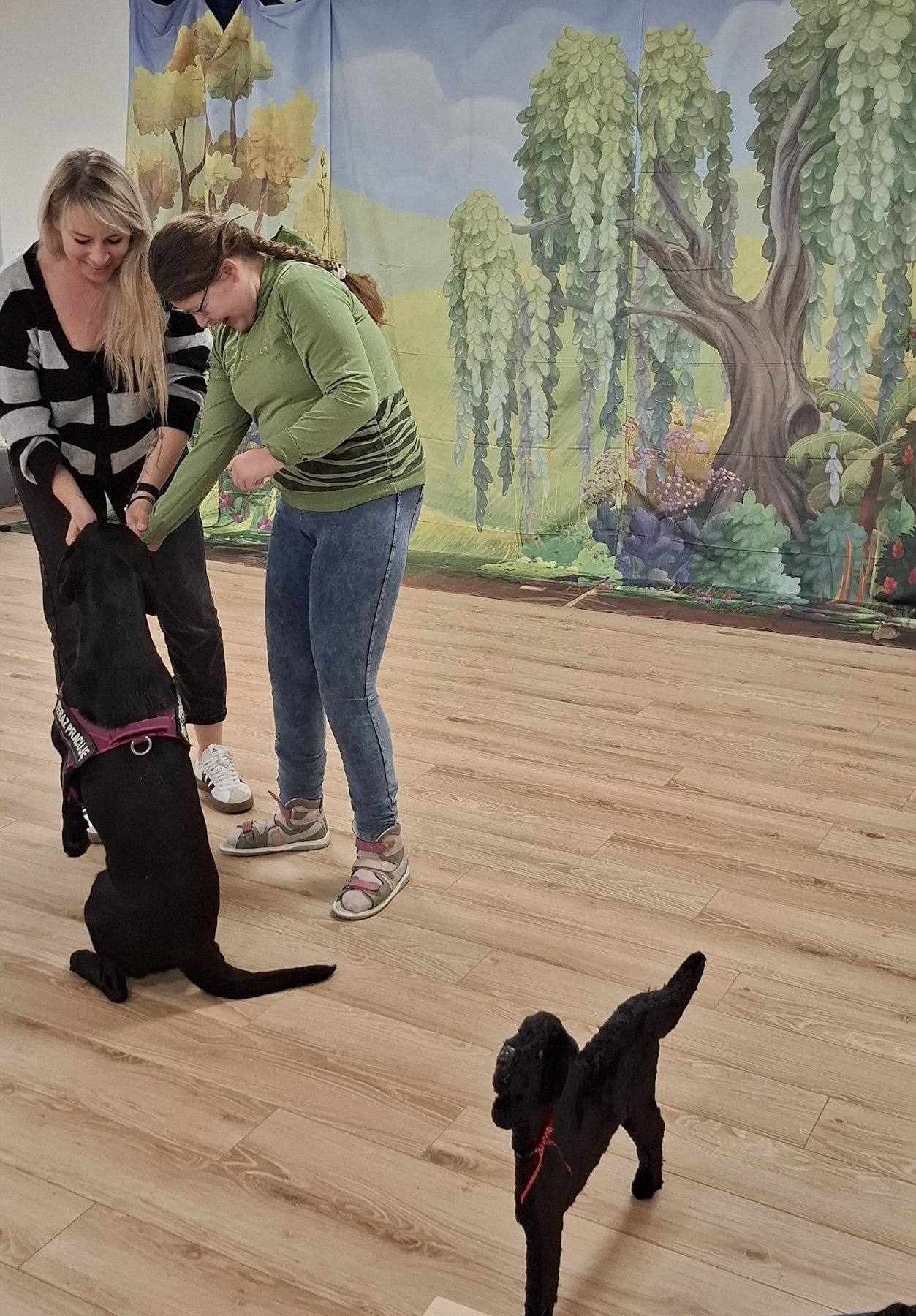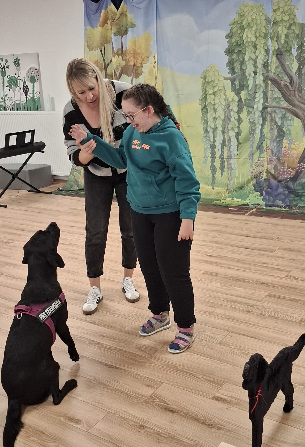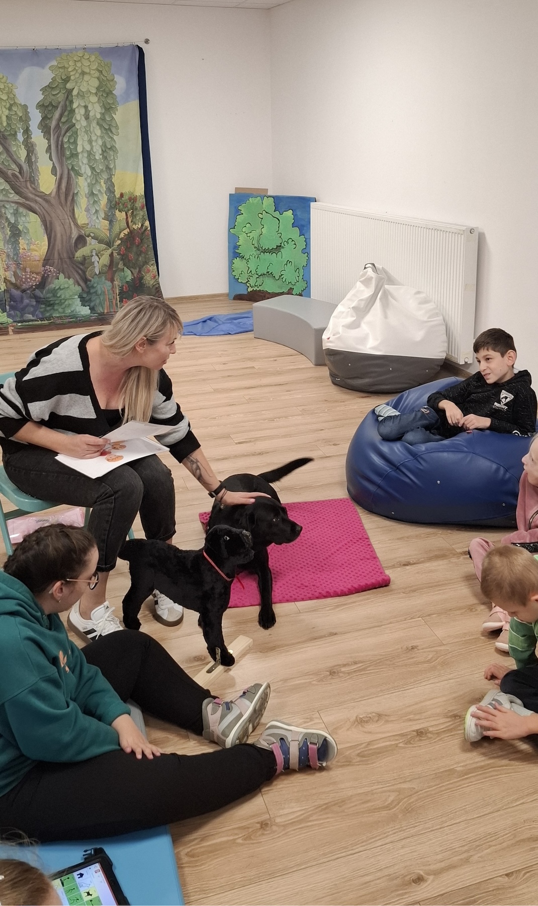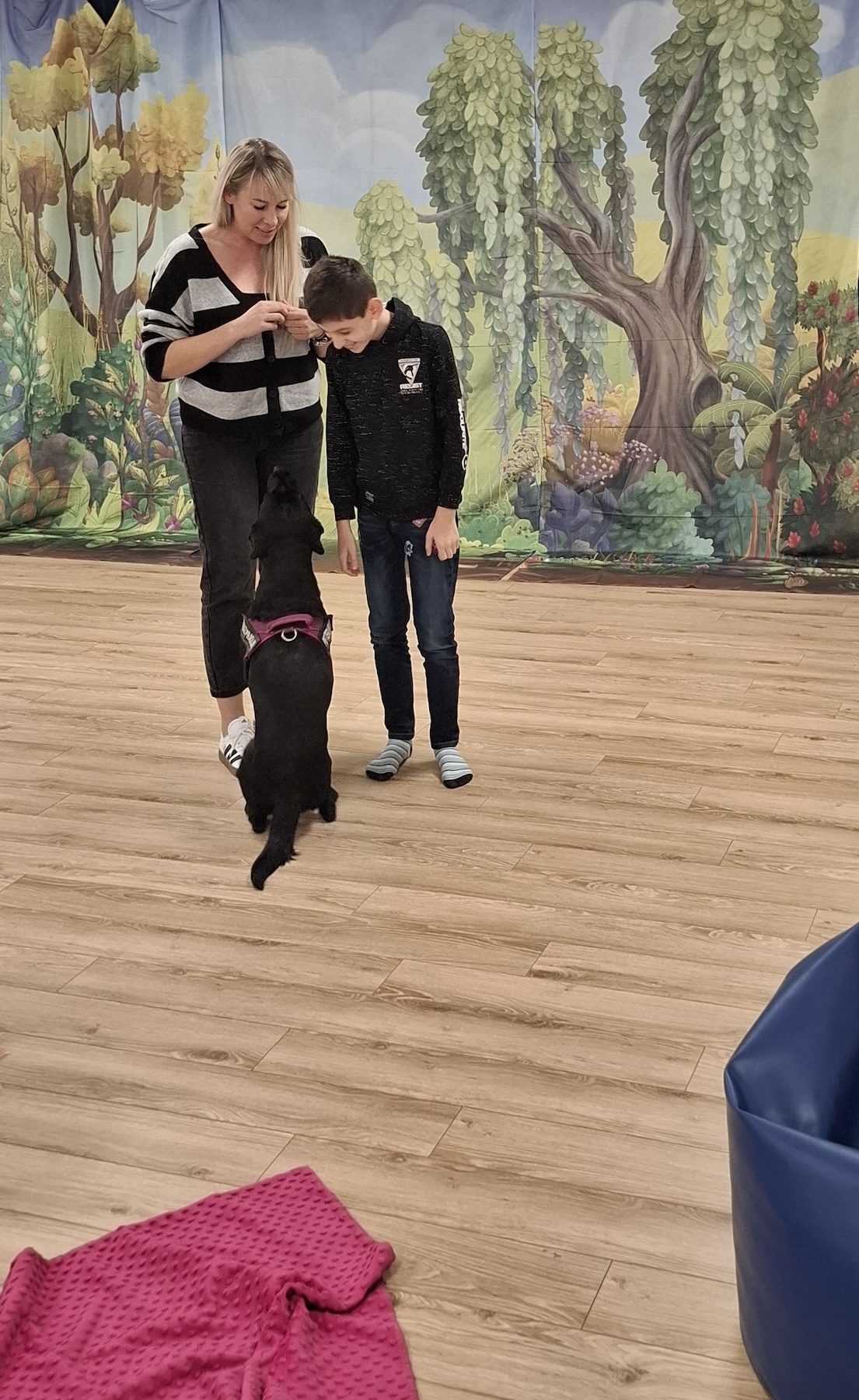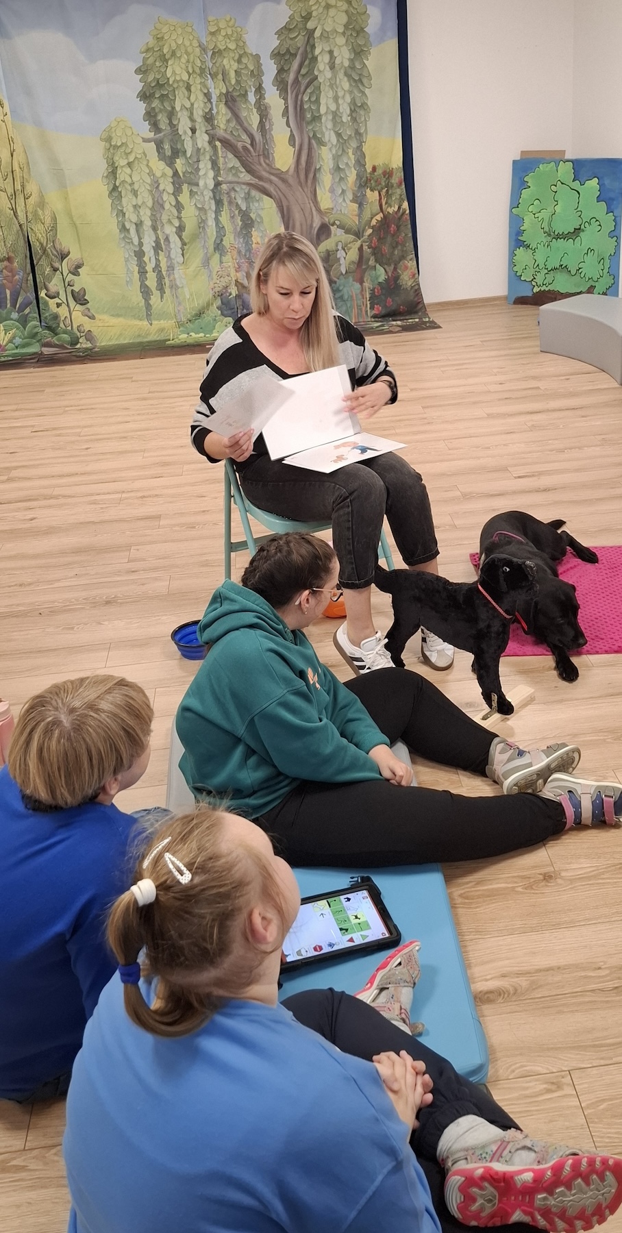 Podczas kolejnych zajęć dogoterapii Pani Kamila przygotowała wiersz Jana Brzechwy „ Jak rozmawiać trzeba z psem „. Po omówieniu treści wiersza przeszliśmy do praktycznych ćwiczeń z psem, podczas których ćwiczyliśmy komendy: „Chodź”, „Szukaj”, „Siad”, „Łapa” oraz „Leżeć” . Na zakończenie zajęć uczniowie nagradzali psa smakołykami.