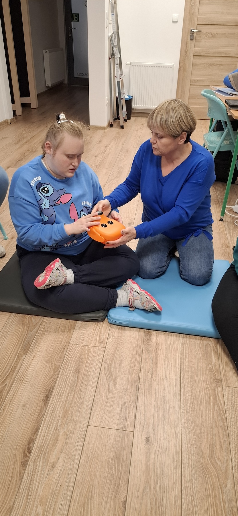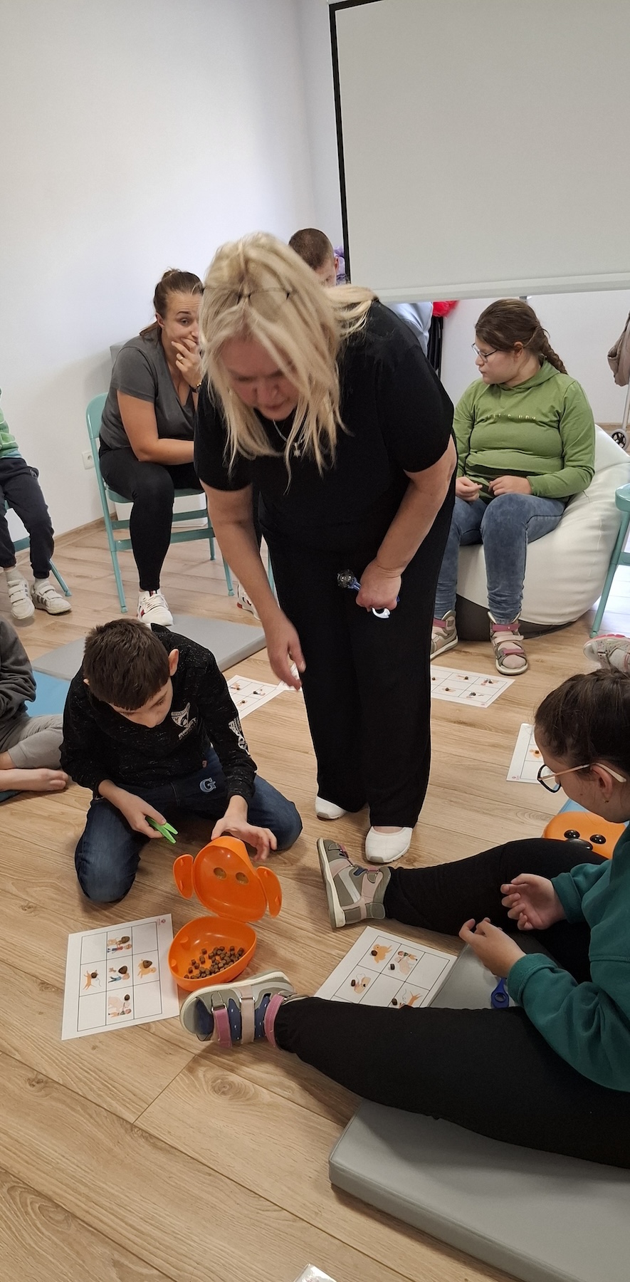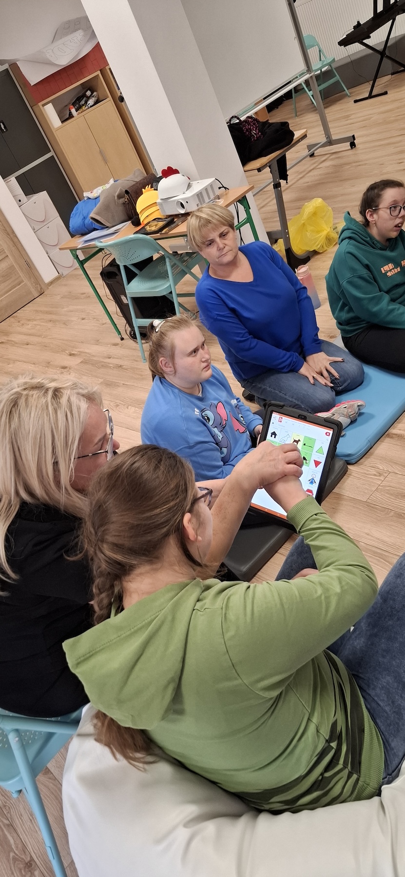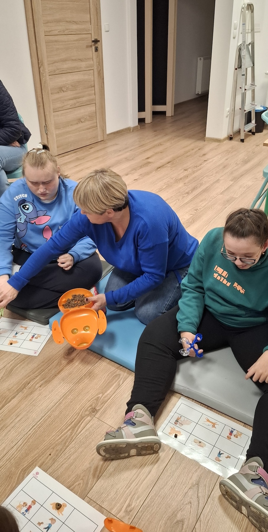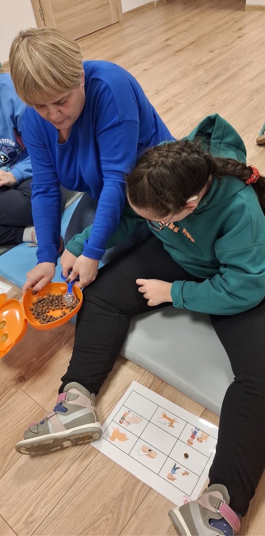 Podczas kolejnych zajęć dogoterapii Pani Kamila przygotowała wiersz Jana Brzechwy „ Jak rozmawiać trzeba z psem „. Po omówieniu treści wiersza przeszliśmy do praktycznych ćwiczeń z psem, podczas których ćwiczyliśmy komendy: „Chodź”, „Szukaj”, „Siad”, „Łapa” oraz „Leżeć” . Na zakończenie zajęć uczniowie nagradzali psa smakołykami.