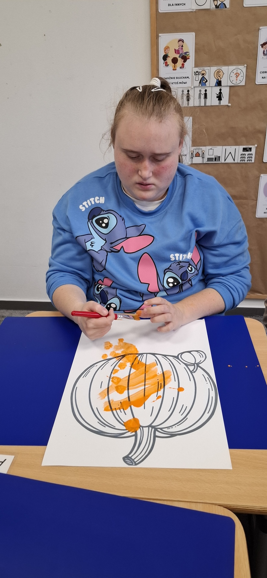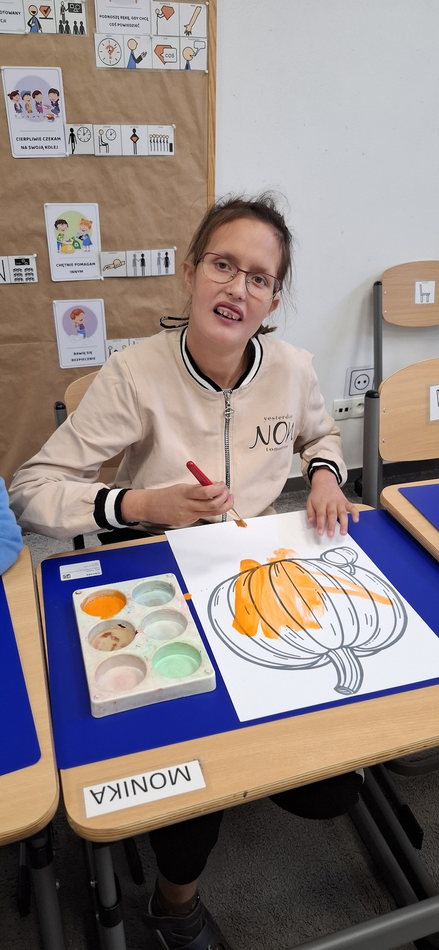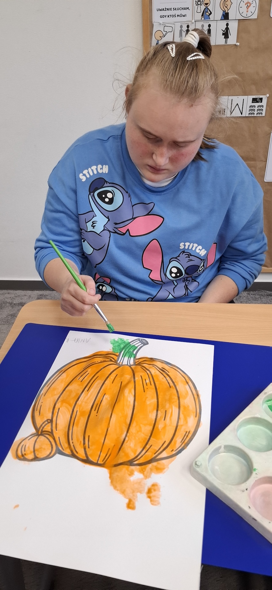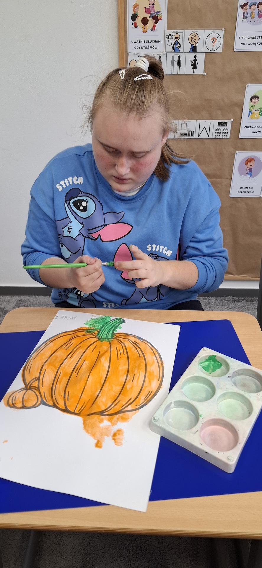 Uczniowie oddziału „II” utrwalając wiedzę na temat jesieni wykonali pracę plastyczną pt: „Dynia” . Jesień to czas, kiedy przyroda zachwyca nas bogactwem kolorów – od złocistych liści po pomarańczowe i charakterystyczne brązowe odcienie. To doskonała okazja, aby spędzać kreatywnie czas z uczniami, wprowadzając ich w świat sztuki i twórczości. Pomysłem na rozwijanie ich wyobraźni było kolorowanie jesiennej dyni farbami. Zabawa ta nie tylko dostarczała wiele radości ale również była doskonałą okazją do nauki, wspierającą rozwój motoryki małej. A oto krótka fotorelacja z tego dnia.