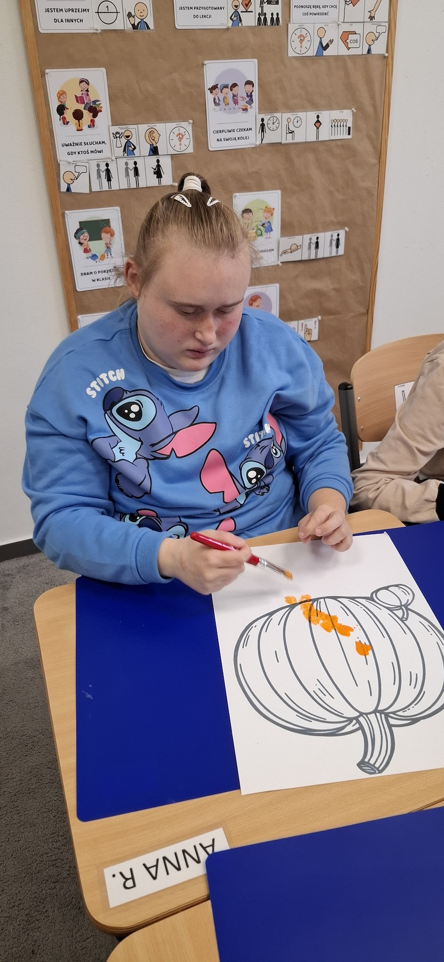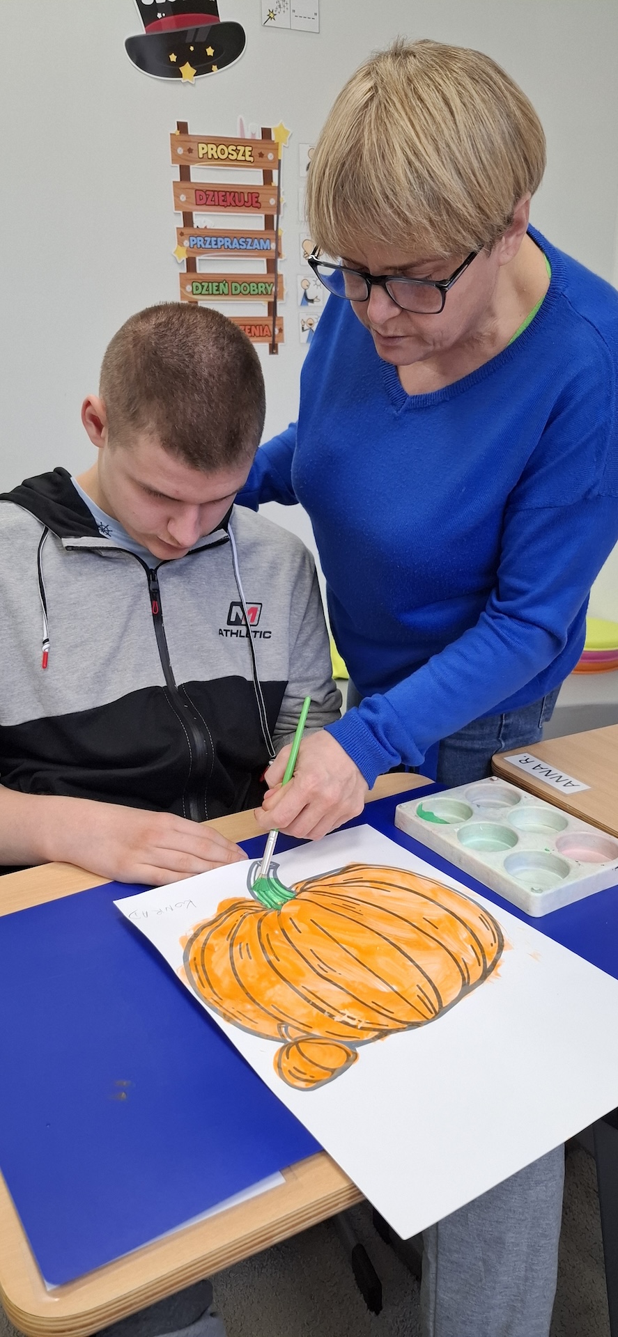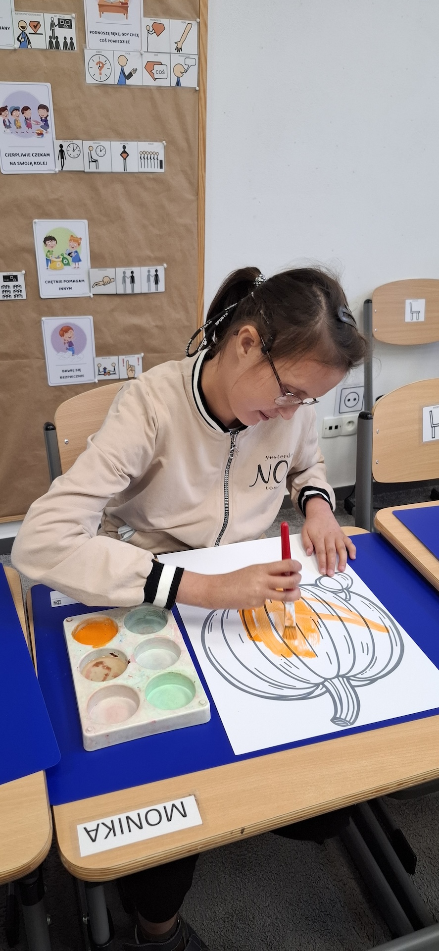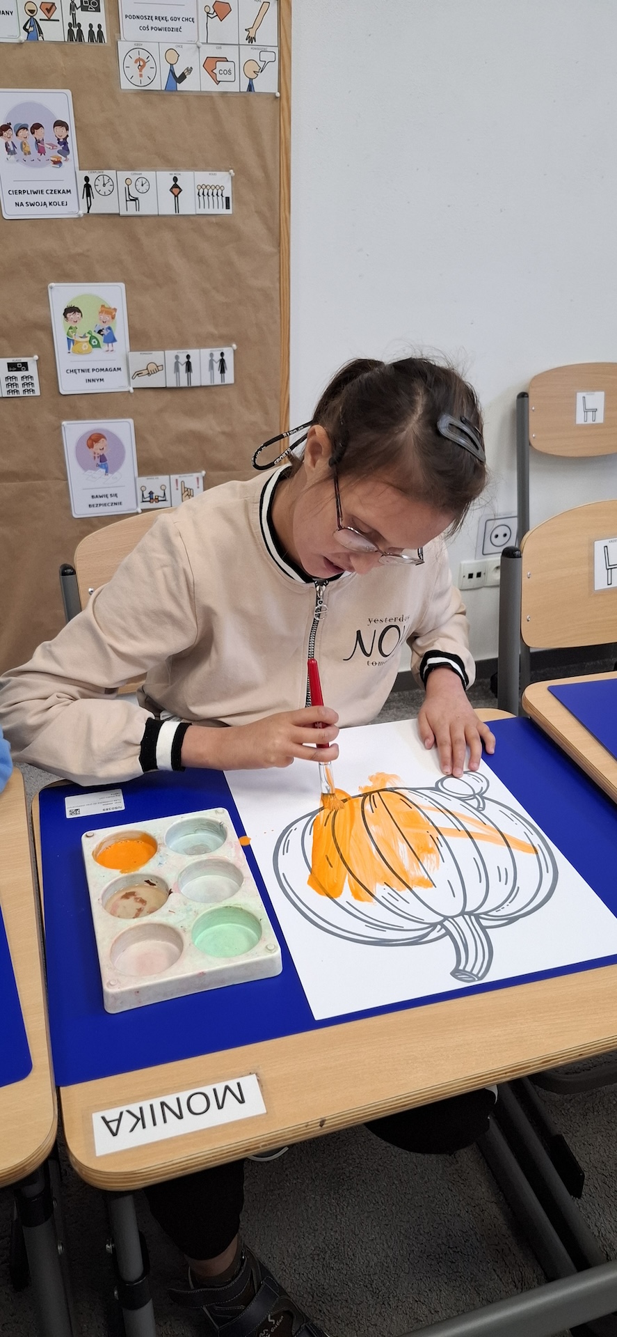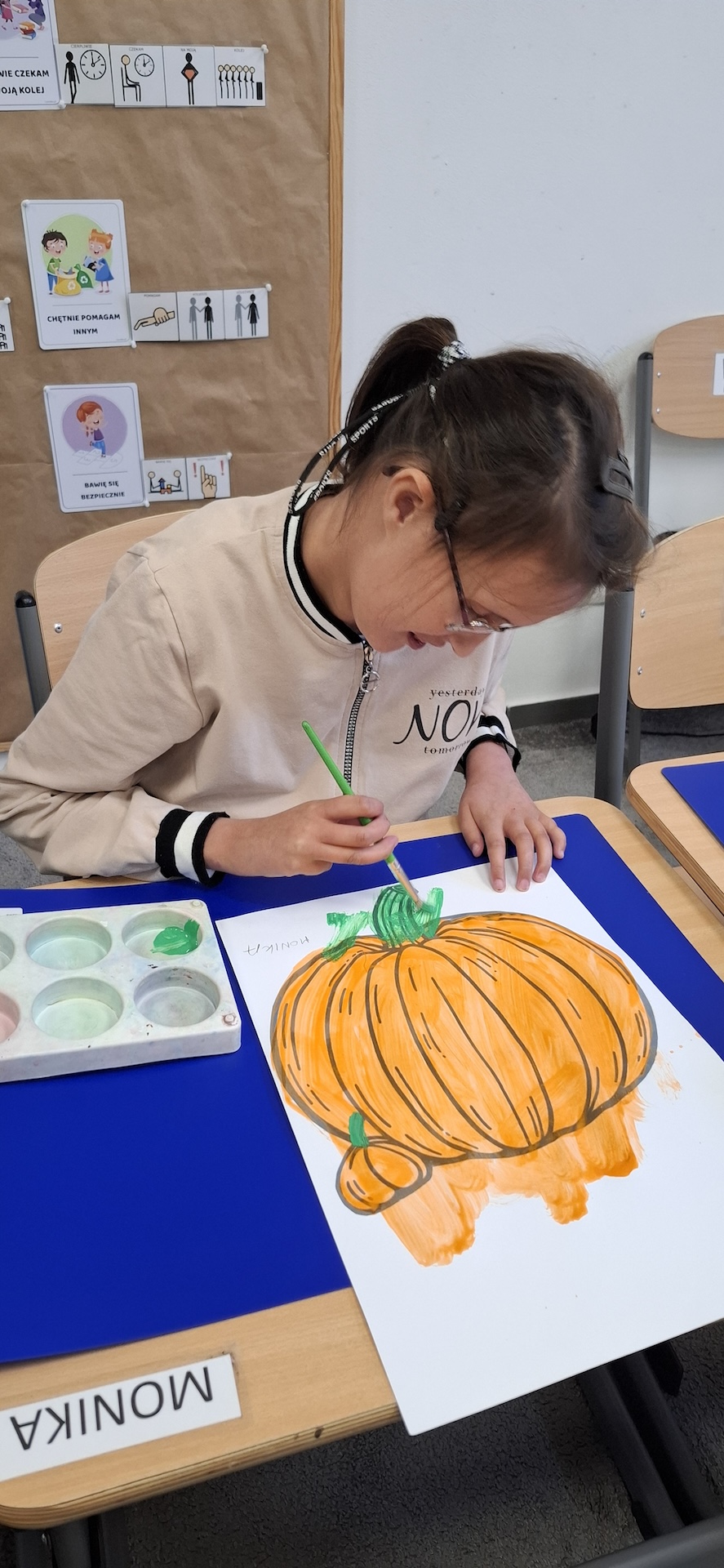 Uczniowie oddziału „II” utrwalając wiedzę na temat jesieni wykonali pracę plastyczną pt: „Dynia” . Jesień to czas, kiedy przyroda zachwyca nas bogactwem kolorów – od złocistych liści po pomarańczowe i charakterystyczne brązowe odcienie. To doskonała okazja, aby spędzać kreatywnie czas z uczniami, wprowadzając ich w świat sztuki i twórczości. Pomysłem na rozwijanie ich wyobraźni było kolorowanie jesiennej dyni farbami. Zabawa ta nie tylko dostarczała wiele radości ale również była doskonałą okazją do nauki, wspierającą rozwój motoryki małej. A oto krótka fotorelacja z tego dnia.