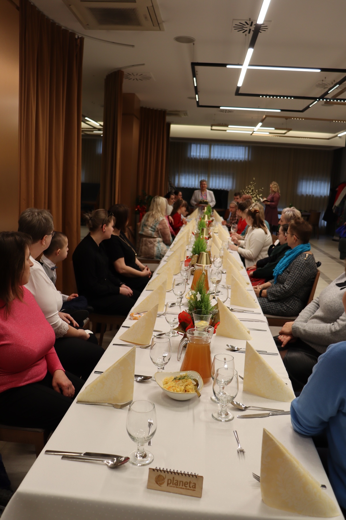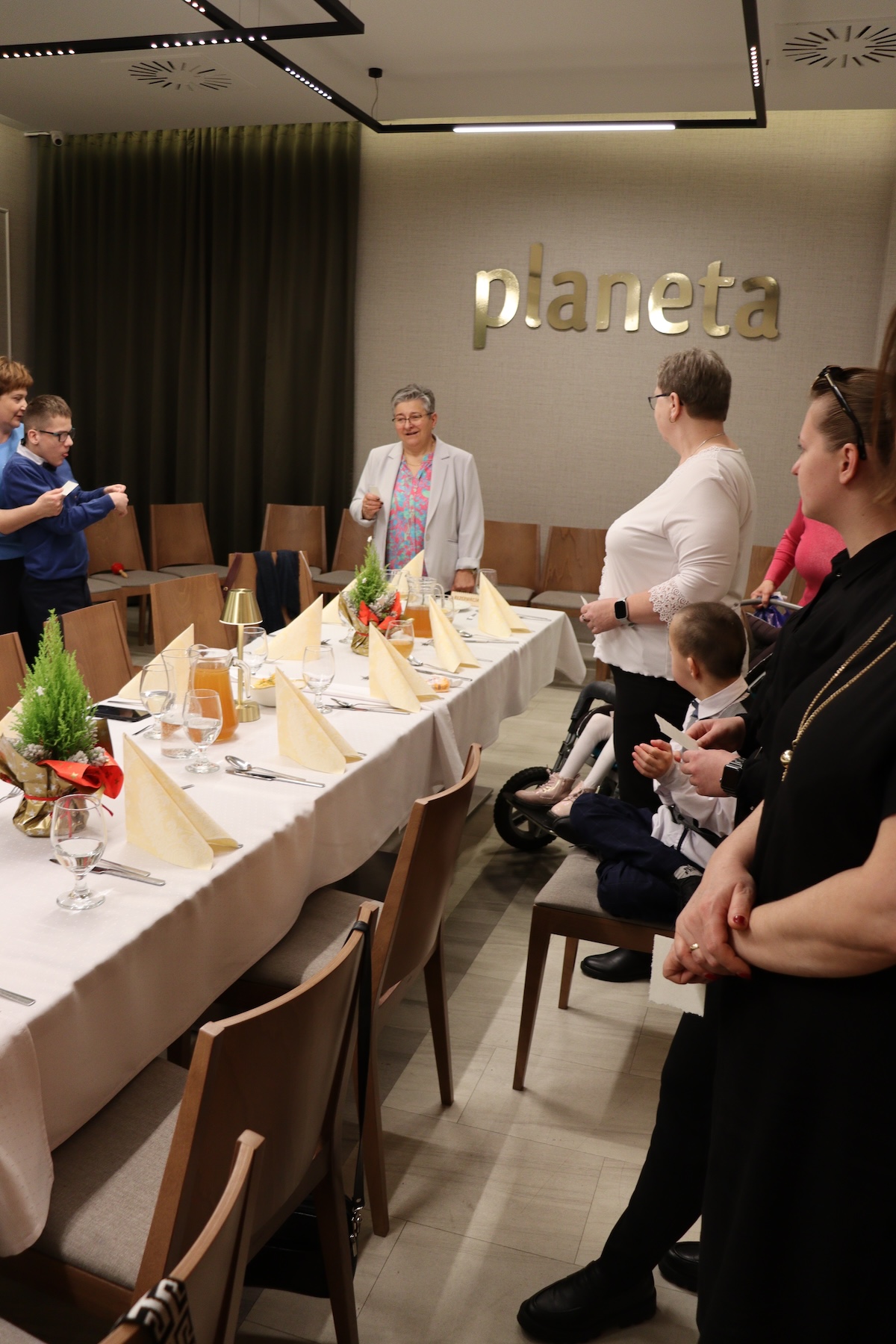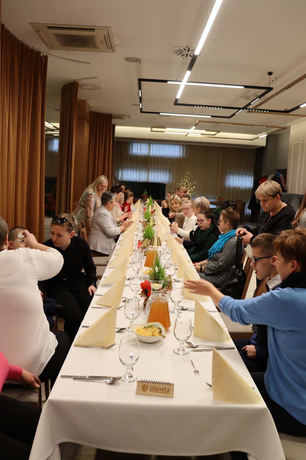Tuż przed Świętami Bożego Narodzenia w naszej szkole odbyło się tradycyjne spotkanie opłatkowe, które miało miejsce w Restauracji „Planeta”. Gdy wszyscy zebrali się na miejscu, Pani Dyrektor serdecznie powitała wszystkich zgromadzonych i złożyła świąteczne życzenia, następnie podzieliliśmy się opłatkiem, symbolem otwartości serca i gotowości do przebaczenia. Po tej wzruszającej chwili zasiedliśmy do Wigilijnego Stołu, gdzie mogliśmy delektować się pysznymi potrawami. Atmosferę spotkania umiliło uroczyste odśpiewanie kolęd, które wprowadziło nas w prawdziwie świąteczny nastrój. Na zakończenie spotkania wszyscy otrzymali skromne upominki bożonarodzeniowe, które były miłym akcentem i udali się do swoich domów, aby cieszyć się świątecznym odpoczynkiem w gronie najbliższych. Życzymy wszystkim spokojnych, ciepłych i pełnych miłości Świąt Bożego Narodzenia!