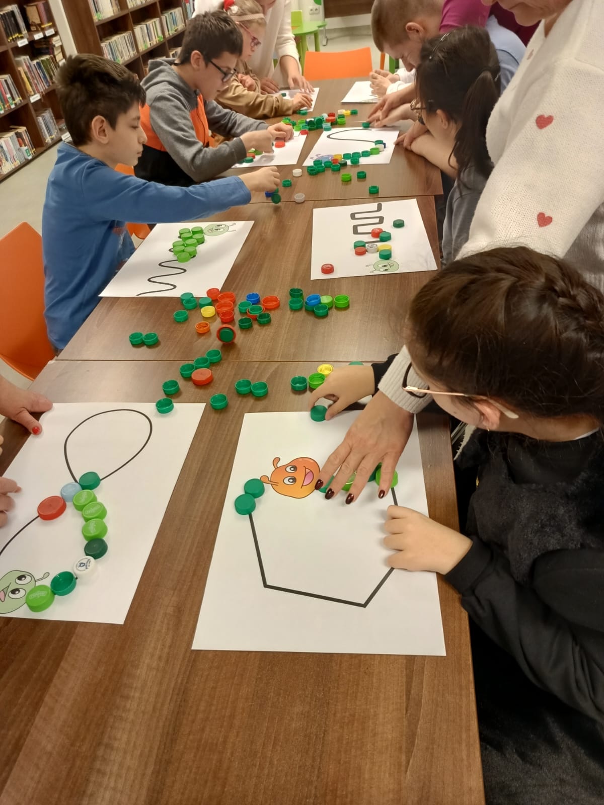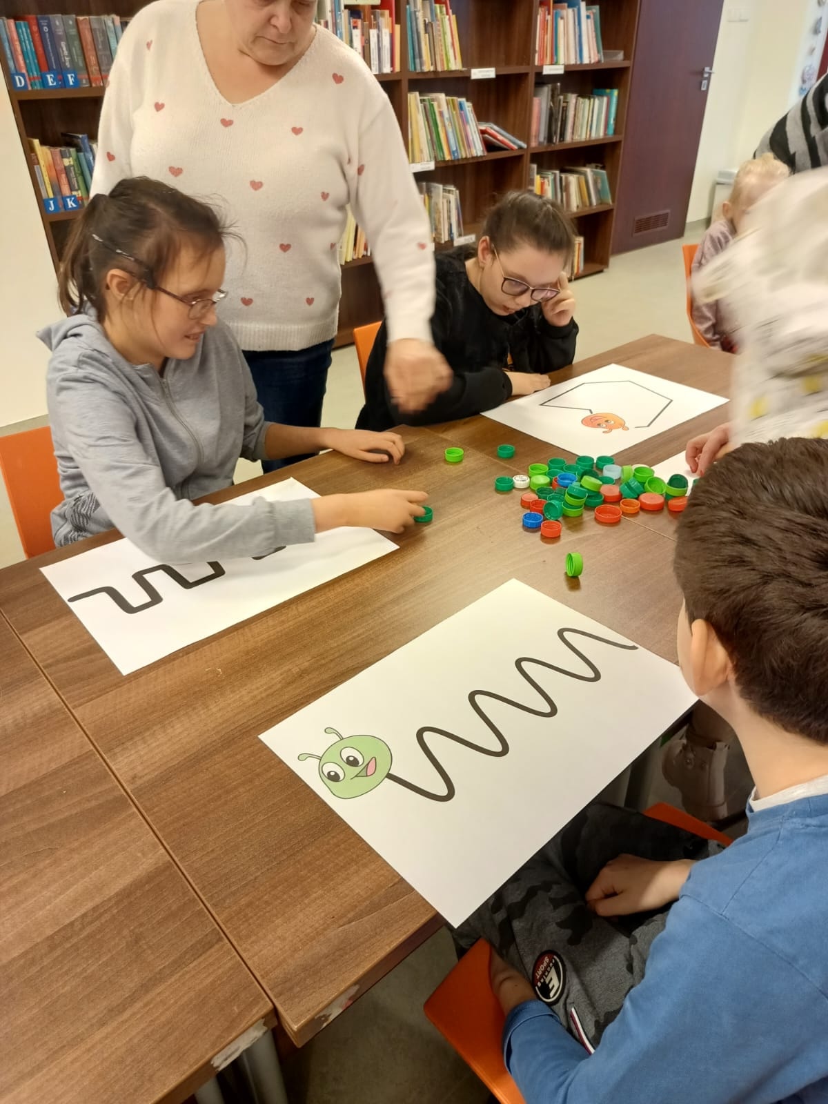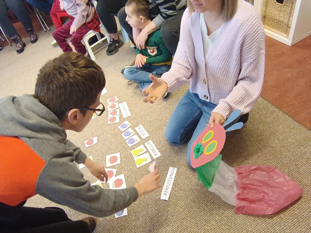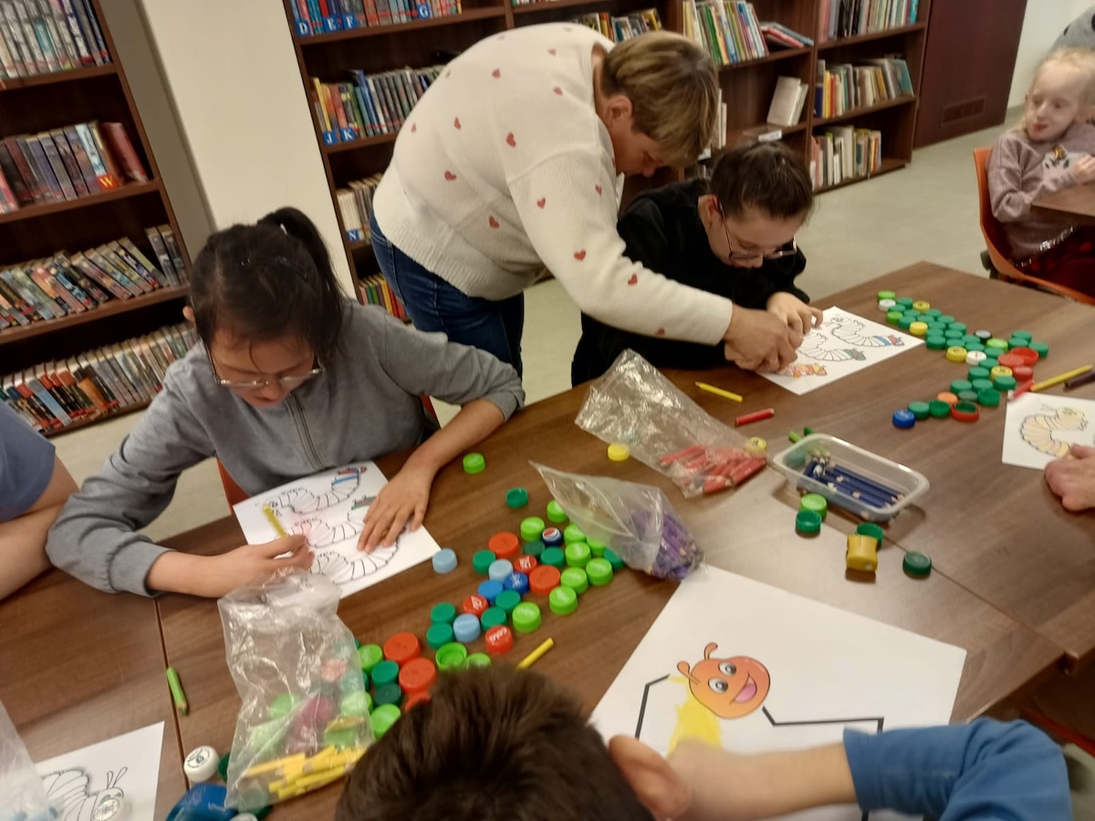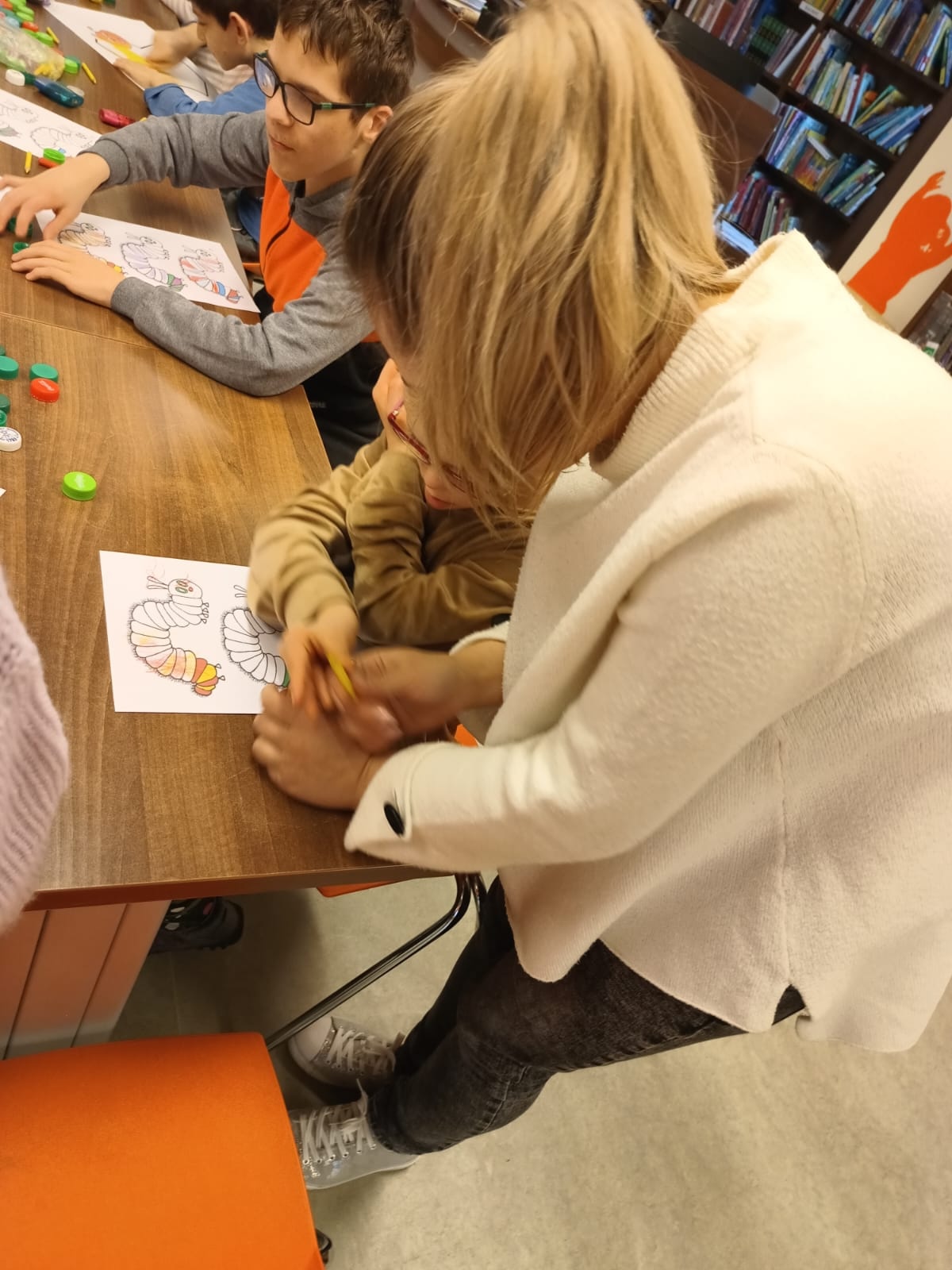 Podczas lutowego spotkania z książką uczniowie naszej szkoły zapoznali się historią bardzo głodnej gąsienicy, bohaterki książeczki dla dzieci o tym samym tytule. Dzieci zapamiętywały, co bohaterka książki lubiła jeść w każdym dniu tygodnia i w jakich ilościach. Potem nazywały i przeliczały owoce, które zjadała każdego dnia. Na koniec każdy mógł nakarmić biblioteczną głodną gąsienicę. W ramach relaksu, uczniowie robili sobie nawzajem masażyk na plecach, do wiersza o gąsienicy. Na koniec zajęć każdy mógł utworzyć swoją kolorową gąsienicę z plastikowych nakrętek, układając je na wybranym wzorze. Mógł także pokolorować gąsienicę kredką, wg podanego wzoru.