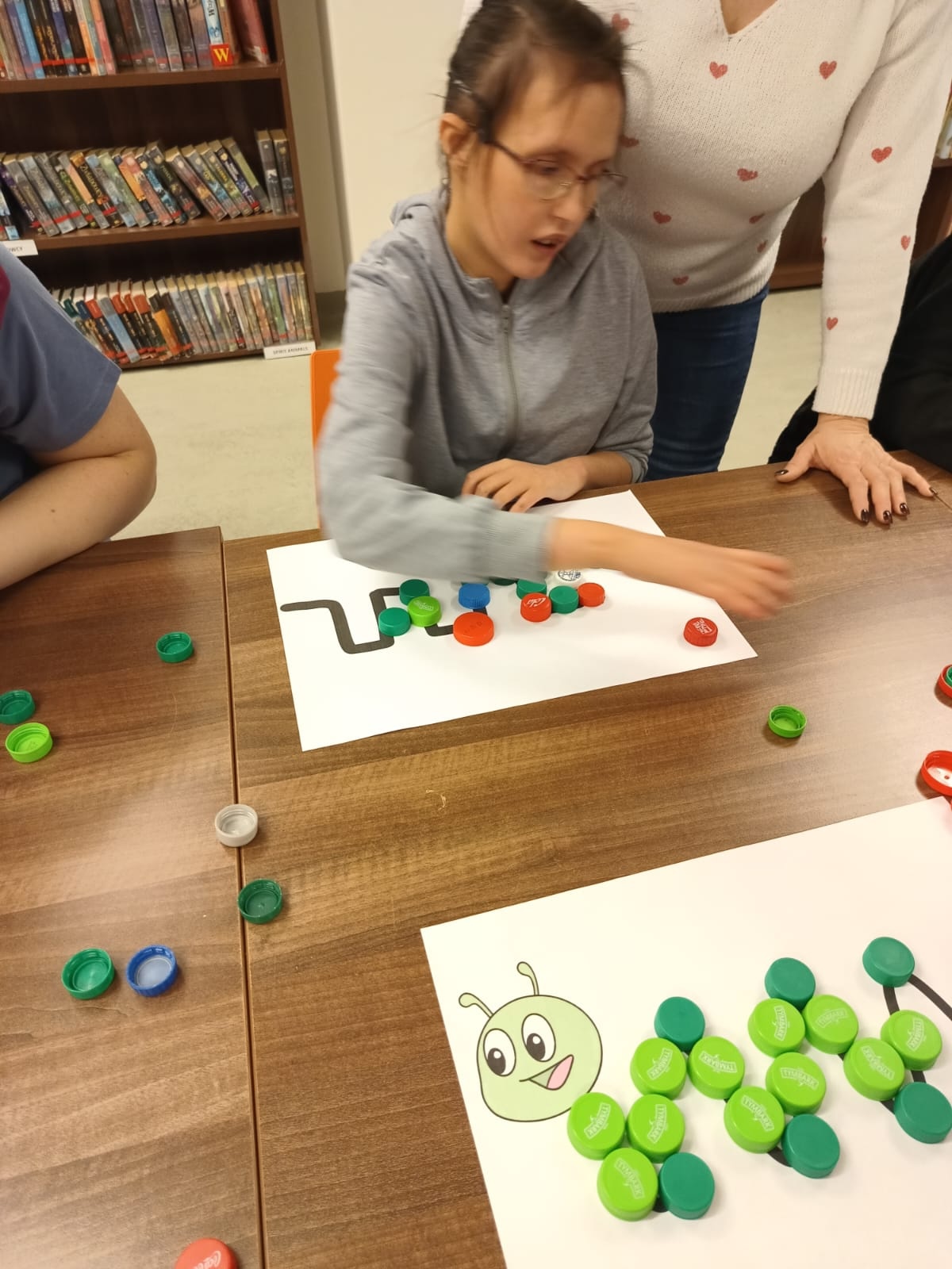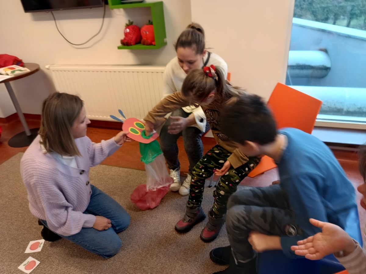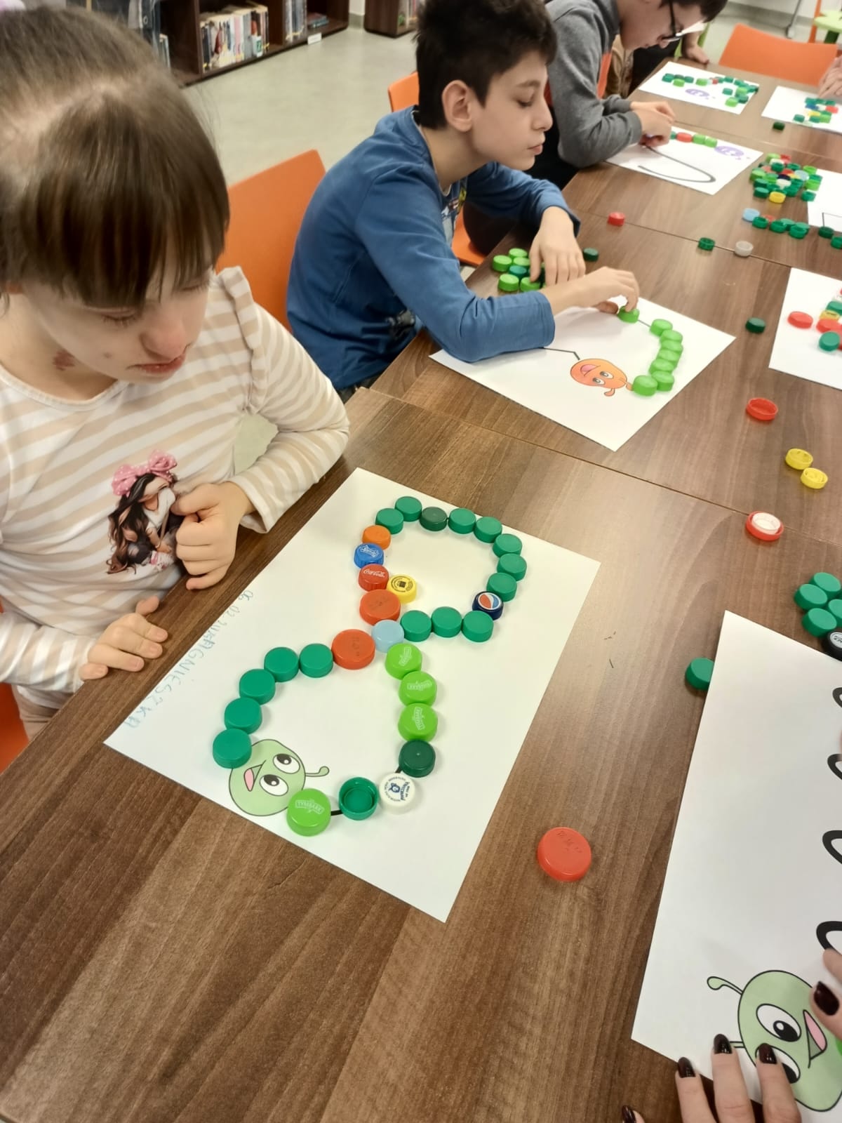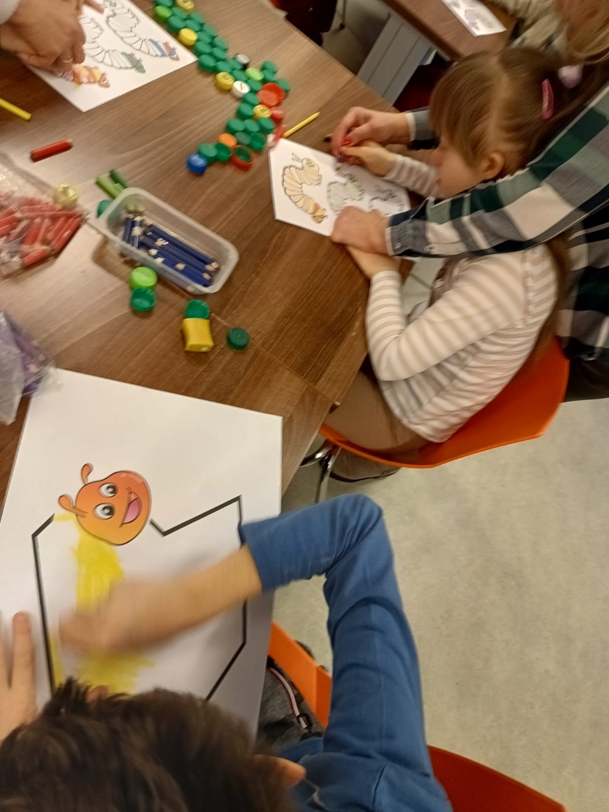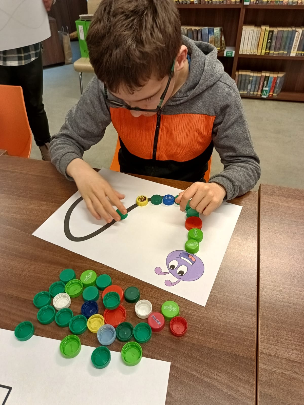 Podczas lutowego spotkania z książką uczniowie naszej szkoły zapoznali się historią bardzo głodnej gąsienicy, bohaterki książeczki dla dzieci o tym samym tytule. Dzieci zapamiętywały, co bohaterka książki lubiła jeść w każdym dniu tygodnia i w jakich ilościach. Potem nazywały i przeliczały owoce, które zjadała każdego dnia. Na koniec każdy mógł nakarmić biblioteczną głodną gąsienicę. W ramach relaksu, uczniowie robili sobie nawzajem masażyk na plecach, do wiersza o gąsienicy. Na koniec zajęć każdy mógł utworzyć swoją kolorową gąsienicę z plastikowych nakrętek, układając je na wybranym wzorze. Mógł także pokolorować gąsienicę kredką, wg podanego wzoru.