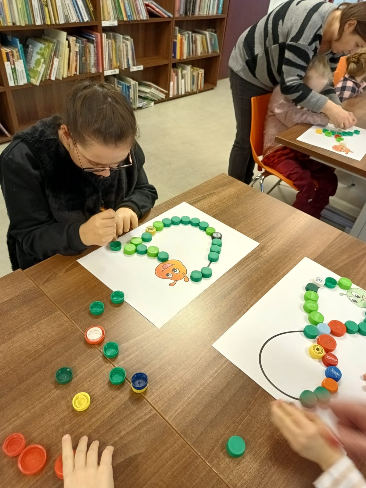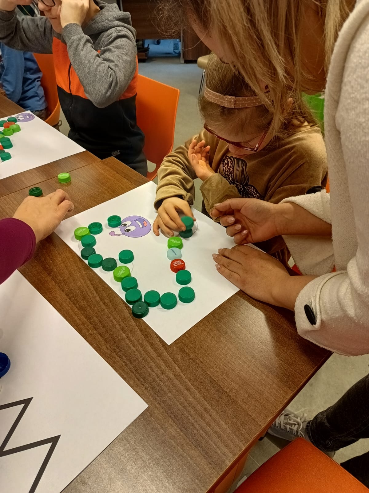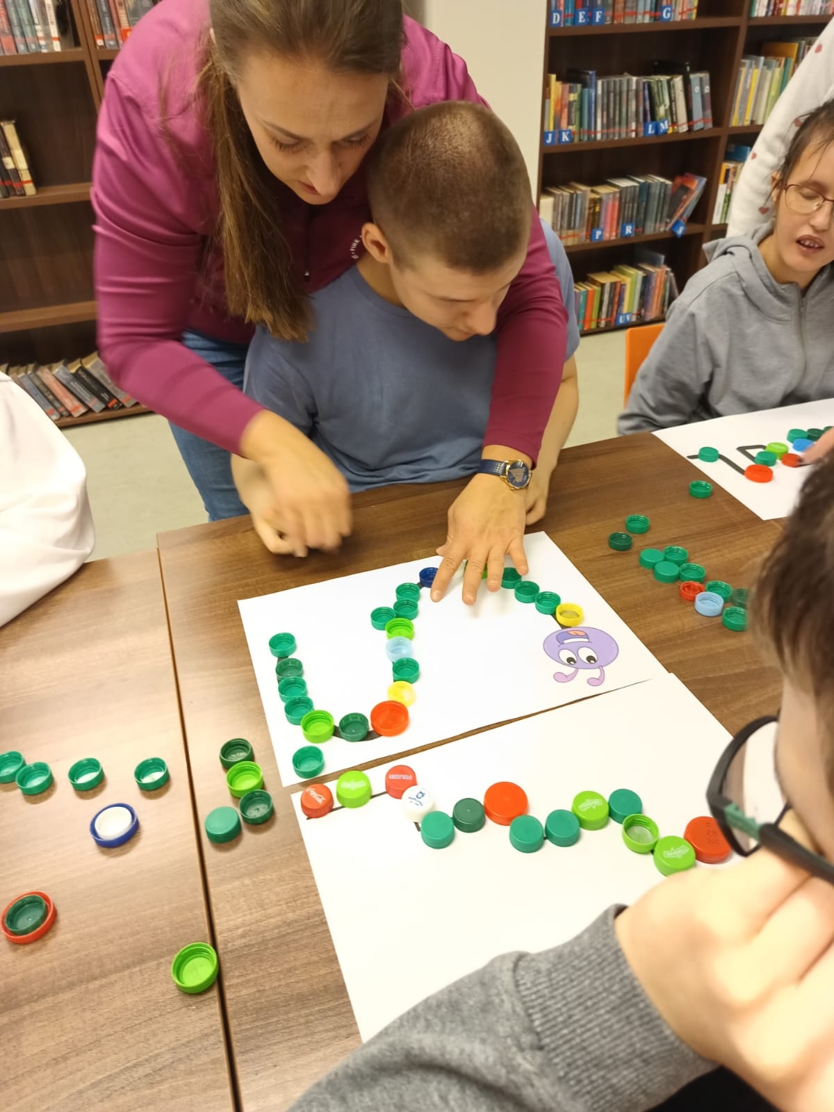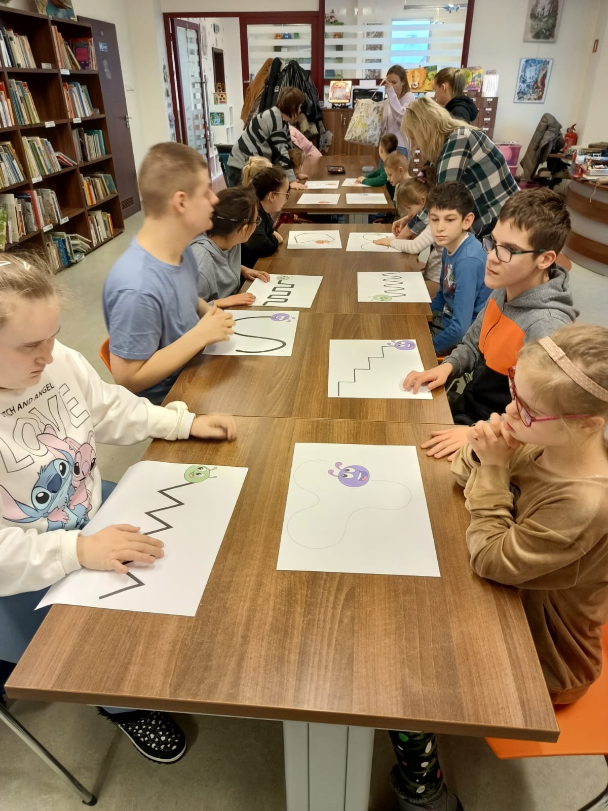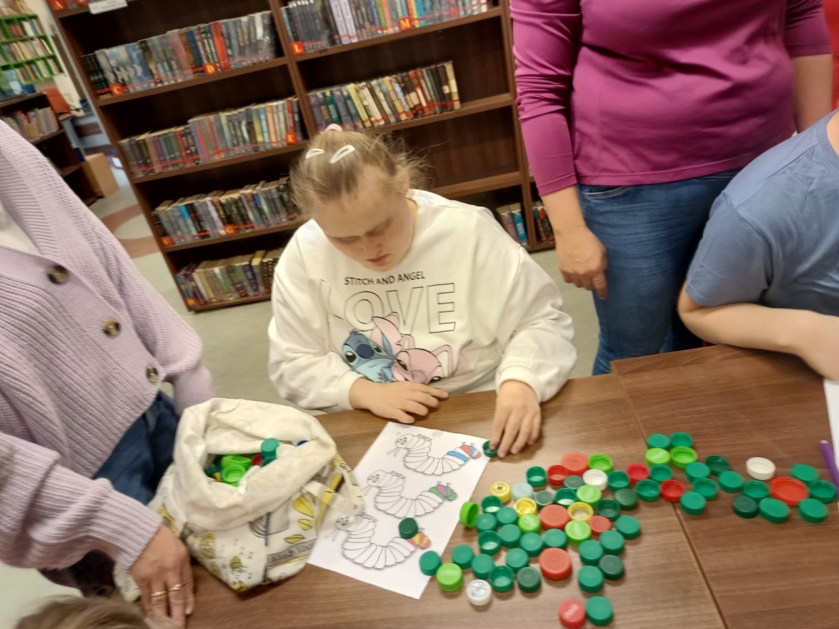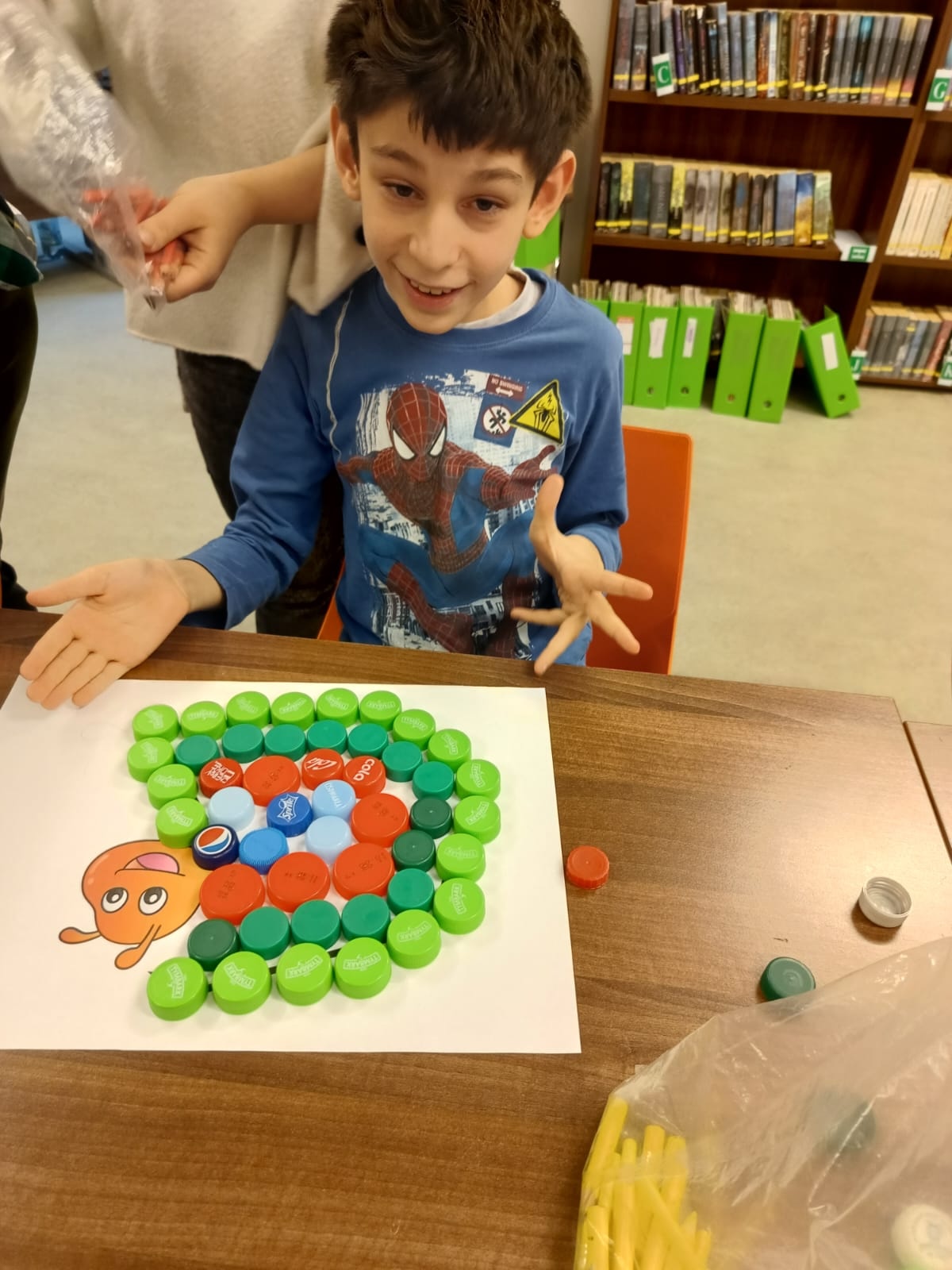Podczas lutowego spotkania z książką uczniowie naszej szkoły zapoznali się historią bardzo głodnej gąsienicy, bohaterki książeczki dla dzieci o tym samym tytule. Dzieci zapamiętywały, co bohaterka książki lubiła jeść w każdym dniu tygodnia i w jakich ilościach. Potem nazywały i przeliczały owoce, które zjadała każdego dnia. Na koniec każdy mógł nakarmić biblioteczną głodną gąsienicę. W ramach relaksu, uczniowie robili sobie nawzajem masażyk na plecach, do wiersza o gąsienicy. Na koniec zajęć każdy mógł utworzyć swoją kolorową gąsienicę z plastikowych nakrętek, układając je na wybranym wzorze. Mógł także pokolorować gąsienicę kredką, wg podanego wzoru.