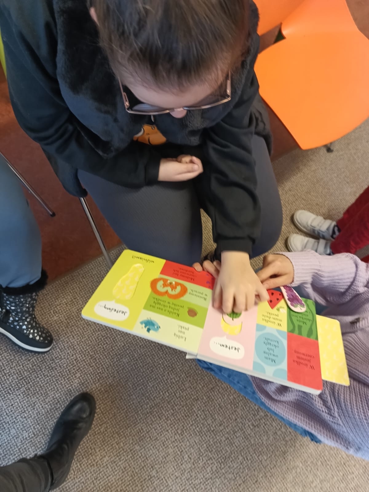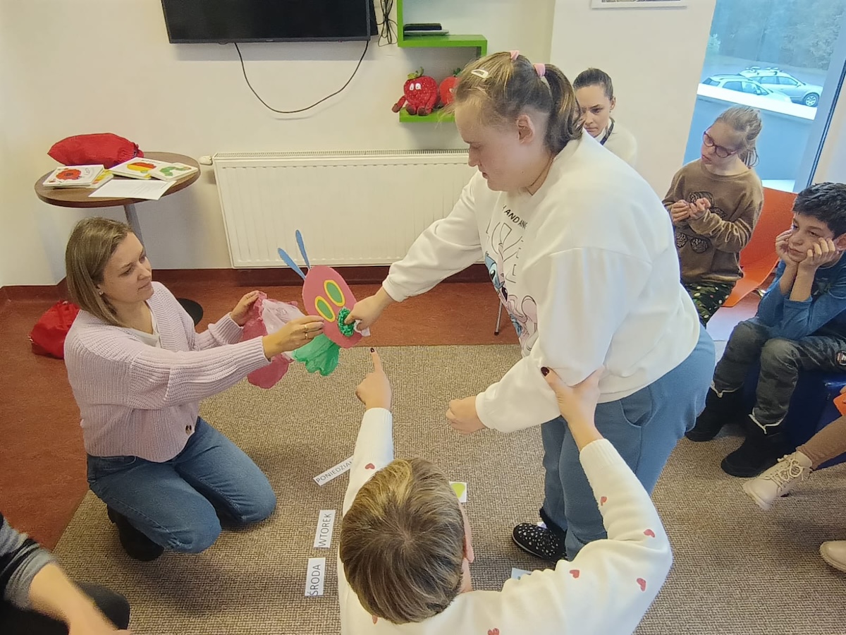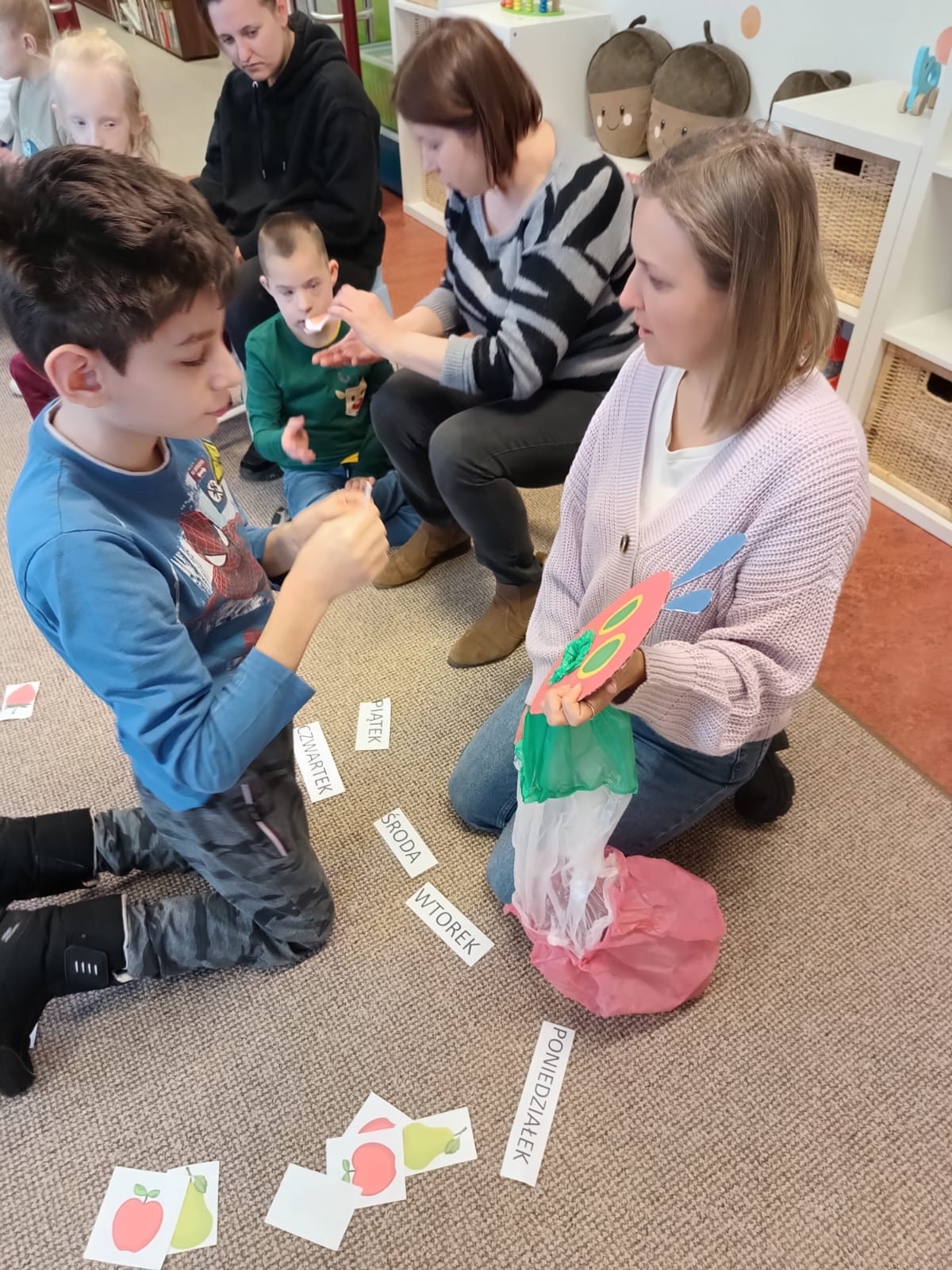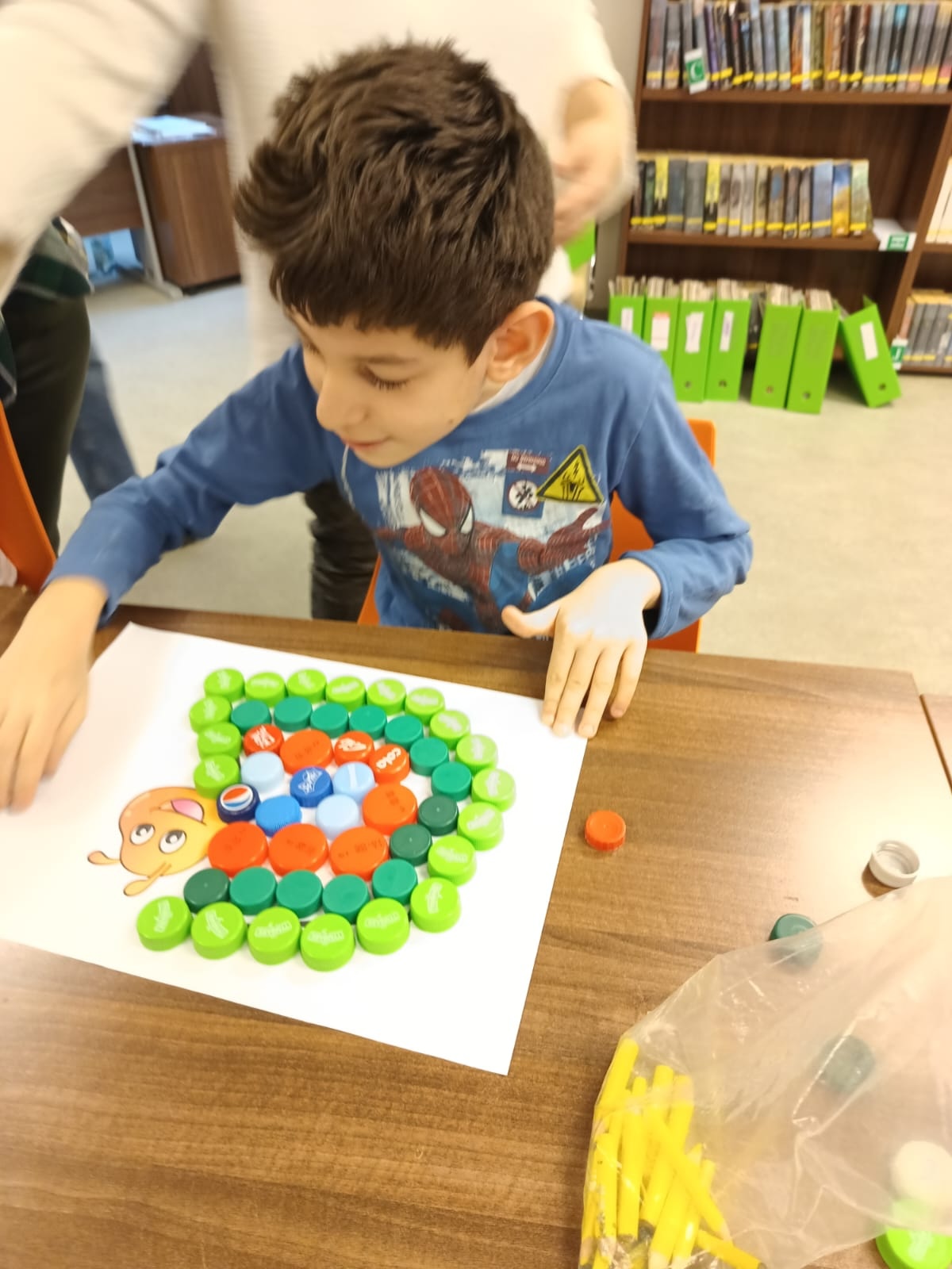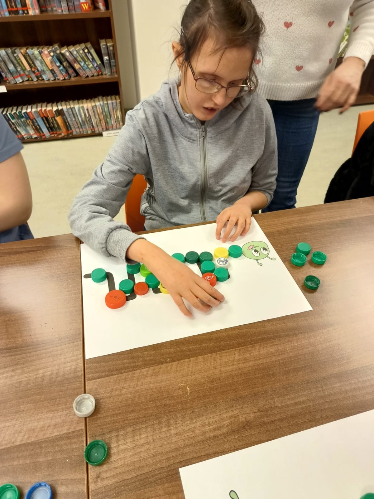 Podczas lutowego spotkania z książką uczniowie naszej szkoły zapoznali się historią bardzo głodnej gąsienicy, bohaterki książeczki dla dzieci o tym samym tytule. Dzieci zapamiętywały, co bohaterka książki lubiła jeść w każdym dniu tygodnia i w jakich ilościach. Potem nazywały i przeliczały owoce, które zjadała każdego dnia. Na koniec każdy mógł nakarmić biblioteczną głodną gąsienicę. W ramach relaksu, uczniowie robili sobie nawzajem masażyk na plecach, do wiersza o gąsienicy. Na koniec zajęć każdy mógł utworzyć swoją kolorową gąsienicę z plastikowych nakrętek, układając je na wybranym wzorze. Mógł także pokolorować gąsienicę kredką, wg podanego wzoru.