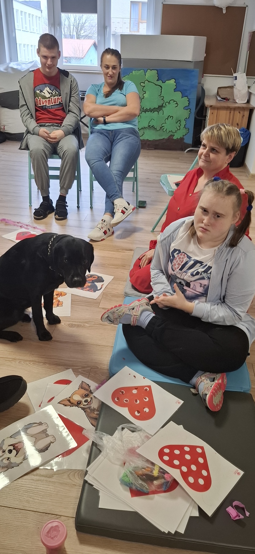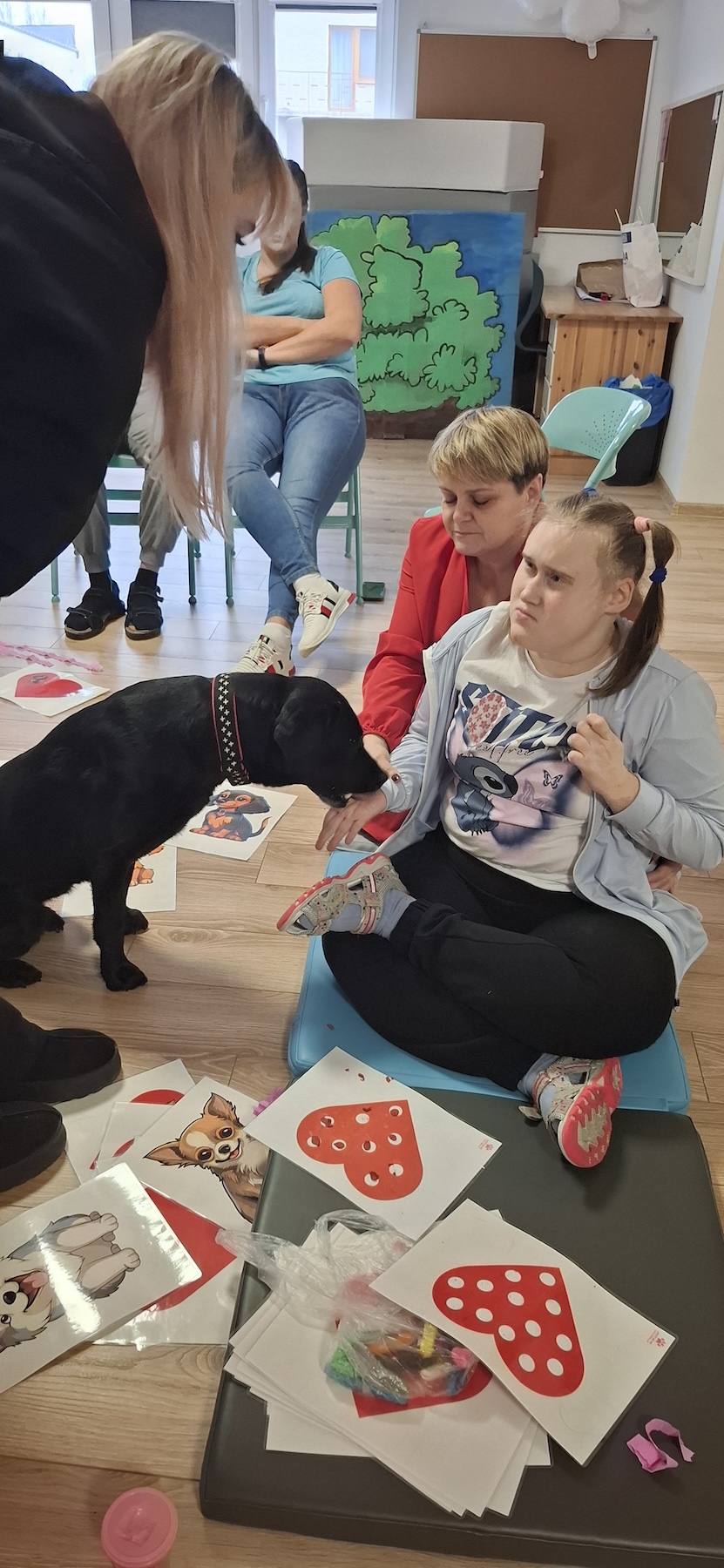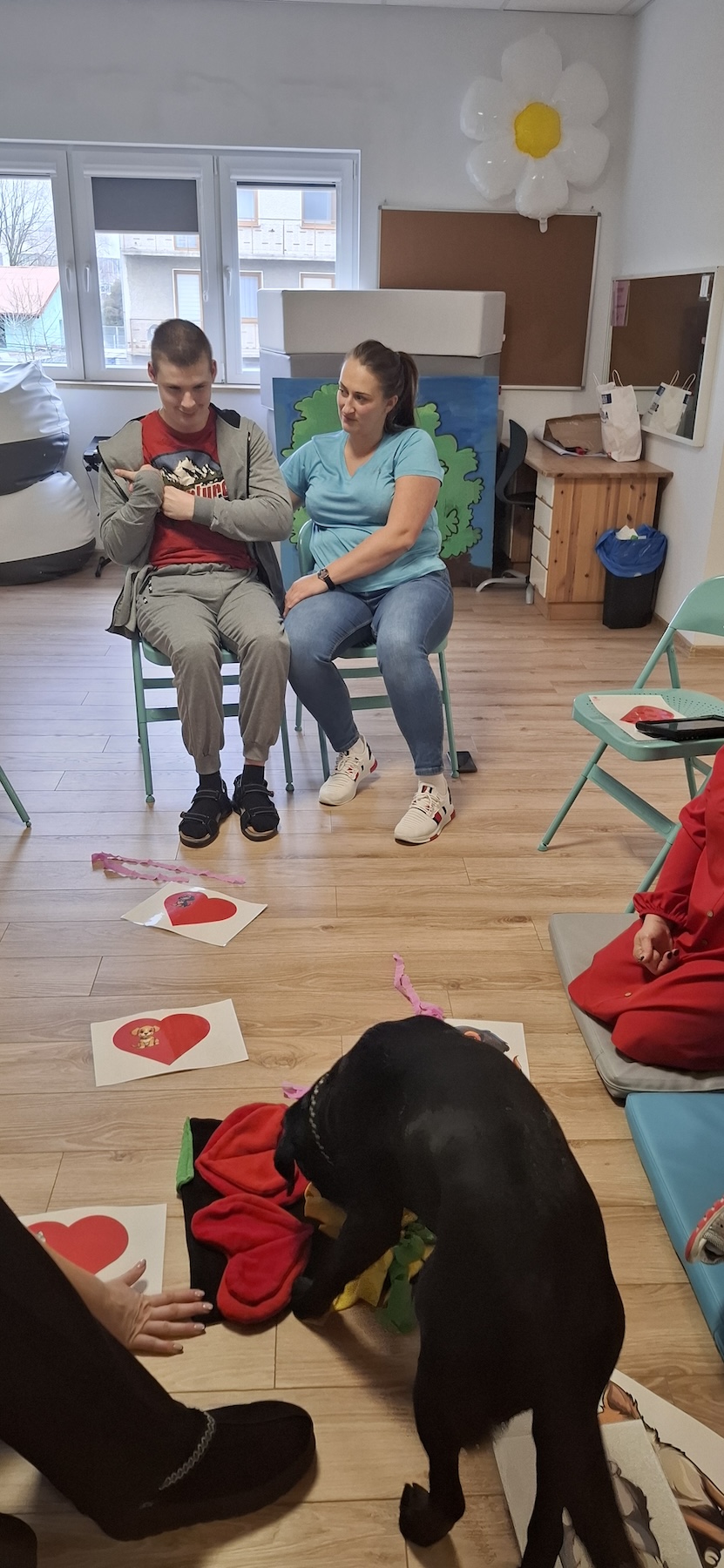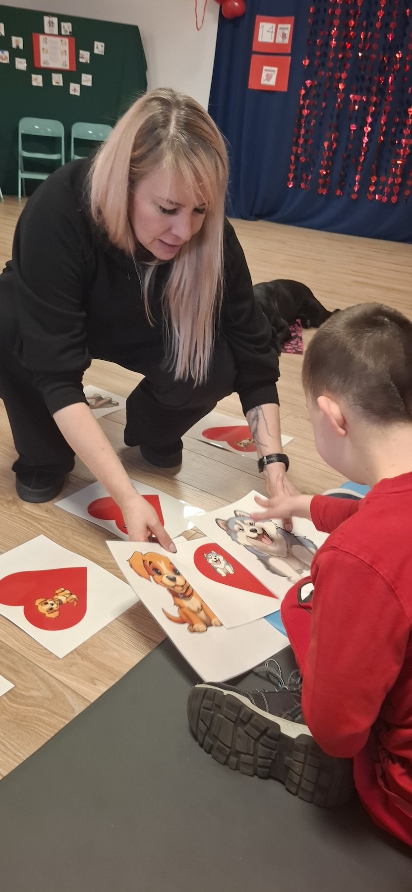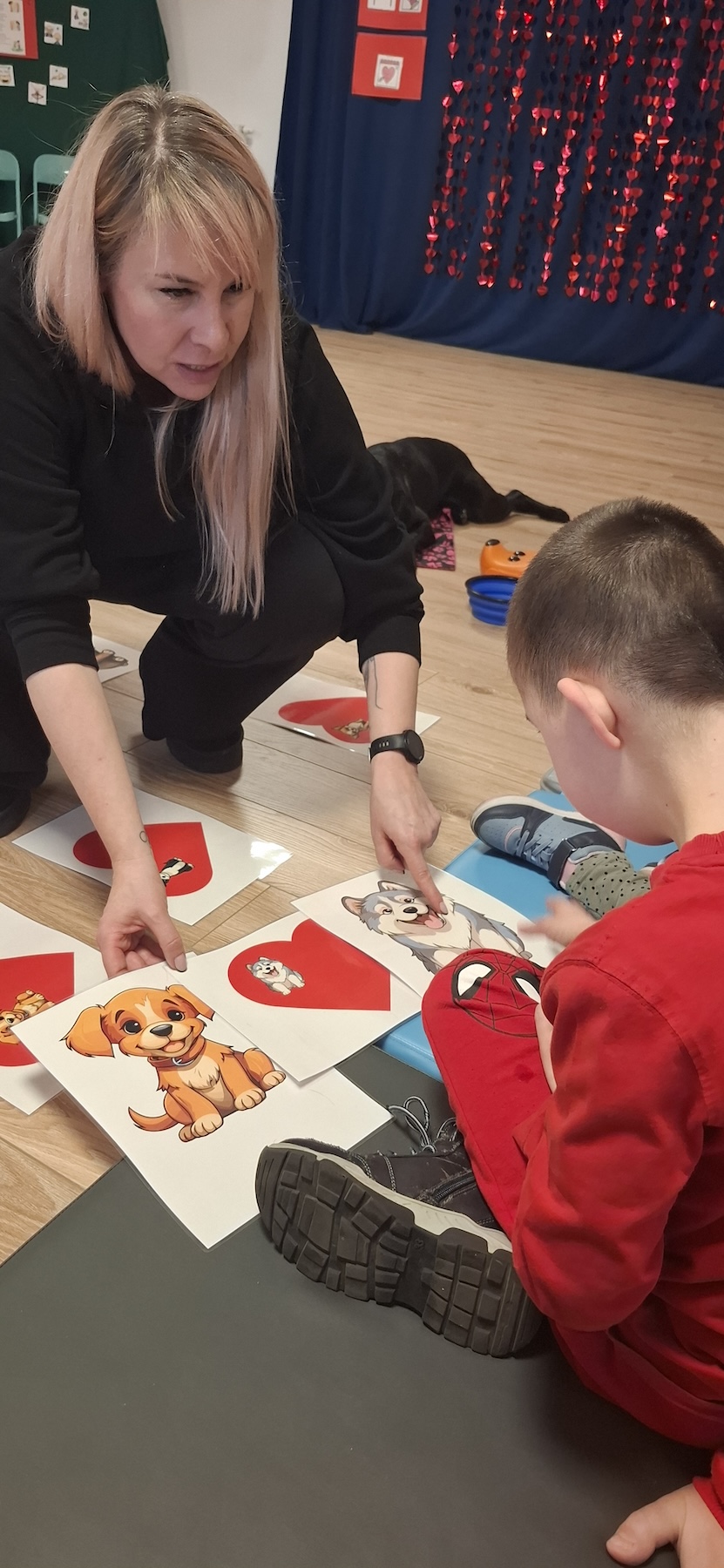 W naszej szkole cyklicznie organizowane są zajęcia z zakresu dogoterapii. Terapia z udziałem psa wykorzystuje jego obecność jako narzędzie wspierające rozwój uczniów. Kontakt z psem sprzyja poprawie samopoczucia, wzmacnia więzi społeczne, redukuje stres i lęk oraz motywuje do aktywności fizycznej. Zajęcia prowadzone są w małych grupach, co pozwala na indywidualne podejście do każdego uczestnika. Na ostatnich zajęciach Pani przygotowała plansze z serduszkami do wyklejania plasteliną, nawiązując do obchodów Walentynek 14 lutego. Następnie uczniowie dopasowywali rysunki większego pieska z mniejszym pieskiem w serduszku, co sprawiło im ogromną radość. Na zakończenie każdy uczeń, żegnając się z psem, podarował mu smakołyk, co było miłym akcentem na zakończenie zajęć.