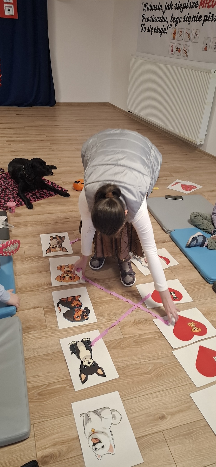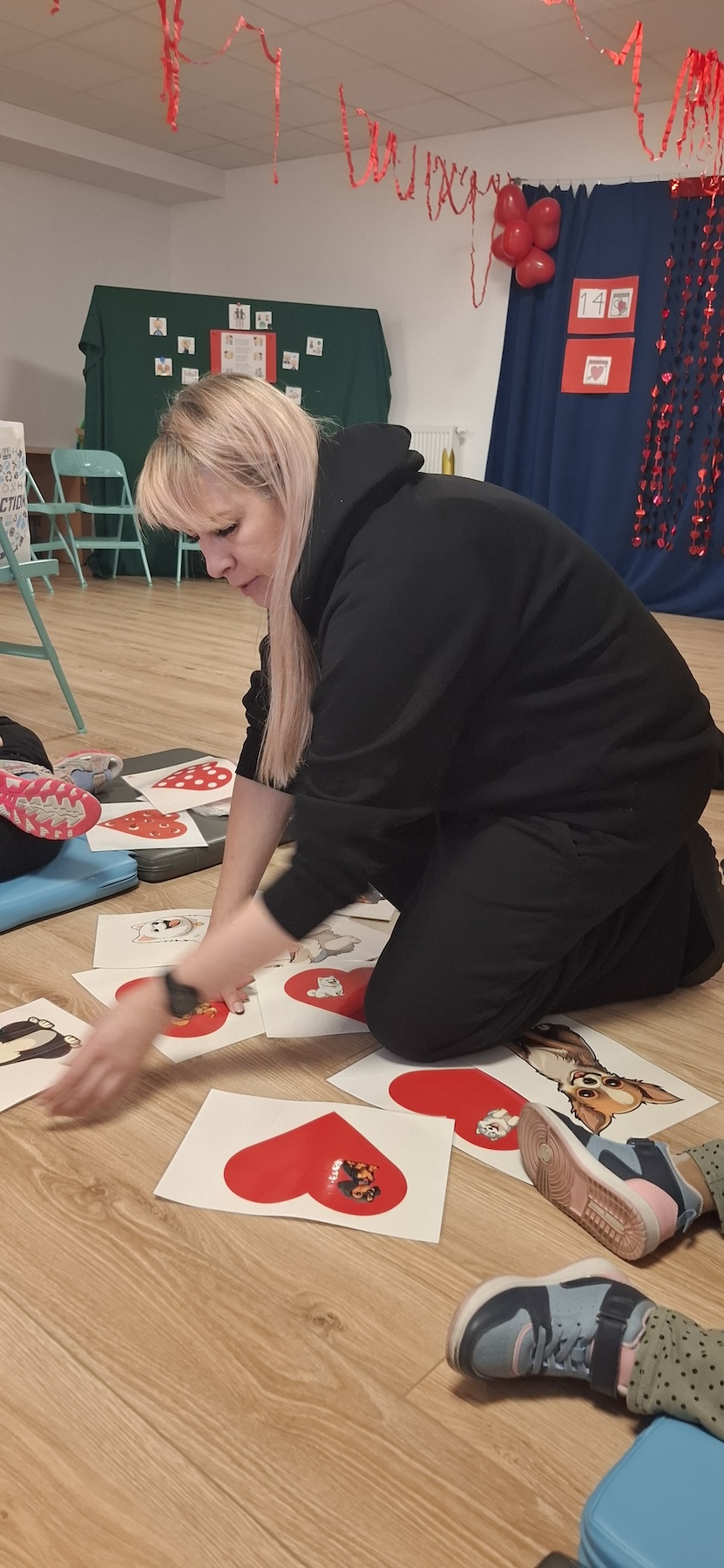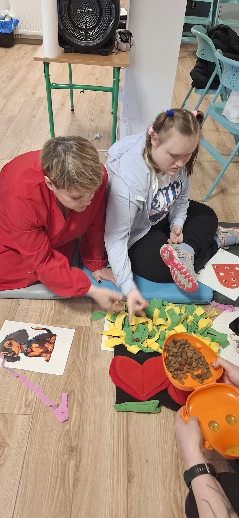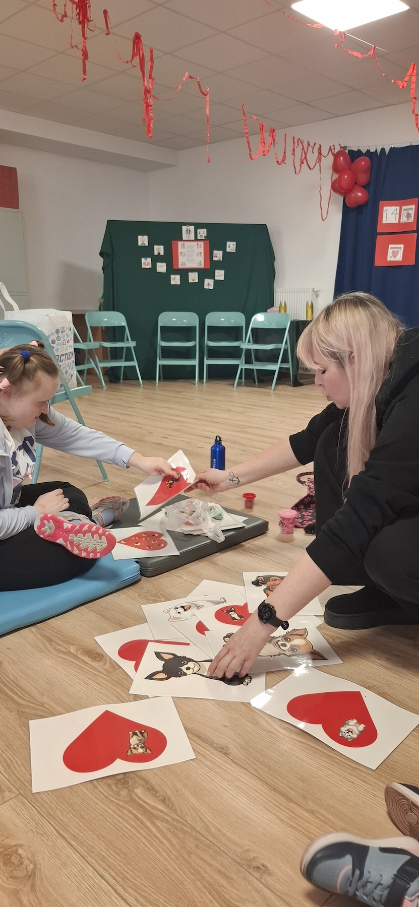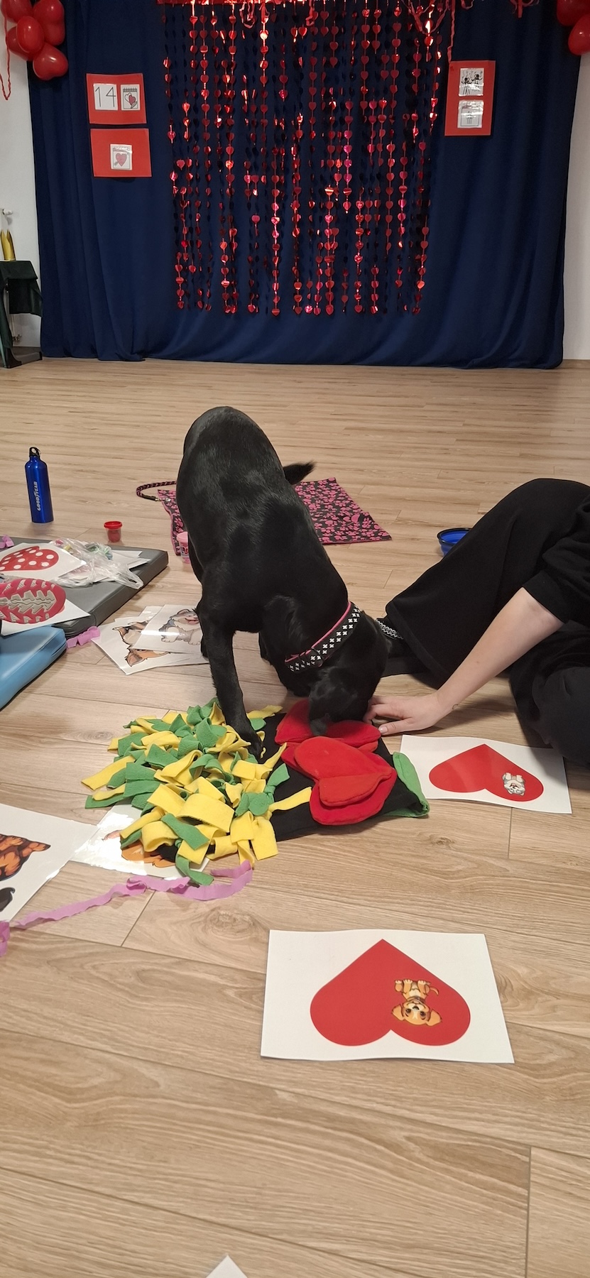 W naszej szkole cyklicznie organizowane są zajęcia z zakresu dogoterapii. Terapia z udziałem psa wykorzystuje jego obecność jako narzędzie wspierające rozwój uczniów. Kontakt z psem sprzyja poprawie samopoczucia, wzmacnia więzi społeczne, redukuje stres i lęk oraz motywuje do aktywności fizycznej. Zajęcia prowadzone są w małych grupach, co pozwala na indywidualne podejście do każdego uczestnika. Na ostatnich zajęciach Pani przygotowała plansze z serduszkami do wyklejania plasteliną, nawiązując do obchodów Walentynek 14 lutego. Następnie uczniowie dopasowywali rysunki większego pieska z mniejszym pieskiem w serduszku, co sprawiło im ogromną radość. Na zakończenie każdy uczeń, żegnając się z psem, podarował mu smakołyk, co było miłym akcentem na zakończenie zajęć.