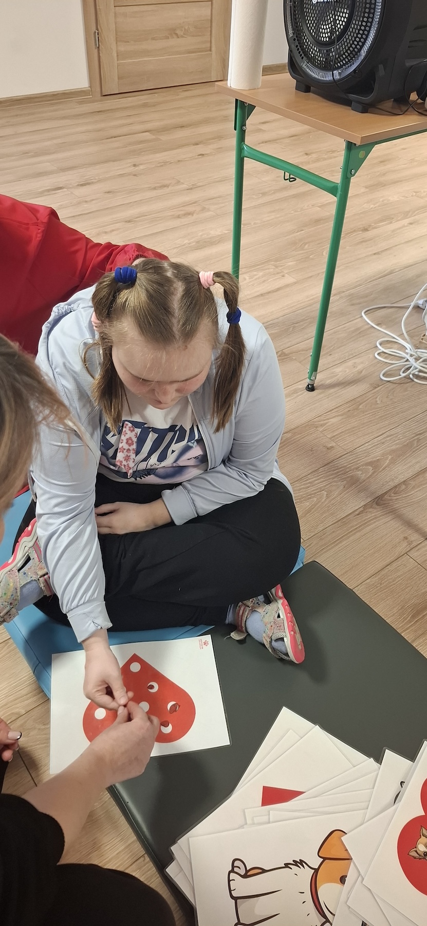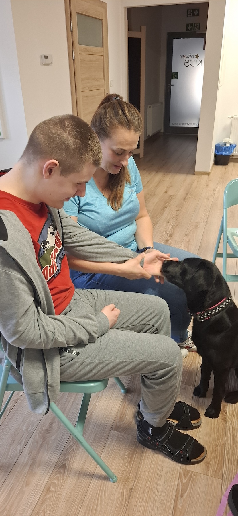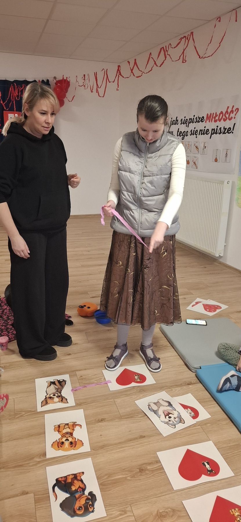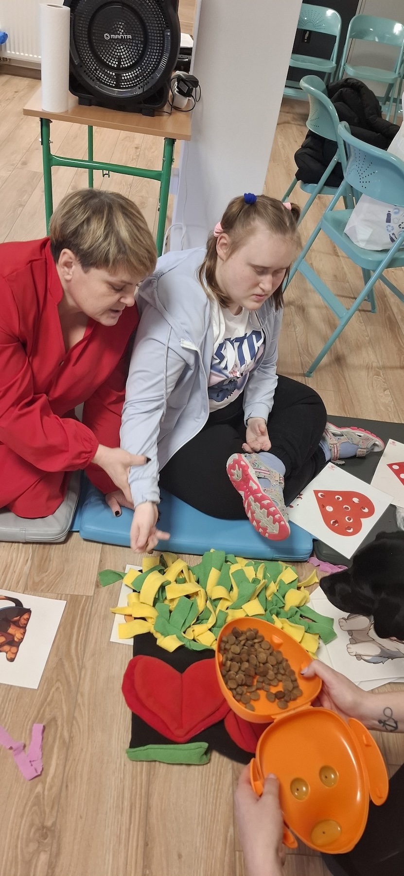 W naszej szkole cyklicznie organizowane są zajęcia z zakresu dogoterapii. Terapia z udziałem psa wykorzystuje jego obecność jako narzędzie wspierające rozwój uczniów. Kontakt z psem sprzyja poprawie samopoczucia, wzmacnia więzi społeczne, redukuje stres i lęk oraz motywuje do aktywności fizycznej. Zajęcia prowadzone są w małych grupach, co pozwala na indywidualne podejście do każdego uczestnika. Na ostatnich zajęciach Pani przygotowała plansze z serduszkami do wyklejania plasteliną, nawiązując do obchodów Walentynek 14 lutego. Następnie uczniowie dopasowywali rysunki większego pieska z mniejszym pieskiem w serduszku, co sprawiło im ogromną radość. Na zakończenie każdy uczeń, żegnając się z psem, podarował mu smakołyk, co było miłym akcentem na zakończenie zajęć.