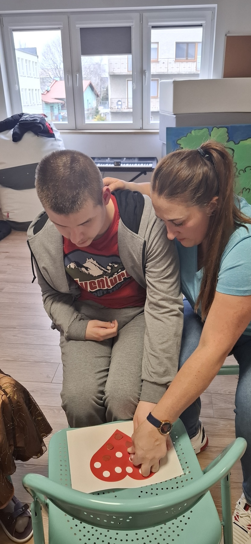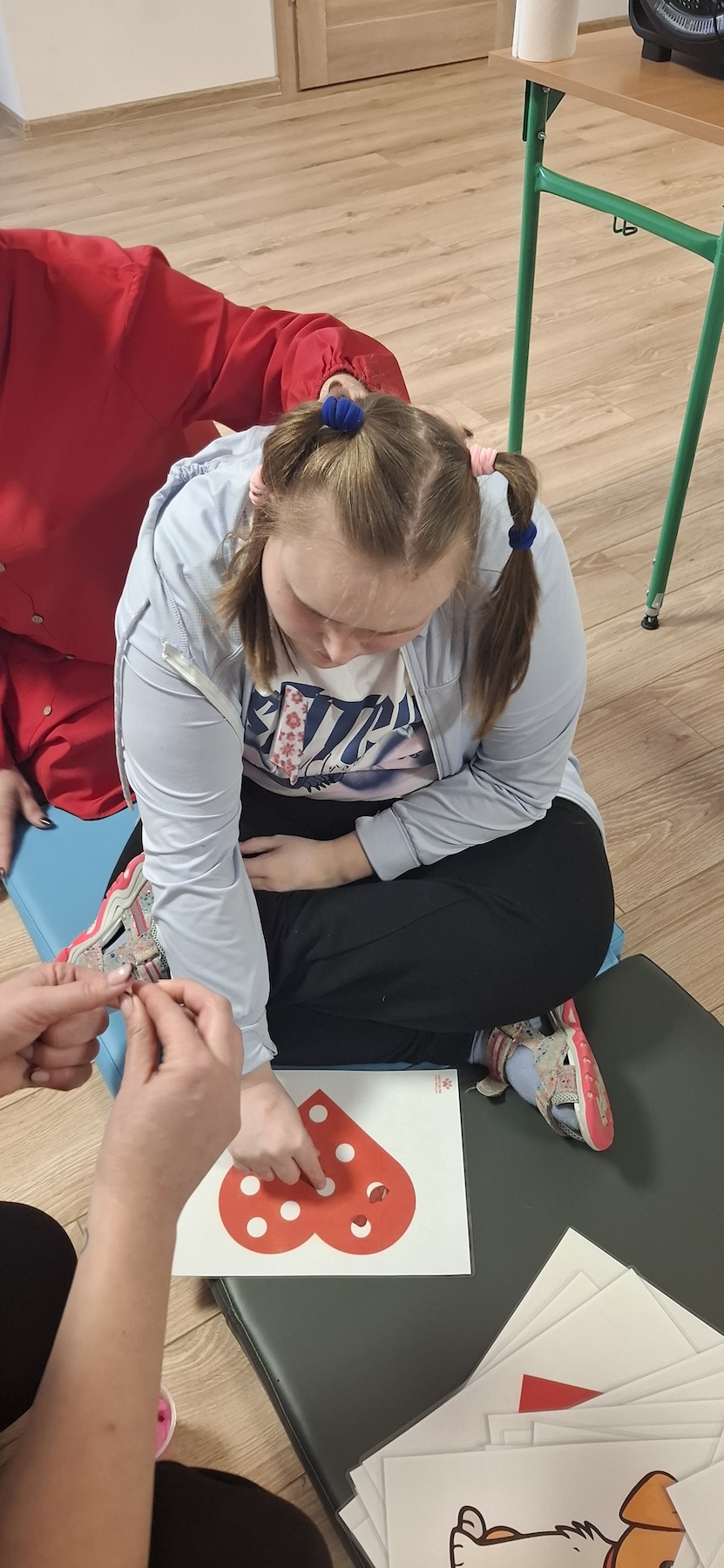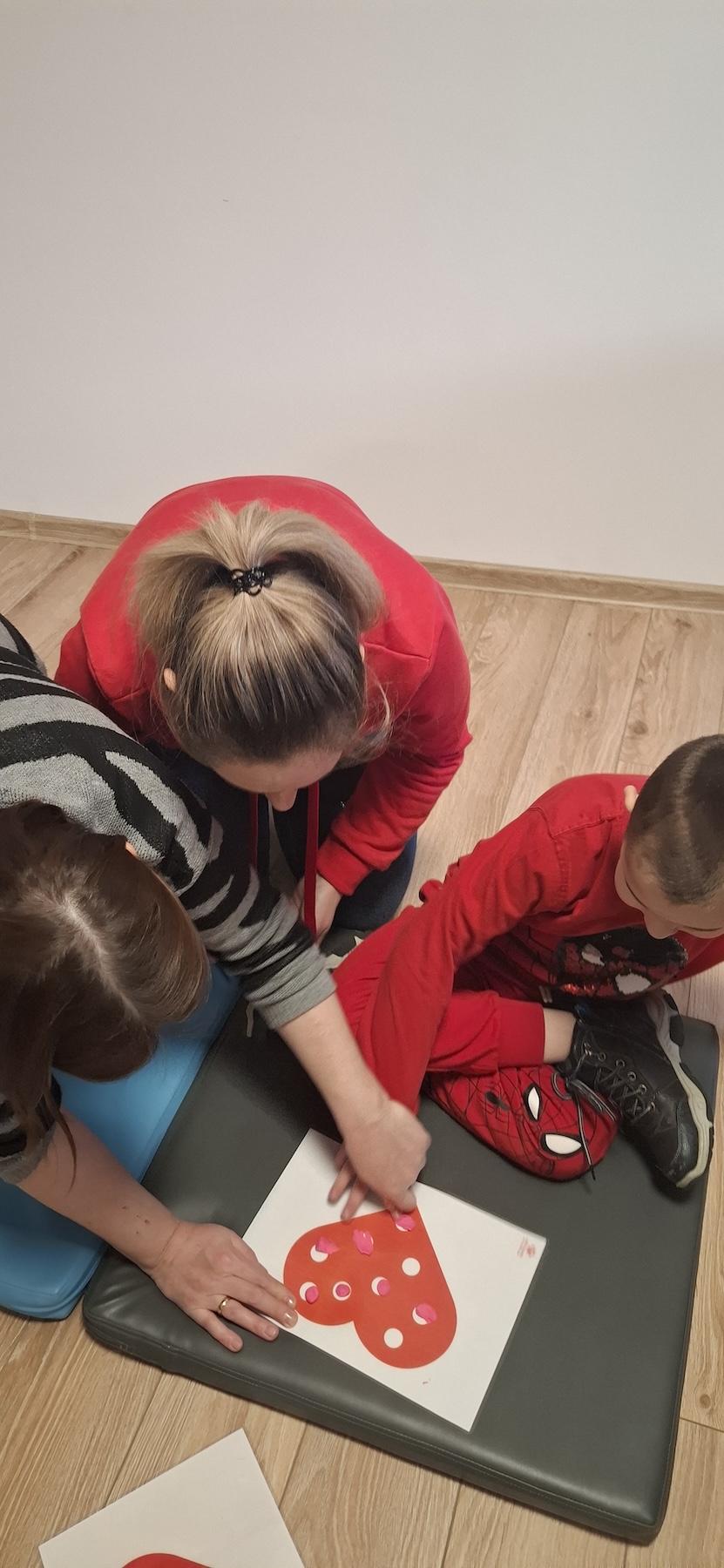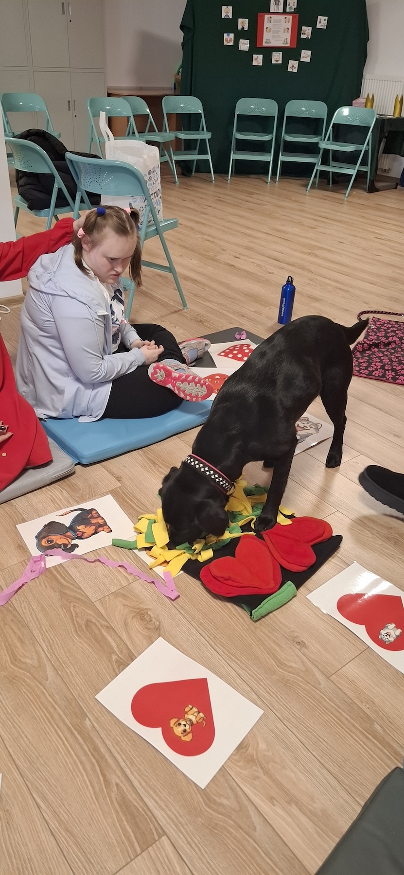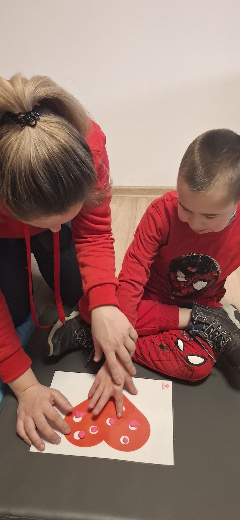 W naszej szkole cyklicznie organizowane są zajęcia z zakresu dogoterapii. Terapia z udziałem psa wykorzystuje jego obecność jako narzędzie wspierające rozwój uczniów. Kontakt z psem sprzyja poprawie samopoczucia, wzmacnia więzi społeczne, redukuje stres i lęk oraz motywuje do aktywności fizycznej. Zajęcia prowadzone są w małych grupach, co pozwala na indywidualne podejście do każdego uczestnika. Na ostatnich zajęciach Pani przygotowała plansze z serduszkami do wyklejania plasteliną, nawiązując do obchodów Walentynek 14 lutego. Następnie uczniowie dopasowywali rysunki większego pieska z mniejszym pieskiem w serduszku, co sprawiło im ogromną radość. Na zakończenie każdy uczeń, żegnając się z psem, podarował mu smakołyk, co było miłym akcentem na zakończenie zajęć.