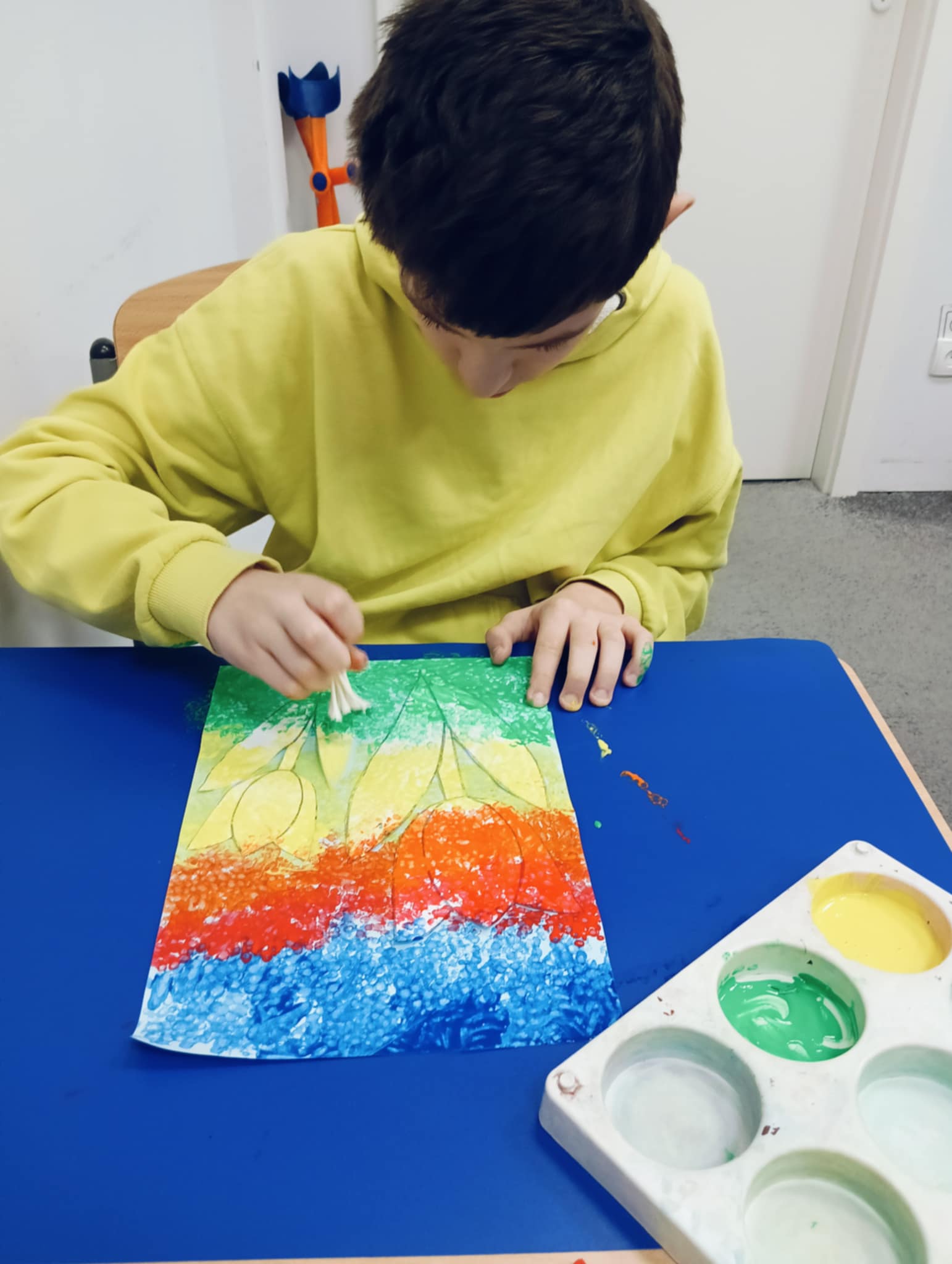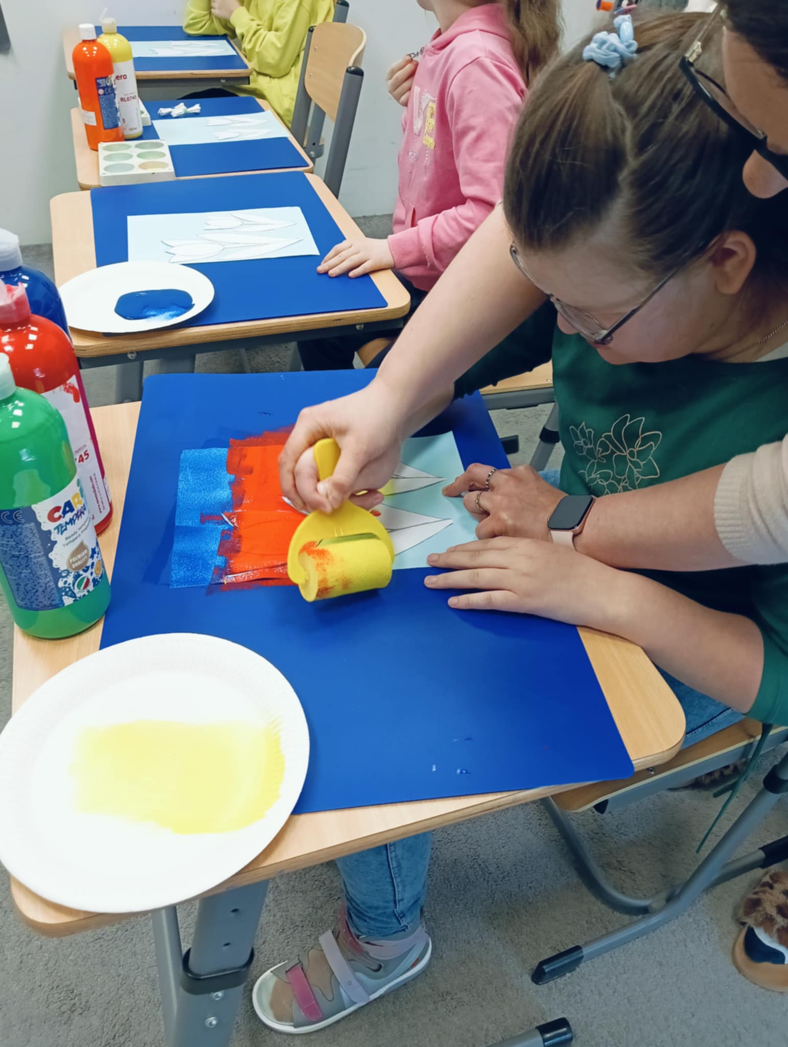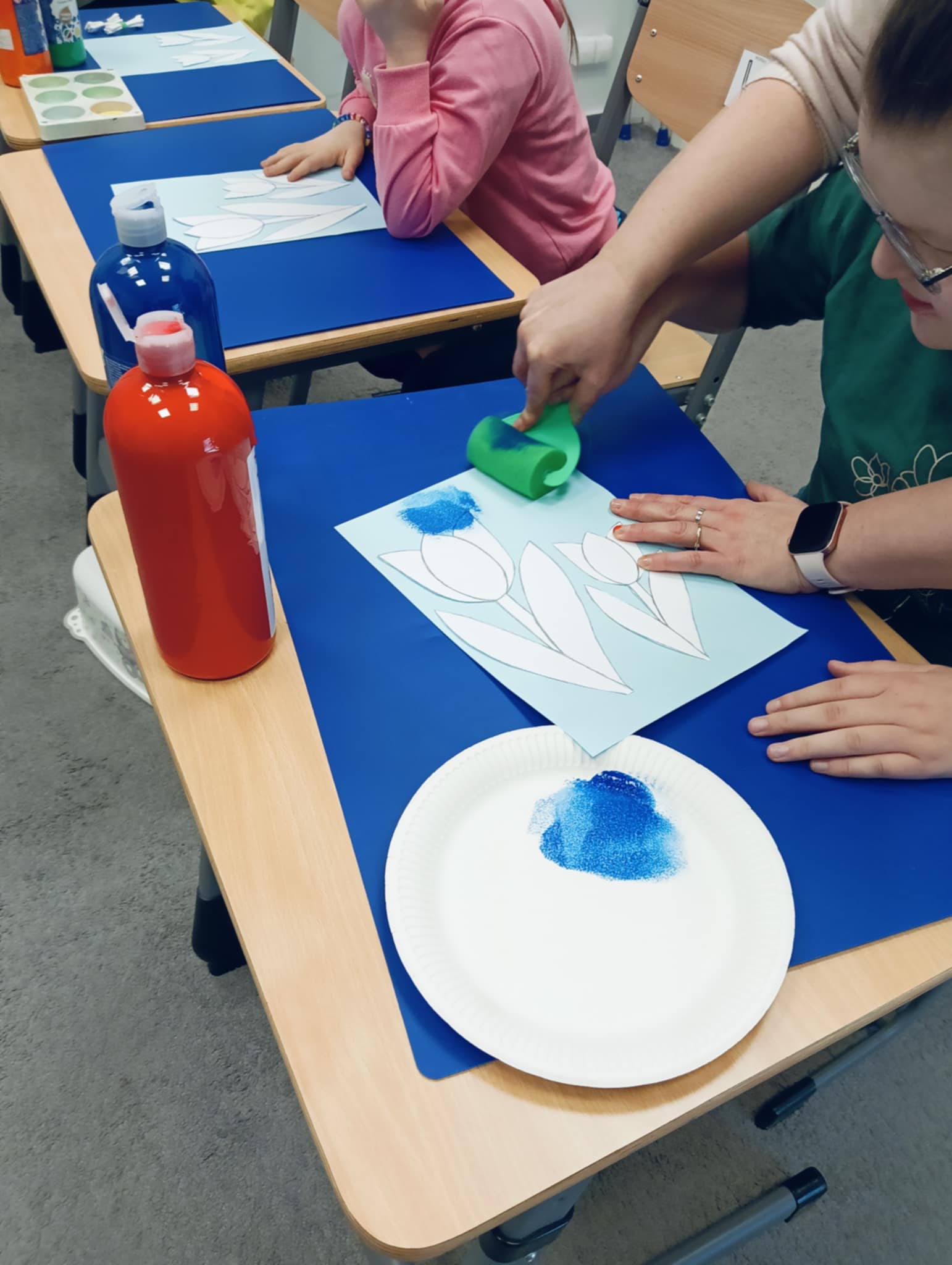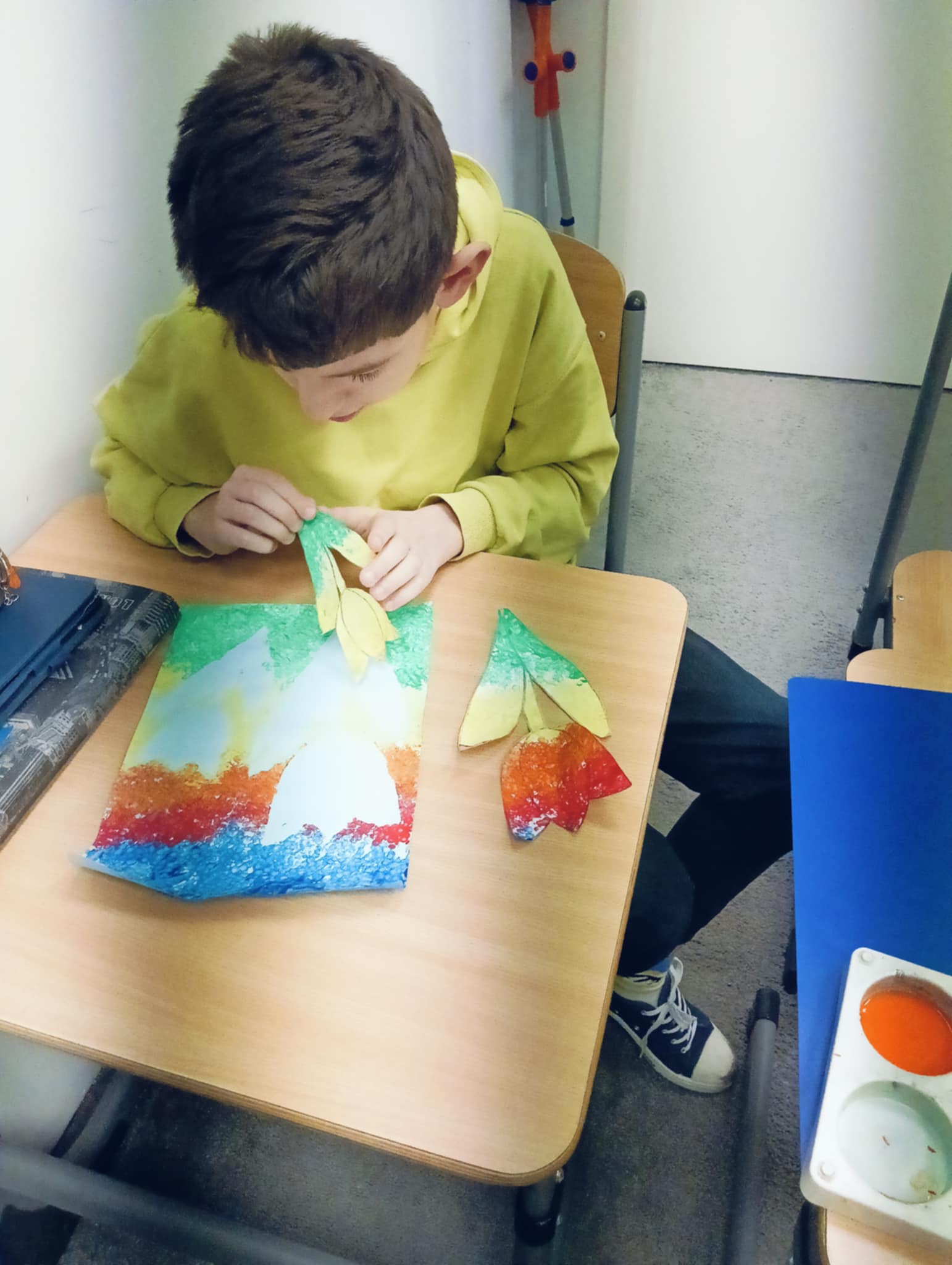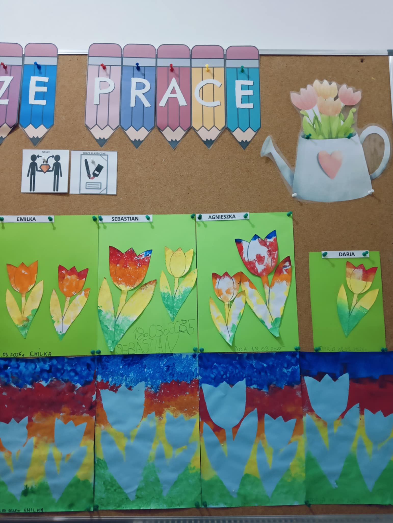 Wiosna zbliża się wielkimi krokami, dlatego w ramach realizacji tematu tygodnia: „Wiosna – nowa pora roku” uczniowie z oddziału „I” wykonali pracę plastyczną pt. „Kolorowe tulipany”. Praca została stworzona przy użyciu farb i różnych technik, takich jak: wałek, patyczki higieniczne oraz gąbeczka. Podczas zajęć dzieci miały okazję rozwijać swoją kreatywność i sprawność manualną. Praca z różnorodnymi materiałami sprawiła im wiele radości, a efekty ich twórczości ozdobiły szkolne korytarze, wprowadzając prawdziwie wiosenny nastrój. Uczniowie z dużym zaangażowaniem opowiadali o swoich dziełach i chętnie dzielili się wrażeniami, co dodatkowo wzbogaciło rozmowę na temat oznak nadchodzącej wiosny.