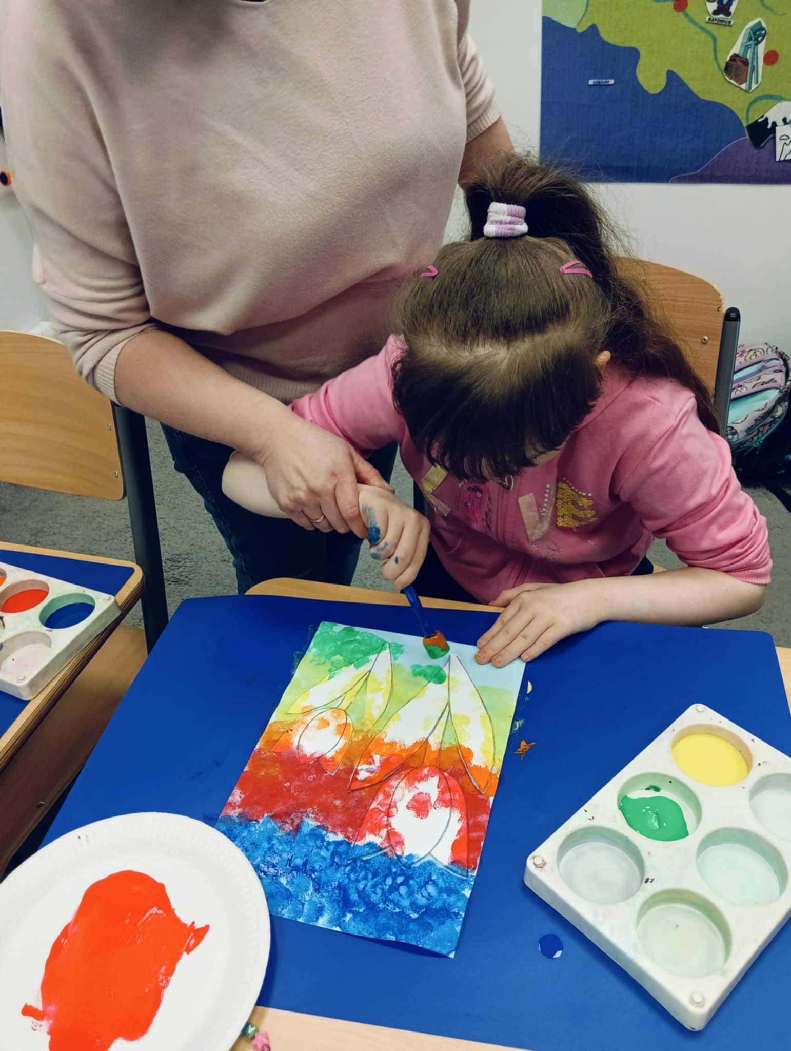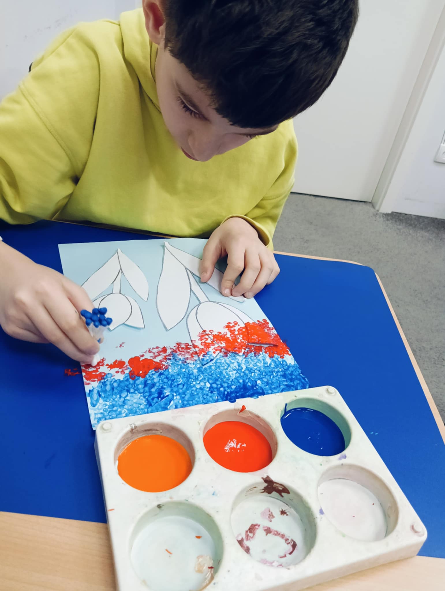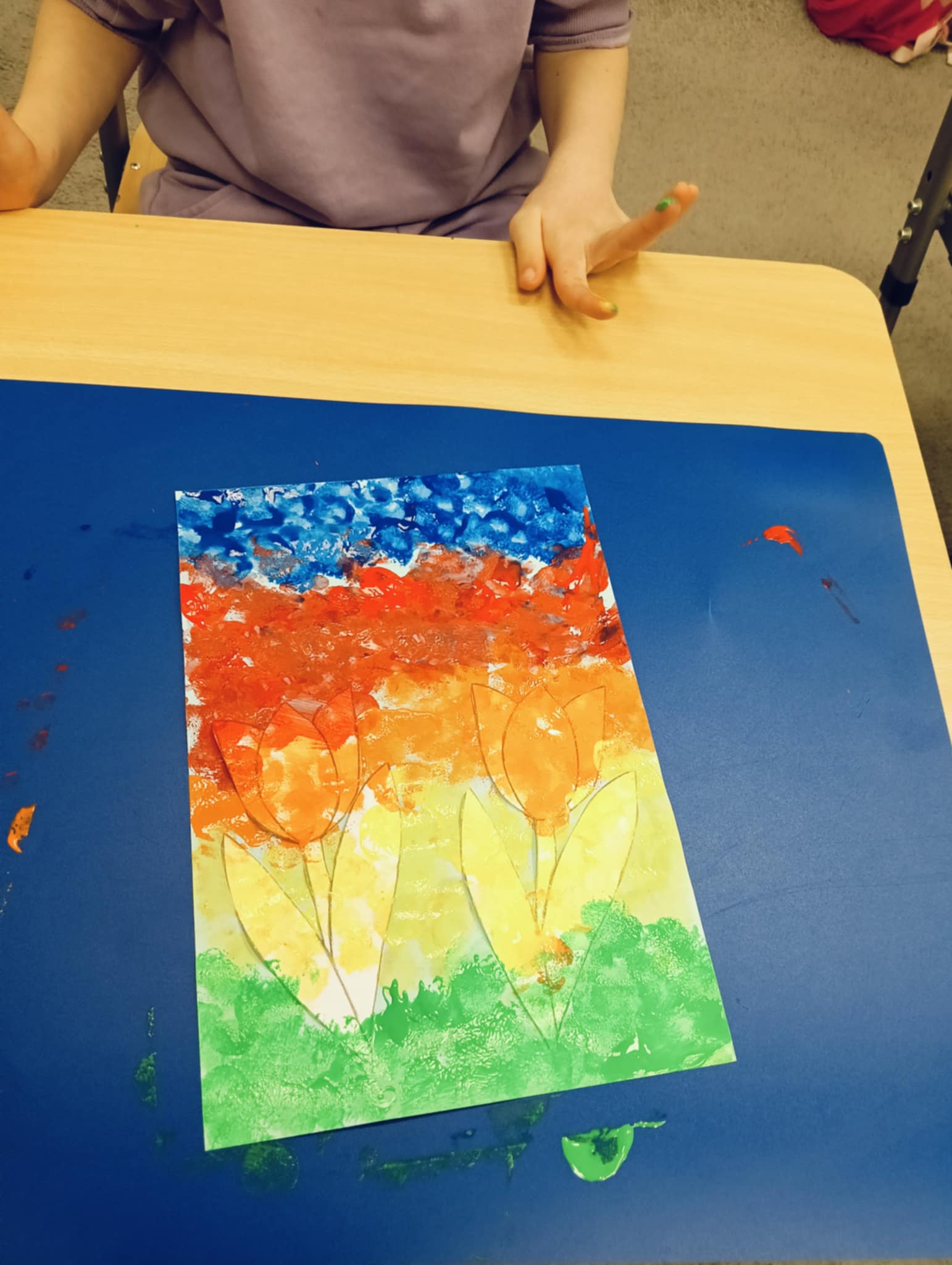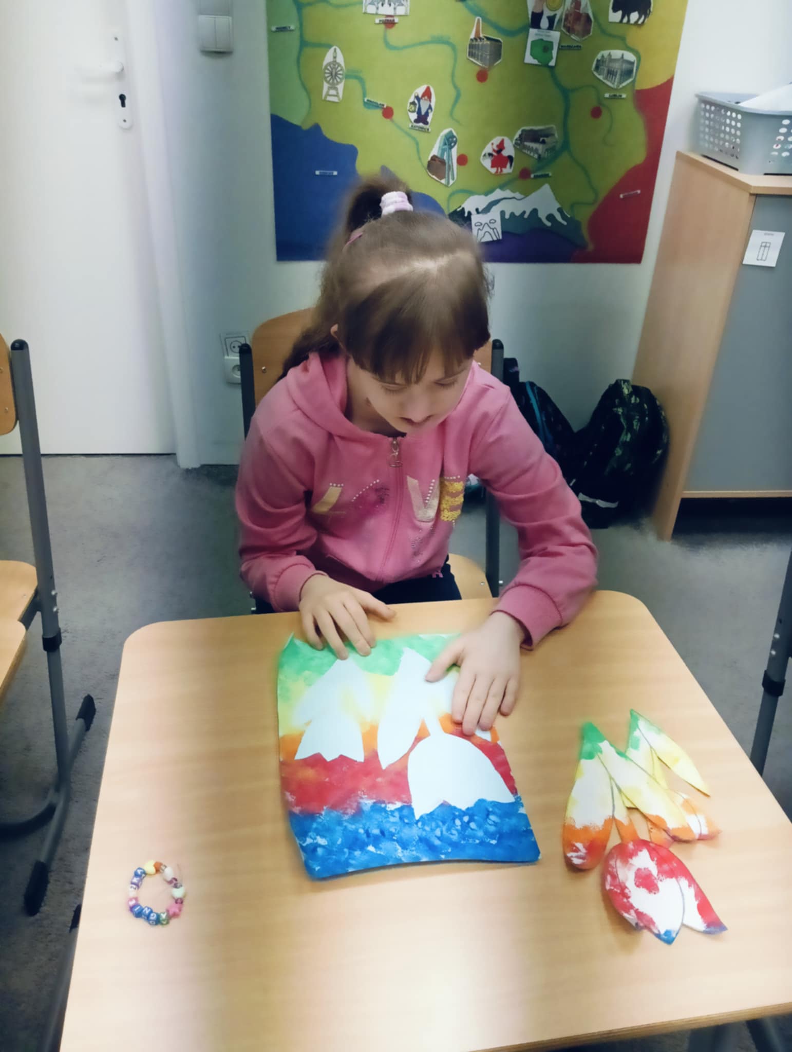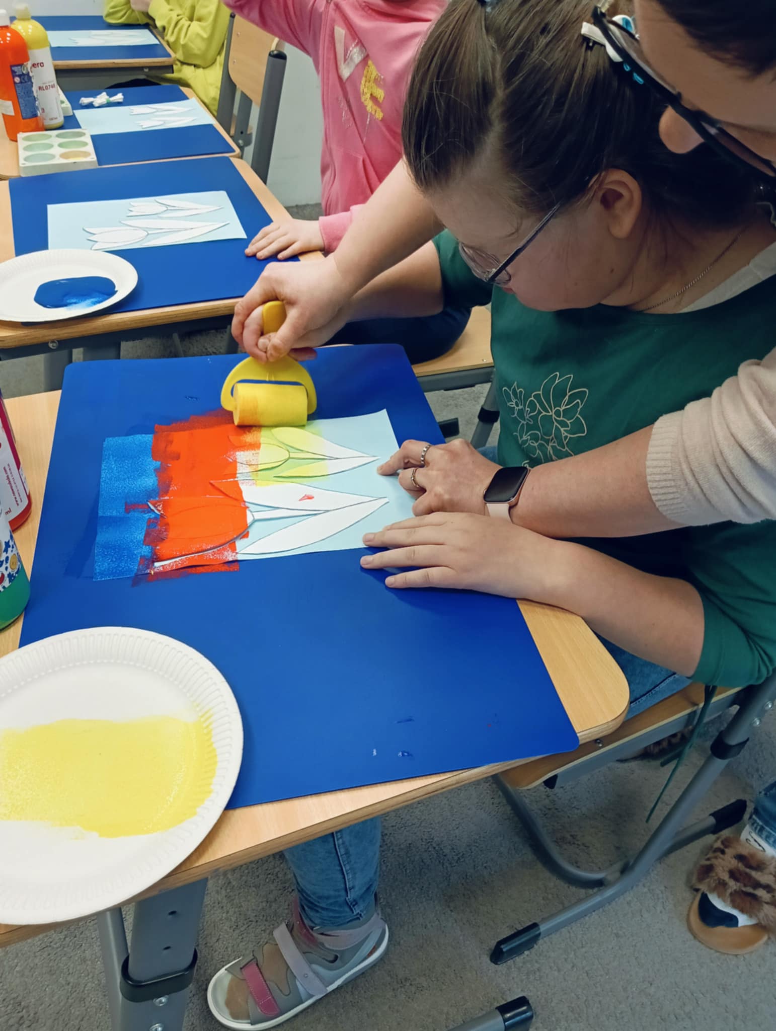 Wiosna zbliża się wielkimi krokami, dlatego w ramach realizacji tematu tygodnia: „Wiosna – nowa pora roku” uczniowie z oddziału „I” wykonali pracę plastyczną pt. „Kolorowe tulipany”. Praca została stworzona przy użyciu farb i różnych technik, takich jak: wałek, patyczki higieniczne oraz gąbeczka. Podczas zajęć dzieci miały okazję rozwijać swoją kreatywność i sprawność manualną. Praca z różnorodnymi materiałami sprawiła im wiele radości, a efekty ich twórczości ozdobiły szkolne korytarze, wprowadzając prawdziwie wiosenny nastrój. Uczniowie z dużym zaangażowaniem opowiadali o swoich dziełach i chętnie dzielili się wrażeniami, co dodatkowo wzbogaciło rozmowę na temat oznak nadchodzącej wiosny.