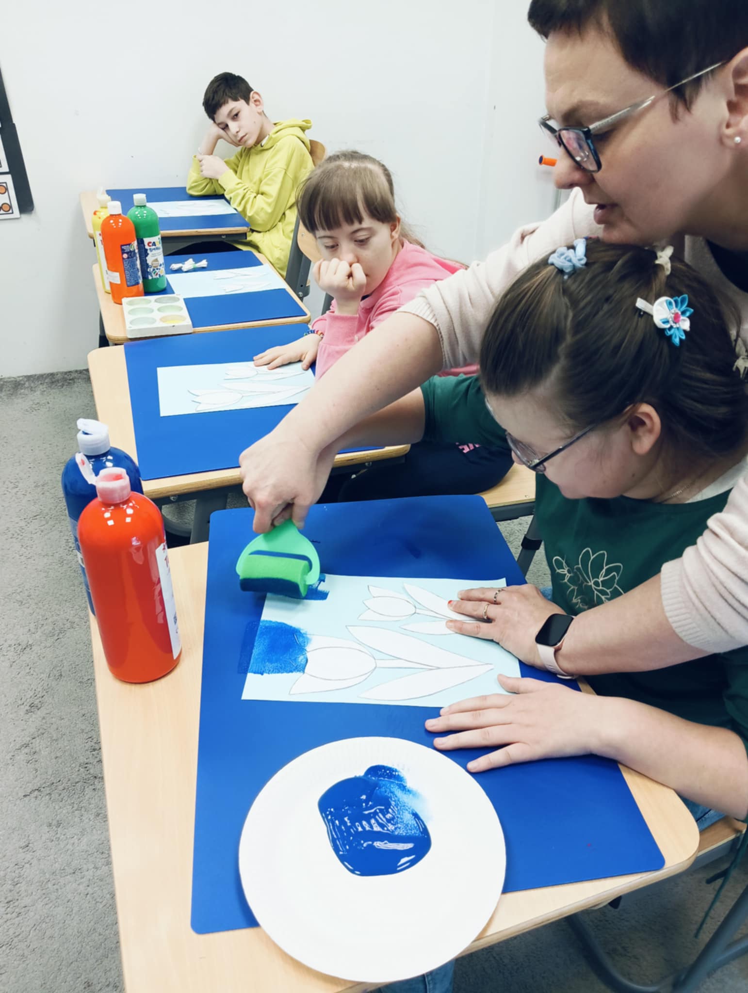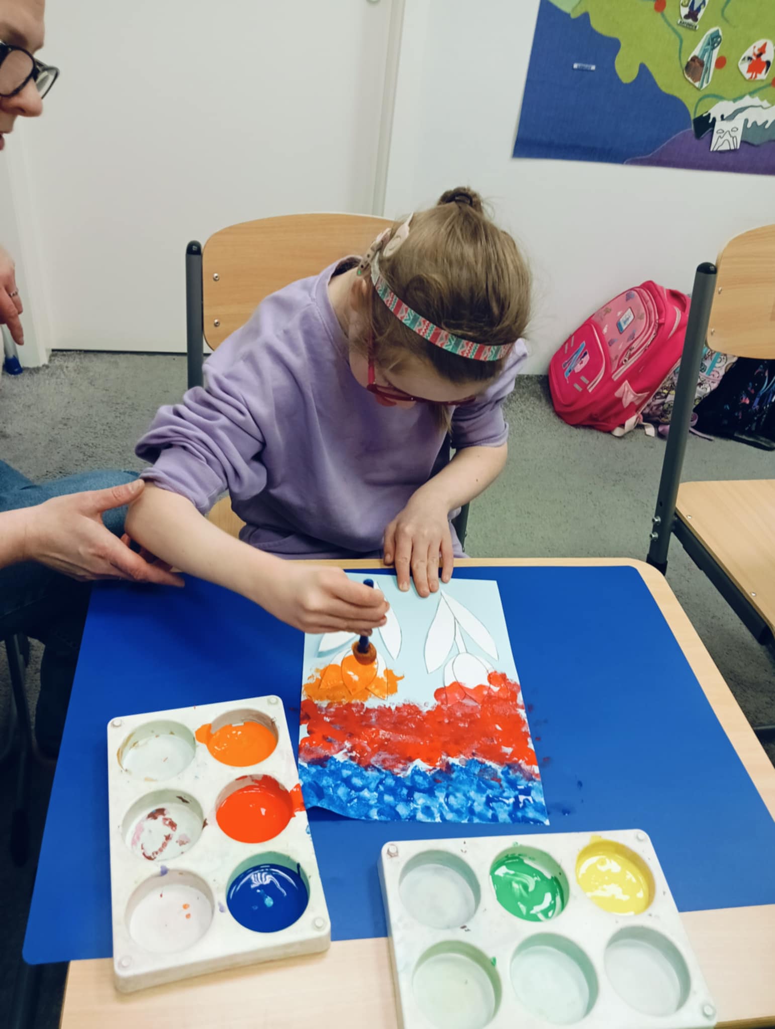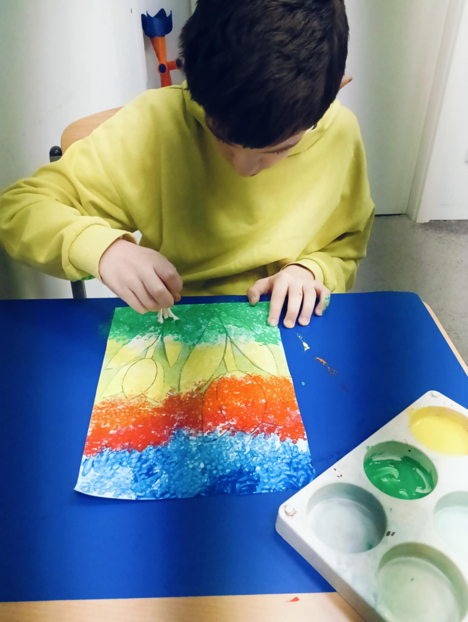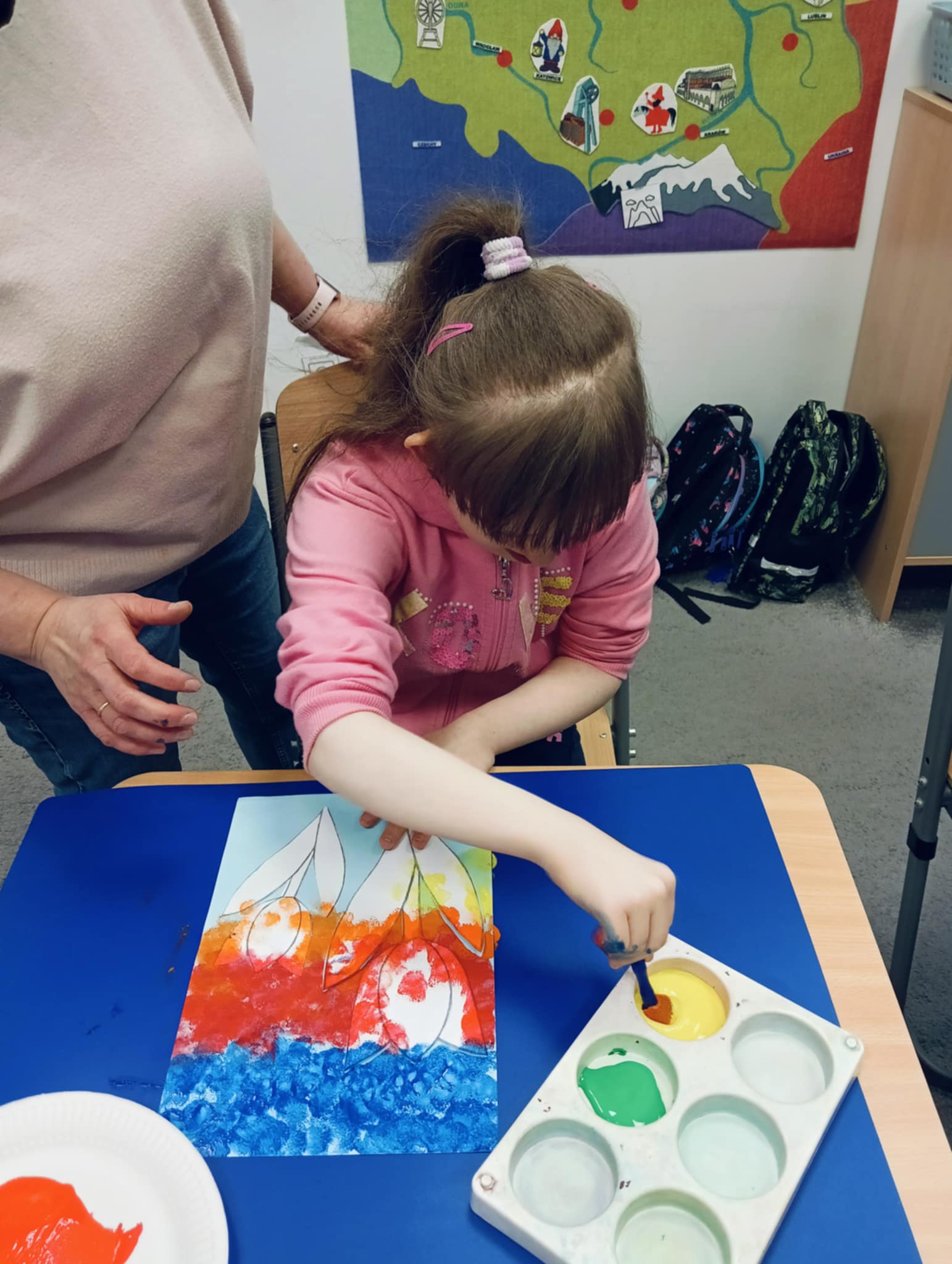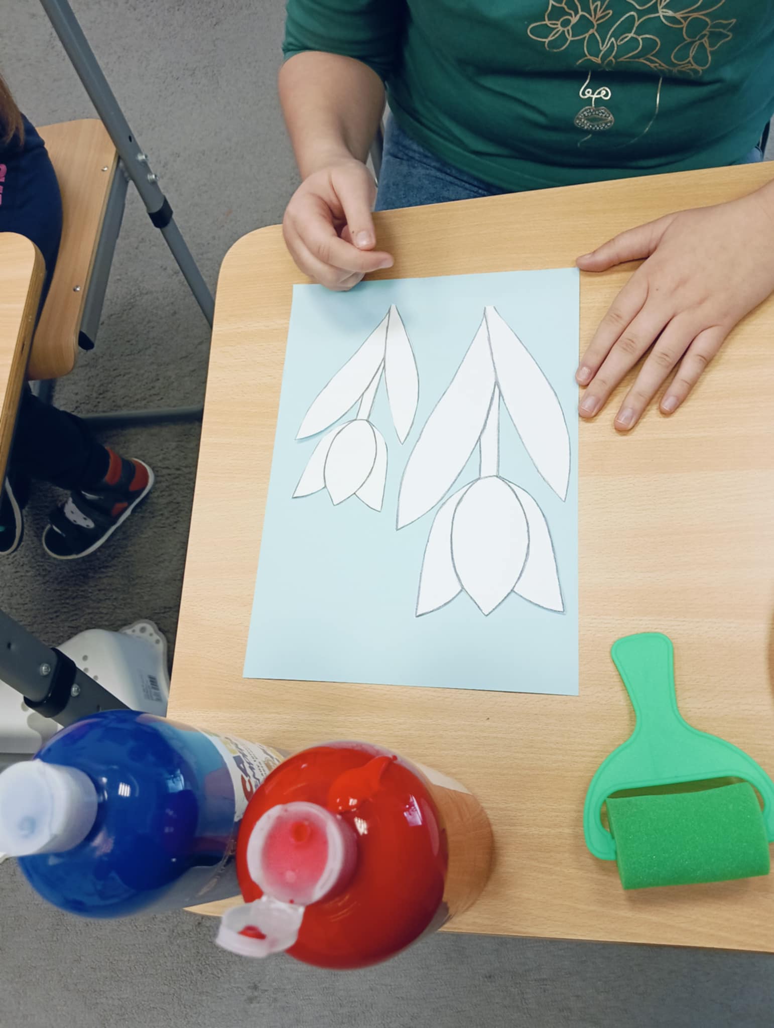 Wiosna zbliża się wielkimi krokami, dlatego w ramach realizacji tematu tygodnia: „Wiosna – nowa pora roku” uczniowie z oddziału „I” wykonali pracę plastyczną pt. „Kolorowe tulipany”. Praca została stworzona przy użyciu farb i różnych technik, takich jak: wałek, patyczki higieniczne oraz gąbeczka. Podczas zajęć dzieci miały okazję rozwijać swoją kreatywność i sprawność manualną. Praca z różnorodnymi materiałami sprawiła im wiele radości, a efekty ich twórczości ozdobiły szkolne korytarze, wprowadzając prawdziwie wiosenny nastrój. Uczniowie z dużym zaangażowaniem opowiadali o swoich dziełach i chętnie dzielili się wrażeniami, co dodatkowo wzbogaciło rozmowę na temat oznak nadchodzącej wiosny.