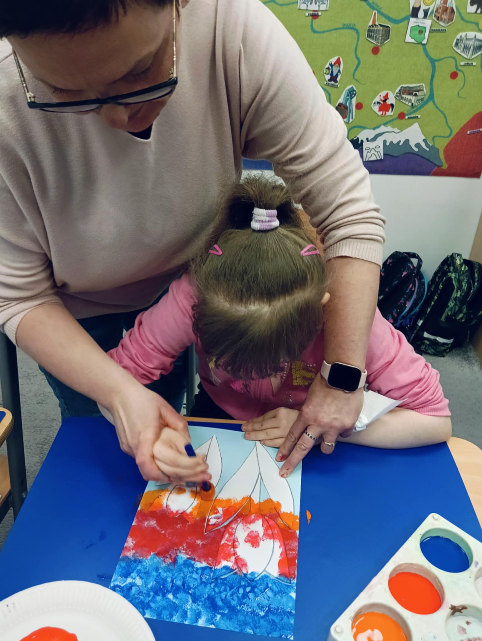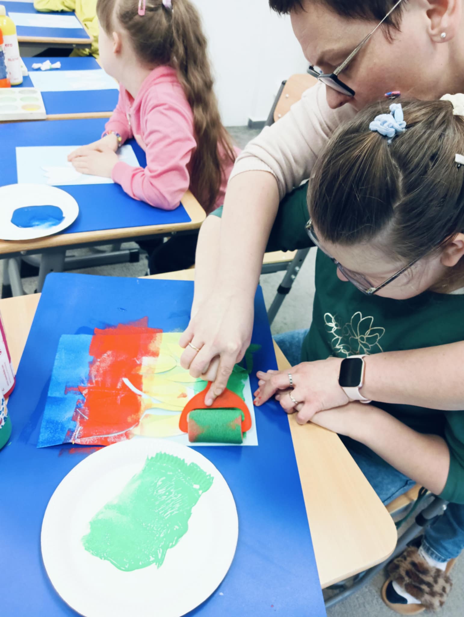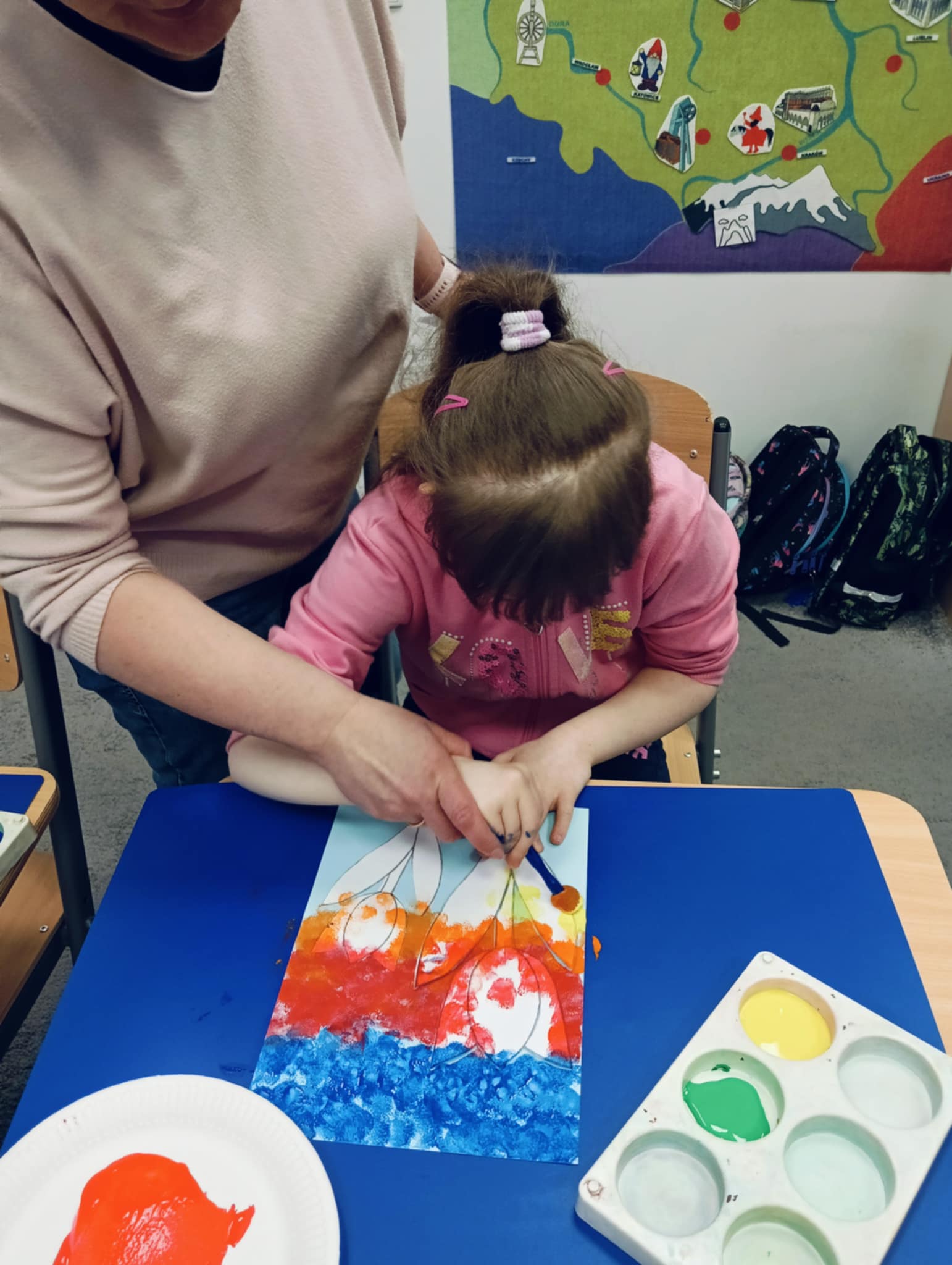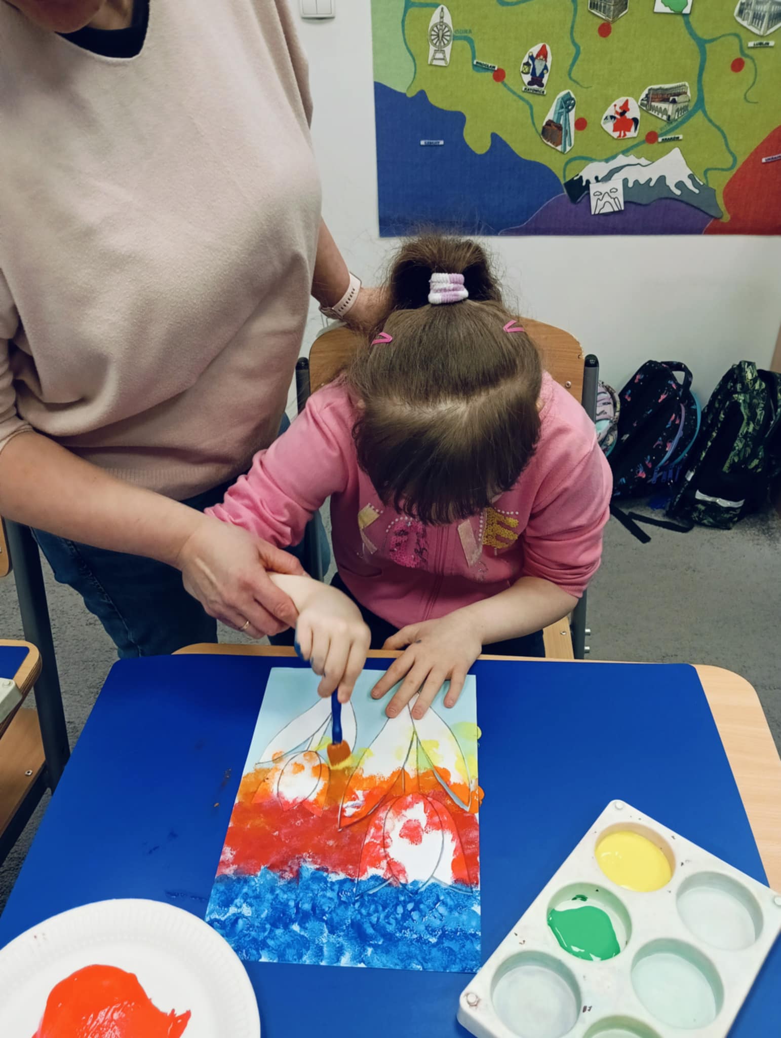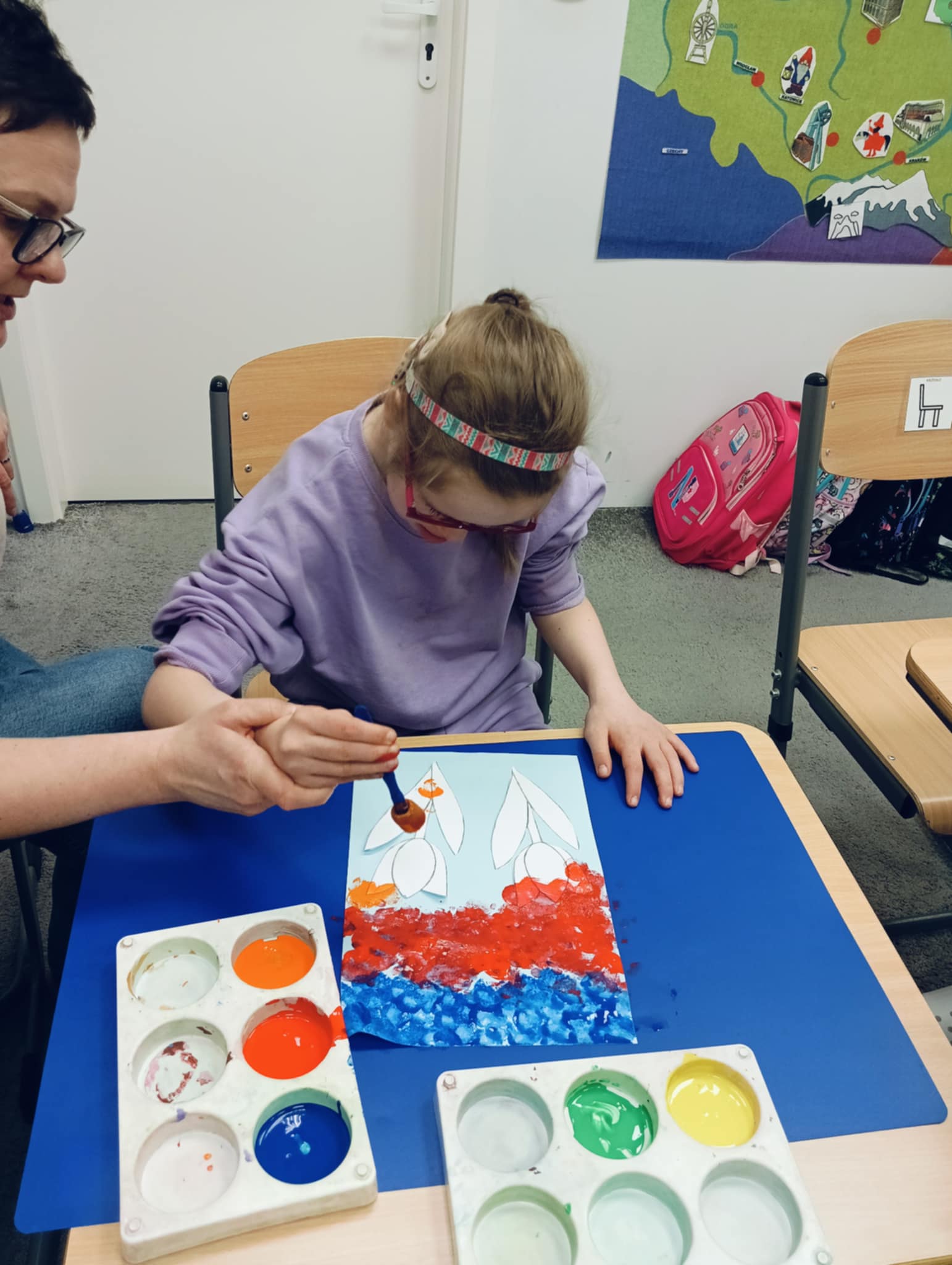 Wiosna zbliża się wielkimi krokami, dlatego w ramach realizacji tematu tygodnia: „Wiosna – nowa pora roku” uczniowie z oddziału „I” wykonali pracę plastyczną pt. „Kolorowe tulipany”. Praca została stworzona przy użyciu farb i różnych technik, takich jak: wałek, patyczki higieniczne oraz gąbeczka. Podczas zajęć dzieci miały okazję rozwijać swoją kreatywność i sprawność manualną. Praca z różnorodnymi materiałami sprawiła im wiele radości, a efekty ich twórczości ozdobiły szkolne korytarze, wprowadzając prawdziwie wiosenny nastrój. Uczniowie z dużym zaangażowaniem opowiadali o swoich dziełach i chętnie dzielili się wrażeniami, co dodatkowo wzbogaciło rozmowę na temat oznak nadchodzącej wiosny.