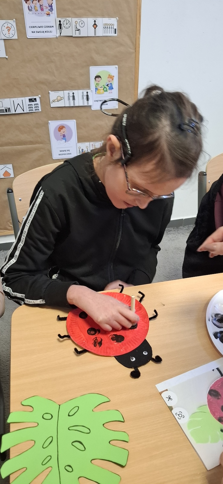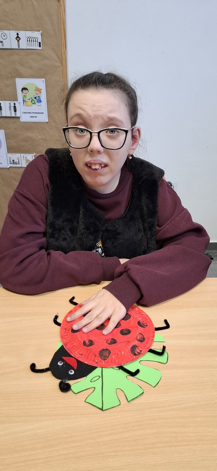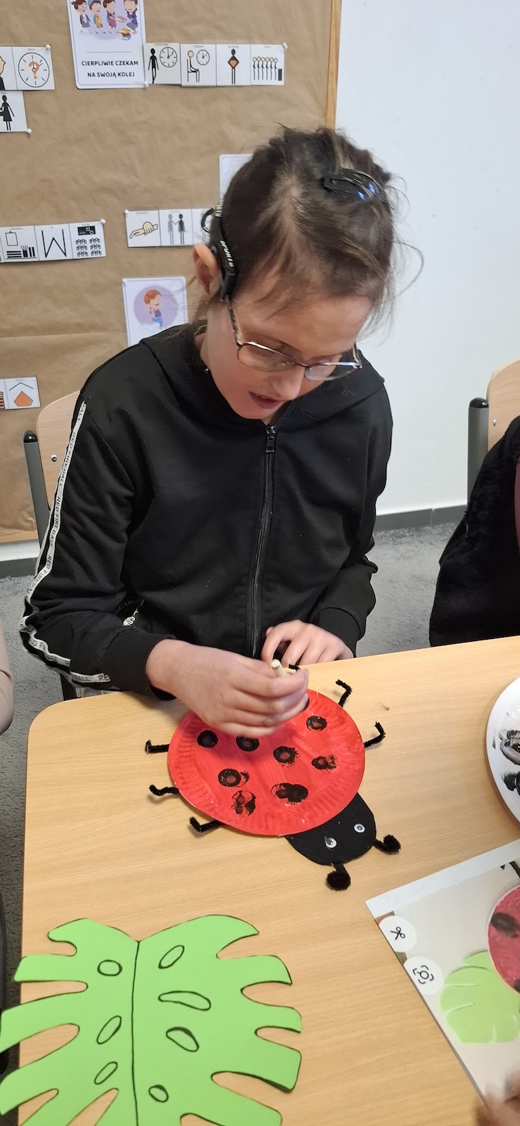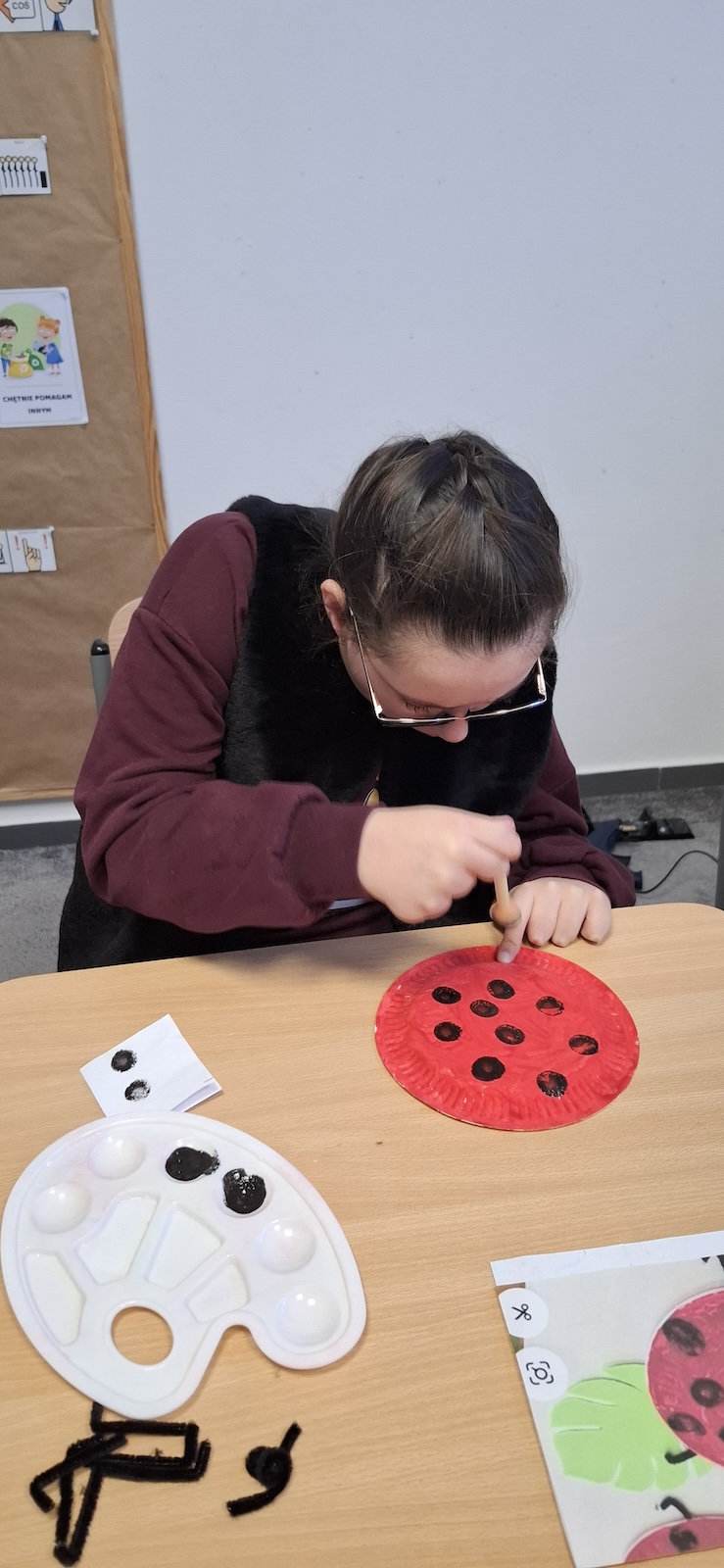 W naszej szkole nie brakuje kreatywnych pomysłów na zajęcia plastyczne. Tym razem uczniowie oddziału „II” wykonali urocze prace pt. „Biedronka na listku” - wykorzystując papier kolorowy, stempelek , farby, talerzyki papierowe , klej i dużo wyobraźni. Dzieci z wielkim zaangażowaniem tworzyły swoje biedronki – każda inna, wyjątkowa i niepowtarzalna. Z talerzyków papierowych wymalowanych na czerwono farbami powstał tułów, czarne kropki - powstały za pomocą stempli moczonych w czarnej farbie, a zielone listki stanowiły idealne tło dla tych wiosennych owadów. Zajęcia były nie tylko świetną zabawą, ale również doskonałą okazją do rozwijania sprawności manualnej i cierpliwości. Gotowe prace ozdobiły nasze szkolne korytarze i wniosły do szkoły dużo koloru oraz wiosennego nastroju.