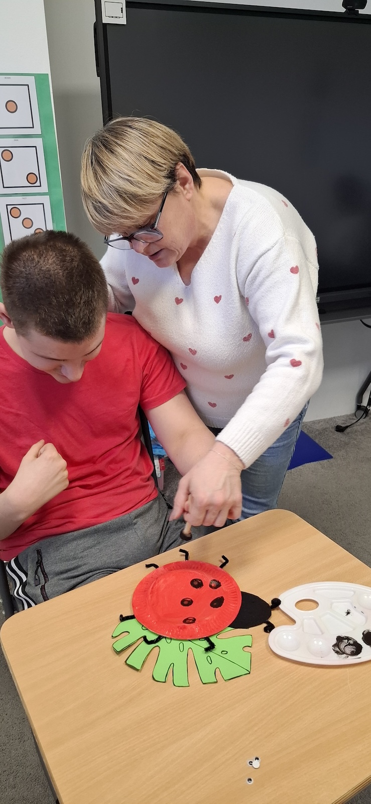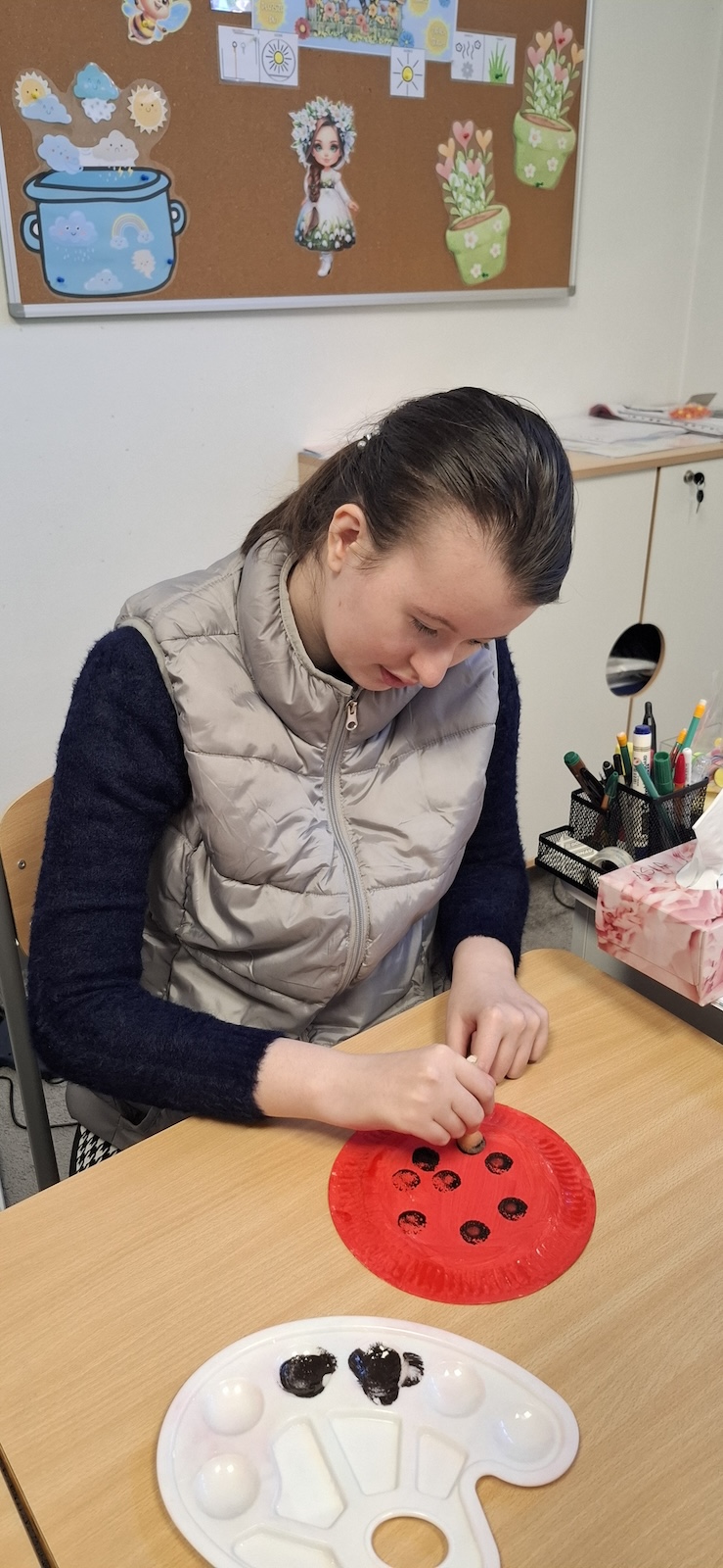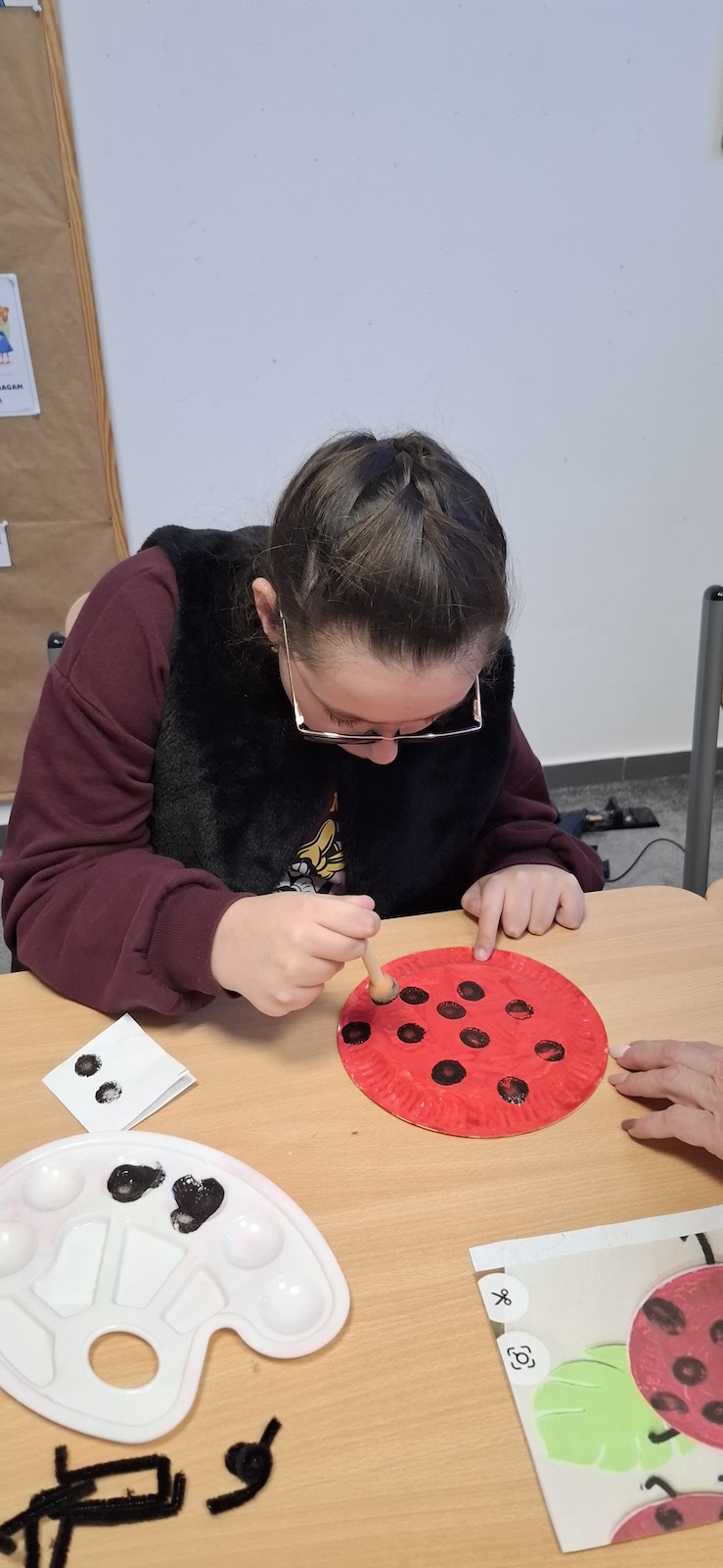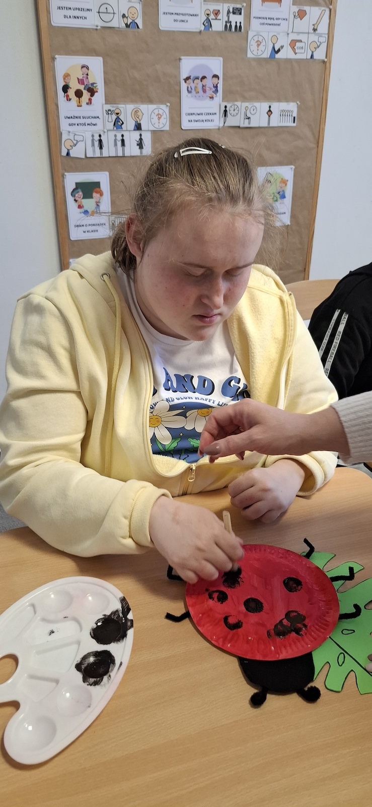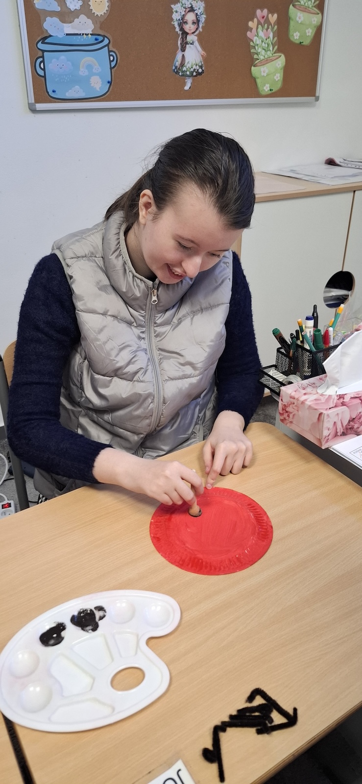 W naszej szkole nie brakuje kreatywnych pomysłów na zajęcia plastyczne. Tym razem uczniowie oddziału „II” wykonali urocze prace pt. „Biedronka na listku” - wykorzystując papier kolorowy, stempelek , farby, talerzyki papierowe , klej i dużo wyobraźni. Dzieci z wielkim zaangażowaniem tworzyły swoje biedronki – każda inna, wyjątkowa i niepowtarzalna. Z talerzyków papierowych wymalowanych na czerwono farbami powstał tułów, czarne kropki - powstały za pomocą stempli moczonych w czarnej farbie, a zielone listki stanowiły idealne tło dla tych wiosennych owadów. Zajęcia były nie tylko świetną zabawą, ale również doskonałą okazją do rozwijania sprawności manualnej i cierpliwości. Gotowe prace ozdobiły nasze szkolne korytarze i wniosły do szkoły dużo koloru oraz wiosennego nastroju.