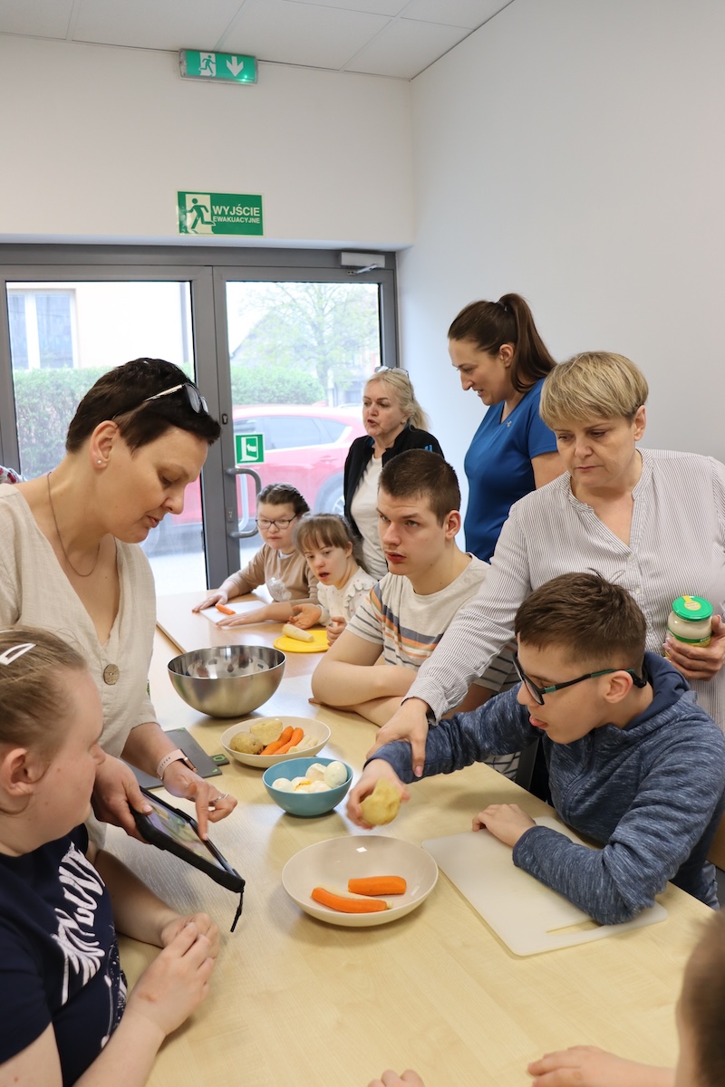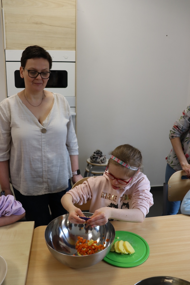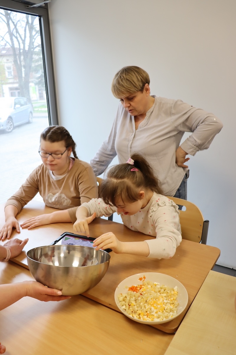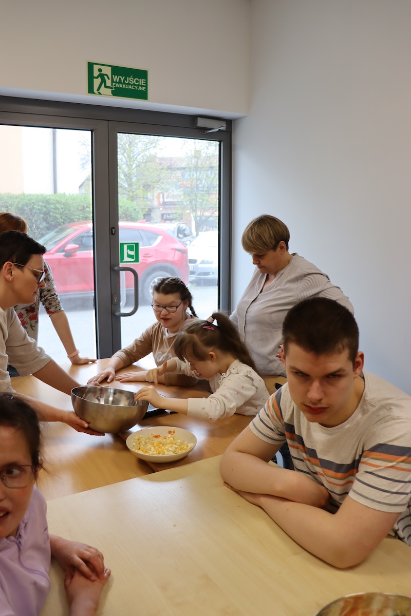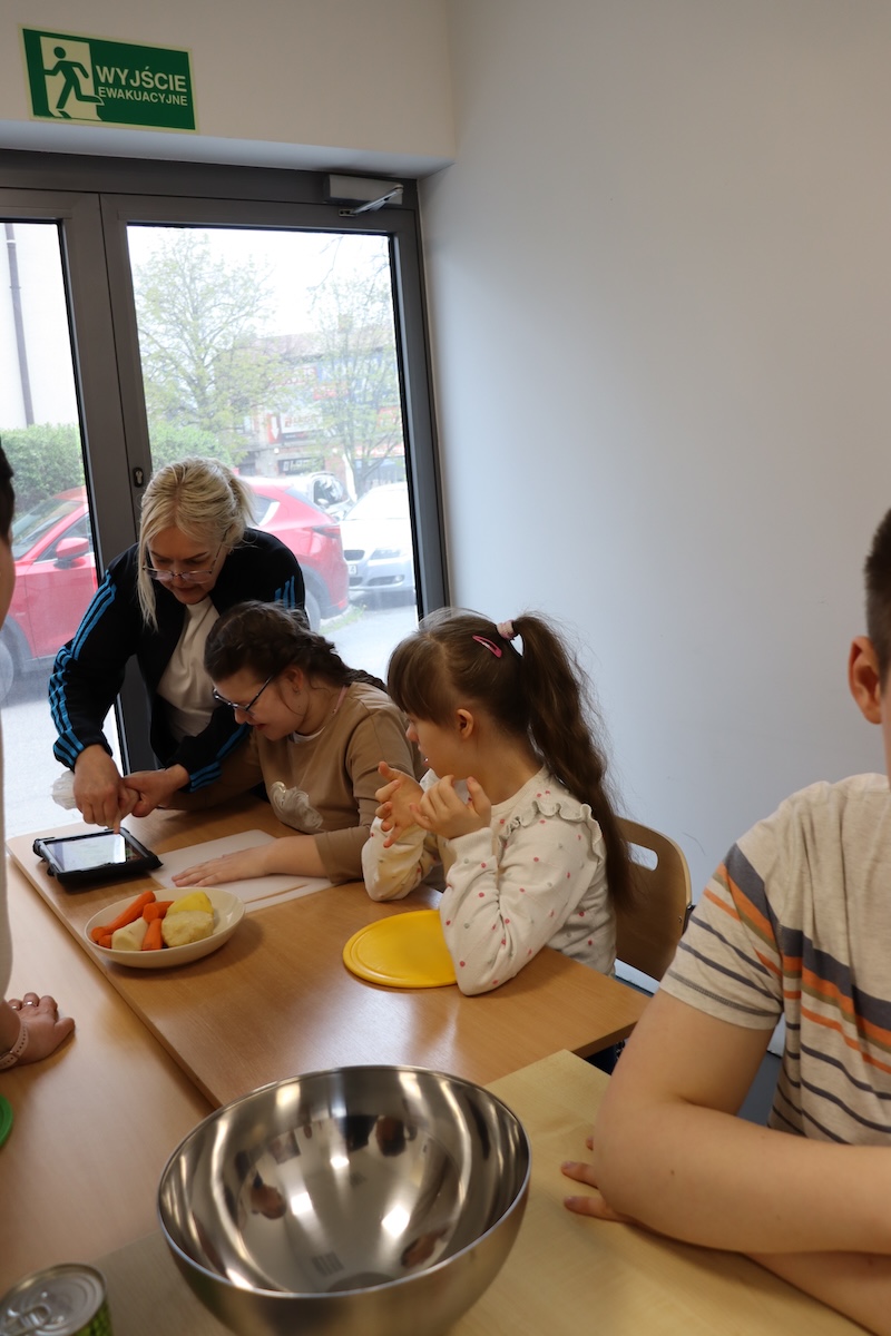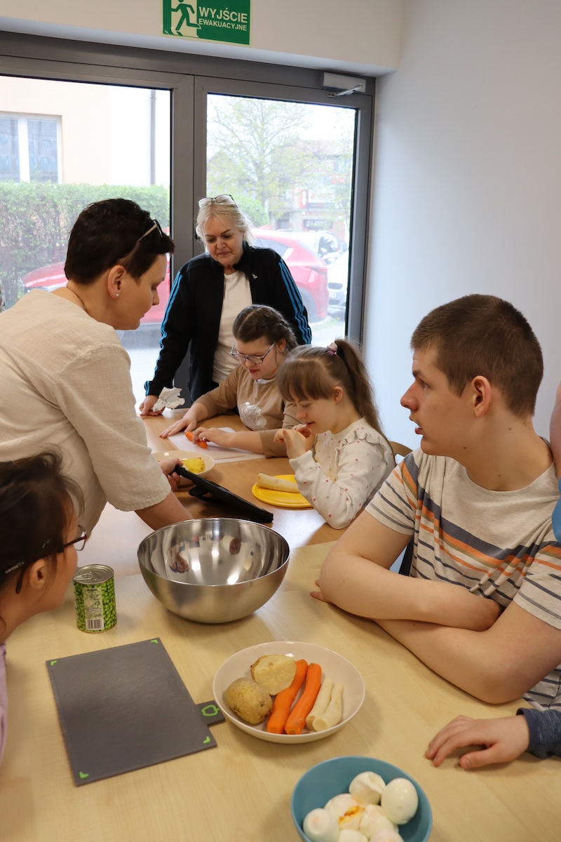 Wielki Wtorek w naszej szkole był dniem pełnym zaangażowania, pracy zespołowej i radosnych przygotowań do nadchodzących świąt. Już od samego rana panie wraz z uczniami zabrały się do pracy– najpierw zostały obrane i dokładnie umyte warzywa: marchewki, ziemniaki, pietruszka oraz jajka ugotowane na twardo. Wszystkie te składniki były niezbędne do przygotowania tradycyjnej sałatki jarzynowej, która miała być jednym z głównych elementów naszego szkolnego Śniadania Wielkanocnego. Po przygotowaniu produktów uczniowie, korzystając z oprogramowania MÓWik, nazywali poszczególne warzywa, ucząc się przy tym ich nazw oraz rozwijając swoje umiejętności komunikacyjne. To była doskonała okazja do połączenia nauki z praktycznym działaniem. Następnie wszyscy razem przystąpiliśmy do krojenia składników – każdy miał swoje zadanie i pracował z dużym zaangażowaniem. Pokrojone warzywa i jajka trafiły do jednej dużej misy, do której dodaliśmy naturalny jogurt, odrobinę majonezu dla smaku oraz przyprawy. Po dokładnym wymieszaniu sałatki została ona szczelnie przykryta i wstawiona do lodówki. Dzięki wspólnej pracy i dobrej organizacji wszystko przebiegło sprawnie, a my z niecierpliwością czekaliśmy na kolejny dzień, kiedy podczas uroczystego Śniadania Wielkanocnego będziemy mogli spróbować efektów naszej kulinarnej pracy.