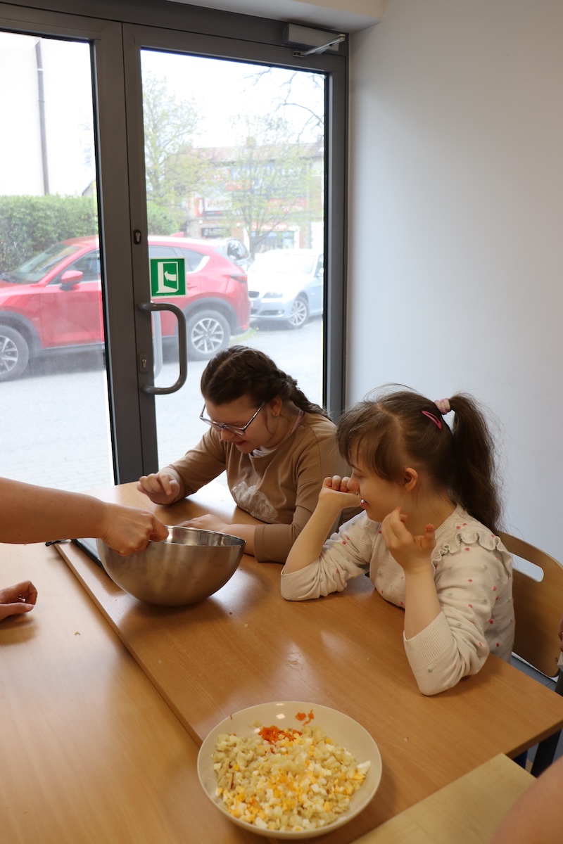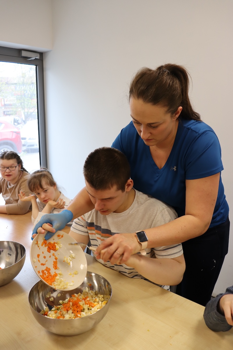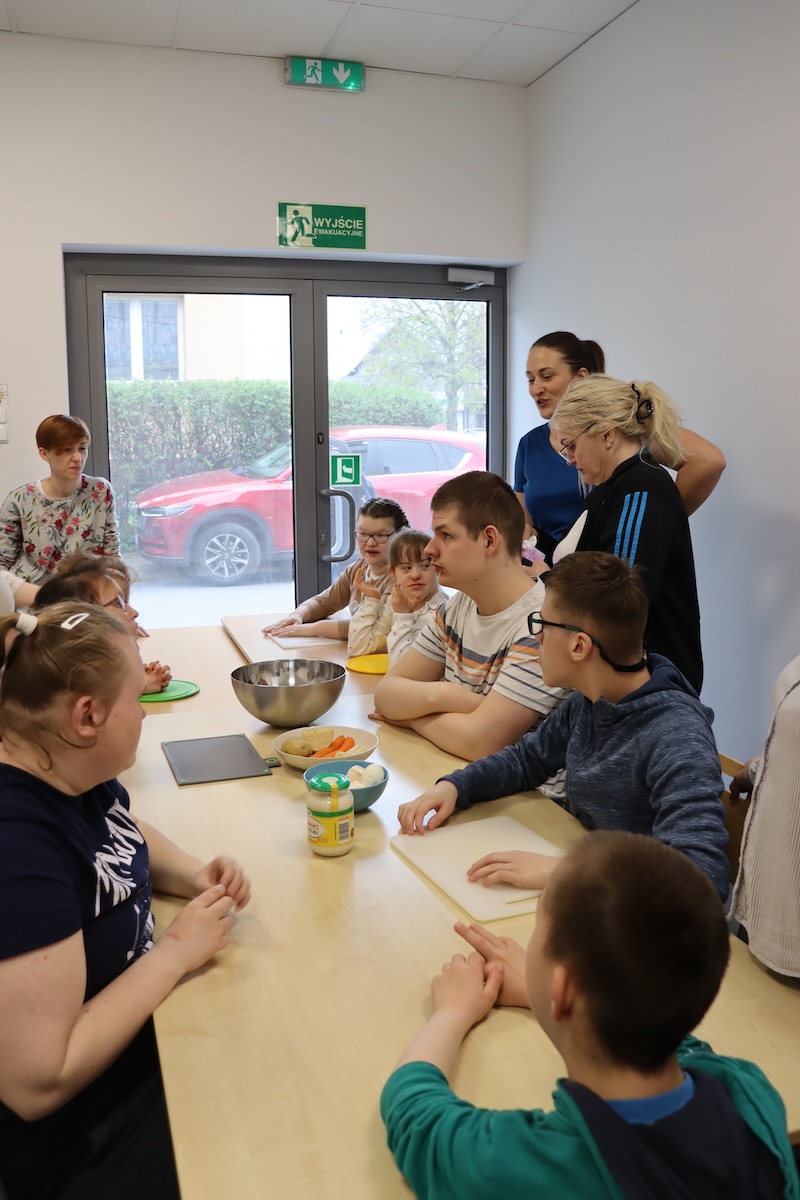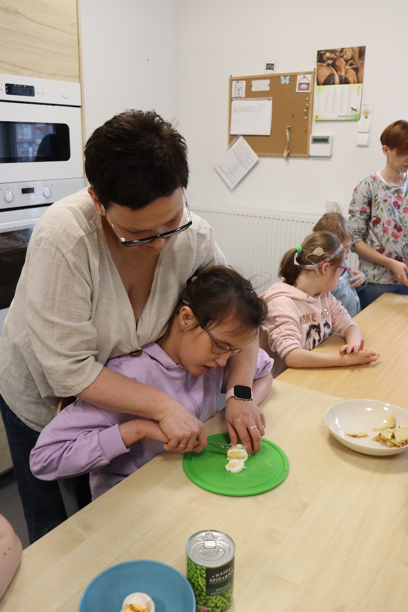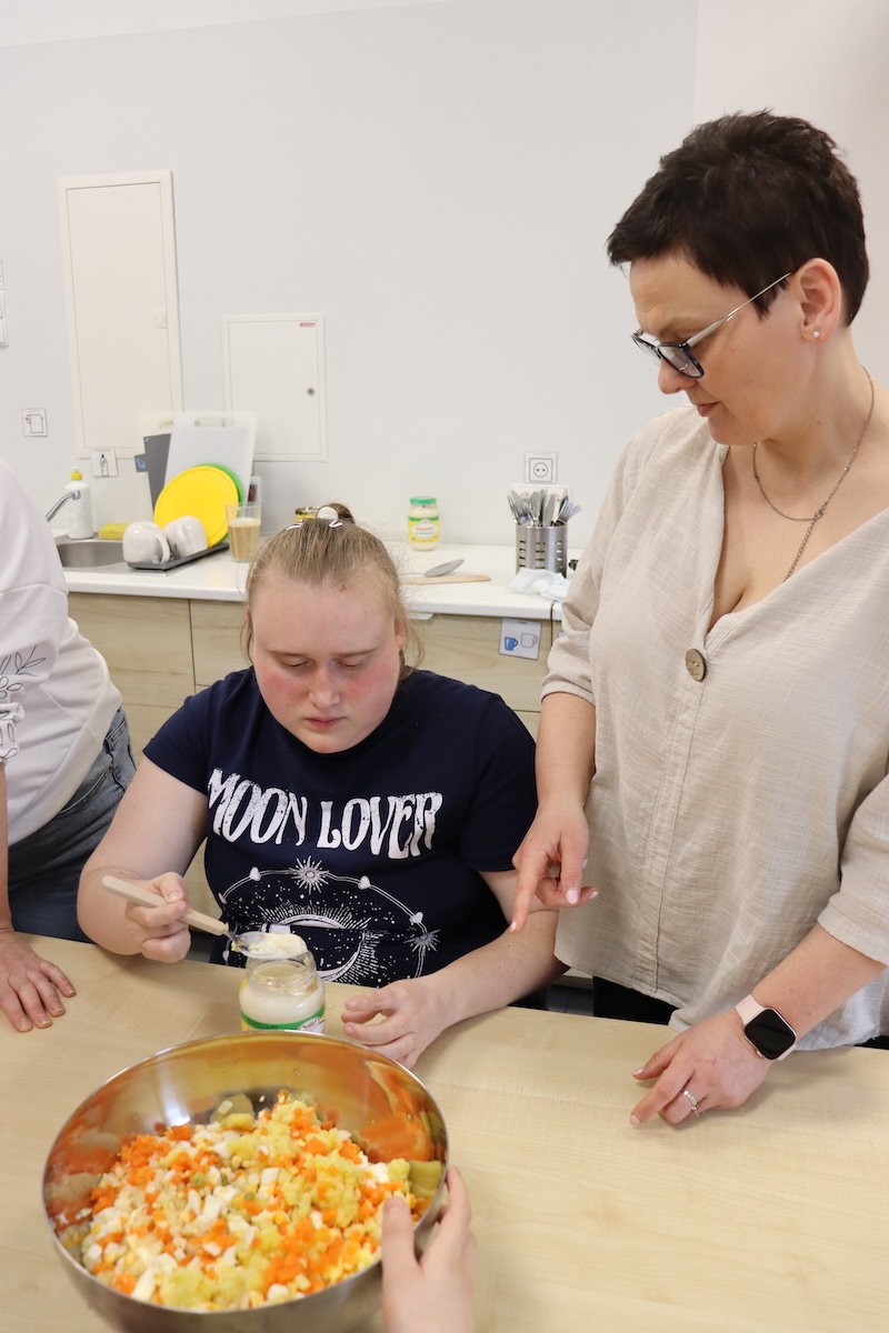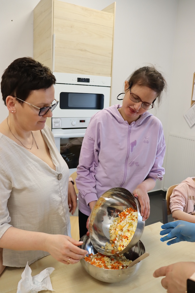Wielki Wtorek w naszej szkole był dniem pełnym zaangażowania, pracy zespołowej i radosnych przygotowań do nadchodzących świąt. Już od samego rana panie wraz z uczniami zabrały się do pracy– najpierw zostały obrane i dokładnie umyte warzywa: marchewki, ziemniaki, pietruszka oraz jajka ugotowane na twardo. Wszystkie te składniki były niezbędne do przygotowania tradycyjnej sałatki jarzynowej, która miała być jednym z głównych elementów naszego szkolnego Śniadania Wielkanocnego. Po przygotowaniu produktów uczniowie, korzystając z oprogramowania MÓWik, nazywali poszczególne warzywa, ucząc się przy tym ich nazw oraz rozwijając swoje umiejętności komunikacyjne. To była doskonała okazja do połączenia nauki z praktycznym działaniem. Następnie wszyscy razem przystąpiliśmy do krojenia składników – każdy miał swoje zadanie i pracował z dużym zaangażowaniem. Pokrojone warzywa i jajka trafiły do jednej dużej misy, do której dodaliśmy naturalny jogurt, odrobinę majonezu dla smaku oraz przyprawy. Po dokładnym wymieszaniu sałatki została ona szczelnie przykryta i wstawiona do lodówki. Dzięki wspólnej pracy i dobrej organizacji wszystko przebiegło sprawnie, a my z niecierpliwością czekaliśmy na kolejny dzień, kiedy podczas uroczystego Śniadania Wielkanocnego będziemy mogli spróbować efektów naszej kulinarnej pracy.