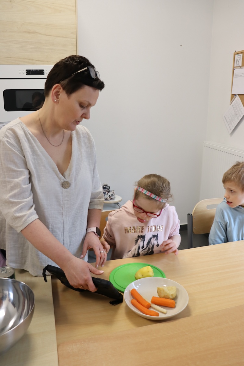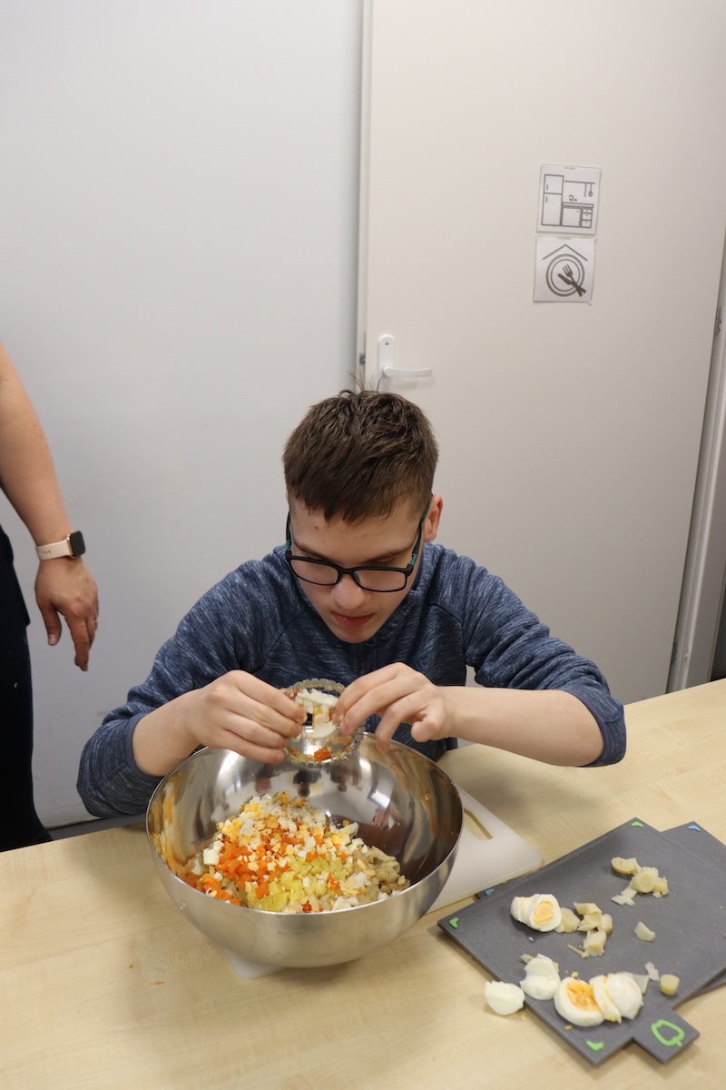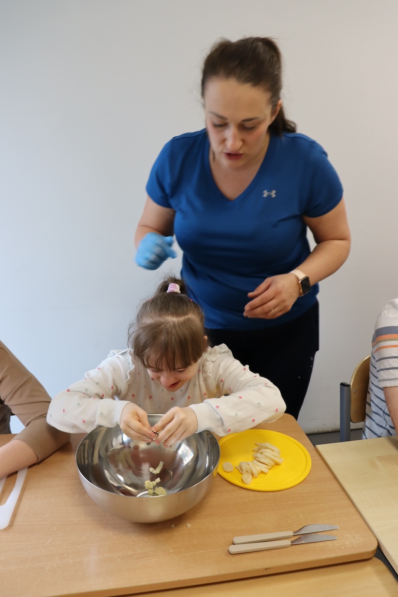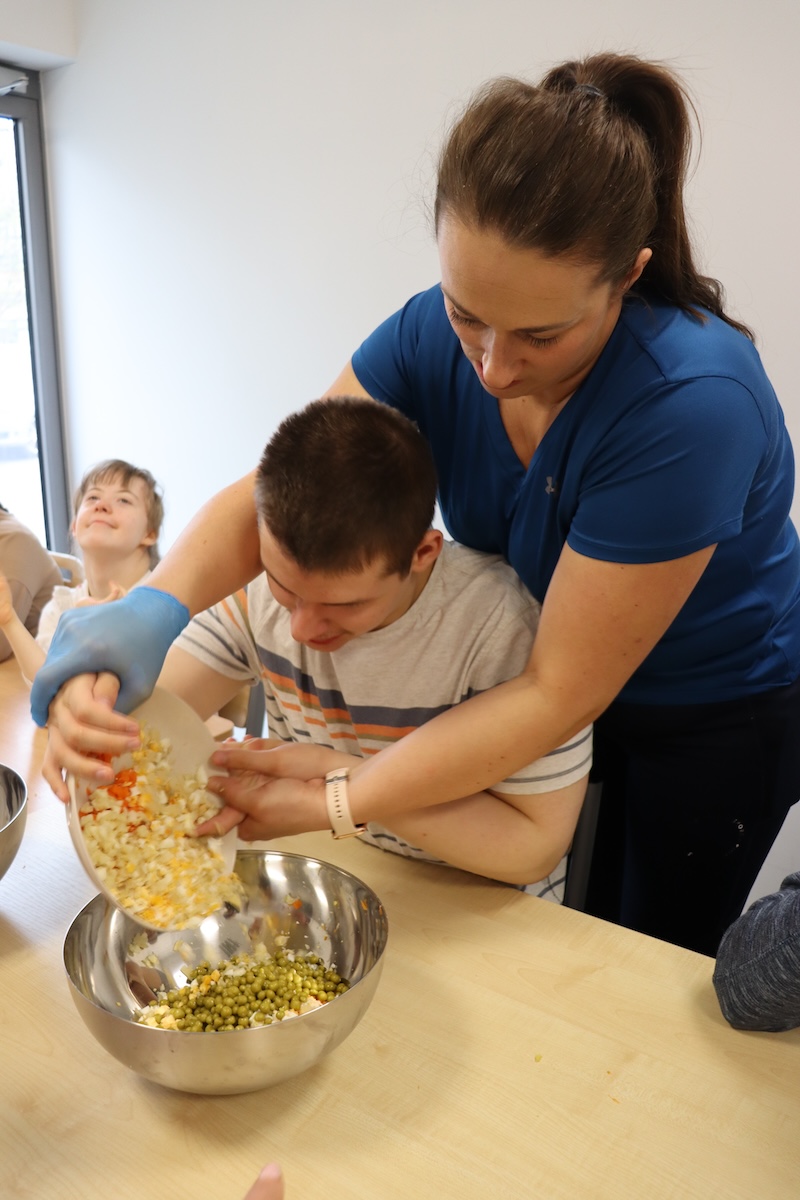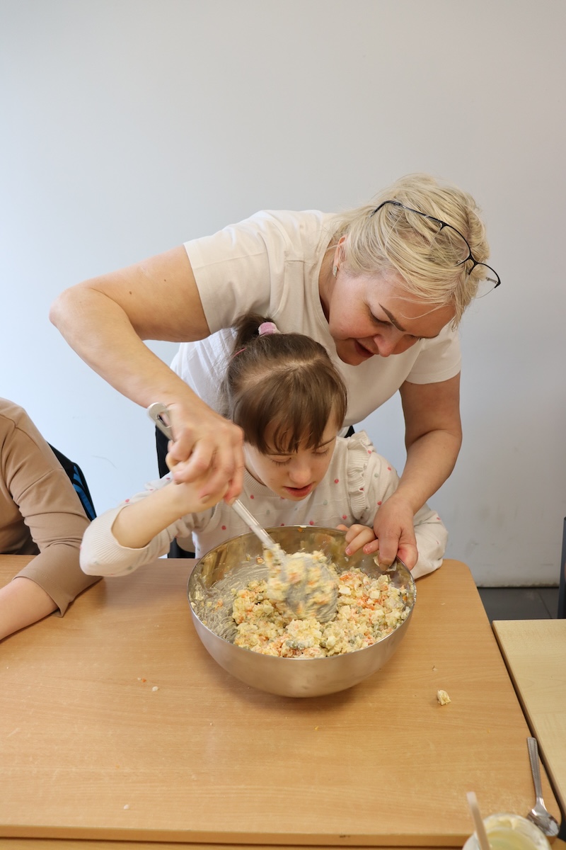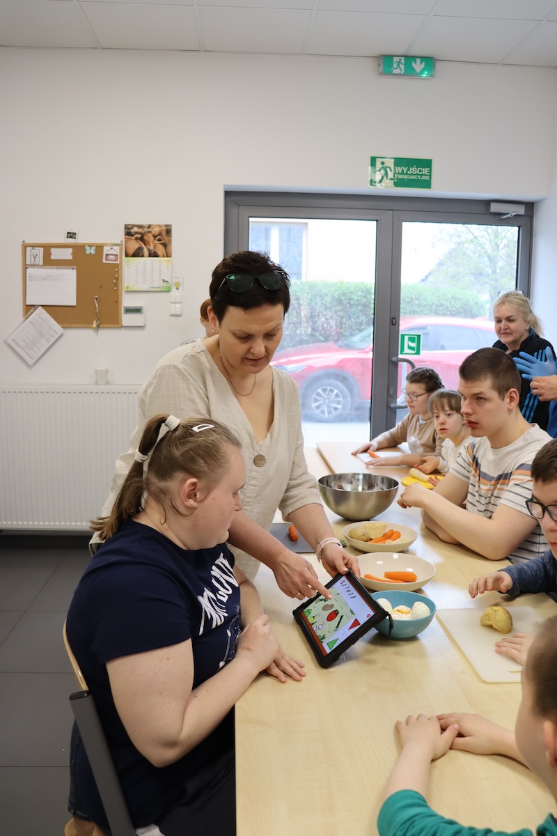 Wielki Wtorek w naszej szkole był dniem pełnym zaangażowania, pracy zespołowej i radosnych przygotowań do nadchodzących świąt. Już od samego rana panie wraz z uczniami zabrały się do pracy– najpierw zostały obrane i dokładnie umyte warzywa: marchewki, ziemniaki, pietruszka oraz jajka ugotowane na twardo. Wszystkie te składniki były niezbędne do przygotowania tradycyjnej sałatki jarzynowej, która miała być jednym z głównych elementów naszego szkolnego Śniadania Wielkanocnego. Po przygotowaniu produktów uczniowie, korzystając z oprogramowania MÓWik, nazywali poszczególne warzywa, ucząc się przy tym ich nazw oraz rozwijając swoje umiejętności komunikacyjne. To była doskonała okazja do połączenia nauki z praktycznym działaniem. Następnie wszyscy razem przystąpiliśmy do krojenia składników – każdy miał swoje zadanie i pracował z dużym zaangażowaniem. Pokrojone warzywa i jajka trafiły do jednej dużej misy, do której dodaliśmy naturalny jogurt, odrobinę majonezu dla smaku oraz przyprawy. Po dokładnym wymieszaniu sałatki została ona szczelnie przykryta i wstawiona do lodówki. Dzięki wspólnej pracy i dobrej organizacji wszystko przebiegło sprawnie, a my z niecierpliwością czekaliśmy na kolejny dzień, kiedy podczas uroczystego Śniadania Wielkanocnego będziemy mogli spróbować efektów naszej kulinarnej pracy.