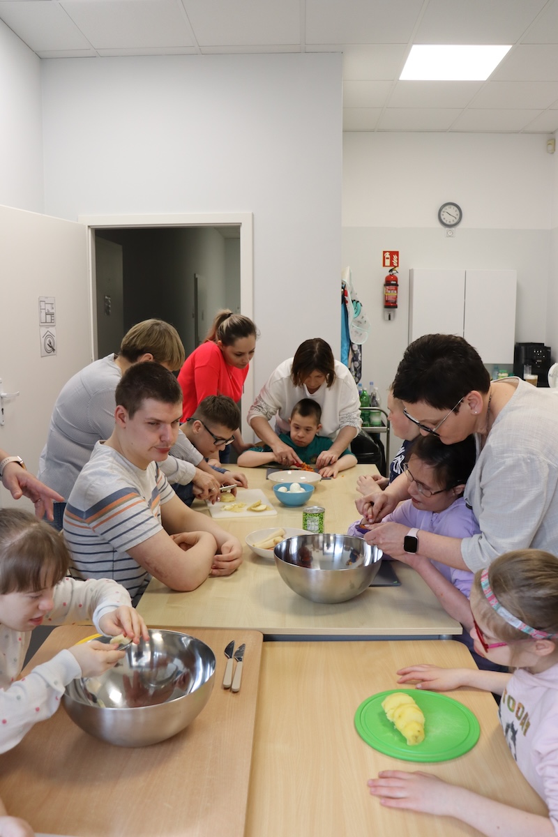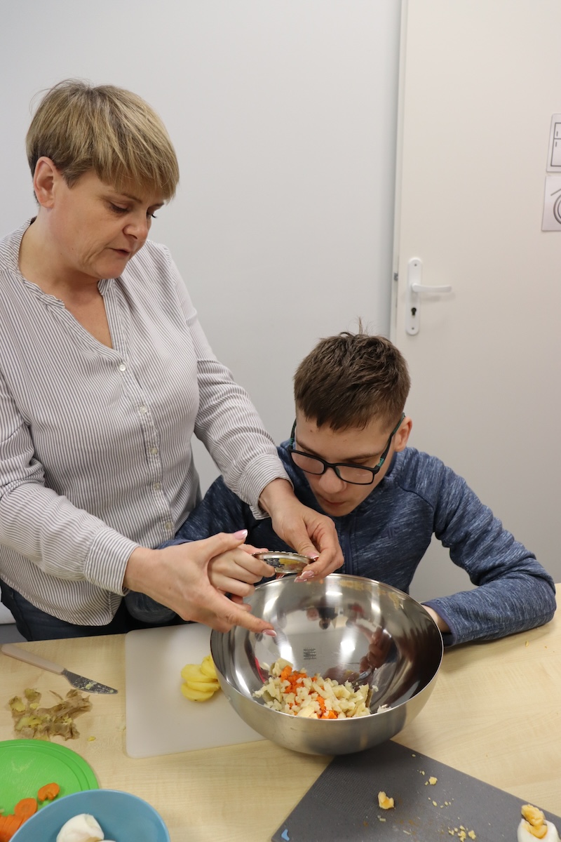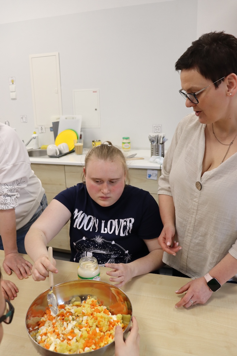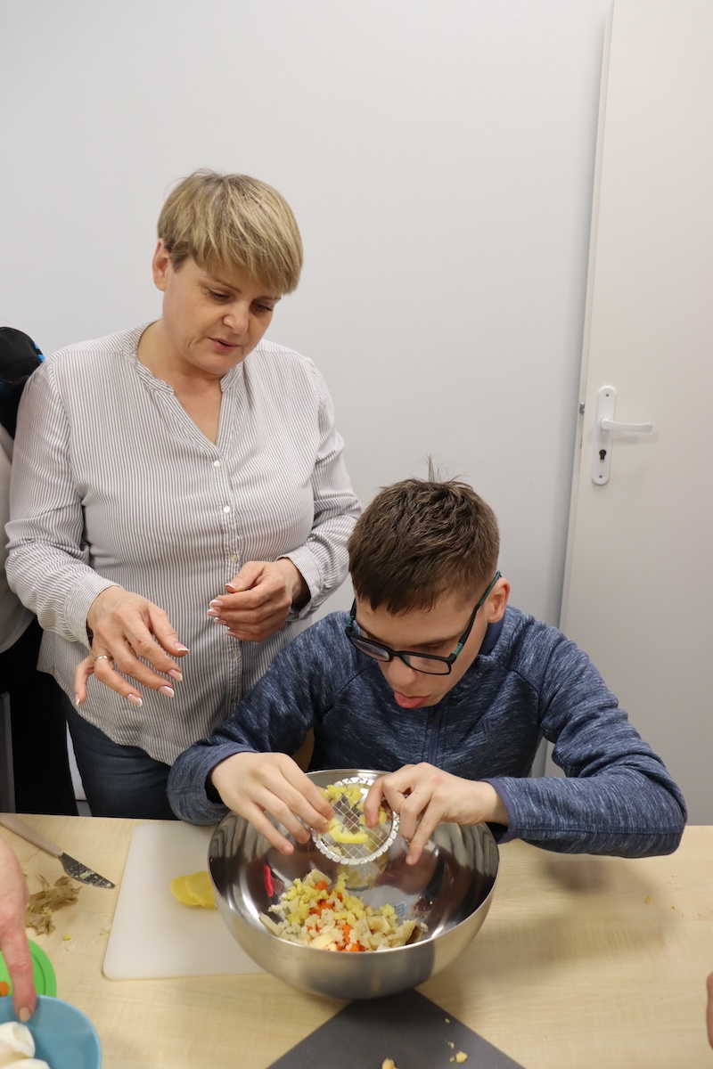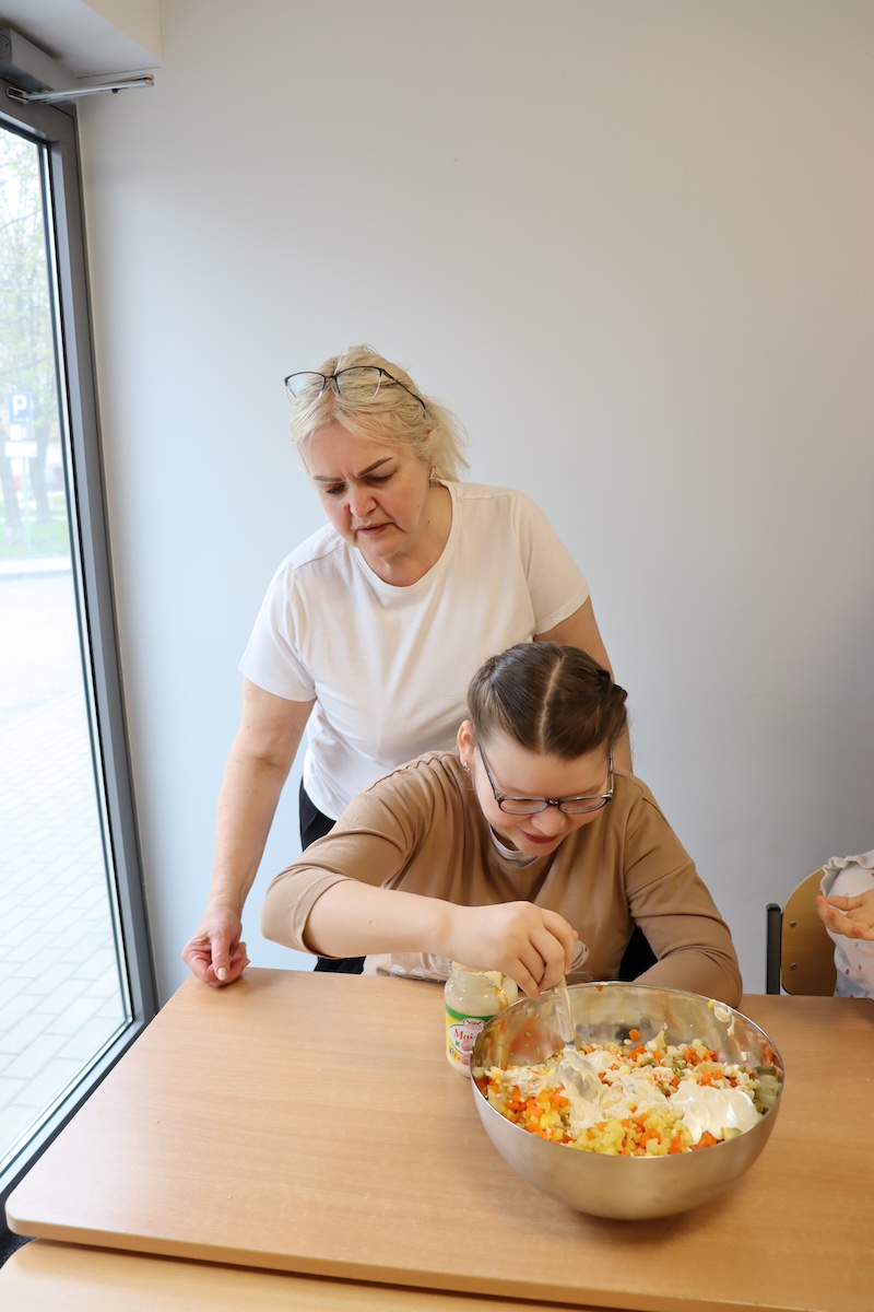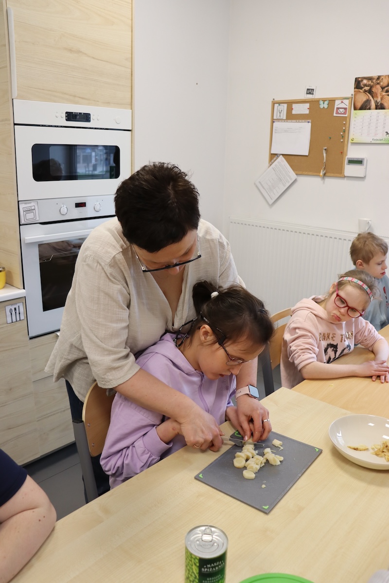 Wielki Wtorek w naszej szkole był dniem pełnym zaangażowania, pracy zespołowej i radosnych przygotowań do nadchodzących świąt. Już od samego rana panie wraz z uczniami zabrały się do pracy– najpierw zostały obrane i dokładnie umyte warzywa: marchewki, ziemniaki, pietruszka oraz jajka ugotowane na twardo. Wszystkie te składniki były niezbędne do przygotowania tradycyjnej sałatki jarzynowej, która miała być jednym z głównych elementów naszego szkolnego Śniadania Wielkanocnego. Po przygotowaniu produktów uczniowie, korzystając z oprogramowania MÓWik, nazywali poszczególne warzywa, ucząc się przy tym ich nazw oraz rozwijając swoje umiejętności komunikacyjne. To była doskonała okazja do połączenia nauki z praktycznym działaniem. Następnie wszyscy razem przystąpiliśmy do krojenia składników – każdy miał swoje zadanie i pracował z dużym zaangażowaniem. Pokrojone warzywa i jajka trafiły do jednej dużej misy, do której dodaliśmy naturalny jogurt, odrobinę majonezu dla smaku oraz przyprawy. Po dokładnym wymieszaniu sałatki została ona szczelnie przykryta i wstawiona do lodówki. Dzięki wspólnej pracy i dobrej organizacji wszystko przebiegło sprawnie, a my z niecierpliwością czekaliśmy na kolejny dzień, kiedy podczas uroczystego Śniadania Wielkanocnego będziemy mogli spróbować efektów naszej kulinarnej pracy.