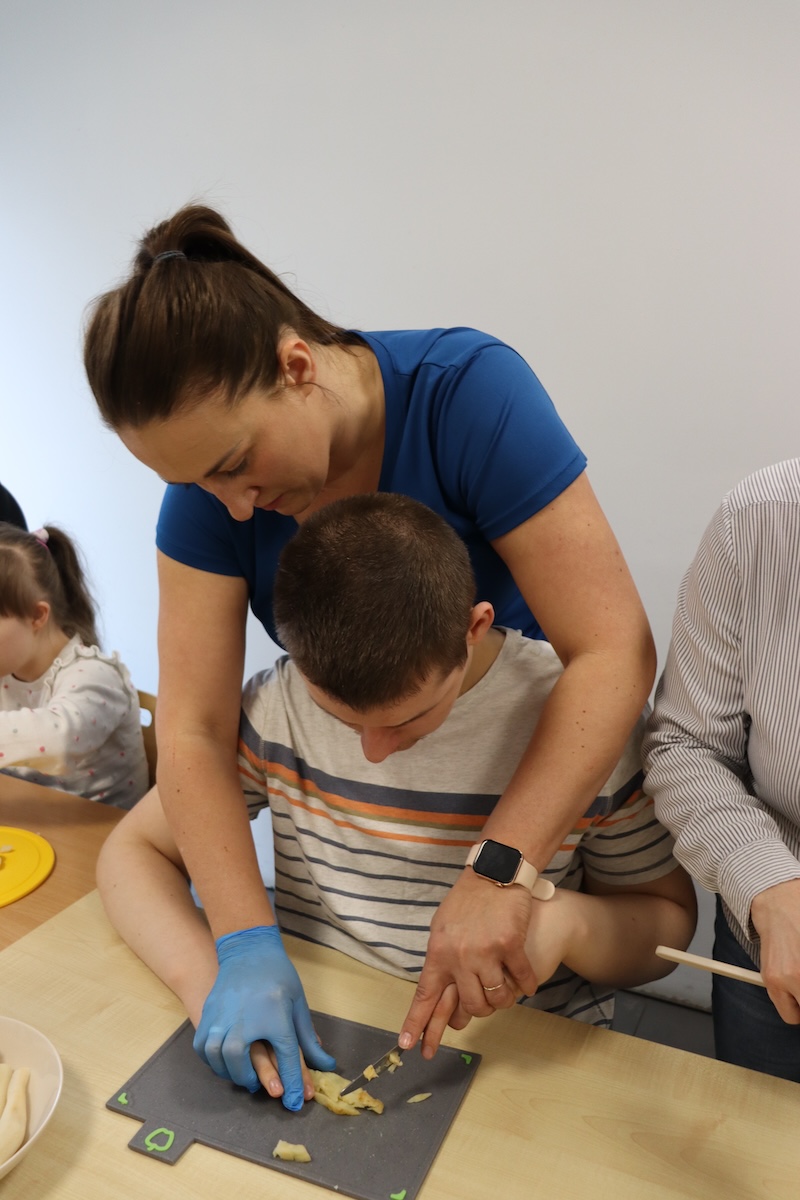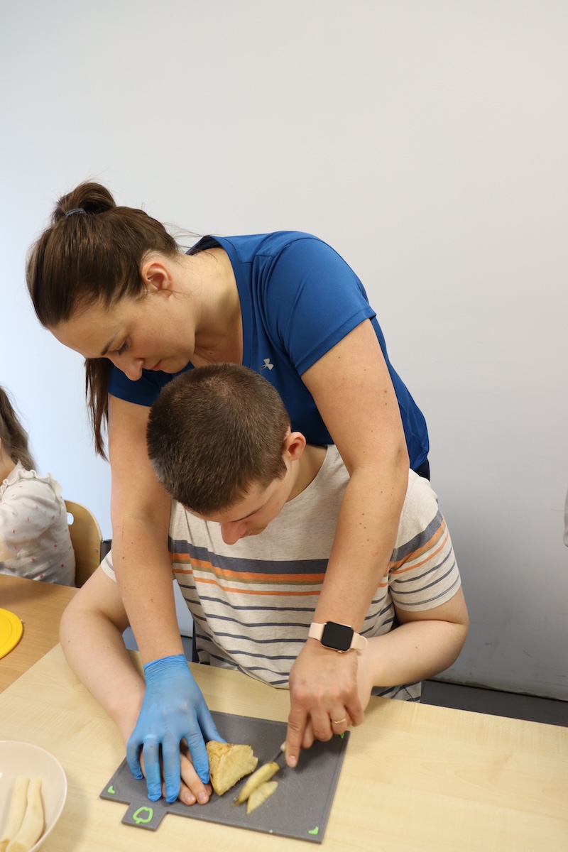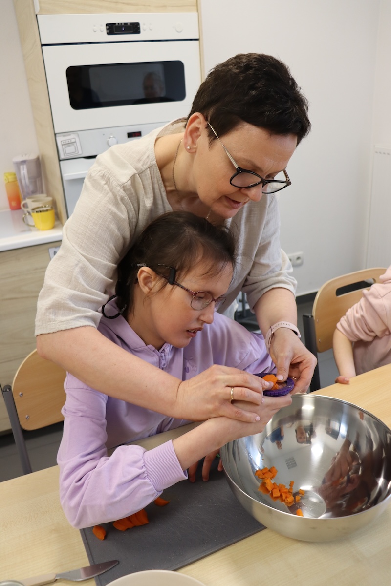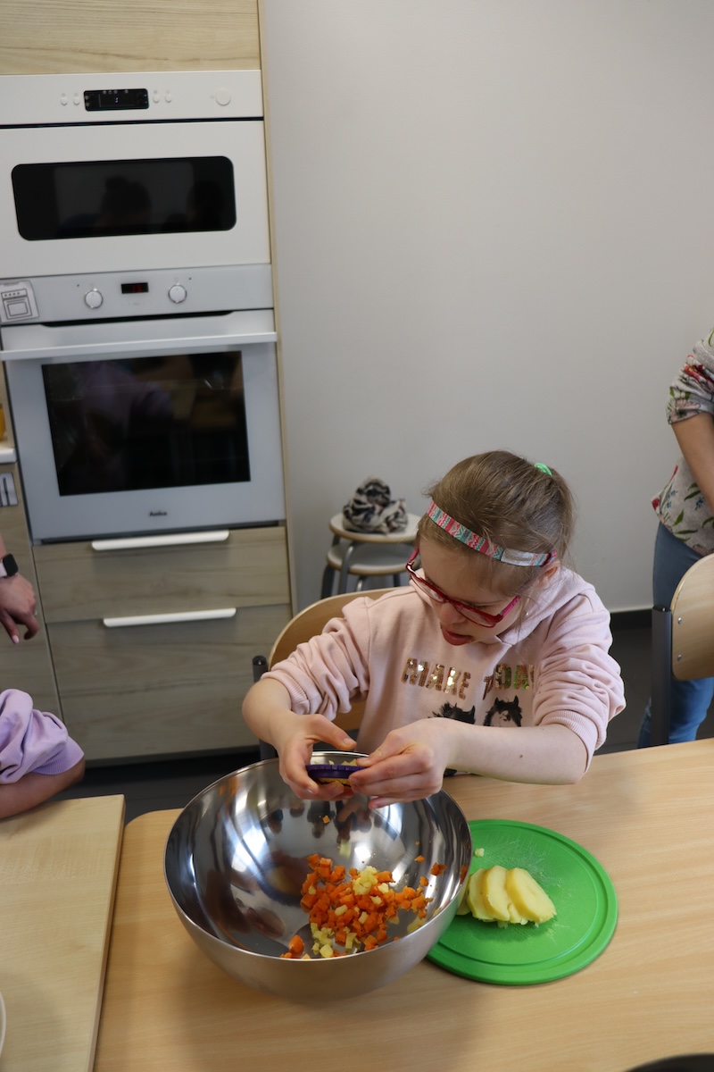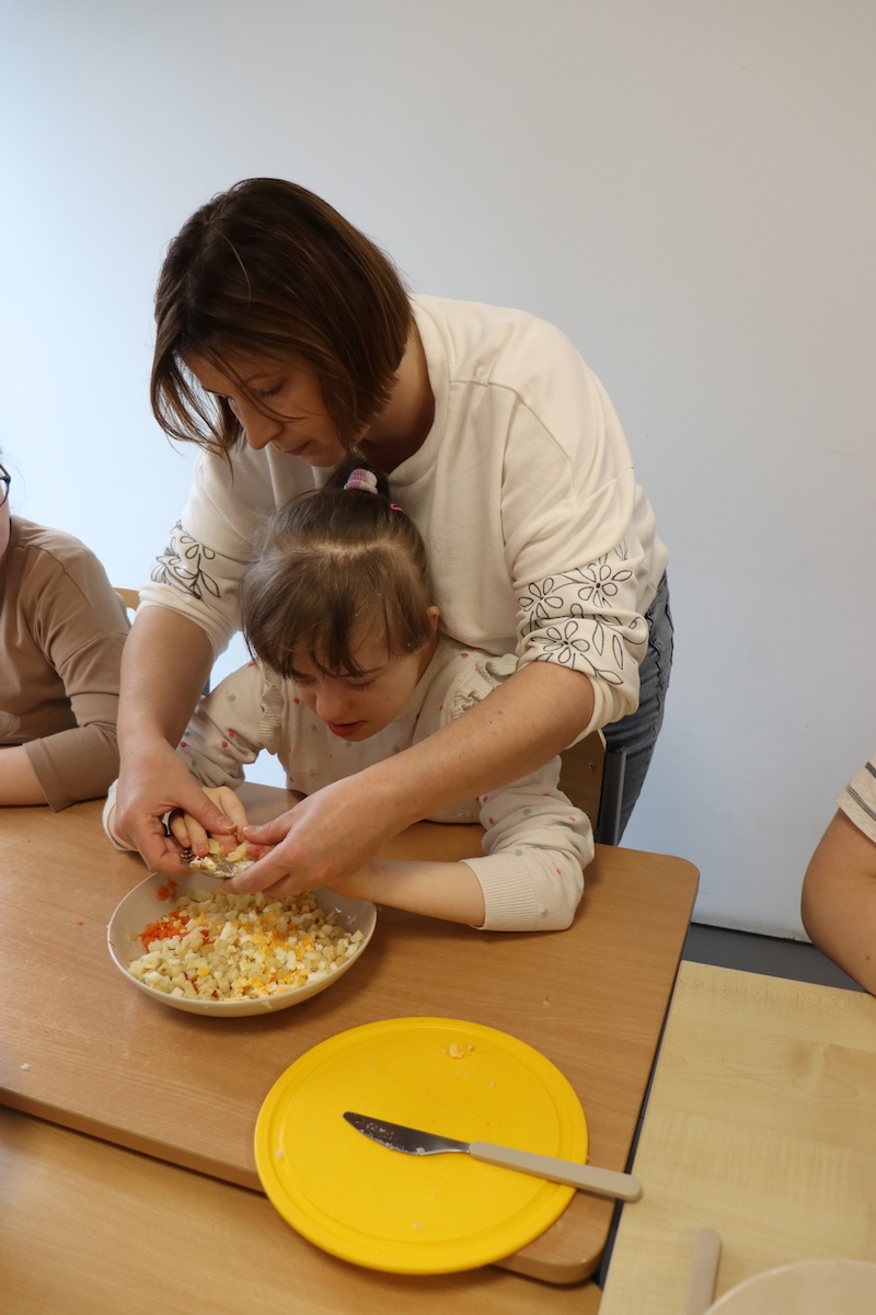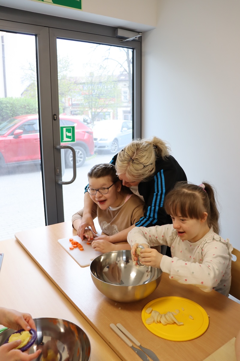 Wielki Wtorek w naszej szkole był dniem pełnym zaangażowania, pracy zespołowej i radosnych przygotowań do nadchodzących świąt. Już od samego rana panie wraz z uczniami zabrały się do pracy– najpierw zostały obrane i dokładnie umyte warzywa: marchewki, ziemniaki, pietruszka oraz jajka ugotowane na twardo. Wszystkie te składniki były niezbędne do przygotowania tradycyjnej sałatki jarzynowej, która miała być jednym z głównych elementów naszego szkolnego Śniadania Wielkanocnego. Po przygotowaniu produktów uczniowie, korzystając z oprogramowania MÓWik, nazywali poszczególne warzywa, ucząc się przy tym ich nazw oraz rozwijając swoje umiejętności komunikacyjne. To była doskonała okazja do połączenia nauki z praktycznym działaniem. Następnie wszyscy razem przystąpiliśmy do krojenia składników – każdy miał swoje zadanie i pracował z dużym zaangażowaniem. Pokrojone warzywa i jajka trafiły do jednej dużej misy, do której dodaliśmy naturalny jogurt, odrobinę majonezu dla smaku oraz przyprawy. Po dokładnym wymieszaniu sałatki została ona szczelnie przykryta i wstawiona do lodówki. Dzięki wspólnej pracy i dobrej organizacji wszystko przebiegło sprawnie, a my z niecierpliwością czekaliśmy na kolejny dzień, kiedy podczas uroczystego Śniadania Wielkanocnego będziemy mogli spróbować efektów naszej kulinarnej pracy.