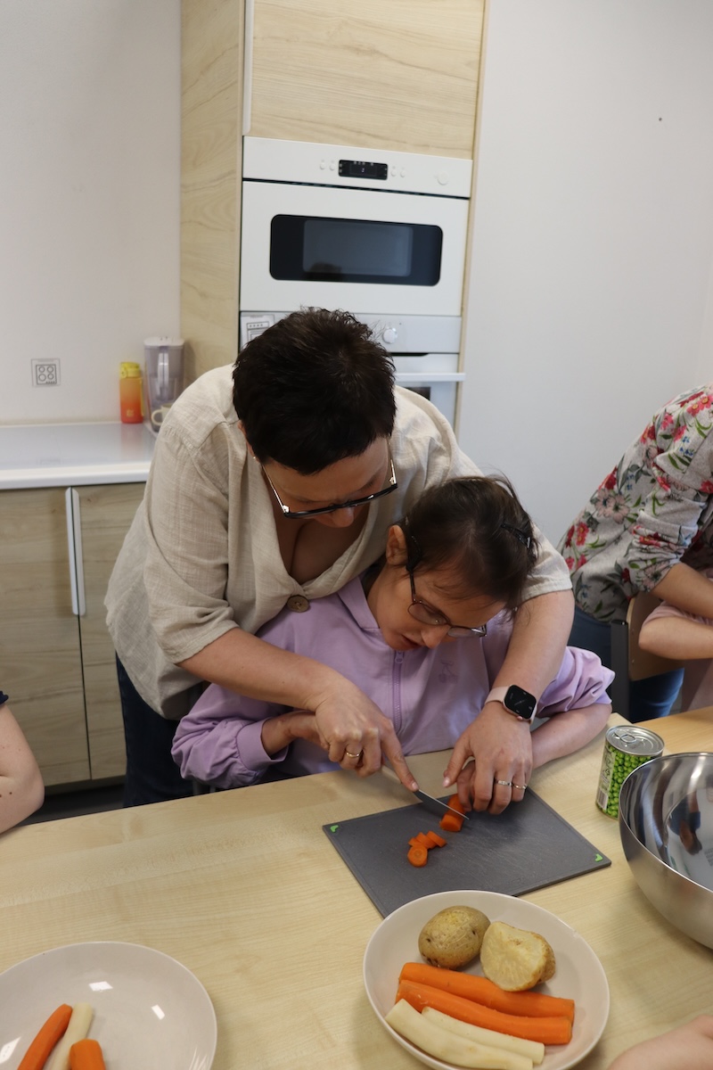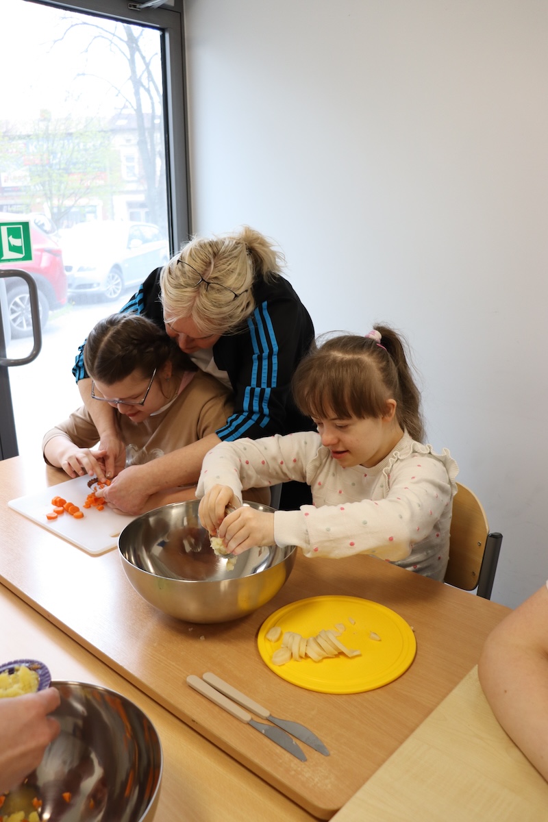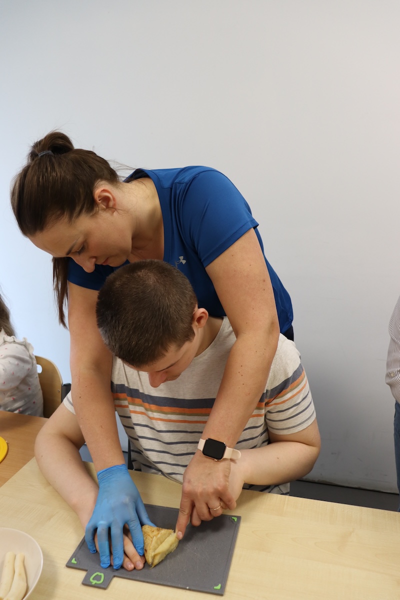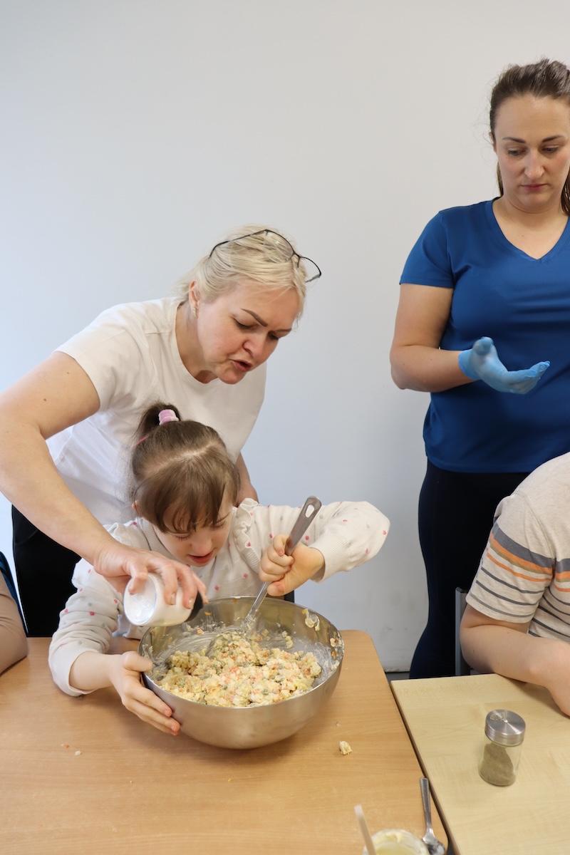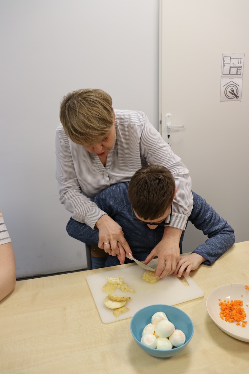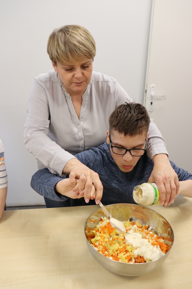 Wielki Wtorek w naszej szkole był dniem pełnym zaangażowania, pracy zespołowej i radosnych przygotowań do nadchodzących świąt. Już od samego rana panie wraz z uczniami zabrały się do pracy– najpierw zostały obrane i dokładnie umyte warzywa: marchewki, ziemniaki, pietruszka oraz jajka ugotowane na twardo. Wszystkie te składniki były niezbędne do przygotowania tradycyjnej sałatki jarzynowej, która miała być jednym z głównych elementów naszego szkolnego Śniadania Wielkanocnego. Po przygotowaniu produktów uczniowie, korzystając z oprogramowania MÓWik, nazywali poszczególne warzywa, ucząc się przy tym ich nazw oraz rozwijając swoje umiejętności komunikacyjne. To była doskonała okazja do połączenia nauki z praktycznym działaniem. Następnie wszyscy razem przystąpiliśmy do krojenia składników – każdy miał swoje zadanie i pracował z dużym zaangażowaniem. Pokrojone warzywa i jajka trafiły do jednej dużej misy, do której dodaliśmy naturalny jogurt, odrobinę majonezu dla smaku oraz przyprawy. Po dokładnym wymieszaniu sałatki została ona szczelnie przykryta i wstawiona do lodówki. Dzięki wspólnej pracy i dobrej organizacji wszystko przebiegło sprawnie, a my z niecierpliwością czekaliśmy na kolejny dzień, kiedy podczas uroczystego Śniadania Wielkanocnego będziemy mogli spróbować efektów naszej kulinarnej pracy.