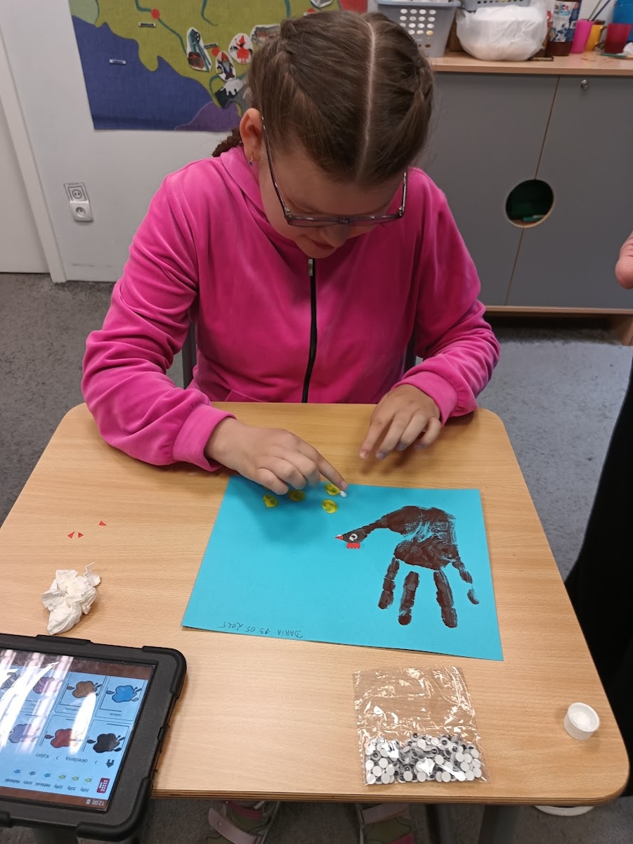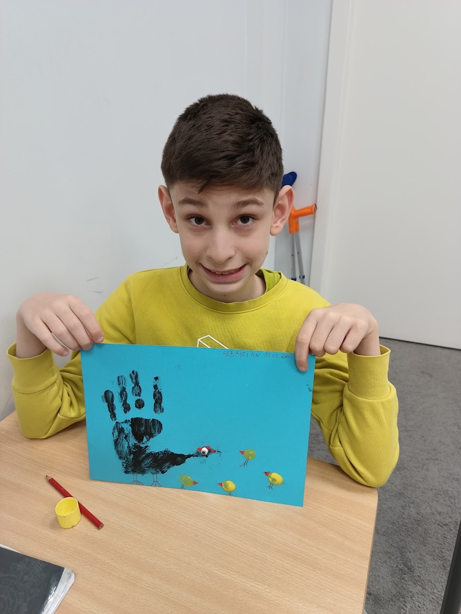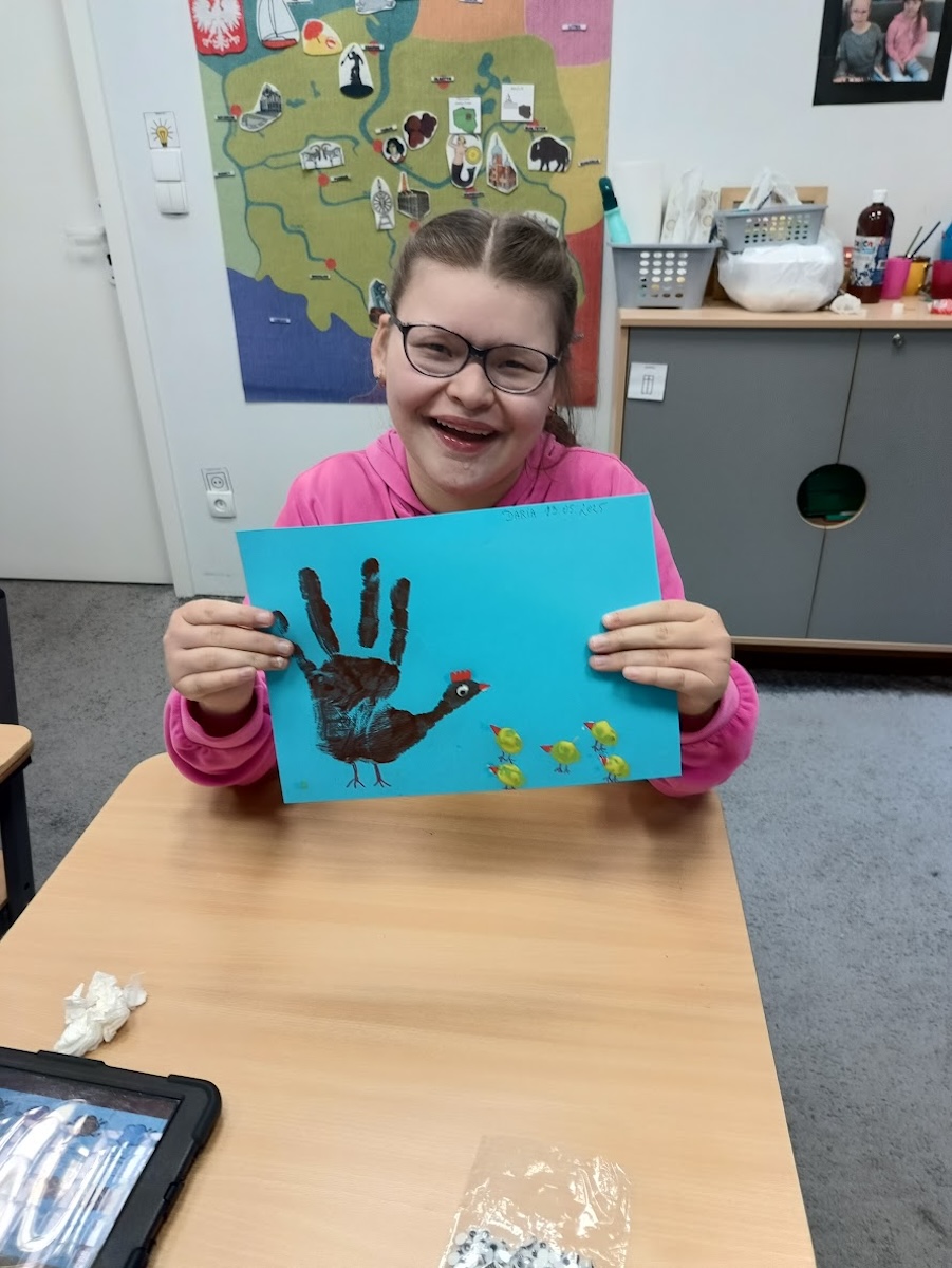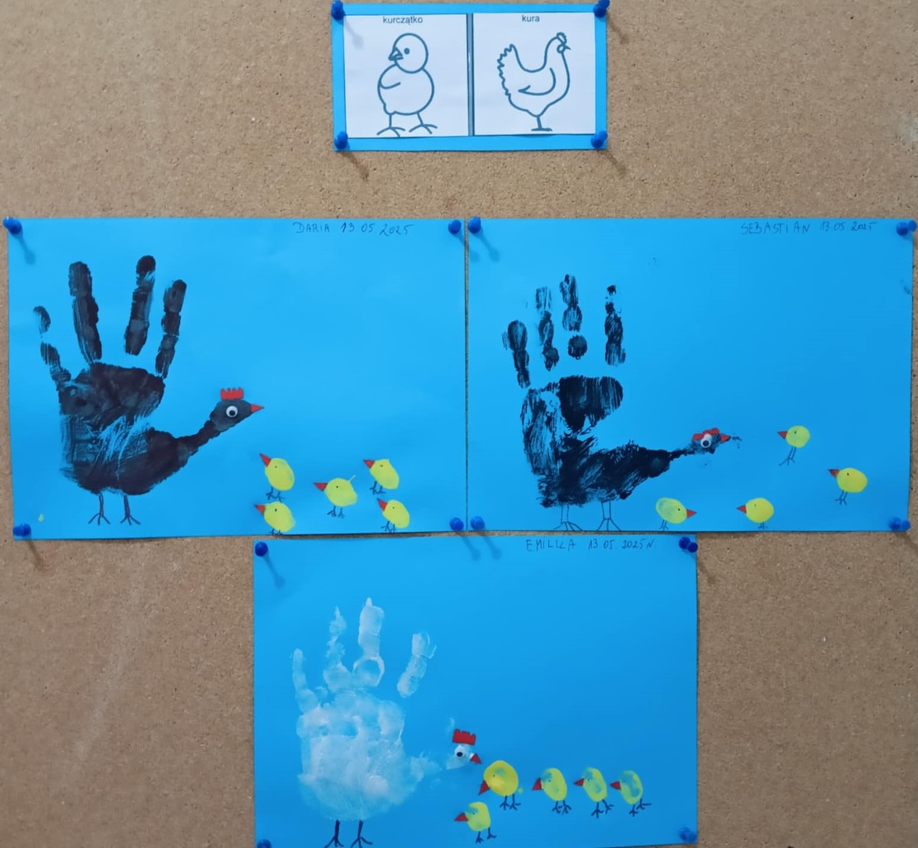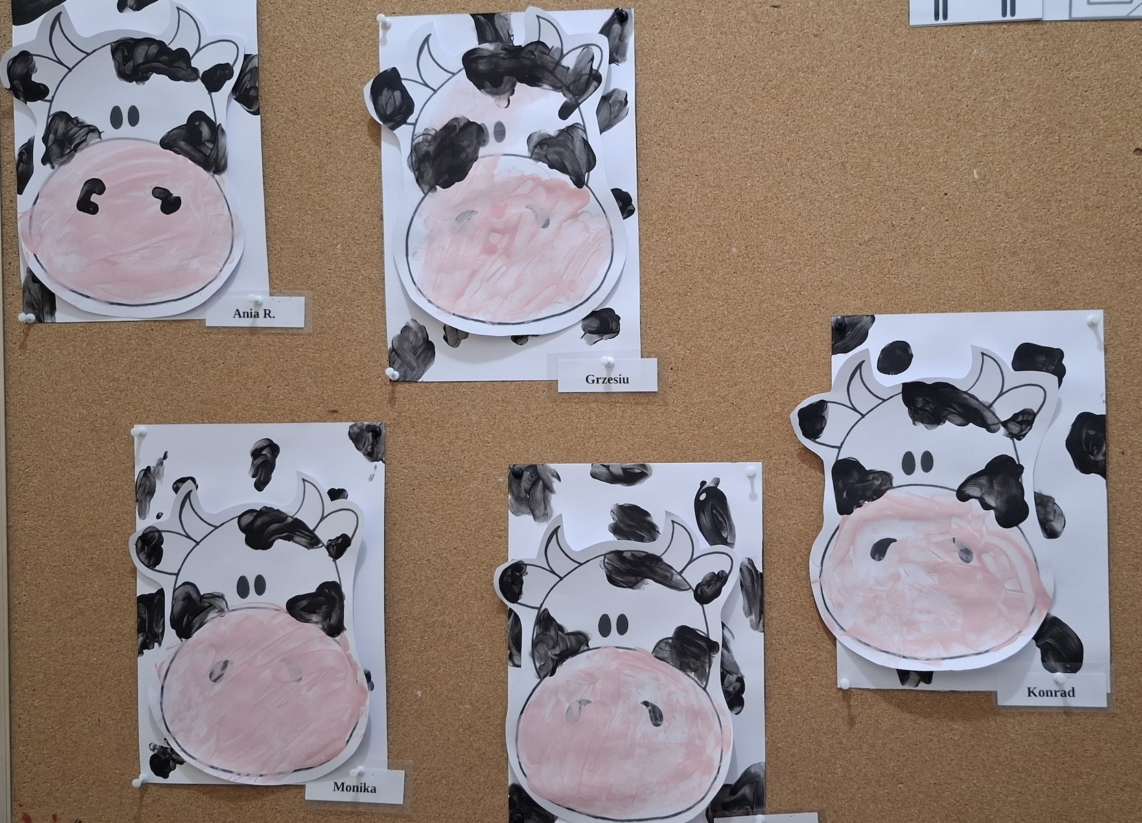 Podczas zajęć w minionym tygodniu rozmawialiśmy na temat zwierząt hodowlanych. Uczniowie poznawali różne gatunki zwierząt żyjących w gospodarstwach rolnych oraz uczyły się, w jakich miejscach mieszkają – wspólnie segregowaliśmy je według środowiska życia. Po części dydaktycznej przeszliśmy do działania plastycznego, które miało na celu utrwalenie zdobytej wiedzy w kreatywny sposób. Dzieci z oddziału „I” wykonały pracę plastyczną pod tytułem „Kurczątko i Kura”. Do jej stworzenia wykorzystały kolorowe kartki, farby oraz… swoje dłonie! Malowały je farbami i odbijały na kartkach papieru, tworząc sylwetki ptaków. Działanie to sprawiło dzieciom wiele radości i było świetną okazją do rozwijania sprawności manualnej. Oddział „II” przygotował pracę pod tytułem „Łaciata Krowa”. Wykorzystano różnorodne materiały plastyczne, a dzieci z dużym zaangażowaniem wyklejały sylwetkę krowy, dbając o jej charakterystyczne czarne łaty. Dzięki temu ćwiczyły spostrzegawczość, precyzję i wyobraźnię. Zajęcia przebiegły w miłej atmosferze, a pracę plastyczne ozdobiły korytarze naszej szkoły.